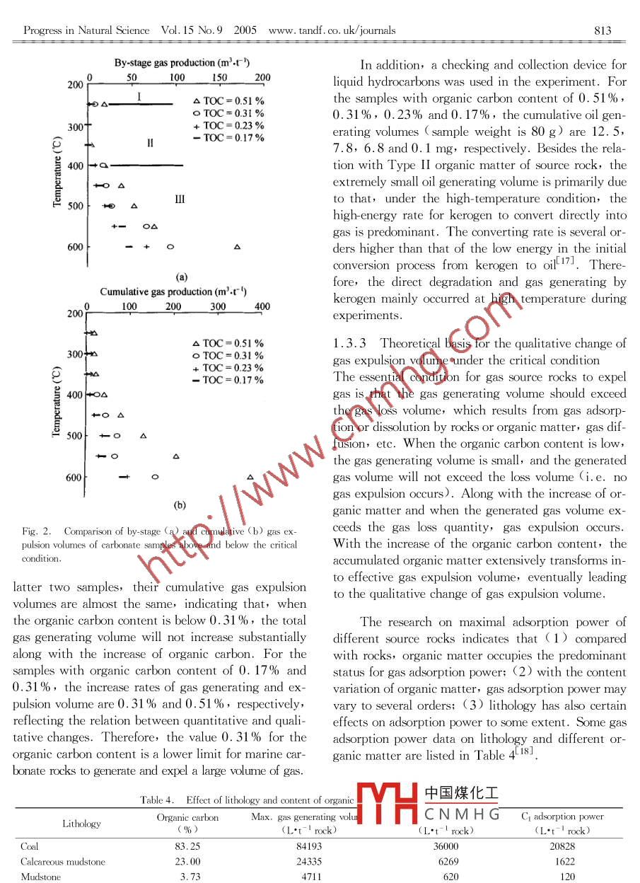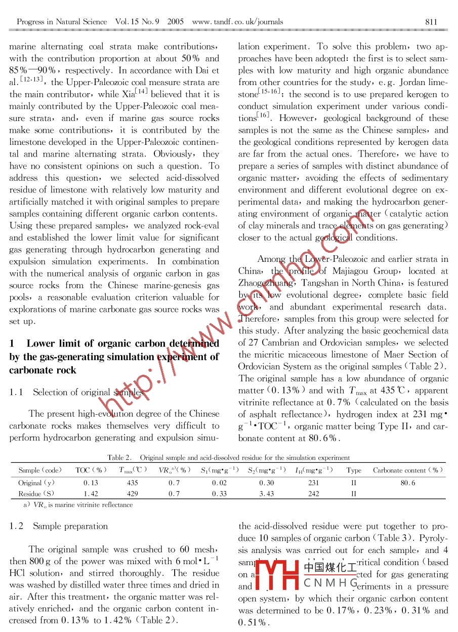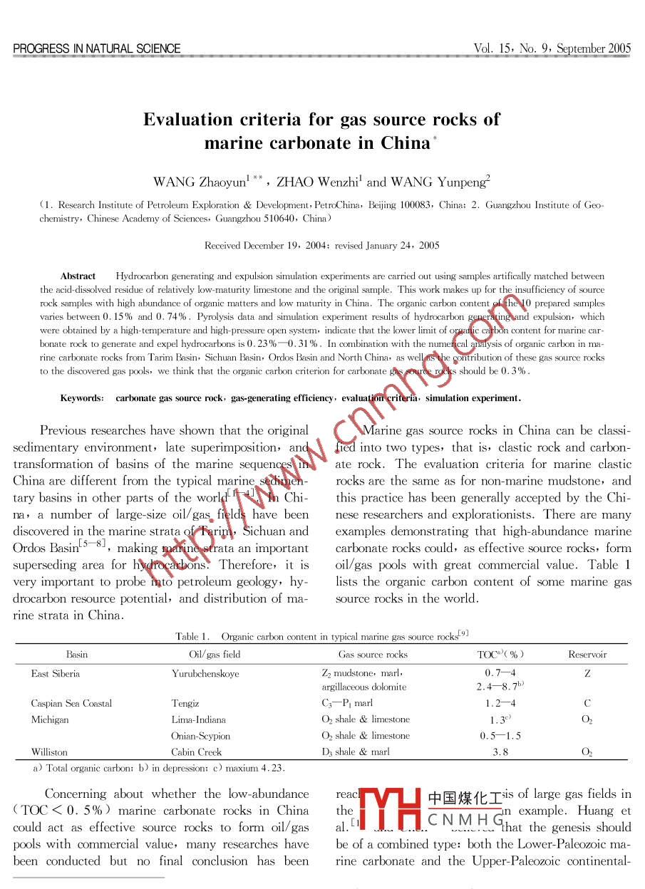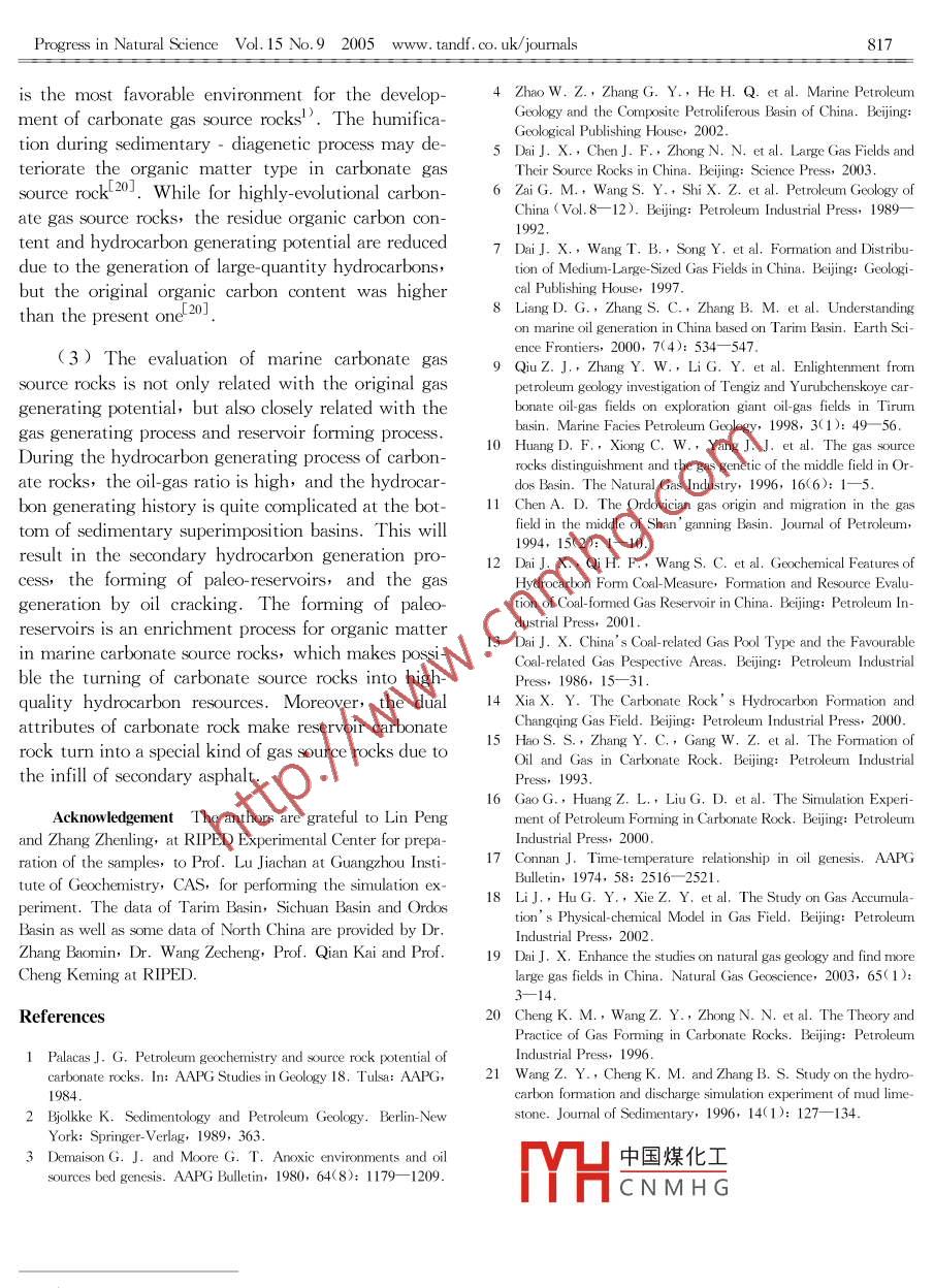 PROGRESS IN NATURAL SCIENCEVol. 15, No 9, September 2005Evaluation criteria for gas source rocks ofmarine carbonate in ChinaWANG Zhaoyun**, ZHAO Wenzhi and WANG Yunpeng(1. Research Institute of Petroleum Exploration Development, PetroChina, Beijing 100083, China; 2. Guangzhou Institute of Geohemistry, Chinese Academy of Sciences, Guangzhou 510640, China)Received December 19, 2004; revised January 24, 2005Abstract Hydrocarbon generating and expulsion simulation experiments are carried out using samples artifically matched betweenthe acid-dissolved residue of relatively low-maturity limestone and the original sample. This work makes up for the insufficiency of sourceock samples with high abundance of organic matters and low maturity in China. The organic carbon content of the 10 prepared samplesvaries between 0. 15% and 0. 74%. Pyrolysis data and simulation experiment results of hydrocarbon generating and expulsion, whichwere obtained by a high-temperature and high-pressure open system, indicate that the lower limit of organic carbon content for marine carbonate rock to generate and expel hydrocarbons is 0.23%-0 31%. In combination with the numerical analysis of organic carbon in marine carbonate rocks from Tarim Basin, Sichuan Basin, Ordos Basin and North China, as well as the contribution of these gas source rocksto the discovered gas pools, we think that the organic carbon criterion for carbonate gas source rocks should be 0. 3%Keywords: carbonate gas source rock, gas-generating efficiency, evaluation criteria, simulation experimentPrevious researches have shown that the originalMarine gas source rocks in China can be classisedimentary environment, late superimposition, and fied into two types, that is, clastic rock and carbontransformation of basins of the marine sequences in ate rock. The evaluation criteria for marine clasticChina are different from the typical marine sedimen- rocks are the same as for non-marine mudstone, andtary basins in other parts of the world 4. In Chi- this practice has been generally accepted by the China, a number of large-size oil/ gas fields have been nese researchers and explorationists. There are manydiscovered in the marine strata of Tarim, Sichuan and examples demonstrating that high-abundance marineOrdos Basin 5-8, making marine strata an important carbonate rocks could, as effective source rocks, formsuperseding area for hydrocarbons. Therefore, itoil/gas pools with great commercial value. Table 1very important to probe into petroleum geology, hylists the organic carbon content of some marine gasdrocarbon resource potential, and distribution of masource rocks in the worldrine strata in ChinaTable 1. Organic carbolBasinOil/gas fieldGas source rocksTOC(%)ReservoirEast siberYurubchenskoyL, mudstone, marl2.4-8.7Caspian Sea CoastalmichiganO, shale limestorOnian-ScypionO, shale limestone0.5-1.5Cabin creekD3 shale& marla) Total organic carbon: b) in depression: c) maxium 4.23Concerning about whether the low-abundand中國煤化 Isis of large gas fields in(ToC<0.5%) marine carbonate rocks in Chinaexample. Huang etcould act as effective source rocks to form oil/HCNMHhat the genesis shouldpools with commercial value, many researches have be of a combined type: both the Lower-Paleozoic mabeen conducted but no final conclusion has been rine carbonate and the Upper- Paleozoic continental四2數(shù)State Basic Research Development Program of China(Grant No, 2001CB209100)denceshouldbeaddressedE-mail:wzy@petrochina.com.cnProgressinNaturalScienceVol.15No.92005www.tandf.co.uk/journals811marine alternating coal strata make contributions, lation experiment. To solve this problem, two ap-with the contribution proportion at about 50% and proaches have been adopted: the first is to select sam85%90%, respectively. In accordance with Dai et ples with low maturity and high organic abundancealL12, 13,the Upper-Paleozoic coal measure strata are from other countries for the study, e.g. Jordan limethe main contributor, while Xia[ 14 believed that it is stone 15, 16; the second is to use prepared kerogen tomainly contributed by the Upper- Paleozoic coal mea- conduct simulation experiment under various condisure strata, and, even if marine gas source rocks tions[]. However, geological background of thesemake some contributions, it is contributed by the samples is not the same as the Chinese samples, andlimestone developed in the Upper- Paleozoic continen- the geological conditions represented by kerogen datatal and marine alternating strata. Obviously, they are far from the actual ones. Therefore, we have tohave no consistent opinions on such a question. To prepare a series of samples with distinct abundance ofddress this question, we selected acid-dissolved organic matter, avoiding the effects of sedimentaryresidue of limestone with relatively low maturity and environment and different evolutional degree onartificially matched it with original samples to prepare perimental data, and making the hydrocarbon genesamples containing different organic carbon contents. ating environment of organic matter catalytic actionUsing these prepared samples, we analyzed rock-eval of clay minerals and trace elements on gas generatingand established the lower limit value for significant closer to the actual geological conditionsgas generating through hydrocarbon generating andexpulsion simulation experiments. In combinationAmong the Lower- Paleozoic and earlier strata inwith the numerical analysis of organic carbon in gas China, the profile of Majiagou Group, located atsource rocks from the Chinese marine-genesis gas Zhaogezhuang, Tangshan in North China, is featuredpools, a reasonable evaluation criterion valuable for by its low evolutional degree, complete basic fieldexplorations of marine carbonate gas source rocks was work, and abundant experimental research dataset up.Therefore, samples from this group were selected forthis study. After analyzing the basic geochemical data1 Lower limit of or