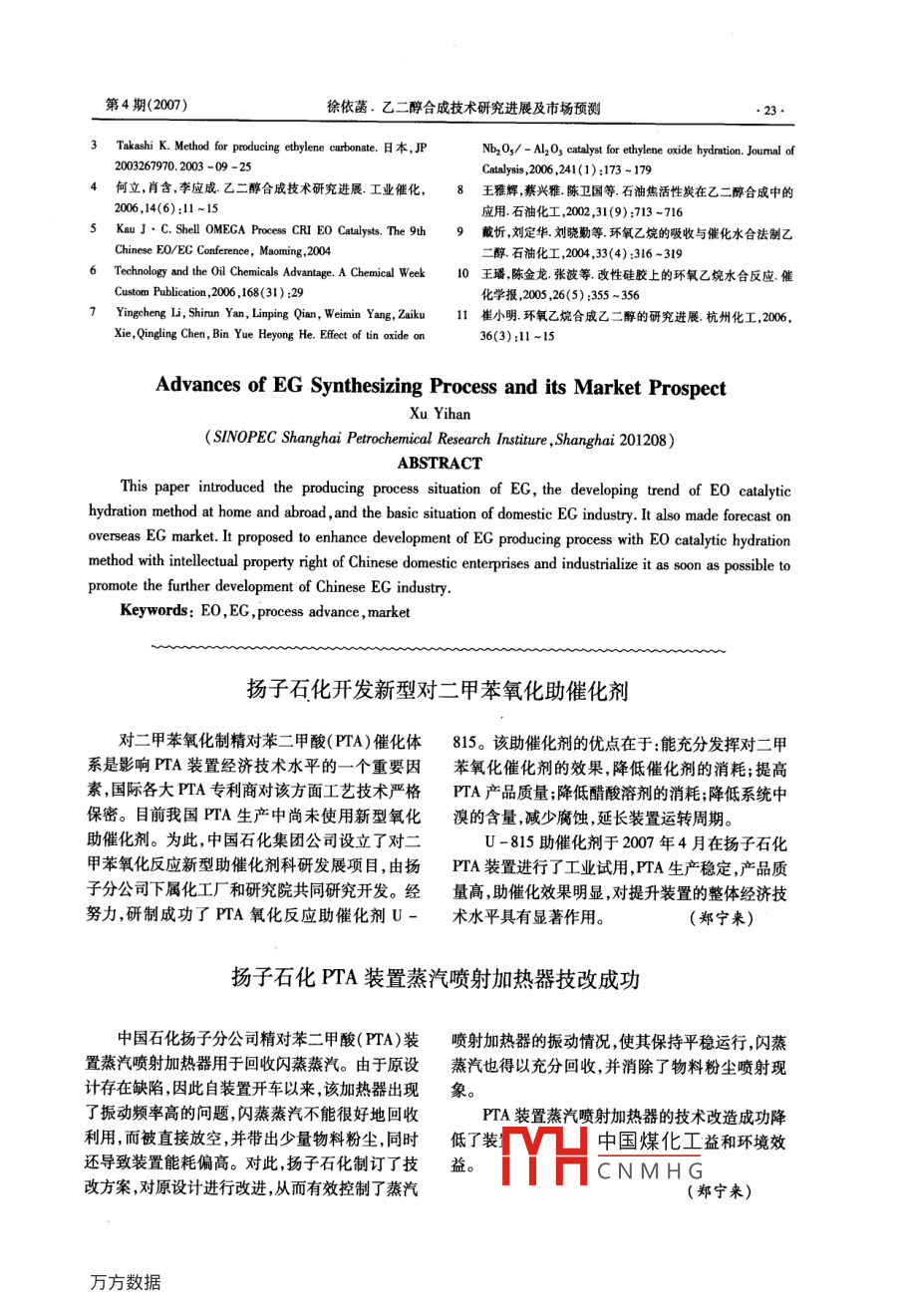 石油化工技術(shù)經(jīng)濟第23卷第4期Techno-Economics in Petrochemicals007年8月市場研究乙二醇合成技術(shù)研究進展及市場預(yù)測徐依菡(中國石化上海石油化工研究院,上海201208)摘要:主要介紹了乙二醇(EG)的生產(chǎn)技術(shù)現(xiàn)狀詳細介紹了國內(nèi)外環(huán)氧乙烷(EO)催化水合法制EC技術(shù)的發(fā)展動向和國內(nèi)EG工業(yè)的基本情況,并對EG國外市場進行了預(yù)測。建議加強具有我國自主知識產(chǎn)權(quán)的EO催化水合法制EG技術(shù)的開發(fā)并盡快實現(xiàn)產(chǎn)業(yè)化,以促進我國EC工業(yè)的進一步發(fā)展關(guān)鍵詞:環(huán)氧乙烷乙二醇技術(shù)進展市場文章編號:1007-6476(2007)04-0020-04中圖分類號:TQ214文獻標識碼:A乙二醇(EC)是結(jié)構(gòu)最簡單和最重要的脂肪代美國 Halcon sd公司和聯(lián)合碳化物公司(UCC族二元醇,主要用作生產(chǎn)聚酯(PET)的單體,其次開發(fā)出的一種EG合成方法,即EO與CO2反應(yīng)是用作防凍液還有一些用于精細化工產(chǎn)品的生生成碳酸亞乙酯,后者經(jīng)水解產(chǎn)生EG。日本觸媒產(chǎn),如表面活性劑潤滑劑、聚氨酯和增塑劑等?;瘜W(xué)公司先后釆用Mo、W金屬或其化合物、堿金據(jù)美國斯坦福研究所統(tǒng)計,2006年全球EG屬碳酸鹽、碳酸氫鹽、羧酸鹽、鹵化物、季銨鹽、季消費量為17010Mt,其中80.5%用于生產(chǎn)PET,磷鹽及離子交換樹脂等作為EG合成用催化12.0%用于生產(chǎn)防凍液。在世界經(jīng)濟發(fā)展保持良劑(。目前對該方法進行深入研究的主要有陶好態(tài)勢的前提下,預(yù)計2011年全球EG的總消費氏公司及三菱化學(xué)株式會社。量為21.718Mt。陶氏公司正致力于以陰離子交換樹脂為催化劑,在添加劑的共同作用下制備EG的方法研究生產(chǎn)技術(shù)現(xiàn)狀和發(fā)展動向添加劑主要由CO2和無機或有機堿組成以使反1.1生產(chǎn)技術(shù)現(xiàn)狀應(yīng)體系的pH值保持在50~9.0之間,同時,添目前EC工業(yè)化生產(chǎn)大多采用環(huán)氧乙烷加劑使樹脂的溶脹速率有了一定程度的降低,還(EO)直接水合法,生產(chǎn)技術(shù)由殼牌(She)美國可以提高EO的轉(zhuǎn)化率及EG的選擇性??茖W(xué)設(shè)計(SD)以及陶氏(DOW)3家公司壟斷,各菱化學(xué)株式會社采用兩步法工藝制備公司的工藝技術(shù)和流程基本相同,通常是將水與EG3,催化劑可以是在EO酯化步驟中溶解于吸EO按照物質(zhì)的量比為25:1的比例混合,在190~收液中的均相型催化劑,也可以是包含固體催化200℃2.23MPa下反應(yīng)30min得到EC。由于劑的填充型非均相催化劑,催化劑用量為吸收液反應(yīng)中水大大過量,產(chǎn)物中EG的質(zhì)量分數(shù)較低。質(zhì)量的3%-7%。均相型酯化催化劑為堿金屬為了對產(chǎn)品進行提純需通過蒸發(fā)除去大量的水溴化物或碘化物、堿土金屬鹵化物烷基胺及季銨分,因此能耗較大,這也是現(xiàn)行EG生產(chǎn)方法的主鹽、季磷鹽、有機錫或有機鍺等。為了提高催化劑要缺點。的活性和選擇性,優(yōu)選KBr、KI、三丁基甲基碘化1.2國外技術(shù)發(fā)展動向磷、四丁基碘化磷、三苯基甲基碘化磷等,尤其是針對傳統(tǒng)的EO水合法制EC能耗大、選擇性低等缺點,國外多家公司開展了各種EG催化劑中國煤化工和工藝開發(fā)研究。THCNMH(州工業(yè)大學(xué),工程師,EO經(jīng)碳酸亞乙酯合成EG是20世紀70年主要從事有機原料行業(yè)信息調(diào)研工作第4期(2007)徐依菡.乙二醇合成技術(shù)研究進展及市場預(yù)測鹵化季磷鹽。對于非均相反應(yīng),常采用離子交換合比提高EG生產(chǎn)能力為目的的工業(yè)側(cè)線試驗樹脂,基于Mo、W的雜多酸及其鹽等。在CO2與2004年中國石化揚子石化公司完成了加壓催化EO的物質(zhì)的量比0.5-5流速3-20kg(cm2和水合法合成EG的中試該法與非催化水合工藝80-150℃條件下反應(yīng)12~120min,EO轉(zhuǎn)化率相比,EO的轉(zhuǎn)化率和EG的選擇性均提高10%以達到9%,只生成微量的二乙二醇(DEG),幾乎上。不產(chǎn)生三乙二醇(TEG)及其他高沸物。中科院蘭州化學(xué)物理研究所在2006年完成殼牌公司對EG技術(shù)的研發(fā)工作持續(xù)了多了由EO與CO2合成碳酸乙烯酯,經(jīng)甲醇酯交換年,“ OMEGA”是其最新研發(fā)的工藝之一。該工藝合成EG,同時聯(lián)產(chǎn)碳酸二甲酯的全流程工藝開采用有機磷鐲鹽為催化劑,在水比(n(水):n發(fā),目前己進入中試階段。該技術(shù)針對聚酯合成(EO))小于5的情況下,可使EO制取EG的選擇對EG產(chǎn)品質(zhì)量要求高的特點,開發(fā)了適應(yīng)規(guī)模性達到約99.5%,而采用傳統(tǒng)工藝會產(chǎn)生約10%化生產(chǎn)的管式循環(huán)反應(yīng)工藝、分離耦合工藝和EG產(chǎn)品催化精制工藝,為低成本工業(yè)化生產(chǎn)EG和的DEG和TEC副產(chǎn)物。因此,以相同質(zhì)量的乙碳酸二甲酯提供了技術(shù)支撐,發(fā)展?jié)摿艽?經(jīng)濟烯為原料,采用“ OMEGA"技術(shù)可多產(chǎn)10%以上效益顯著。的EG,即獲取同樣質(zhì)量的EG,所需乙烯原料可以華東理工大學(xué)、北京石化工程公司和中國石減少10%。該工藝具有產(chǎn)品收率最大水用量少化燕山石化公司聯(lián)合進行反應(yīng)精餾試驗,在燕山且?guī)缀鯖]有副產(chǎn)物的特點。這套工藝從實驗室、石化EOEG裝置旁安裝1套塔徑為300m、規(guī)中試裝置到商業(yè)應(yīng)用的成比例放大試驗已經(jī