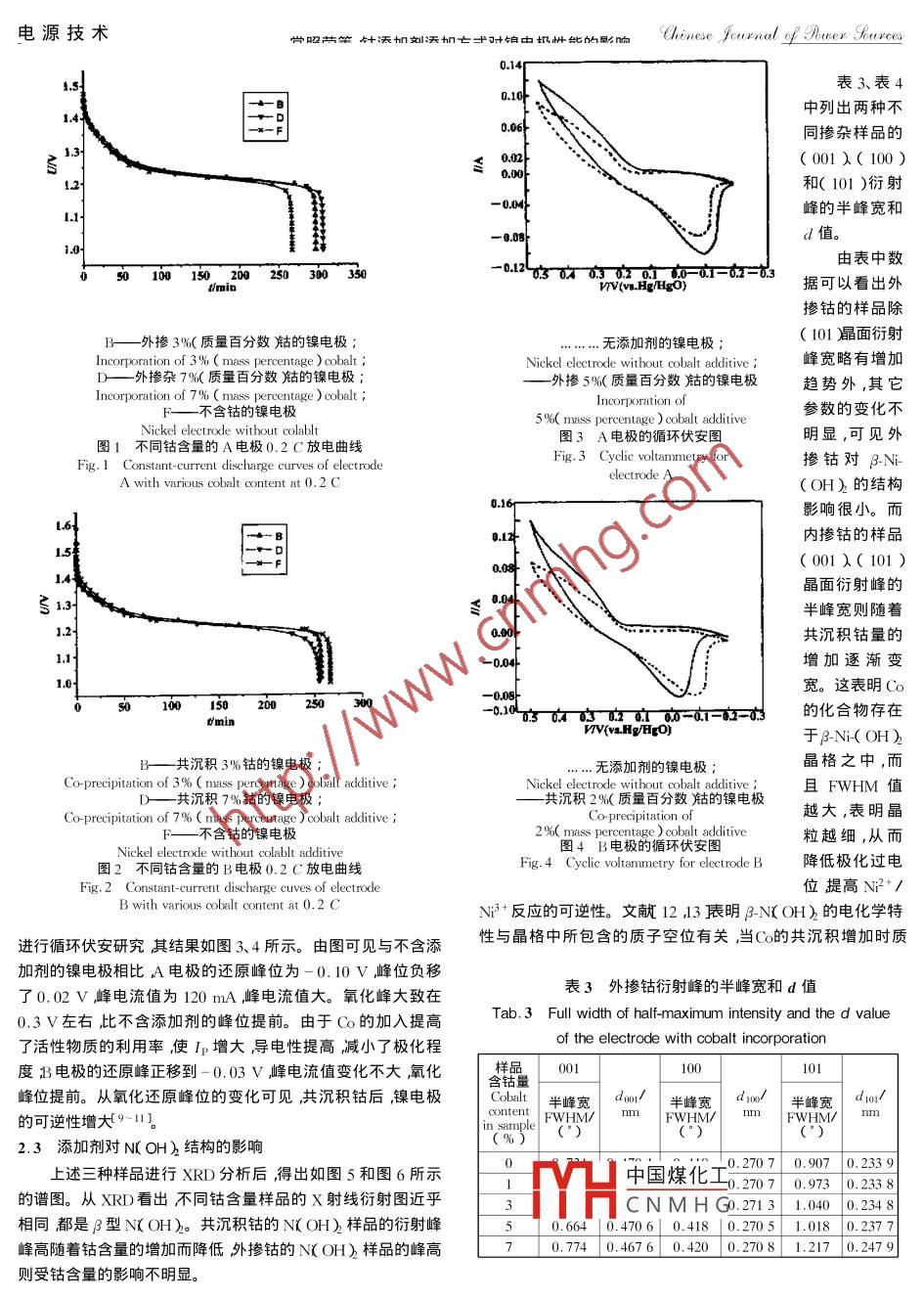 電源技術(shù)thinese, fownal f Pouver Sources研究|與設(shè)計(jì)鈷添加劑添加方式對(duì)鎳電極性能的影響常照榮,任行濤,彭鵬,李苞,趙玉娟(河南師范大學(xué)化學(xué)與環(huán)境科學(xué)學(xué)院河南新鄉(xiāng)453002 )摘要通過(guò)外摻和共沉積的方式制備了兩種不同鈷含量的鎳電極對(duì)電極的充放電性能進(jìn)行了測(cè)試。實(shí)驗(yàn)表明鈷的添加方式在對(duì)鎳電極性能的改進(jìn)中起了很大的作用外摻法顯著改善了鎳電極的性能共沉積卻不能起到相應(yīng)的效果。同時(shí)通過(guò)循環(huán)伏安法和X射線衍射法對(duì)鈷元素的作用機(jī)理進(jìn)行了研究探討提出了-種新的見(jiàn)解:以外摻方式加入的鈷在充電過(guò)程中能夠生成導(dǎo)電性能良好的CoOOH,從而提高電極性能;而以共沉積加入的鈷形成了導(dǎo)電性能不好的C&OH)因而不能有效提高電極性能。關(guān)鍵詞鎳電極鈷添加劑添加方式循環(huán)伏安法x射線衍射法中圖分類號(hào):TM912.2文獻(xiàn)標(biāo)識(shí)碼A .文章編號(hào):1002-087 X( 2002增-0228-05Effects of various methods to cobalt addition on theperformance of nickel electrodeCHANG Zhao- rong , REN Xing- tao , PENG Peng ,LI Bao , ZHAO YU-juan( College of Chemistry and Environmental Science , Henan Normal University , Xinxiang Henan 453002 , China )Abstract : Two types of nickel electrode with different cobalt content were prepared by incorporation and co-pre-cipitation , and their charge/ discharge performance was tested. The experimental results show that the effect ofcobalt- adding method on the modification of nickel electrode performance is great. Adding cobalt by incorpora-tion method can improve the performance of nickel electrode whereas adding by co-precipitation method can not.In addition , the effective mechanism of cobalt element is investigated by cyclic voltammetry and X ray diffrac-tion and a new point-of view was presented. That is , adding cobalt by incorporation method during charge caus-es the production of CoOOH with good conductivity , which is favorable to improve electrode performance. How-ever , adding cobalt by co precipitation method causes the production of Cd OH ) with bad conductivity , so theelectrode perormance is not improved.Key words : nickel electrode ; cobalt additive ; addition method ; cyclic voltammetry ; X- ray diffraction氫氧化鎳被廣泛地用作Cd-Ni、FeNi. Zn-Ni和MH-Ni等金屬元素,如Co、Zn、Cd等42];二是在制備鎳電極時(shí),在Ni-堿性蓄電池的正極活性物質(zhì)。近年來(lái)隨著電池研究的不斷深(OH)粉末中直接加入或在其表面包覆一些金屬或金屬氧化入和對(duì)電池性能要求的不斷提高制備高性能的鎳電極已經(jīng)是物粉末,如 Co.Cd OH)2、CoO和CdO等[3~61?;瘜W(xué)摻雜與物.迫在眉捷。然而氫氧化鎳是- -種導(dǎo)電性能不良的p型半導(dǎo)理?yè)诫s的作用有相似之處但也不盡相同?;瘜W(xué)摻雜是在晶體體11。粒子與粒子之間以及粒子與基體之間存在較大接觸電學(xué)上對(duì)N( OH)晶體的微結(jié)構(gòu)產(chǎn)生影響改變N(OH)的p阻,因而活性物質(zhì)的利用率不高。型半導(dǎo)體特性和質(zhì)子在其中的擴(kuò)散速率,以及在充放電循環(huán)過(guò)要提高活性物質(zhì)的利用率和電極的一些 重要化學(xué)性能必程中結(jié)構(gòu)的穩(wěn)定性而物理?yè)诫s主要是對(duì)N( OH )表面進(jìn)行改須對(duì)氫氧化鎳進(jìn)行摻雜和表面改性處理。摻雜主要有兩種途性特別是電子導(dǎo)電性,以提高活性物質(zhì)利用率。徑一是在制備正極材料時(shí)通過(guò)化學(xué)共沉積方法引入其它過(guò)渡對(duì)鎳電極添加劑的研究很多其中鈷添加劑研究最多這主要是鈷添加劑對(duì)鎳電極具有獨(dú)特的作用。本文通過(guò)外摻和收稿日期2001-10-17共沉積白中國(guó)煤化工;量的鈷元素對(duì)兩種類型作者簡(jiǎn)介常照榮( 1956- )男河南省人教授研究方向?yàn)槲锢淼碾姌O語(yǔ)YHCNMHG外摻鈷顯著提高了鎳電化學(xué)和應(yīng)用電化學(xué)。極的性能而共沉積鈷對(duì)鎳電極性能卻起到相反的效果。同Biography :CHANG Zhao rong( 1956- - - ) male professor.時(shí)我們還用循環(huán)伏安法和x射線衍射法對(duì)鈷添加劑的作用機(jī)理進(jìn)行了研究探討提出了-些新的見(jiàn)解。Vol. 26增刊2281面2002電源技術(shù)thinse, Journal of Pouer Sowrces研究「與,設(shè)計(jì)1實(shí)驗(yàn)L LiOH作電解液組成實(shí)驗(yàn)電池進(jìn)行恒電流充放電測(cè)試。充.1 N( OH)的制備放電制度為先以理論容量的0.1倍(0.1 C )充電15h間隔10 .控制反應(yīng)的溫度、反應(yīng)物濃度、加料速度以及最終堿含量,min再以0.1 C放電至1.0 V(vs. Cd電極)經(jīng)過(guò)2個(gè)循環(huán)以將鎳鹽逐步加入堿液中,所得產(chǎn)品經(jīng)過(guò)濾、烘干、洗滌、二次烘后再以0.2C充電7.5h間隔10 min再以0.2C放電至1.0干、研磨、過(guò)篩。Vvs.Cd電極)采用相同的充放電制度進(jìn)行多次充放電循環(huán),共沉積含Co的氫氧化鎳是由含有不同Co2+量的鎳鹽和直至充放電性能穩(wěn)定(通常在3個(gè)循環(huán)后) N( OH)的理論堿液通過(guò)化學(xué)共沉積制備而得。容量值為289. 4 mAh/go1.2鎳電極的制備1.4 循環(huán)伏安實(shí)驗(yàn)電極片采用金屬網(wǎng)作集流體截成1 cmX1 cm的尺寸將分別以A. B電極以及無(wú)添加劑的鎳電極作為研究電極電-定比例的 NC OH)、Ni粉和Co混合均勻,直接加入模具中,解質(zhì)溶液為30%的KOH溶液在以Pt為輔助電極,Hg/HgO在30 M