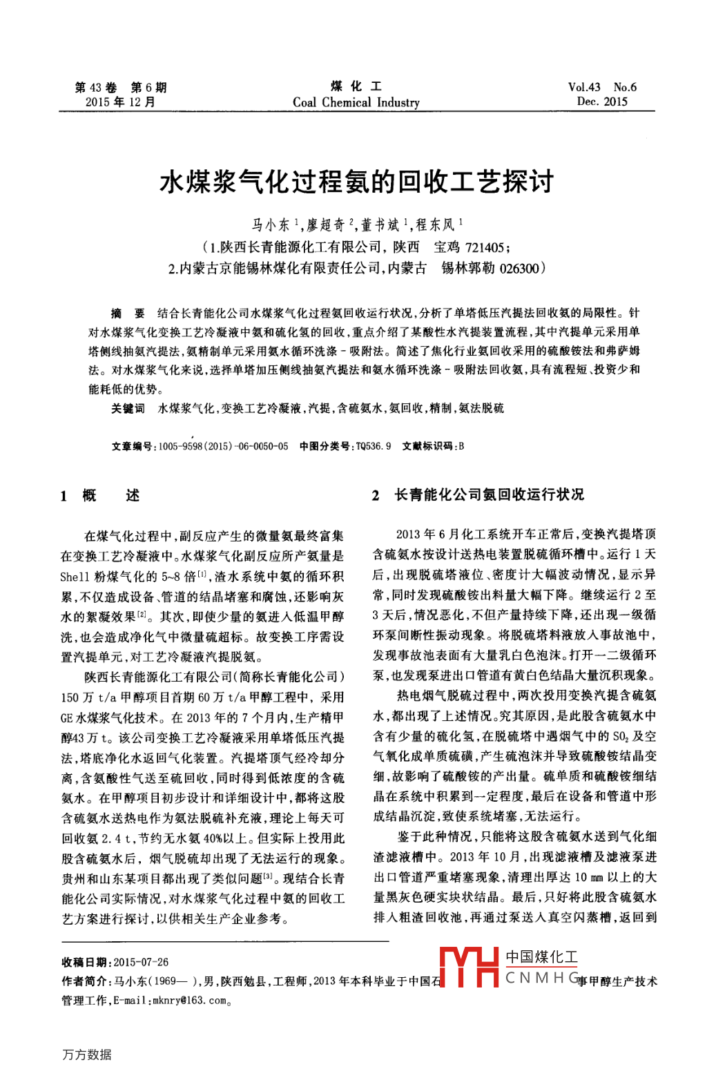 - 期刊名字:煤化工