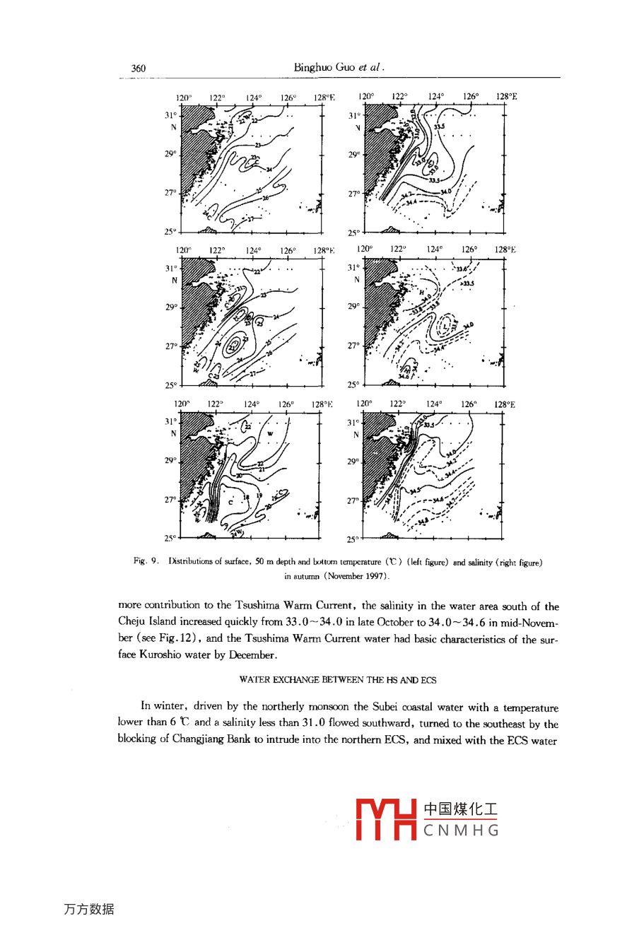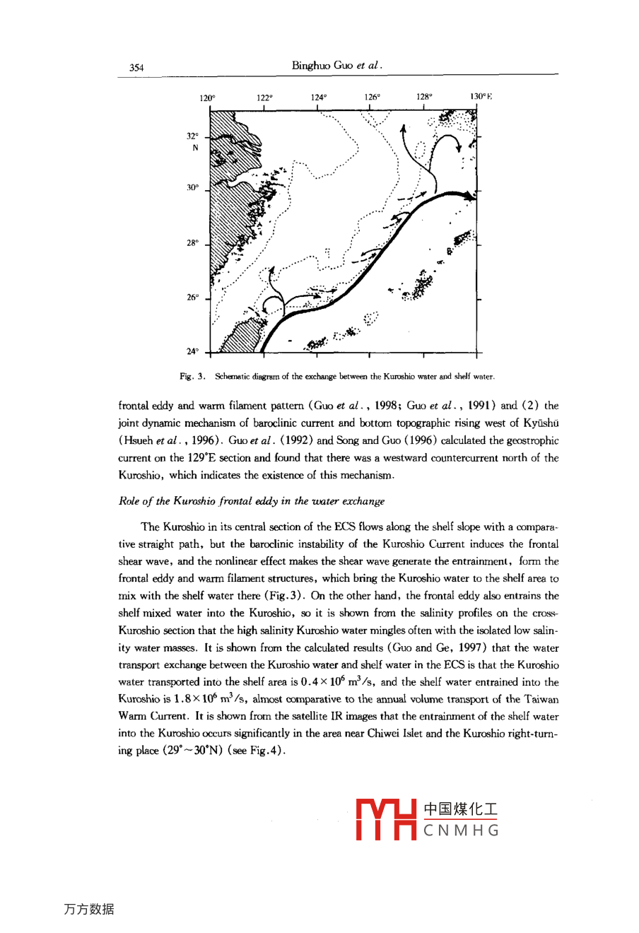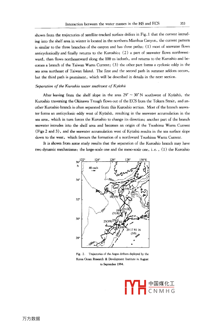 Acta Cenolopica Sinica, Vol. 22. No. 3, pp. 351-~ 367, 2003.ISSN 0253 505XPublished by China Ocean Press.Study on interaction between the coastal water, shelf water andKuroshio water in the Huanghai Sea and East China Sea *Binghuo Guol , Xiaomin Hu' , Xuejun Xiong' , Renfeng Ge'(Reeired March 10, 2003; aceped June 10, 2003)Ahstract一The main proesses of interaction between the coastal water, shelf water and Kuroshiowater in the Huanghai Sea (HS) and East China Sea (ECS) are analyzed based on the observation andstudy resuts in recent years. These proeses include the intrusion of the Kurohio water into the shelfarea of the ECS, the entrainment of the shelf water into the Kuroshio, the seasonal process in the south-em shelf area of the ECS crntolld alternatively by the Taiwan Strait water and the Kurshio water in-truding into the shelf atea, the interction between the Kuroshio branch water, shelf mixed water andmodified coastal water in the northeastem ECS, the water exchange between the HS and ECS and thespread of the Changjiang diluted water.Key words Huanghai Sea, East China Sea, coastal water, sbelf water, Kuroshio water, interactionINTRODUCTIONIt has been shown from the thermohaline characteristic analysis and water masses divisionof the HS and ECS that there are three major water masses in the HS and ECS, and they are(1) the coastal water, that is located in the continental coastal water area and the water area offthe west coast of the Korea Peninsula with a basic feature of low salinity and is characteristic oflow temperature in winter; (2) the Kuroshio water, that is located in the Okinawa Trough ofthe ECS andisa warm and saline water; (3) the shelf mixed water, a mixed water of thecoestal water and Kuroshio water, occupies the extensive shelf water area. The interaction be-tween the three water masses and their seasonal variations constitute cormplex marine dynamicprocesses and control the space- time structures of marine environments in the HS and ECS.The nutrients and suspended matter carried by the water masses feed different planktons andeconomic fishes, and the pollutants carried by them also generate adverse impact on the marineenvironment. The interaction and exchange between the three water masses govern the trans-portation, dispersion and settlement of sediments into the sea and bring about the inhomogene-* This stuty was supred by the National Thenatie Prjeat of Marine Surveys and the Nationl Mejor Fundemental Re-search and Development Prjet of Chin under contract No. G1999 - 043802.1. First Institute of Oceanography, State Oceanic Adninstration, Qingdeo 266061, Chine中國煤化工MYHCNMHG352Binghuo Guo et al.ity of marine resource spatial distibution, so the understanding of these processes will providescientific basis for the marine environmental protection. In this paper, the study results in thisfield in recent years are summarized, and the main interaction processes of the three watermasses in the HS and ECS are described.INTRUSION OF THE KUROSHIO INIO THE ECS SHELF AND ENTRAINMENTOF SHELF WATER INTO THE KUROSHIOThe Kuroshio is a farnous western boundary curent, the North Equatorial Current is sepa-rated into two branches after meeting the western boundary barrier consisting of the Philippinesand China' s Taiwan Island, the southward branch is the Mindanao Current, and the north-ward branch is the Kuroshio. The Kuroshio flows over the Yilan Ridge and enters the ECS,then flows northeastward along the shelf slope, and flows out of the ECS from the TokaraStrait. Influenced by the topography, the Kuroshio has two significant meanders, one is locat-ed in the water area northeast of the Taiwan Island, and the other is located in the water areasouthwest of the Kyushu Island (29° ~ :30°N, and 127 *30' ~ 128*30 E), and the two areas are .places with the strongest water exchange between the Kuroshio water and shelf water.120° 121°122*123° 1241259126°127°E9°+NR°270100260.25° -4°t93206179320618 ,30,832062022°Fig. 1. Teietories of the Argos drifters deployed off the east coast of Taiwan Island in November 17, 1994.Intrusion of the Kuroshio northeast of Taivan IslandThe Kuroshio Current northeast of the Taiwan Island is obstructed by the east - westtrend shelf slope, which results in the intrusion of the Kuroshio water into the shelf area. It is中國煤化工MYHCNMHGInteraction between the water masses in the HS and ECS353shown from the trjectories of stllite-tracked surface drifers in Fig.1 that the current intrud-ing into the shelf area in winter is located in the northern Mianhua Canyon, the current patternis similar to the three branches of the canyon and has three paths: (1) most of seawater flowsanticylonically and finally returns to the Kuroshio; (2) a part of seawater flows northwest-ward, then flows northeastward along the 100 m isobath, and returms to the Kuroshio and be-comnes a branch of the Taiwan Warm Current; (3) the other part forms a cyclonic eddy in thesea area northeast of Taiwan Island. The first and the second path in summer seldom Occurs,but the third path is prominent, which will be described in details in the next section.Separation of the Kuroshio water soutruest of KyishuAfter leaving from the shelf slope in the area 29° ~ 30* N southwest of Kyushi,theKuroshio traversing the Okinawa Trough flows out of the ECS from the Tokara Strait, and an-other Kuroshio branch is often separated from this Kuroshio section. Most of the branch seawa-ter forms an anticyclonic eddy west of Kyuishu, resulting in the seawater accurmulation in thesea area, which in turn forces the Kuroshio to change its direction; another part of the branchseawater intrudes into the shelf area and becomes an origin of the Tsushima Warm Current(Figs 2 and 3), and the seawater accumulation west of Kyushu results in the sea surface slopedown to the west, which favours the formation of a northward Tsushima Warm Current.It is shown from some study results that the separation of the 
