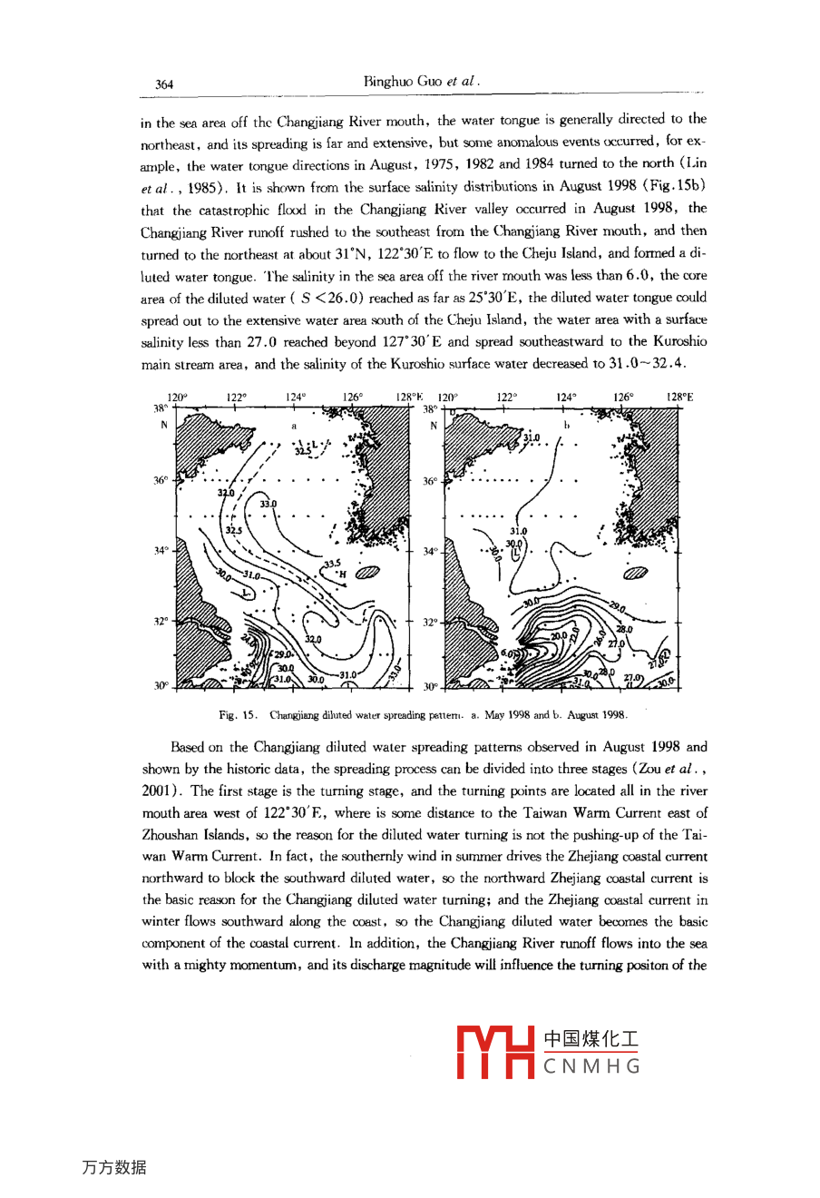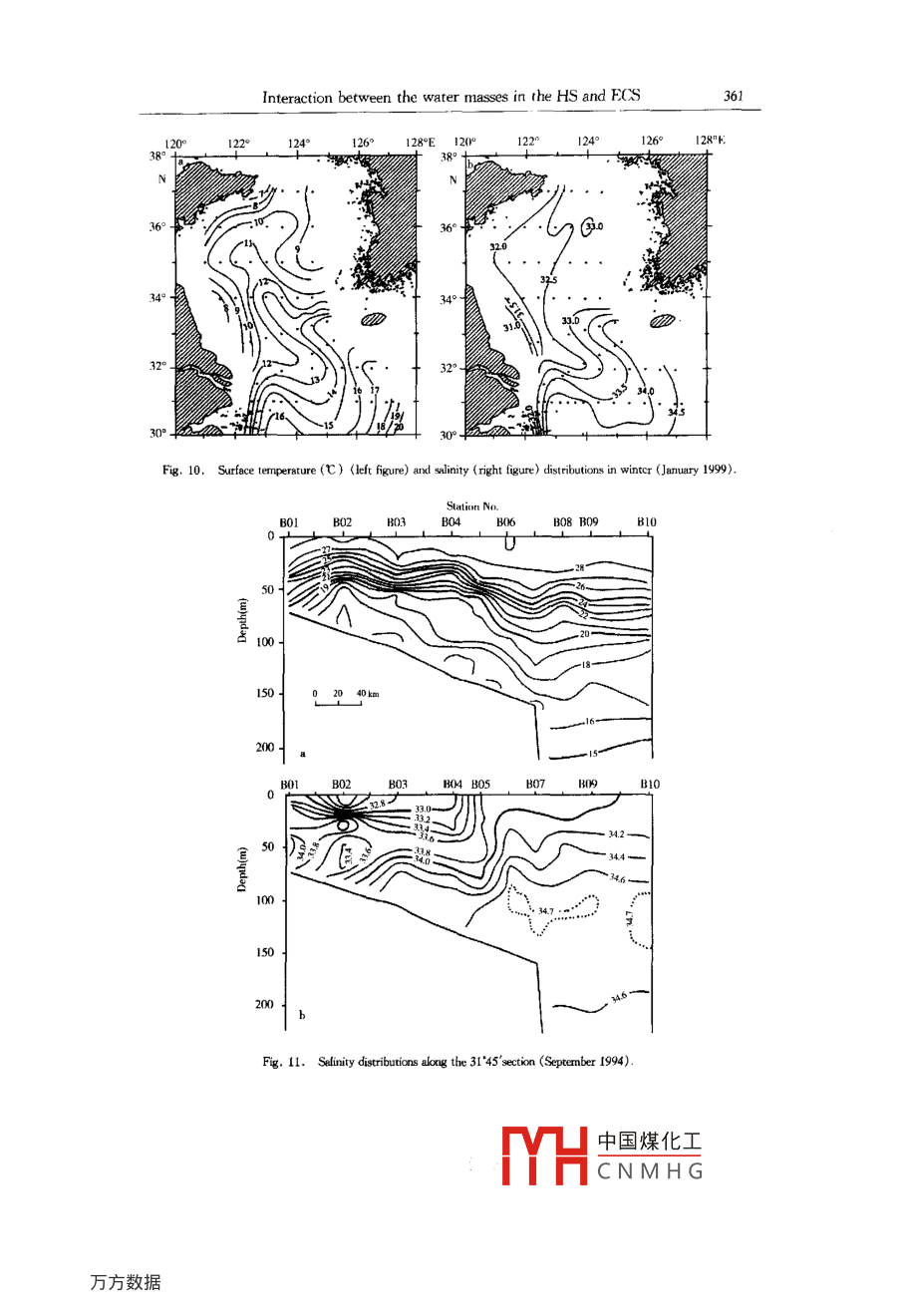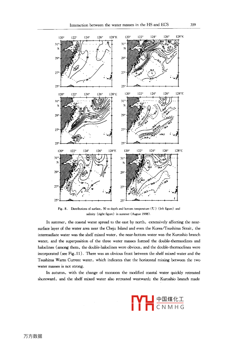 Acta Cenolopica Sinica, Vol. 22. No. 3, pp. 351-~ 367, 2003.ISSN 0253 505XPublished by China Ocean Press.Study on interaction between the coastal water, shelf water andKuroshio water in the Huanghai Sea and East China Sea *Binghuo Guol , Xiaomin Hu' , Xuejun Xiong' , Renfeng Ge'(Reeired March 10, 2003; aceped June 10, 2003)Ahstract一The main proesses of interaction between the coastal water, shelf water and Kuroshiowater in the Huanghai Sea (HS) and East China Sea (ECS) are analyzed based on the observation andstudy resuts in recent years. These proeses include the intrusion of the Kurohio water into the shelfarea of the ECS, the entrainment of the shelf water into the Kuroshio, the seasonal process in the south-em shelf area of the ECS crntolld alternatively by the Taiwan Strait water and the Kurshio water in-truding into the shelf atea, the interction between the Kuroshio branch water, shelf mixed water andmodified coastal water in the northeastem ECS, the water exchange between the HS and ECS and thespread of the Changjiang diluted water.Key words Huanghai Sea, East China Sea, coastal water, sbelf water, Kuroshio water, interactionINTRODUCTIONIt has been shown from the thermohaline characteristic analysis and water masses divisionof the HS and ECS that there are three major water masses in the HS and ECS, and they are(1) the coastal water, that is located in the continental coastal water area and the water area offthe west coast of the Korea Peninsula with a basic feature of low salinity and is characteristic oflow temperature in winter; (2) the Kuroshio water, that is located in the Okinawa Trough ofthe ECS andisa warm and saline water; (3) the shelf mixed water, a mixed water of thecoestal water and Kuroshio water, occupies the extensive shelf water area. The interaction be-tween the three water masses and their seasonal variations constitute cormplex marine dynamicprocesses and control the space- time structures of marine environments in the HS and ECS.The nutrients and suspended matter carried by the water masses feed different planktons andeconomic fishes, and the pollutants carried by them also generate adverse impact on the marineenvironment. The interaction and exchange between the three water masses govern the trans-portation, dispersion and settlement of sediments into the sea and bring about the inhomogene-* This stuty was supred by the National Thenatie Prjeat of Marine Surveys and the Nationl Mejor Fundemental Re-search and Development Prjet of Chin under contract No. G1999 - 043802.1. First Institute of Oceanography, State Oceanic Adninstration, Qingdeo 266061, Chine中國煤化工MYHCNMHG352Binghuo Guo et al.ity of marine resource spatial distibution, so the understanding of these processes will providescientific basis for the marine environmental protection. In this paper, the study results in thisfield in recent years are summarized, and the main interaction processes of the three watermasses in the HS and ECS are described.INTRUSION OF THE KUROSHIO INIO THE ECS SHELF AND ENTRAINMENTOF SHELF WATER INTO THE KUROSHIOThe Kuroshio is a farnous western boundary curent, the North Equatorial Current is sepa-rated into two branches after meeting the western boundary barrier consisting of the Philippinesand China' s Taiwan Island, the southward branch is the Mindanao Current, and the north-ward branch is the Kuroshio. The Kuroshio flows over the Yilan Ridge and enters the ECS,then flows northeastward along the shelf slope, and flows out of the ECS from the TokaraStrait. Influenced by the topography, the Kuroshio has two significant meanders, one is locat-ed in the water area northeast of the Taiwan Island, and the other is located in the water areasouthwest of the Kyushu Island (29° ~ :30°N, and 127 *30' ~ 128*30 E), and the two areas are .places with the strongest water exchange between the Kuroshio water and shelf water.120° 121°122*123° 1241259126°127°E9°+NR°270100260.25° -4°t93206179320618 ,30,832062022°Fig. 1. Teietories of the Argos drifters deployed off the east coast of Taiwan Island in November 17, 1994.Intrusion of the Kuroshio northeast of Taivan IslandThe Kuroshio Current northeast of the Taiwan Island is obstructed by the east - westtrend shelf slope, which results in the intrusion of the Kuroshio water into the shelf area. It is中國煤化工MYHCNMHGInteraction between the water masses in the HS and ECS353shown from the trjectories of stllite-tracked surface drifers in Fig.1 that the current intrud-ing into the shelf area in winter is located in the northern Mianhua Canyon, the current patternis similar to the three branches of the canyon and has three paths: (1) most of seawater flowsanticylonically and finally returns to the Kuroshio; (2) a part of seawater flows northwest-ward, then flows northeastward along the 100 m isobath, and returms to the Kuroshio and be-comnes a branch of the Taiwan Warm Current; (3) the other part forms a cyclonic eddy in thesea area northeast of Taiwan Island. The first and the second path in summer seldom Occurs,but the third path is prominent, which will be described in details in the next section.Separation of the Kuroshio water soutruest of KyishuAfter leaving from the shelf slope in the area 29° ~ 30* N southwest of Kyushi,theKuroshio traversing the Okinawa Trough flows out of the ECS from the Tokara Strait, and an-other Kuroshio branch is often separated from this Kuroshio section. Most of the branch seawa-ter forms an anticyclonic eddy west of Kyuishu, resulting in the seawater accurmulation in thesea area, which in turn forces the Kuroshio to change its direction; another part of the branchseawater intrudes into the shelf area and becomes an origin of the Tsushima Warm Current(Figs 2 and 3), and the seawater accumulation west of Kyushu results in the sea surface slopedown to the west, which favours the formation of a northward Tsushima Warm Current.It is shown from some study results that the separation of the 