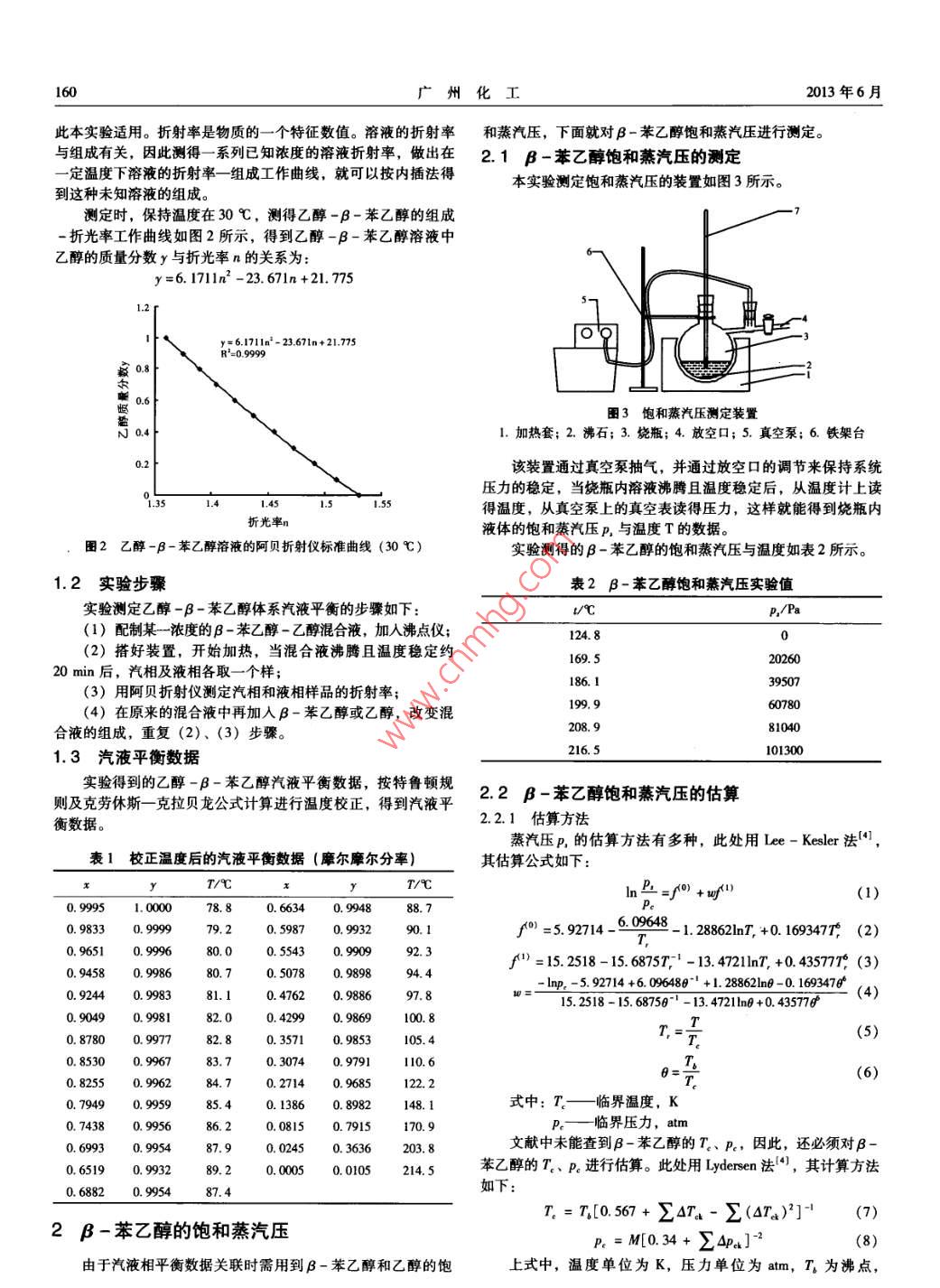 第41卷第11期廣州化工Vol 41 No. 112013年6月Guangzhou Chemical IndustryJune 2013β-苯乙醇與乙醇汽液相平衡數(shù)據(jù)測(cè)定與關(guān)聯(lián)付正立(福州工業(yè)學(xué)校,福建福州350018)摘要:利用沸點(diǎn)儀測(cè)定B-苯乙醇與乙醇的汽液相平衡數(shù)據(jù),同時(shí)實(shí)驗(yàn)測(cè)得的B-苯乙醇的飽和蒸汽壓與溫度,采用LeeKesler法估算不同溫度下β-苯乙醇的飽和蒸氣壓,得到B-苯乙醇的 Antoine方程,應(yīng)用 Wilson方程進(jìn)行關(guān)聯(lián),獲得相應(yīng)的模型參數(shù),為B-苯乙醇的分離提純工藝提供了基礎(chǔ)數(shù)據(jù)與理論依據(jù)關(guān)鍵詞:B-苯乙醇;飽和蒸氣壓;汽液平衡; Wilson方程中圖分類(lèi)號(hào):065文獻(xiàn)標(biāo)識(shí)碼:A文章編號(hào):1001-9677(2013)11-0159-04Determination and Correlation of Vapor-liquid EquilibriumData for B-phenylethanol and EthanolZheng-liFuzhou Industrial School, Fujian Fuzhou 350018, China)Abstract: B-phenylethano and ethanol vapor-liquid equilibrium data were determined by using ebulliometerAt the same time, the experimental measured B- phenylethanol saturated vapor pressure and temperature. The saturated vapor pressures of B- phenylethanol at different temperatures were estimated by the Lee-Kesler method. TheAntoine equation of B- phenylethanol was regressed. Associated with Wilson equation, the corresponding modelparameters were obtained. The basic data and theoretical basis of B-phenylethano separation purification processwere providedKey words: B- phenylethanol; saturated vapor pressure; vapour liquid equilibrium; Wilson equationB-苯乙醇是一種具有淡雅、細(xì)膩而持久的玫瑰氣味的芳管拿下,在該處連接真空泵,通過(guò)4閥門(mén)的調(diào)節(jié)來(lái)調(diào)節(jié)系統(tǒng)的香醇,在食品、藥品、化妝品、煙草和日化用品中有著廣泛的真空度。應(yīng)用。B-苯乙醇的生產(chǎn)方法主要有物理提取法、化學(xué)合成法和生物轉(zhuǎn)化法等2,其中生物轉(zhuǎn)化法生產(chǎn)得到的B-苯乙醇無(wú)不良副產(chǎn)物,產(chǎn)品品質(zhì)高,被廣泛應(yīng)用于B-苯乙醇的合成。發(fā)酵液經(jīng)樹(shù)脂吸附和乙醇洗脫后含有少量水的乙醇、B-苯乙醇洗脫液需經(jīng)過(guò)精餾分離和精制才能獲得β-苯乙醇產(chǎn)品,并冷卻水回收洗脫劑乙醇。然而B(niǎo)-苯乙醇與乙醇二元系汽液平衡數(shù)據(jù)目前尚未見(jiàn)公開(kāi)的文獻(xiàn)報(bào)道。因此,本文對(duì)B-苯乙醇與乙醇二元體系汽液相平衡數(shù)據(jù)進(jìn)行測(cè)定,這不僅對(duì)生物法合成B-苯乙醇的工業(yè)應(yīng)用具有十分重要的意義,而且也為洗脫液中1冷卻水β-苯乙醇的分離提純工藝提供了基礎(chǔ)數(shù)據(jù)與理論依據(jù)。汽液平衡數(shù)據(jù)實(shí)驗(yàn)采用直接法中的汽相單循環(huán)法測(cè)定3。1乙醇-β-苯乙醇體系汽液平衡數(shù)據(jù)1.1汽液平衡實(shí)驗(yàn)裝置圖1汽液平衡實(shí)驗(yàn)裝置實(shí)驗(yàn)裝置如圖1所示。1.加熱套;2.沸石;3.沸點(diǎn)儀;4.汽相取樣口該裝置為接有回流冷凝管的圓底燒瓶,冷凝管底部有一小5.冷凝管;6.溫度計(jì);7.鐵架臺(tái)槽,用以收集冷凝下來(lái)的平衡蒸汽的樣品,該樣品可用細(xì)長(zhǎng)的膠頭滴管從取樣口4抽取,液相樣品則通過(guò)燒瓶口抽取。同本實(shí)驗(yàn)乙醇-B-苯乙醇體系的汽液平衡和精餾實(shí)驗(yàn)樣品時(shí),該裝置還可用來(lái)測(cè)飽和蒸汽壓,測(cè)飽和蒸汽壓時(shí),將冷凝組成的分析用阿貝折射儀分析。因?yàn)锽-苯乙醇和乙醇的折射率相差較大,且折射率法所需的樣品量少,測(cè)量較為迅速,因作者簡(jiǎn)介:付正立(1968-),男,碩士,講師,主要從事傳質(zhì)分離研究廣州化工2013年6月此本實(shí)驗(yàn)適用。折射率是物質(zhì)的一個(gè)特征數(shù)值。溶液的折射率和蒸汽壓,下面就對(duì)B-苯乙醇飽和蒸汽壓進(jìn)行測(cè)定與組成有關(guān),因此測(cè)得一系列已知濃度的溶液折射率,做出在2.1B-苯乙醇飽和蒸汽壓的測(cè)定定溫度下溶液的折射率一組成工作曲線(xiàn),就可以按內(nèi)插法得本實(shí)驗(yàn)測(cè)定飽和蒸汽壓的裝置如圖3所示。到這種未知溶液的組成。測(cè)定時(shí),保持溫度在30℃,測(cè)得乙醇-B-苯乙醇的組成折光率工作曲線(xiàn)如圖2所示,得到乙醇-B-苯乙醇溶液中乙醇的質(zhì)量分?jǐn)?shù)y與折光率n的關(guān)系為y=6.17ln2-23.67ln+21.775y=61711n2-23.671n+21.75R2=0.9999毅0圖3飽和蒸汽壓測(cè)定裝置1.加熱套;2.沸石;3.燒瓶;4.放空口;5.真空泵;6.鐵架臺(tái)該裝置通過(guò)真空泵抽氣,并通過(guò)放空口的調(diào)節(jié)來(lái)保持系統(tǒng)壓力的穩(wěn)定,當(dāng)燒瓶?jī)?nèi)溶液沸騰且溫度穩(wěn)定后,從溫度計(jì)上讀得溫度,從真空泵上的真空表讀得壓力,這樣就能得到燒瓶?jī)?nèi)折光率n液體的飽和蒸汽壓P,與溫度T的數(shù)據(jù)。圖2乙醇-B-苯乙醇溶液的阿貝折射儀標(biāo)準(zhǔn)曲線(xiàn)(30℃)實(shí)驗(yàn)測(cè)得的B-苯乙醇的飽和蒸汽壓與溫度如表2所示。1.2實(shí)驗(yàn)步驟表2B-苯乙醇飽和燕汽壓實(shí)驗(yàn)值實(shí)驗(yàn)測(cè)定乙醇-B-苯乙醇體系汽液平衡的步驟如下(1)配制某一濃度的β-苯乙醇-乙醇混合液,加入沸點(diǎn)儀(2)搭好裝置,開(kāi)始加熱,當(dāng)混合液沸騰且溫度穩(wěn)定約169.5min后,汽相及液相各取一個(gè)樣;l86.1(3)用阿貝折射儀測(cè)定汽相和液相樣品的折射率;(4)在原