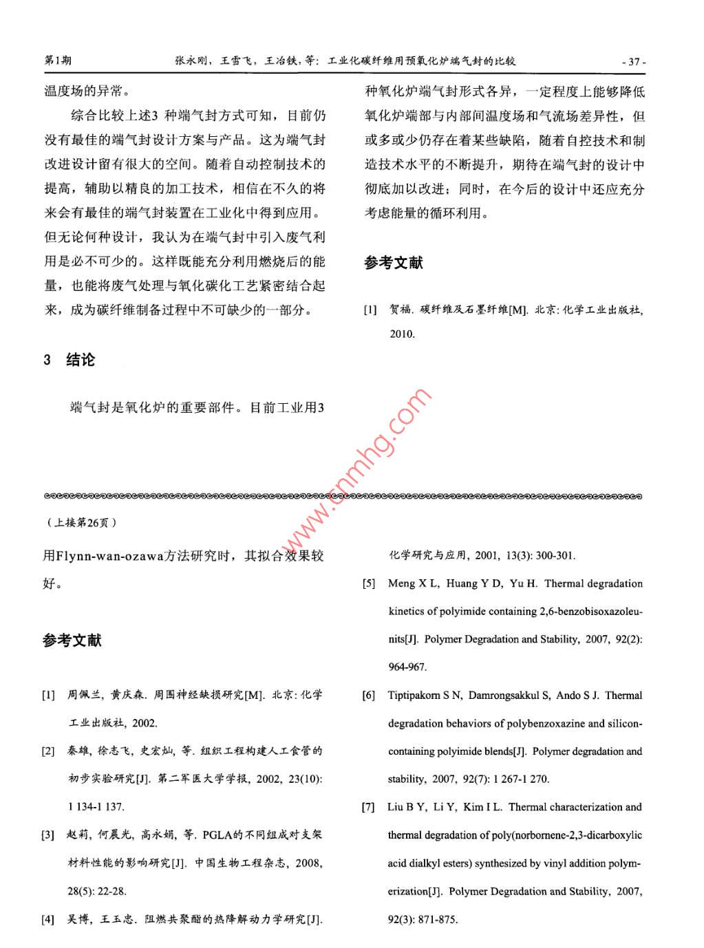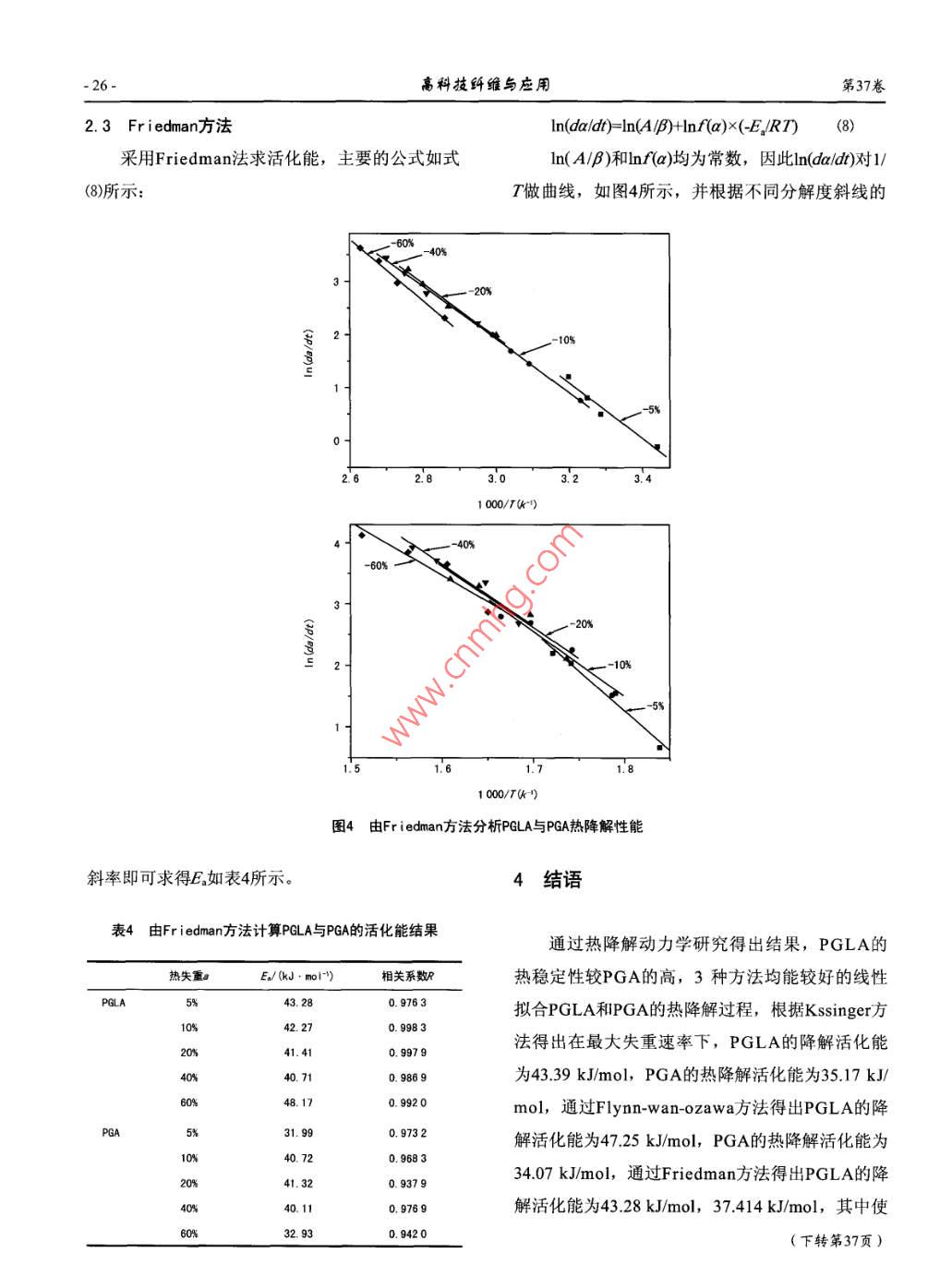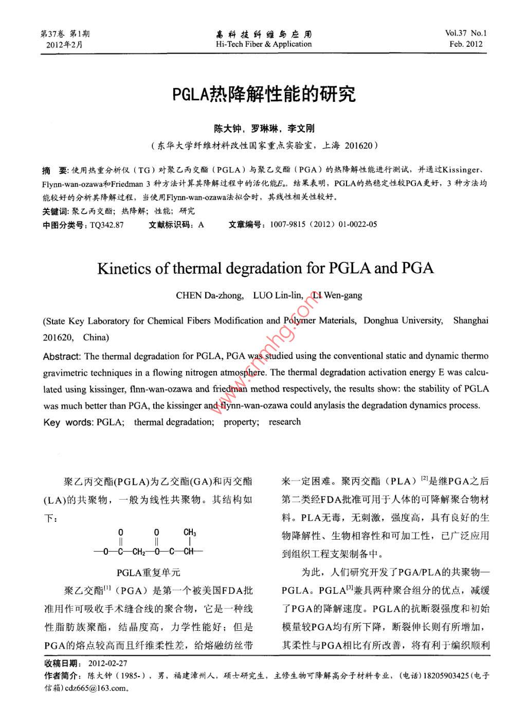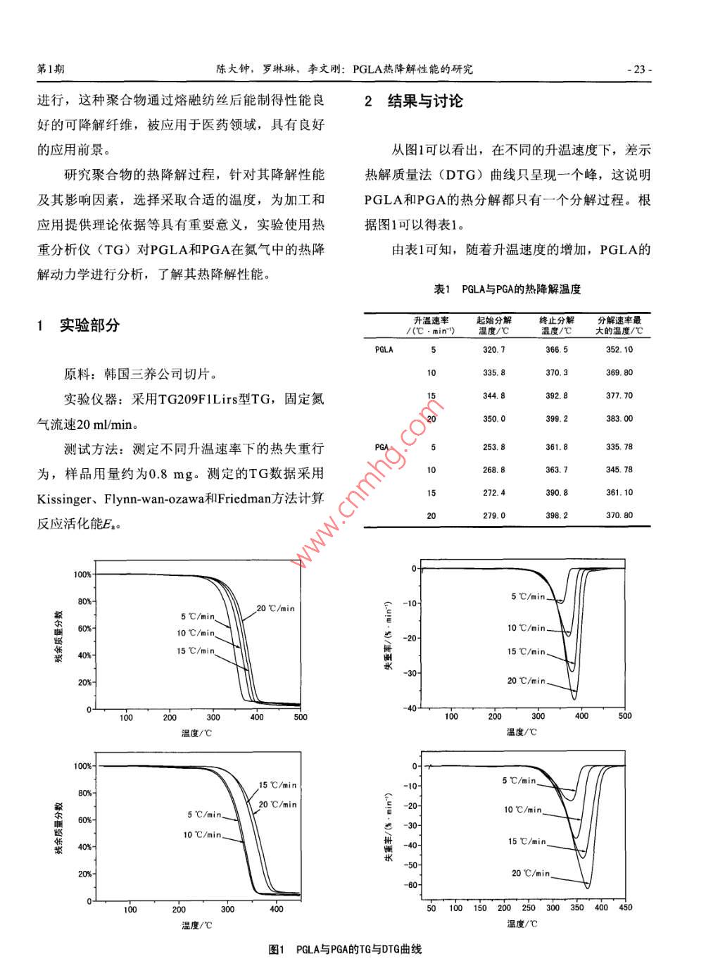 第37卷第1期高料技纖維與應(yīng)用Vol 37 No. 12012年2月Hi-Tech Fiber ApplicationFeb.2012PGLA熱降解性能的研究陳大鐘,羅琳琳,李文剛東華大學(xué)纖維材料改性國家重點(diǎn)實(shí)驗(yàn)室,上海201620)摘要:使用熱重分析儀(TG)對聚乙丙交酯(PGLA)與聚乙交酯(PGA)的熱降解性能進(jìn)行測試,并通過 Kissinger、Flynn-wan-ozawa和 Friedman3種方法計(jì)算其降解過程中的活化能E。結(jié)果表明,PGLA的熱穩(wěn)定性較PGA更好,3種方法均能較好的分析其降解過程,當(dāng)使用Fymn- wan-ozawa法擬合時(shí),其線性相關(guān)性較好.關(guān)鍵詞:聚乙丙交酯;熱降解;性能;研究中圖分類號(hào):TQ34287文獻(xiàn)標(biāo)識(shí)碼:A文章編號(hào):1007-9815(2012)01-0022-05Kinetics of thermal degradation for PGla and pgaCHEN Da-zhong, LUO Lin-lin, LI Wen-gang(State Key Laboratory for Chemical Fibers Modification and Polymer Materials, Donghua University, Shanghai201620, China)Abstract: The thermal degradation for PGLA, PGA was studied using the conventional static and dynamic thermogravimetric techniques in a flowing nitrogen atmosphere. The thermal degradation activation energy E was calcu-lated using kissinger, finn-wan-ozawa and friedman method respectively, the results show: the stability of PGLAwas much better than PGA, the kissinger and flynn-wan-ozawa could anylasis the degradation dynamics processKey words: PGLA; thermal degradation; property; research聚乙內(nèi)交酯(PGLA)為乙交酯(GA)和丙交酯來一定困難。聚丙交酯(PLA)是繼PGA之后(LA)的共聚物,一般為線性共聚物。其結(jié)構(gòu)如第二類經(jīng)FDA批準(zhǔn)可用于人體的可降解聚合物材料。PLA無毒,無刺激,強(qiáng)度高,具有良好的生物降解性、生物相容性和可加工性,已廣泛應(yīng)用0-C-CH20C-CH-到組織工程支架制備中PGLA重復(fù)單元為此,人們研究開發(fā)了 PGA/PLA的共聚物一聚乙交酯(PGA)是第一個(gè)被美國FDA批PGLA。PGLA兼具兩種聚合組分的優(yōu)點(diǎn),減緩準(zhǔn)用作可吸收手術(shù)縫合線的聚合物,它是一種線了PGA的降解速度。PGLA的抗斷裂強(qiáng)度和初始性脂肪族聚酯,結(jié)晶度髙,力學(xué)性能好;但是模量較PGA均有所下降,斷裂伸長則有所增加PGA的熔點(diǎn)較高而且纖維柔性差,給熔融紡絲帶其柔性與PGA相比有所改善,將有利于編織順利收稿日期:2012-02-27作者簡介:陳大鐘(1985-),男,福建漳州人,碩七研究生,主修生物可降解高分于材料專業(yè),(電話)18205903425(電子信箱)cdz665@163.com。第1期陳大鐘,羅琳琳,李文剛:PGLA熱降解性能的研究23進(jìn)行,這種聚合物通過熔融紡絲后能制得性能良2結(jié)果與討論好的可降解纖維,被應(yīng)用于醫(yī)藥領(lǐng)域,具有良好的應(yīng)用前景。從圖1可以看出,在不同的升溫速度下,差示硏究聚合物的熱降解過程,針對其降解性能熱解質(zhì)量法(DTG)曲線只呈現(xiàn)一個(gè)峰,這說明及其影響因素,選擇采取合適的溫度,為加工和PGLA和PGA的熱分解都只有一個(gè)分解過程。根應(yīng)用提供理論依據(jù)等具有重要意義,實(shí)驗(yàn)使用熱據(jù)圖1可以得表1重分析儀(TG)對PGLA和PGA在氮?dú)庵械臒峤涤杀?可知,隨著升溫速度的增加,PGLA的解動(dòng)力學(xué)進(jìn)行分析,了解其熱降解性能。表1PGLA與PGA的熱降解溫度實(shí)驗(yàn)部分升溫速率起始分解終止分解分解速率最/(℃.min")溫度/℃溫度/℃大的溫度/℃320.7366.5原料:韓國三養(yǎng)公司切片370.3實(shí)驗(yàn)儀器:采用TG209 FlAirs型TG,固定氮344.8377.70氣流速20ml/mins測試方法:測定不同升溫速率下的熱失重行253.8361.8為,樣品用量約為0.8mg。測定的TG數(shù)據(jù)采用268,8363.7345.78Kissinger、 Flynn-wan-ozawa和 Friedman方法計(jì)算27290.8反應(yīng)活化能E。279.098.2370.805℃/min20℃/min10℃/mit10℃/min-2015℃/m15℃/min100200300400500溫度/℃溫度/℃100%20℃/min5℃/min10℃/min20℃/min50100150200250300350溫度/℃溫度/℃圖1PGLA與PGA的TG與DTG曲線高料披纖維島應(yīng)用第37卷起始分解溫度逐漸升高,當(dāng)升溫速率為5℃/min參數(shù)En。常用的方法包括 Kissinger、 Flynn-Wan-時(shí),起始分解溫度為320.7℃,當(dāng)升溫速率為20Ozawa、 Friedman等℃min時(shí),其起始分解溫度變?yōu)?50℃。這是由于2.1 Kissinger方法熱滯后所致,升溫速率越大,產(chǎn)生的溫度滯后越最大失重速率時(shí)的熱降解活化能E。是通過明顯,還可以看到,各曲線的形狀相同,說明升 Kissinger法計(jì)算得到的,其方程式如下溫速率的不同沒有改變材料的熱降解機(jī)制。PGA1m(B72m){ARE)+nm(1-am)"]}×(ERTm)(6)的起始熱降解溫度比PGLA低,PGLA中LA的質(zhì)量式中:B為升溫速率;A為剪切指前因子;R分?jǐn)?shù)能夠增加材料的熱降解性能。為氣體常數(shù);E為降解活化能;般假設(shè):在絕熱條件下,熱失重率a的變化n為 avrami方程指數(shù);am為Tma對應(yīng)的失重率dad與速率常數(shù)k以及熱失重率函數(shù)f(a)成線性率;Tmx為不同升溫速率時(shí)最大失重速率所對應(yīng)關(guān)系,即:的溫度將ln(B72m3x)對1/Tma做圖,如圖2所示,由dadt=kf(a)直線的斜率即可求出Ea,列于表2。其中k是一個(gè)溫度常數(shù),f(a)是關(guān)于a的函由表2可知 Kissinger方程能較好的擬合PGLA數(shù),與溫度無關(guān),但與熱降解機(jī)理有關(guān),可用方程表示:表2 Kiss inger分析PGLA和PA熱降解活化能f(a)=(1-a)7C/(kJ.m)相關(guān)系數(shù)根據(jù) Arrhenius公式:PGLA352.1k=Aexp-EdRn369.643.39其中A是與溫度無關(guān)的常數(shù),E為降解活化能,T為絕對溫度,R為氣體常
