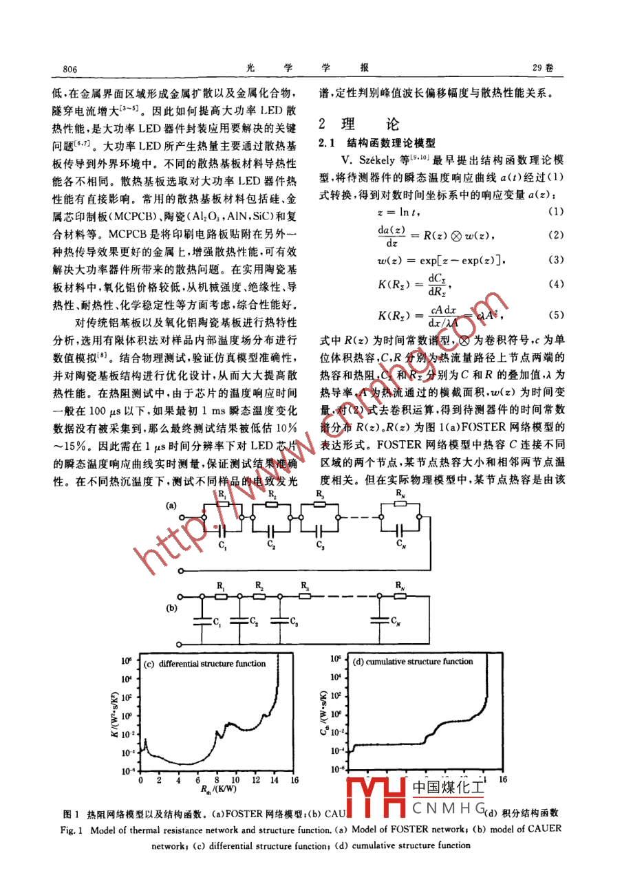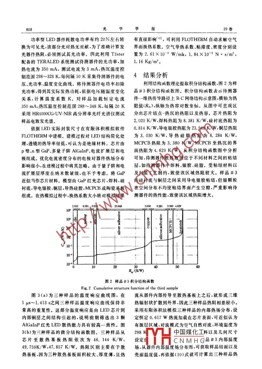 第29卷第3期光學(xué)學(xué)報VoL 29. No. 32009年3月ACTA OPTICA SINICA文章編號:0253-2239(2009)03-080506大功率 AlGaInp紅光LED散熱基板熱分析陳煥庭1·2呂毅軍12陳忠12張海兵2高玉琳12(廈門大學(xué)物理系,福建廈門361005;2福建省半導(dǎo)體照明工程技術(shù)研究中心,福建廈門361005)摘要采用有限體積數(shù)值模擬、瞬態(tài)熱阻測試方法以及熱沉溫度一峰值波長變化的關(guān)系,對三種散熱基板上大功率 AlGaInP紅光發(fā)光二極管(LED)進(jìn)行熱特性分析。三種LED采用相同型號、規(guī)格,散熱基板,區(qū)別在于散熱通道以及材料。測量樣品的瞬態(tài)溫度響應(yīng)曲線,基于結(jié)構(gòu)函數(shù)理論模型對溫度響應(yīng)曲線進(jìn)行數(shù)學(xué)處理得出包含熱阻與熱容的結(jié)構(gòu)函數(shù)區(qū)分出樣品內(nèi)部熱流通道上各個區(qū)域的熱阻與熱容,進(jìn)而發(fā)現(xiàn)散熱瓶頒區(qū)域。測試樣品在不同熱沉溫度下的電致發(fā)光光譜,通過熱沉溫度一峰值波長系數(shù)為區(qū)別樣品散熱性能提供定性判斷依據(jù)。通過模擬與測試結(jié)果比較,為優(yōu)化陶瓷基板內(nèi)部散熱結(jié)構(gòu),設(shè)計最佳的散熱模型提供重要參考依據(jù)關(guān)鍵詞光學(xué)器件;發(fā)光二極管;陶瓷基板;瞬態(tài)熱阻測試法;結(jié)構(gòu)函數(shù);有限體積法中圖分類號TN3文獻(xiàn)標(biāo)識碼Adoi:10.3788/A0s20092903.0805Analysis of Thermal Spreading Boards for High-PowerAlGaInP Red LEDsChen Huanting.2 Li Yijun.2 Chen Zhong.2 Zhang Haibing.2 Gao Yulin,2(2 Fujian Engineering Research Center for Solid-State Lighting, Xiamen University, Xiamen, Fujian, 361005, ChinaAbstract The thermal characteristics of three kinds of thermal spreading boards with high-power AlGaInP LEDswere analyzed by finite volume thermal simulation method, transient thermal resistence measurement and therelationship of heat sink temperature and peak wavelength. with the same type and configuration of AlGaInP LEDsthe three kinds of thermal spreading boards, the difference lies in thermal spreading channels and materialsTransient temperature response curve is measured from which structure functions are extracted to evaluate thethermal resistance and the thermal capacitance in the heat flow path. Based on the structure function, thermalproblem during the heat flow path can be easily located. The electroluminescence spectra of AlGaInP LEDs withdifferent thermal spreading boards under various electrical currents were investigated. In terms of the relationship ofheat sink temperature-peak wavelength, the thermal characteristics of samples can be qualitatively estimated. Bycomparison, thermal simulation and testing offer important evidence for the optimization and design of the mostsuitable thermal spreading model for ceramic boardsKey words optical device: light emitting diode(LED); ceramic board; transient thermal resistence meaststructure function; finite volume method1引言用于照明領(lǐng)域以及其它領(lǐng)域中[:。大功率LED耗與普通光源相比,發(fā)光二極管(LED)具有省電、散功率高,芯片溫升幅度大。芯片溫度升高將使其壽命長、光效高、無輻射、無污染等特點(diǎn)已被廣泛應(yīng)輸出光通量減小,峰值波長漂移熒光粉轉(zhuǎn)換效率降收稿日期:20080811;收到修改稿日期:20080901基金項(xiàng)目:國家863計劃重大專項(xiàng)(2000738建省V凵中國煤化工福建省自然科基金(20080030)資助課題者筒介:陳煥庭(1982一),男博士研究生,主要從事半導(dǎo)體照CNMHG23@yahoo.cn導(dǎo)師簡介:呂毅軍(1973-)男,副教授碩士生導(dǎo)師主要從事Ⅲ-V材料的光學(xué)性質(zhì)研究,半導(dǎo)體照明測試研究E-mail;yilu@xmu.edu.cn光29卷低,在金屬界面區(qū)域形成金屬擴(kuò)散以及金屬化合物,譜,定性判別峰值波長偏移幅度與散熱性能關(guān)系。隧穿電流增大3-5。因此如何提高大功率LED散熱性能是大功率LED器件封裝應(yīng)用要解決的關(guān)鍵2理論問題。大功率LED所產(chǎn)生熱量主要通過散熱基2.1結(jié)構(gòu)函數(shù)理論模型板傳導(dǎo)到外界環(huán)境中。不同的散熱基板材料導(dǎo)熱性V. Szekely等0·最早提出結(jié)構(gòu)函數(shù)理論模能各不相同。散熱基板選取對大功率LED器件熱型,將待測器件的瞬態(tài)溫度響應(yīng)曲線a()經(jīng)過(1)性能有直接影響。常用的散熱基板材料包括硅金式轉(zhuǎn)換,得到對數(shù)時間坐標(biāo)系中的響應(yīng)變量a(x)屬芯印制板( MCPCB)、陶瓷(Al2O3,AN,SiC)和復(fù)(1)合材料等。 MCPCB是將印刷電路板貼附在另外一da(x)=R(z)⑧w(x),(2)種熱傳導(dǎo)效果更好的金屬上,增強(qiáng)散熱性能,可有效解決大功率器件所帶來的散熱問題。在實(shí)用陶瓷基pLz-exp(z)](3)板材料中,氧化鋁價格較低,從機(jī)械強(qiáng)度、絕緣性、導(dǎo)K(R:)(4)熱性、耐熱性、化學(xué)穩(wěn)定性等方面考慮,綜合性能好cA dx對傳統(tǒng)鋁基板以及氧化鋁陶瓷基板進(jìn)行熱特性/IA CA2(5)分析,選用有限體積法對樣品內(nèi)部溫度場分布進(jìn)行式中R(z)為時間常數(shù)譜型,⑧為卷積符號,c為單數(shù)值模擬。結(jié)合物理測試,驗(yàn)證仿真模型準(zhǔn)確性,位體積熱容,C,R分別為熱流量路徑上節(jié)點(diǎn)兩端的并對陶瓷基板結(jié)構(gòu)進(jìn)行優(yōu)化設(shè)計,從而大大提高散熱容和熱阻,Cx和Rx分別為C和R的疊加值,λ為熱性能。在熱阻測試中,由于芯片的溫度響應(yīng)時間熱導(dǎo)率,A為熱流通過的橫截面積,u(z)為時間變般在100gs以下,如果最初1ms瞬態