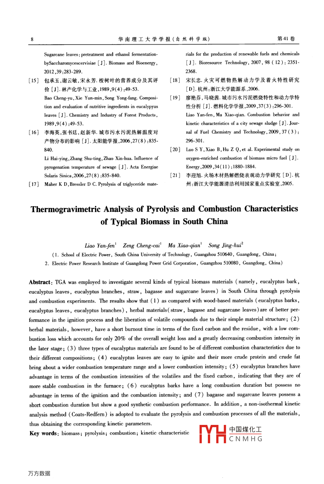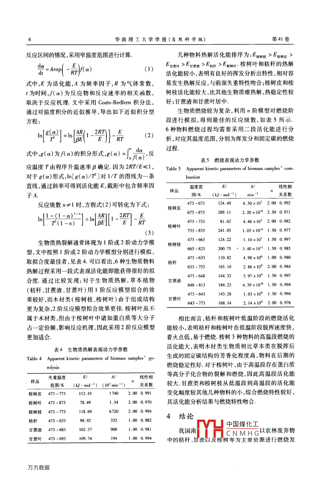 華南理工大學(xué)學(xué)報(bào)(自然科學(xué)版第41卷第8期Journal of South China University of TechnologyVol 41 No 82013年8月Natural Science Edition)2013文章編號(hào):1000565X(2013)08-0001-08中國(guó)南方典型生物質(zhì)熱解及燃燒特性熱重分析廖艷芬!曾成才1馬曉茜宋景慧2(1.華南理工大學(xué)電力學(xué)院,廣東廣州510640;2.廣東電網(wǎng)公司電力科學(xué)研究院,廣東廣州510080)摘要:采用熱重分析儀對(duì)中國(guó)南方典型生物質(zhì)(桉樹(shù)皮、桉樹(shù)葉、桉樹(shù)枝、秸稈、甘蔗渣、甘蔗葉)進(jìn)行熱解及燃燒實(shí)驗(yàn)研究結(jié)果表明:相比于木質(zhì)類(lèi)材料(桉樹(shù)皮、桉樹(shù)葉、桉樹(shù)枝),草本類(lèi)材料(秸稈、甘蔗)由于材料組成結(jié)構(gòu)簡(jiǎn)單,脫揮和著火過(guò)程性能較好;但固定碳和殘留物的燃盡時(shí)間短,而且燃燒失重率只占整體失重的20%左右,燃燒強(qiáng)度在后期大大降低.桉樹(shù)的3個(gè)物料中,組成成分的不同導(dǎo)致燃燒特性有較大的差異.桉樹(shù)葉易著火,而且由于含有較多的粗蛋白和粗脂肪,其燃燒區(qū)間拉長(zhǎng),但燃燒強(qiáng)度較低;桉樹(shù)枝則在揮發(fā)分以及固定碳的燃燒強(qiáng)度上具有優(yōu)勢(shì),說(shuō)明其在爐內(nèi)燃燒時(shí)具有更妤的穩(wěn)燃性;桉樹(shù)皮盡管燃燒持續(xù)時(shí)間長(zhǎng),但在著火特性以及燃燒強(qiáng)度方面并無(wú)優(yōu)勢(shì).甘蔗類(lèi)燃燒持續(xù)時(shí)間短,綜合燃燒特性好.文中還采用 Coats- Redfern積分法進(jìn)行動(dòng)力學(xué)擬合推斷,獲得了各物料的熱解和燃燒動(dòng)力學(xué)參數(shù).關(guān)鍵詞:生物質(zhì);熱解;燃燒;動(dòng)力學(xué)特性中圖分類(lèi)號(hào):TK6doi:10.3969/jiss.1000565X.2013.08.001隨著能源短缺和二氧化碳排放問(wèn)題的加劇,生2.6×10°hm2,居世界第三2;糖料甘蔗大面積種植物質(zhì)作為可再生和潔凈能源得到越來(lái)越廣泛的應(yīng)于廣西、廣東、海南、云南,占我國(guó)蔗糖產(chǎn)量的95%用,其中以高效直接燃燒發(fā)電為代表的生物質(zhì)發(fā)電以上.合理利用這些生物質(zhì)資源將有效緩解能源技術(shù)已經(jīng)在丹麥、瑞典、芬蘭、荷蘭以及巴西和印度危機(jī)和減少環(huán)境污染等國(guó)家得到廣泛應(yīng)用.我國(guó)生物質(zhì)資源豐富,根據(jù)可考慮到生物質(zhì)資源的季節(jié)性以及南方地區(qū)收集再生能源中長(zhǎng)期發(fā)展規(guī)劃,到2020年我國(guó)生物質(zhì)發(fā)半徑的經(jīng)濟(jì)性,南方地區(qū)生物質(zhì)燃燒及發(fā)電項(xiàng)目采電裝機(jī)容量將達(dá)到3000萬(wàn)千瓦我國(guó)南方地區(qū)生物用多來(lái)源生物質(zhì)燃料,涉及農(nóng)業(yè)以及林業(yè)廢棄物由質(zhì)資源主要以稻桿、甘蔗殘留物以及林業(yè)殘留物為于不同種類(lèi)生物質(zhì)的燃燒特性差異較大,進(jìn)行燃料主據(jù)推算,南方地區(qū)現(xiàn)有主要農(nóng)作物秸稈數(shù)量占全更換以及混燒時(shí),容易出現(xiàn)燃燒不充分、燃燒工況較國(guó)比例為84.48%口;華南熱帶地區(qū)是林木質(zhì)能源難控制等問(wèn)題國(guó)內(nèi)外已有不少學(xué)者對(duì)生物質(zhì)的燃集中分布區(qū)和可利用的優(yōu)先區(qū)域,其中桉樹(shù)生長(zhǎng)迅燒機(jī)理做了較為詳細(xì)的研究,張斌等探討了木粉速、總生物量大、輪伐期短和高密度等特性,決定了酸水解殘?jiān)湍咎窃捌淠噶系臒峤馓匦? Silva其作為生物能源具有顯著的優(yōu)勢(shì),目前桉樹(shù)人工林等對(duì)藻類(lèi)進(jìn)行了熱解、燃燒以及氣化特性的研已經(jīng)遍及南方17省、600多個(gè)縣市,種植面積約為究;Su等6研究了氮?dú)夂脱鯕鈿夥障履静牡臒岱纸馐崭迦掌?2013-01-16*基金項(xiàng)目:國(guó)家“973”計(jì)劃項(xiàng)目(2011CB201500,2013CB228101);國(guó)家自然科學(xué)基金資助項(xiàng)目(50906025);華南理工大學(xué)能源高效清潔利用廣東普通高校重點(diǎn)實(shí)驗(yàn)室項(xiàng)目(KLBl004);華南理工大學(xué)中本科研業(yè)務(wù)費(fèi)專(zhuān)項(xiàng)資金資助項(xiàng)目(2012Z70022中國(guó)煤化工作者簡(jiǎn)介:廖艷芬(1976-),女,教授,博士生導(dǎo)師,主要從事固體廢棄物高效低CNMHGscut. edu. cn華南理工大學(xué)學(xué)報(bào)(自然科學(xué)版)第41卷過(guò)程;Wang等對(duì)生物質(zhì)三大組分的熱解過(guò)程及其高,對(duì)于燃燒裝置的除塵以及相關(guān)設(shè)備將有更高的相互影響進(jìn)行了分析等要求.一般生物質(zhì)原料由于硫和氮含量低,具有較好由于生物質(zhì)燃料具有地域特性,文中選用中國(guó)的清潔能源優(yōu)越性但檢測(cè)發(fā)現(xiàn)桉樹(shù)葉和甘蔗葉硫南方地區(qū)—廣東省的典型生物質(zhì)(秸稈、桉樹(shù)皮、含量較高而且桉樹(shù)葉氮含量也高達(dá)2.2%,故對(duì)燃桉樹(shù)葉、桉樹(shù)枝、甘蔗葉以及甘蔗渣)作為原料,進(jìn)燒后期污染物SO,、NO2的處理有較高的要求行熱解和燃燒熱重實(shí)驗(yàn)研究,分析各生物質(zhì)燃料的2.1熱裂解特性脫揮特性、固定碳燃燒特性,以及燃燒氣氛和升溫速率等條件對(duì)燃料著火特性的影響規(guī)律,并采用圖1為幾種物料熱解的TG和DTG曲線(xiàn)從圖Coats- Redfern積分法進(jìn)行動(dòng)力學(xué)擬合推斷,獲得其中可以看到,各物料熱解區(qū)間均在473~673K之動(dòng)
