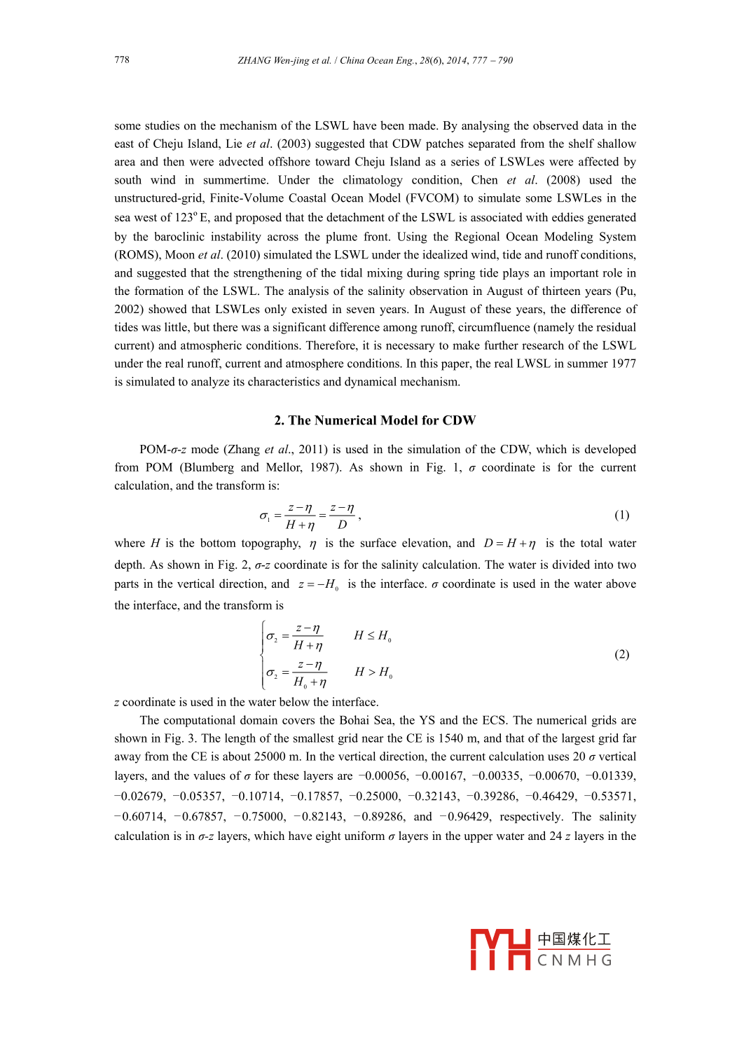 China Ocean Eng, Vol. 28, No.6, pp. 777- 790◎2014 Chinese Ocean Engineering SocietyDOI 10.1007/s 13344-014-0060-1,ISSN 0890-5487Numerical Simulation and Dynamical Analysis for Low Salinity Water Lensin the Expansion Area of the Changjiang Diluted W aterZHANG Wen-jing (張文靜), ZHU Shou xian (朱首賢)"1, LI Xun-qiang (李訓(xùn)強(qiáng)),RUAN Kun(阮鯤), GUAN Wei-bing (管衛(wèi)兵)f and PENG Jian(彭劍)"College of Meteorology and Oceanography, PLA University of Science and Technology,Nanjing 211101, Chinab College of Harbor, Coastal and Ofshore Engineering, Hohai University, Nanjing 210098, China。State Key Laboratory of Satelite Ocean Environment Dynamics, Second Instiute of "Oceanography,Hangzhou 310012, China(eceived 23 October 2012; received revised form 30 July 2013; acepted 16 Dcember 2013)ABSTRACTThe low salinity water lenses (LSWLes) in the expansion area of the Changjiang diluted water (CDW) exist in acertain period of time in some years. The impact of realistic river runoff, ocean currents and weather conditions need to betaken into account in the dynamical analysis of LSWL, which is in need of research. In this paper, the POM-0-z model isused to set up the numerical model for the expansion of the CDW. Then LSWL in summer 1977 is simulated, and itsdynamic mechanism driven by wind, tide, river runoff and the Taiwan Warm Current is also analyzed. The simulatedresults indicate that the isolated LSWL detaches itself from the CDW near the river mouth, and then moves towards thenortheast region outside the Changjiang Estuary. Its maintaining period is from July 26 to August 11. Its formation anddevelopment is mainly driven by two factors. One is the strong southeasterly wind lasting for ten days. The other is thevertical tidal mixing during the transition from neap tide to spring tide.Key words: Changjiang diluted water; low salinity water lens; numerical simulation; dynamic mechanism1. IntroductionThe Changjiang River is the largest river in China, and its annual average discharge is about9322.7* 108 m3 (Shen et al, 2001). Its huge freshwater spreads to the Changjiang Estuary (CE), theEast China Sea (ECS) and the Yellow Sea (YS), and forms a strong plume front. The Changjiangdiluted water (CDW) and its plume front make an enormous impact on the current, water mass,sediment movement and environment of the CE, ECS and YS. So they are always the emphases ofocean engineering and physical oceanography research.Observations also indicate that the CDW is not always continuous, and sometimes there are someisolated low salinity water lenses (LSWLes),which change the plume front of the CDW. Recently,This project was supported by the National Natural Science Foundation of China (Grant Nos. 40906044, 41076048 and 41376012),the Fundamental Research Funds for the Central Universities (Grant No. 2011B05714) and the Doctoral Starting up Foundation ofCollege of Meteorology and Oceanography of the PLA University of Science and Technology, China.Corresponding author. E mail: zhushouxian@vip.sina.com中國煤化工MYHCNMH G778ZHANG Wen-jing et al.1 China Ocean Eng, 28(6), 2014, 777 - 790some studies on the mechanism of the LSWL have been made. By analysing the observed data in theeast of Cheju Island, Lie et al. (2003) suggested that CDW patches separated from the shelf shallowarea and then were advected offshore toward Cheju Island as a series of LSWLes were affected bysouth wind in summertime. Under the climatology condition, Chen et al. (2008) used theunstructured-grid, Finite-Volume Coastal Ocean Model (FVCOM) to simulate some LSWLes in thesea west of 123° E, and proposed that the detachment of the LSWL is associated with eddies generatedby the baroclinic instability across the plume front. Using the Regional Ocean Modeling System(ROMS), Moon et al. (2010) simulated the LSWL under the idealized wind, tide and runoff conditions,and suggested that the strengthening of the tidal mixing during spring tide plays an important role inthe formation of the LSWL. The analysis of the salinity observation in August of thirteen years (Pu,2002) showed that LSWLes only existed in seven years. In August of these years, the difference oftides was ltte, but there was a significant difference among runoff, circumfluence (namely the residualcurrent) and atmospheric conditions. Therefore, it is necessary to make further research of the LSWLunder the real runoff, current and atmosphere conditions. In this paper, the real LWSL in summer 1977is simulated to analyze its characteristics and dynamical mechanism.2. The Numerical Model for CDWPOM-σ-Z mode (Zhang et al., 2011) is used in the simulation of the CDW, which is developedfrom POM (Blumberg and Mellor, 1987). As shown in Fig. 1, σ coordinate is for the currentcalculation, and the transform is:z-7 _ z-η_(1)H+η Dwhere H is the bottom topography, η is the surface elevation, and D=H +η is the total waterdepth. As shown in Fig. 2, σ-Z coordinate is for the salinity calculation. The water is divided into twoparts in the vertical direction, and z=-H。 is the interface. σ coordinate is used in the water abovethe interface, and the transform isH +ηH≤H。(2)H。+nH> H。Z coordinate is used in the water below the interface.The computational domain covers the Bohai Sea, the YS and the ECS. The numerical grids areshown in Fig. 3. The length of the smallest grid near the CE is 1540 m, and that of the largest grid faraway from the CE is about 25000 m. In the vertical direction, the current calculation uses 20 σ verticallayers, and the values of σ for these layers are -0.00056, -0.00167, -0.00335, -0.00670, -0.01339,-0.02679, -0.05357, -0.10714, -0.17857, -0.25000, -0.32143, -0.39286, -0.46429, -0.53571,- 0.60714,- 0.67857, - 0.75000, - 0.82143,- -0.89286, and - 0.96429, respectively. The salinitycalculation is in σ-z layers, which have eight uniform σ layers in the upper water and 24 z layers in the中國煤化工MYHCNMH GZHANG Wen-jing et al.1 Ch