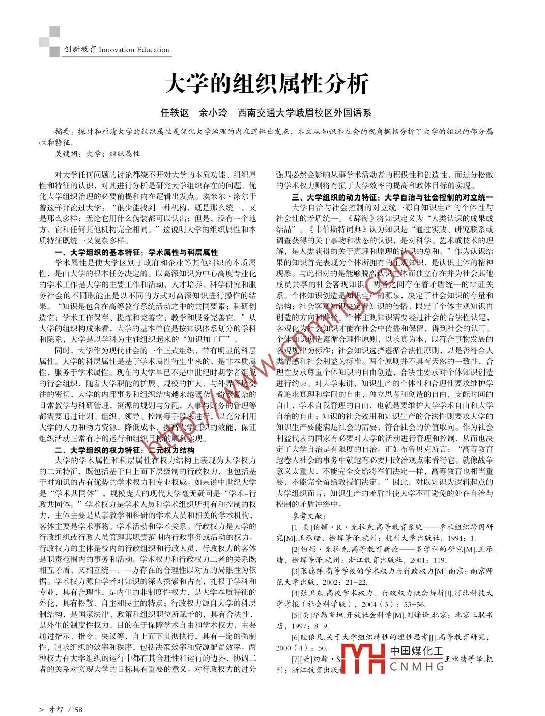 創(chuàng)新教育Innovation Education大學(xué)的組織屬性分析任軼謳小玲西南交通大學(xué)峨眉校區(qū)外國語系摘要:探討和厘清大學(xué)的組織屬性是優(yōu)化大學(xué)治理的內(nèi)在邏輯出發(fā)點,本文從知識和社會的視角概括分析了大學(xué)的組織的部分屬性和特征。關(guān)鍵詞:大學(xué);組織屬性對大學(xué)任何問題的討論都繞不開對大學(xué)的本質(zhì)功能、組織屬強調(diào)必然會影響從事學(xué)術(shù)活動者的積極性和創(chuàng)造性,而過分松散性和特征的認(rèn)識,對其進行分析是研究大學(xué)組織存在的問題、優(yōu)的學(xué)術(shù)權(quán)力則將有損于大學(xué)效率的提高和政體目標(biāo)的實現(xiàn)?;髮W(xué)組織治理的必要前提和內(nèi)在邏輯出發(fā)點。埃米爾.涂爾干三、大學(xué)組織的動力特征:大學(xué)自治與社會控制的對立統(tǒng)一曾這樣評論過大學(xué):“很少能找到一 一種機構(gòu),既是那么統(tǒng)-,又大學(xué)自治與社會控制的對立統(tǒng)--源自知識生產(chǎn)的個體性與是那么多樣;無論它用什么偽裝都可以認(rèn)出;但是,沒有一個地社會性的矛盾統(tǒng)- -?!?辭海》將知識定義為“人類認(rèn)識的成果或方,它和任何其他機構(gòu)完全相同?!边@說明大學(xué)的組織屬性和本吉晶”?!俄f伯斯特詞典》認(rèn)為知識是“通過實踐、 研究聯(lián)系或質(zhì)特征既統(tǒng)- - 又復(fù)雜多樣。調(diào)查獲得的關(guān)于事物和狀態(tài)的認(rèn)識,是對科學(xué)、藝術(shù)或技術(shù)的理一、大學(xué)組織的基本特征:學(xué)術(shù)屬性與科層屬性解,是人類獲得的關(guān)于真理和原理的認(rèn)識的總和?!弊鳛檎J(rèn)識結(jié)學(xué)術(shù)屬性:是使大學(xué)區(qū)別于政府和企業(yè)等其他組織的本質(zhì)屬果的知識首先表現(xiàn)為個體所擁有的主觀知識,是認(rèn)識主體的精神性,是由大學(xué)的根本任務(wù)決定的。以高深知識為中心高度專業(yè)化現(xiàn)象。與此相對的是能夠脫離認(rèn)識主體而獨立存在并為社會其他的學(xué)術(shù)工作是大學(xué)的主要工作和活動,人才培養(yǎng)、科學(xué)研究和服成員共享的社會客觀知識。兩者之間存在著矛盾統(tǒng)- -的辯證關(guān)務(wù)社會的不同職能正是以不同的方式對高深知識進行操作的結(jié)系。個體知識創(chuàng)造是知識生產(chǎn)的源泉,決定了社會知識的存量和果。“知識是包 含在高等教育系統(tǒng)活動之中的共同要素;科研創(chuàng)結(jié)構(gòu);社會客觀知識決定著知識的傳播、限定了個體主觀知識再造它;學(xué)術(shù)工作保存、提煉和完善它;教學(xué)和服務(wù)完善它。”從創(chuàng)造的方向和路徑。個體主觀知識需要經(jīng)過社會的合法性認(rèn)定,大學(xué)的組織構(gòu)成來看,大學(xué)的基本單位是按知識體系劃分的學(xué)科客觀化為社會知識才能在社會中傳播和保留,得到社會的認(rèn)可。和院系,大學(xué)是以學(xué)科為主軸組織起來的“知識加工廠”個體知識創(chuàng)造遵循合理性原則,以求真為本,以符合事物發(fā)展的同時,大學(xué)作為現(xiàn)代社會的一- 個正式組織,帶有明顯的科層客觀規(guī)律為標(biāo)準(zhǔn);社會知識選擇遵循合法性原則,以是否符合人屬性。大學(xué)的科層屬性是基于學(xué)術(shù)屬性衍生出來的,是非本質(zhì)屬類情感和社會利益為標(biāo)準(zhǔn)。兩個原則并不具有天然的一-致性,合性,服務(wù)于學(xué)術(shù)屬性?,F(xiàn)在的大學(xué)早已不是中世紀(jì)時期學(xué)者組成理性要求尊重個體知識的自由創(chuàng)造,合法性要求對個體知識創(chuàng)造的行會組織,隨著大學(xué)職能的擴展、規(guī)模的擴大、與外界環(huán)境交進行約束。對大學(xué)來講,知識生產(chǎn)的個體性和合理性要求維護學(xué)往的密切,大學(xué)的內(nèi)部事務(wù)和組織結(jié)構(gòu)越來越繁雜。紛繁復(fù)雜的者追求真理和學(xué)問的自由,獨立思考和創(chuàng)造的自由,支配時間的日常教學(xué)與科研管理,資源的規(guī)劃與分配,人事與財務(wù)的管理等自由,學(xué)術(shù)自我管理的自由,也就是要維護大學(xué)學(xué)術(shù)自由和大學(xué)都需要通過計劃、組織、領(lǐng)導(dǎo)、控制等手段來進行,以充分利用自治的自由;知識的社會效用和知識生產(chǎn)的合法性則要求大學(xué)的大學(xué)的人力和物力資源,降低成本,提高大學(xué)組織的效能,保證知識生產(chǎn)要能滿足社會的需要,符合社會的價值取向。作為社會組織活動正常有序的運行和組織目標(biāo)的順利實現(xiàn)。利益代表的國家有必要對大學(xué)的活動進行管理和控制,從而也決二、大學(xué)組織的權(quán)力特征:二元權(quán)力結(jié)構(gòu)定了大學(xué)自治是有限度的自治。正如布魯貝克所言:“高等教育大學(xué)的學(xué)術(shù)屬性和科層屬性在權(quán)力結(jié)構(gòu)上表現(xiàn)為大學(xué)權(quán)力越卷人社會的事務(wù)中就越有必要用政治觀點來看待它。就像戰(zhàn)爭的二元特征,既包括基于自上而下層級制的行政權(quán)力,也包括基意義太重大,不能完全交給將軍們決定-樣,高等教育也相當(dāng)重于對知識的占有優(yōu)勢的學(xué)術(shù)權(quán)力和專業(yè)權(quán)威。如果說中世紀(jì)大學(xué)要,不能完全留