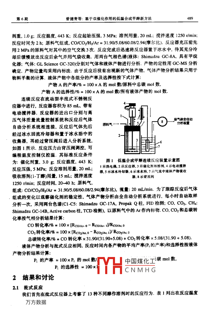 中園(B輯)第31卷第6期SCIENCE IN CHINA( Series B)001年12月基于雙催化作用的低溫合成甲醇新方法06 A曾健青N. Tsubaki K. Fujimoto(中國科學(xué)院廣州化學(xué)研究所,廣州510650University of Tokyo, Tokyo, I13-8656, Japan摘要在 Culina固體催化劑存在的條件下,某些醇特別是2醇對CO加氫合成甲醇的反應(yīng)具有顯著的催化促進(jìn)作用,在固體催化和溶劑催化的協(xié)同作用下,由COCO2H2合成甲醇反應(yīng)可以在443K的低溫和5MPa的壓力條件下高效進(jìn)行.初步研究表明,在443K以2 butanol為溶劑時,連續(xù)反應(yīng)40h的甲醇平均單程產(chǎn)率和選擇性分別達(dá)到46.51%和9894%,并且催化活性穗定.該反應(yīng)溫度比當(dāng)今一般工業(yè)合成的反應(yīng)溫度降低80℃左右,因此,這種新過程的最終開發(fā)成功必將對甲醇合成工業(yè)產(chǎn)生重要影響關(guān)輸調(diào)雙借化作用低合成甲新方法甲醇是一種用途廣泛的化工基本原料和無污染燃料,全世界的年需求量在3000萬噸左右目前,工業(yè)上合成甲醇一般是以含2%-10%CO2的COH2為合成氣,以CuZn基氧化物為催化劑,在反應(yīng)溫度為493~523K和壓力為5-10MPa的條件下進(jìn)行.然而,由于該合成反應(yīng)是強(qiáng)放熱反應(yīng)(△MH=-91kmo),反應(yīng)溫度高,甲醇的合成效率嚴(yán)重受到熱力學(xué)平衡的限制.例如,在573K和5MPa條件下,CO的最大理論轉(zhuǎn)化率只有20%左右.因此,開發(fā)低溫合成甲醇過程不僅可以利用熱力學(xué)的優(yōu)勢提高反應(yīng)的轉(zhuǎn)化率,而且可以大大降低生產(chǎn)和設(shè)備成本BNL方法是美國 Brook Heaven National Laboratory較早提出的一種低溫合成甲醇的方法.該方法采用強(qiáng)堿NaH或 nickel acetate, ert-amyl alcohol和 sodium hydrid的混合物)作催化劑,在373~403K和1~5MPa下實(shí)現(xiàn)甲醇的合成.然而,其致命的缺陷是,原料氣或反應(yīng)體系中微量的CO2或水即能使催化劑很快失活.因此,原料氣的凈化成本高昂,以致其工業(yè)化應(yīng)用難以得到實(shí)現(xiàn)另一種得到廣泛研究的低溫合成甲醇方法是先經(jīng)CO的羰基化反應(yīng)得到甲酸甲酯,然后甲酸甲酯再進(jìn)一步加氫得到甲醇6CO +CH3OH HCOOCHHCOOCH3+ 2H, 2= 2CH3OHCO 2H2= CH3OH由于在上述第1步反應(yīng)中需要使用KOCH3或 NaTCH3,它對CO2和H2O的穩(wěn)定性極差,因此具有與BN法同樣的嚴(yán)重缺陷以歌其看中國煤化工有關(guān)銅基催化劑如 Cuno)上由cONMH麥組生本概受2001-03-12收稿.20014083收修改稿E-mail:zeng326163.com符號說明:R一愿料氣中Co與A的色譜峰面積之比,RCo,1—反應(yīng)后氣體中Co與A的色諧峰面積比B)分?jǐn)?shù)據(jù)氣中0與A的色確面艦之比,匙!一反應(yīng)后氣體中C與A的色峰面院中國科學(xué)(B輯)第31卷HCOO加氫有2種方式:直接加氫和間接加氫.前者是通過HCOO經(jīng)多步直接加氫依次生成H2COO,H3COO和HCOH;后者是HCOO先與產(chǎn)物甲醇反應(yīng)生成 HCOOCH3,該步驟可能主要在催化劑載體上進(jìn)行,堿性氧化物對酯的形成有利口,然后 HCOOCH3再遷移到銅的表面發(fā)生酯的加氫反應(yīng)生成二分子甲醇HCOO(a)+CH3OH HCOOCH3+ OH(a)HCOOCH3+4H(a)= 2CHJOH顯然,理論上當(dāng)用其他的醇(ROH代替CH3OH時上述反應(yīng)仍將進(jìn)行HCOO (a)+ ROH= HCOOR+OH(a)HCOOR+ 4H(a)=CH3OH ROHROH既是反應(yīng)介質(zhì)又直接參與了反應(yīng),但在反應(yīng)過程中被循環(huán)使用,因此我們稱之為“催化溶劑”.然而,由于種種原因,多年來人們對于這種溶劑催化的作用和行為尚沒有給予足夠的重視Fa和 Fujimoto等人曾用乙醇作反應(yīng)介質(zhì),在銅基催化劑上初步探索了由CO2加氫合成甲醇的新過程結(jié)果表明乙醇的加入能使反應(yīng)溫度大大降低,在443K溫度下有效地實(shí)現(xiàn)了甲醇的合成.最近,我們進(jìn)一步將這種雙催化思想(固體催化和溶劑催化協(xié)同作用)用于從COCO2H2合成甲醇,實(shí)現(xiàn)了在443K的低溫下高活性和高選擇性的甲醇合成,并初步提出以下反應(yīng)序列來解釋這一新的合成過程CO H20= Coz+H2CO2+=H,+ Cu= HCOOCuHCooCu +ROH= HCOOR+CuOHHCOOR+ 2H2= ROH CH3OHCuOH +=H2= H2O+CuCo+2H2= CH3OHCu表示催化劑的活性中心,ROH用作催化溶劑,cO2和H2O既是反應(yīng)物又是產(chǎn)物,它們在反應(yīng)過程中循環(huán)轉(zhuǎn)化 Cullen固體催化劑對CO2和H2O穩(wěn)定1實(shí)驗(yàn)部分11催化劑制備催化劑制備采用傳統(tǒng)的共沉淀法:將01moL的cu(NO32·3H2O,Zn(NO)2·6H2O的混合水溶液(CMa=1)和10m0L的Na2CO3水溶液在快速攪拌下饅慢滴加至適量的水中,使沉淀溫度和沉淀時溶液的pH值分別保持在33-338K和83~85.生成的沉淀在室溫下陳化24b,再經(jīng)過濾和水洗,然后在383K下千燥24h.623K下焙燒1h.焙燒后得到的前體經(jīng)壓片、敲碎、過篩得到2040目的顆粒,再在47中國煤化工13h.還原后待溫度降至室溫時改用2%O2(+Ar)進(jìn)行鈍化處理CNMHG47mg反應(yīng)時直接使用鈍化后的催化劑,不另行還原處理1.2反應(yīng)及分析批式反應(yīng)實(shí)驗(yàn)在帶有電動攪拌的不銹鋼高壓反應(yīng)器中進(jìn)行.反應(yīng)器的容積為80mL,攪拌速度通過預(yù)先的仔細(xì)考察來確定,以確保消除多相界面間的傳質(zhì)阻力標(biāo)準(zhǔn)反應(yīng)條件為:催化第6期曾健青等:基于雙催化作用的低溫合成甲醇新方法489劑重,10g;反應(yīng)溫度,443K;反應(yīng)起始壓強(qiáng),3MPa:溶劑用量,20mL;攪拌速度1250rmin反應(yīng)時間為2h;原料氣組成,COCO2/HAr=3190/508/60.08294摩爾比).