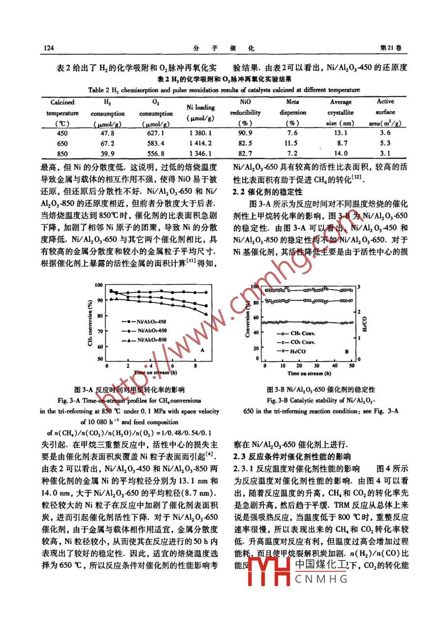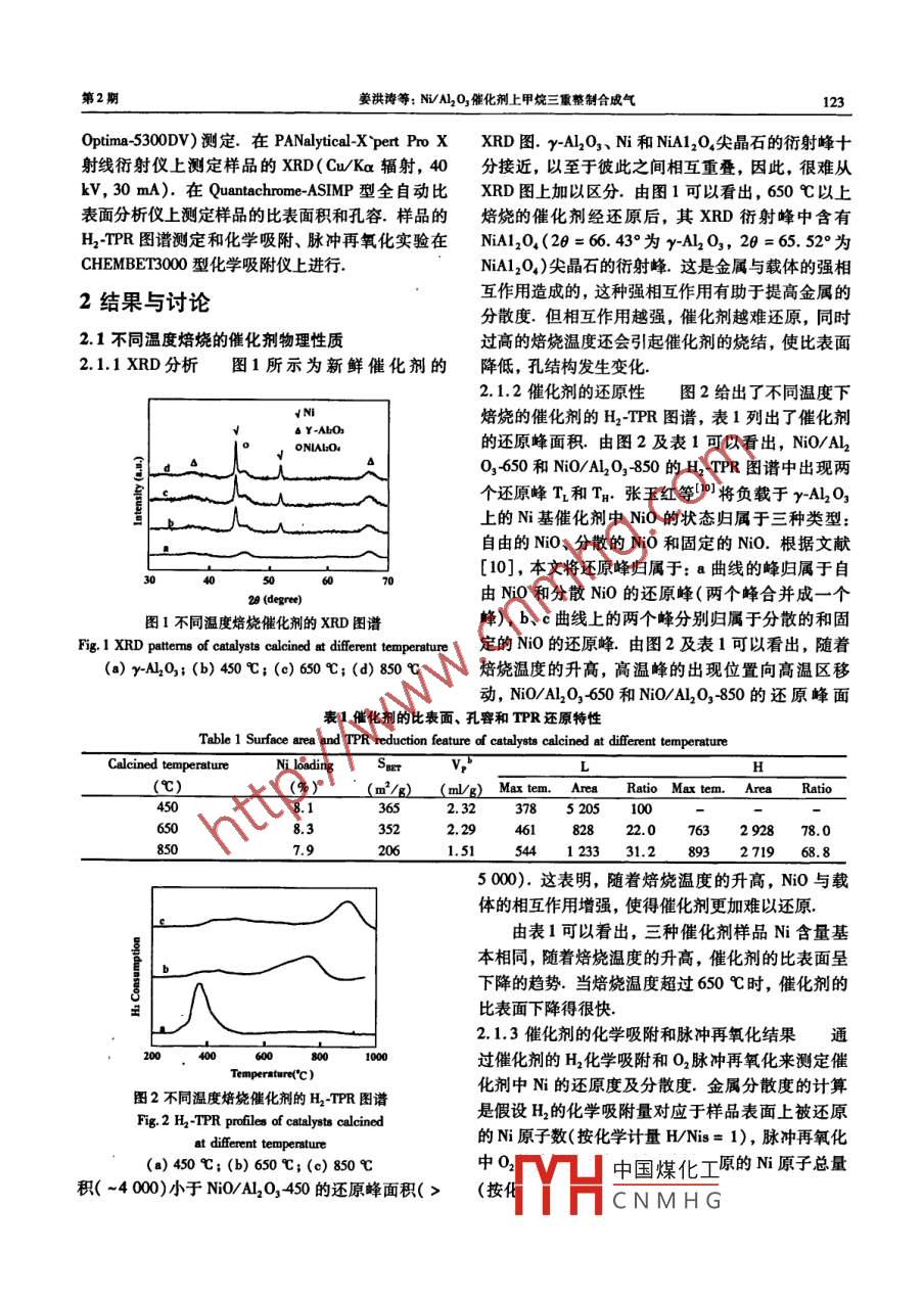 第21卷第2期VoL 21. No. 22007年4月JOURNAL OF MOLECULAR CATALYSIS( CHINA)Apr.2007文章端號(hào):100135552007)02012206Ni/Al2O3催化劑上甲烷三重整制合成氣姜洪濤2,李會(huì)泉1”,張懿(1.中國科學(xué)院過程工程研究所綠色過程與工程實(shí)驗(yàn)室,北京10002.中國科學(xué)院研究生院北京100049)摘要:制備了負(fù)載于大孔容、高比表面的yA2O3載體上的N基催化劑.采用固定床流動(dòng)反應(yīng)裝置,考察了催化劑焙燒溫度、反應(yīng)條件(反應(yīng)溫度、壓力、空速以及反應(yīng)原料氣組成)對(duì)甲烷三重整反應(yīng)(TRM)制合成氣的催化性能的影響.結(jié)果表明,650℃焙燒的催化劑具有較好的穩(wěn)定性在常壓、850℃、10080h、n(CH)/n(CO2)′n(H12O)/n(O2)=1/0.48/0.54/0.1的條件下,CH轉(zhuǎn)化率達(dá)到954%,CO2轉(zhuǎn)化率達(dá)到84.6%,在此條件下連續(xù)運(yùn)行9h未見活性下降.TRM反應(yīng)適宜于在高溫、低壓下進(jìn)行,原料組成的變化不會(huì)影響CH轉(zhuǎn)化率,但會(huì)影響cO2轉(zhuǎn)化率和產(chǎn)物合成氣的n(H2)/m(co)比關(guān)鍵詞:甲烷;三重整;合成氣;NA2O3催化劑中國分類號(hào):T64;0643.32文獻(xiàn)標(biāo)識(shí)碼:A甲烷三重整反應(yīng)是指二氧化碳重整甲烷響以及溫度、壓力、空速、原料組成等反應(yīng)條件對(duì)(CDR)、水蒸汽重整甲烷(SRM)和甲烷部分氧化催化劑性能的影響(POM)三個(gè)反應(yīng)在同一個(gè)反應(yīng)器內(nèi)耦合進(jìn)行的反應(yīng),即同步利用三個(gè)反應(yīng)來制合成氣的反應(yīng).熱1實(shí)驗(yàn)部分力學(xué)分析表明,通過甲烷三重整反應(yīng)可以生產(chǎn)n1.1催化劑制備(H2)m(Co)比為10~2.0之間的合成氣,適合于在前期工作中”,我們采用H12O2沉淀鋁酸下游化工利用.甲烷三重整反應(yīng)與單獨(dú)的CDR、鈉溶液法制備了大孔容、高比表面積yAL2O3本SRM和POM反應(yīng)相比12-4,具有很大程度的優(yōu)勢(shì),文釆用所獲的yA2O3為載體,制備了N/A2O3催如可以實(shí)現(xiàn)反應(yīng)部分自供熱,緩解過程積炭等.三化劑.將制備好的載體在一定濃度的硝酸鎳溶液中重整反應(yīng)中用于重整CH4的原料中同時(shí)含有CO2、浸漬后,110℃干燥12h,一定的溫度下焙燒4h即O2和H2O這三種組分,因此,利用三重整反應(yīng),可可制得NAL2O3催化劑以使含CO2廢氣中的CO2不經(jīng)分離而直接原位利1.2催化劑評(píng)價(jià)用.如化石燃料電廠中的煙氣同時(shí)含有CO2、O2和催化劑活性考察在固定床流動(dòng)反應(yīng)裝置上進(jìn)水蒸汽這三種成分,如果以電廠煙氣和天然氣為原行.采用不銹鋼反應(yīng)器(內(nèi)徑10mm),催化劑裝量料,通過甲烷三重整反應(yīng)制合成氣,則既可以利用為1g.催化劑在常壓、H2Ar混合氣流中程序升溫?zé)煔獾挠酂?又可以將煙氣中的二氧化碳不經(jīng)分離還原后,用Ar吹掃10mn,然后引人一定配比的原而直接加以利用,從而實(shí)現(xiàn)二氧化碳的減排與利用料氣在指定條件下進(jìn)行反應(yīng).原料水經(jīng)平流泵計(jì)量有機(jī)的結(jié)合在一起5.再如,煤層氣中含有一定的后直接進(jìn)入反應(yīng)器,在反應(yīng)器石英砂段充分汽化CO2,如果輔以空氣和少量水蒸汽,利用三重整反反應(yīng)尾氣經(jīng)冷凝除水后,用 SHIMADZU-CC4B氣應(yīng)制合成氣,則可以使煤礦瓦斯得以有效利用°.相色譜儀在線分析,Ar作載氣,色譜柱為TDX01我們以大孔容、高比表面yAl2O3為載體,采碳分子篩,柱長2.5m,柱溫85℃,熱導(dǎo)檢測(cè)用浸漬法制備了N/A2O3催化劑,并對(duì)其催化性能13催化劑的表征進(jìn)行了評(píng)價(jià),考察了焙燒溫度對(duì)催化劑穩(wěn)定性的影催化劑中Ni含量采用 ICP-OES( PerkinElmer收稿日期:2006-10-19;修回日期:200701-17基金項(xiàng)目:國家自然科學(xué)基金重點(diǎn)項(xiàng)目(20436050)資助項(xiàng)目作者簡介:姜洪濤,男,生于1976年E-mail: hqli@ home. ipe ac en.中國煤化工CNMHG第2期姜洪濤等:NAl2O3催化劑上甲烷三重整制合成氣123Optima53000V)測(cè)定.在 PANalytical-X'pert Pro X XRD圖.yAl2O3、N和NiA12O尖晶石的衍射峰十射線行射儀上測(cè)定樣品的XRD(cu/Kα輻射,40分接近,以至于彼此之間相互重疊,因此,很難從kV,30mA).在 Quantachrome-ASIMP型全自動(dòng)比XRD圖上加以區(qū)分.由圖1可以看出,650℃以上表面分析儀上測(cè)定樣品的比表面積和孔容.樣品的焙燒的催化劑經(jīng)還原后,其XRD衍射峰中含有H2TPR圖譜測(cè)定和化學(xué)吸附、脈沖再氧化實(shí)驗(yàn)在NiA12O4(20=66.43°為yAl2O3,20=65.52°為CHEMBE3000型化學(xué)吸附儀上進(jìn)行NiA12O4)尖晶石的衍射峰.這是金屬與載體的強(qiáng)相2結(jié)果與討論互作用造成的,這種強(qiáng)相互作用有助于提高金屬的分散度,但相互作用越強(qiáng),催化劑越難還原,同時(shí)2.1不同溫度焙燒的催化劑物理性質(zhì)過高的焙燒溫度還會(huì)引起催化劑的燒結(jié),使比表面2.1.1XRD分析圖1所示為新鮮催化劑的降低,孔結(jié)構(gòu)發(fā)生變化2.1.2催化劑的還原性圖2給出了不同溫度下N焙燒的催化劑的H2TPR圖譜,表1列出了催化劑A Y-AhOyONIAL:O的還原峰面積由圖2及表1可以看出,NiO/Al203650和No/Al2O3850的H2TPR圖譜中出現(xiàn)兩個(gè)還原峰T和T張玉紅等將負(fù)載于yAl2O2上的N基催化劑中No的狀態(tài)歸屬于三種類型自由的NO、分散的NO和固定的NO.根據(jù)文獻(xiàn)[10],本文將還原峰歸屬于:a曲線的峰歸屬于自50由NO和分散NO的還原峰(兩個(gè)峰合并成一個(