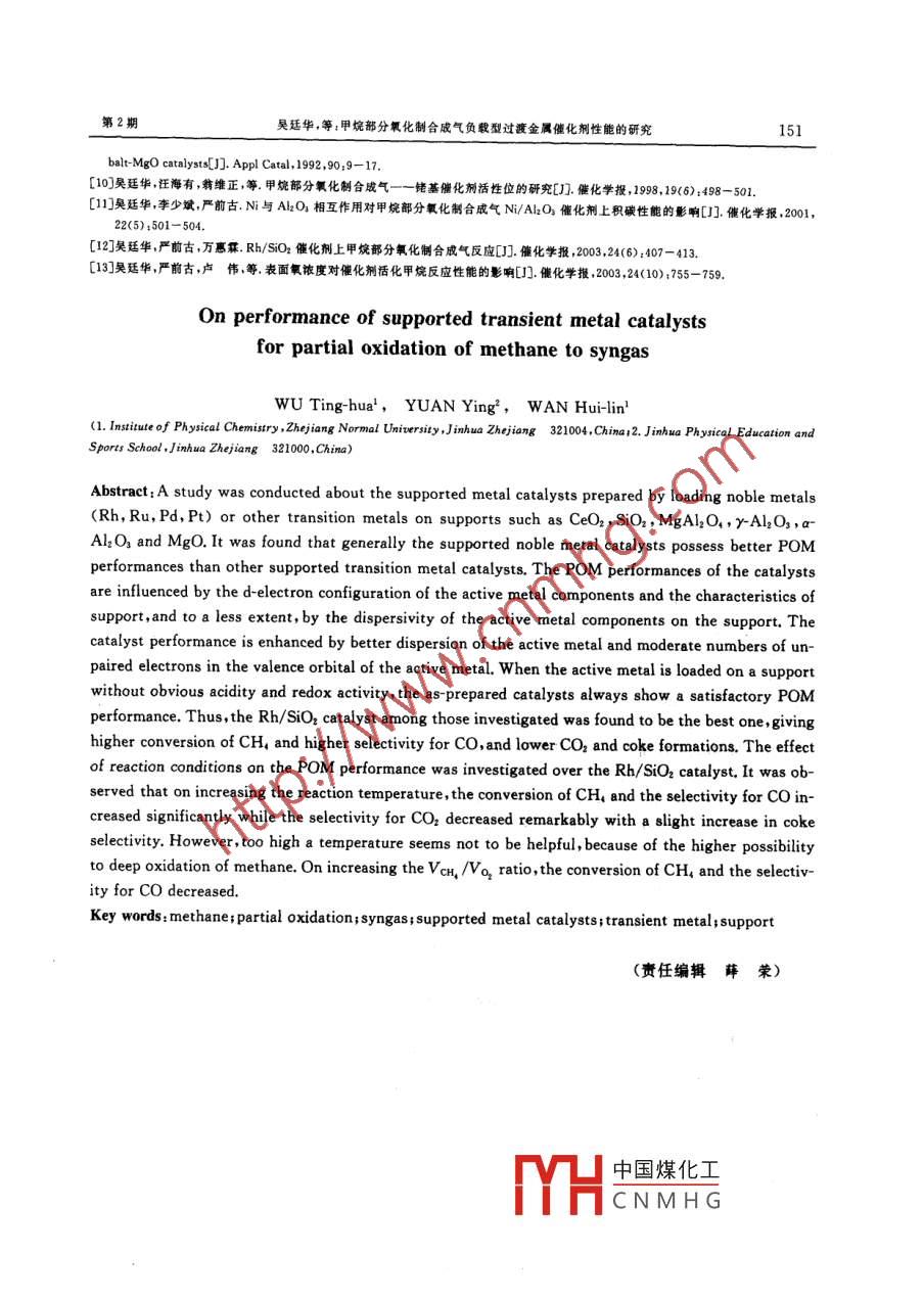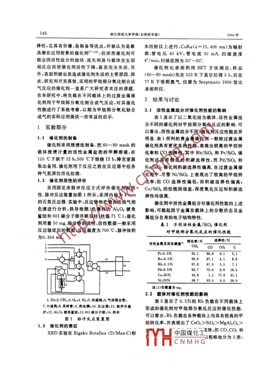 甲烷部分氧化制合成氣負(fù)載型過渡金屬催化劑性能的研究