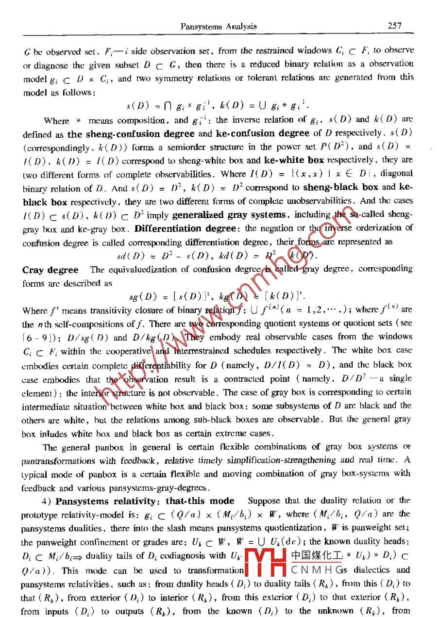 Applied Mathematics and MechanicsPublished by Shanghai University ,( English Edition, Vol 22. No 2,F(xiàn)eb 2001)Shanghai, ChinaArticle ID: 0253-4827(2001 )02- 0237-24PANSYSTEMS ANALYSIS: MATHEMATICS, METHODOLOGY,RELATIVITY AND DIALECTICAL THINKING*GUO Ding-he (郭定和)',WU Xue-mou (吳學(xué)謀)= ,FENG Xiang-jun (馮向軍)', LI Yong-li (李永禮)4(1. Physics Department, Hubei University, Wuhan 430062, P R China; .2. Wuhan Digital Engineering Institute, Wuhan 430074,P R China;3. Storage Technology Division, IBM,Silicon Valley, USA;4. Department of land Surveying and Geo-infornatics, The Horg KongPolytechnic University, Hong Kong, P K China)(Paper from WU Xue -mon, Mermber of Fditorial Comittee, AMM)Abstract: Based on new analysis modes and new definitions with relative mathemuticaticnand simplification or strengthening forms for concepts of generalized systems, .panderivaives,pansymmetry, panbox principle, pansystems relativiry, etc., theframework and related principles of pansystens methodology (and pansystems relativity aredeveloped. Related contenus include: pansystems with relatively universul mathemutizingforms,200 types of dualities, duality transformation ,pansymmetry transformation,pansystems dialectics ,he 8-domain method, pansystems mathemarical methods ,generalized quantification, the principles of approximation- transforming,pan-equivalencetheorems,supply- demand analysis ,thinking experiment, generalized gray systems, etc .Key words; pansystems methodology; relativity; systems; pansymmetry transformation ;dialectical logic; postumodermismCLC numbers: N941.6; 0412: B811Document code: AIntroductionAs an enrolled new discipline in Chinese library classification pansystems theory is atransfield multilayer network like research with the emphasis on pansystems, which exploresccrtain combinations of mathematical thinking ,systems thinking ,dialectical thinking und poetryhinking , and emphasizes particularly on the investigations of the building bricks ,basic blocks,fundamental categories, elementary networks and relativity of pansystems. One of her efforts isinclincd Lto develop a kind of methodology and systems science with postmodernism style,including certain methodology of half- mathematization with relativc operatability, and pursues todiscover some principles and modes of pansystems whose transitive closure is alnost everywhere中國(guó)煤化工* Received date: 2000-03-15; Revised date: 2000-11-.DYHCNMHGBiographies: GLO Ding-he (1955 - ), Associate Professor;WU Xuc-mou (1935- ), Rescarch Fellow237238GUO Ding-he WU Xue-mon, FENG Xiang-jun et aldense in principles of many disciplines and topics. And he investigation on various forms ofrelativity of pansysterms is called the pansystems relativity .Pasystems principles and modes:= The 4-mutuals (interconnection, intertransformation,interderivative and inerpronotion ) or 5- mutuals ( intcronnection, intertansformation,interderivative. interpromotion and inerrestraint, simply denoted by臺(tái)) of various principles .Pansystems relativity: = pansystems theory:= 4-mutuals or nctwork conmection of variousprinciples. It is coresponding w: natural number system:≈rational number system:= rcalnumber system: = complex number system, hypercormplex umber system, fuzy numbersystcm: > various mathematical structures.The present paper extends the past investigations ([1-5]) in some new forms, developsthe framework and related principles of pansystcms methodology and pansystems relativity, andpresents new analysis modes aod new definitions with relaive mathematization and sinmplificationor strengthening forms for concepts of generalized systems, panderivatives, pansymmety ,panbox principle, pansystems relativity, etc . Related contents inchudc: pansystems wih relativelyuniversal forms ( T-ary pansystems, high power pansystems, charm pansystems S:二varioussystems,various mathematical strucuress and various word-descriptions), 200 types of dualties,duality rapsformation, pansymmetry transformation, pansystems dialectics, the 8-domainmethod, pansystems mathematical methods, generalized quantification, the principles ofapproximation-ransforming,pan- equivalencetheorems,supply-demand analysis, thinkingexperiment, generalized gray systems, etc1 Basic Concepts and Pansystems Mathematics1.1 Pansystems and generalized systemsIn the pansystems theory, the category of pansysterms means generalized systerms ,generalized relations or their various compositions ( duality-type definition), σr embodies thethought, investigations and operations research to generalized (or pan-ize) the So-called7-elermeots of pansystems with the tendency 1o connct various disciplines and topics (7-element-type definition) :Pan * (7-elements; ..xtrior interior, observocontrol, clustering discoupling, subject-object,difference identity,body- shadow,panorder, suply-demand, causality-environment, “ ) =strengthen certain 4 mutuals or 5- mutuals of various disciplines or topics.Where the so-called 7-elemenls imply the typical sub-concepts of pansystems category suchas: generalized systems, relations, symmetry ( pansynmetry ),Shengke, transformations( panlransformations), oprimization ( panoptimization),infinitesinal calculus ( panderivative). .Things/ Principles≈Pansysterms●Transitive Closure/ Repcated Operaions-Transformations-Applications (similar to generalized chaotic dynamics and neural networks)≈Certain 4-mutualsof various disciplines or topics .In a certain sense,pansystems theory pursues certa中國(guó)煤化工or modes whoseransitive closure is almost everywhere dense in principl.MHCNM.HGr topis.The generalized systerms can be represented in mathematical form as certain formalcombination of the generalized hardware A and generalized software B, or a sort of hard-softunified snix.s = (A,B). Where A is certain given thing-set, including certain well-definedPansystems Analysis239pansystems set, and B is ccrtain rclations or panweighl composition of re