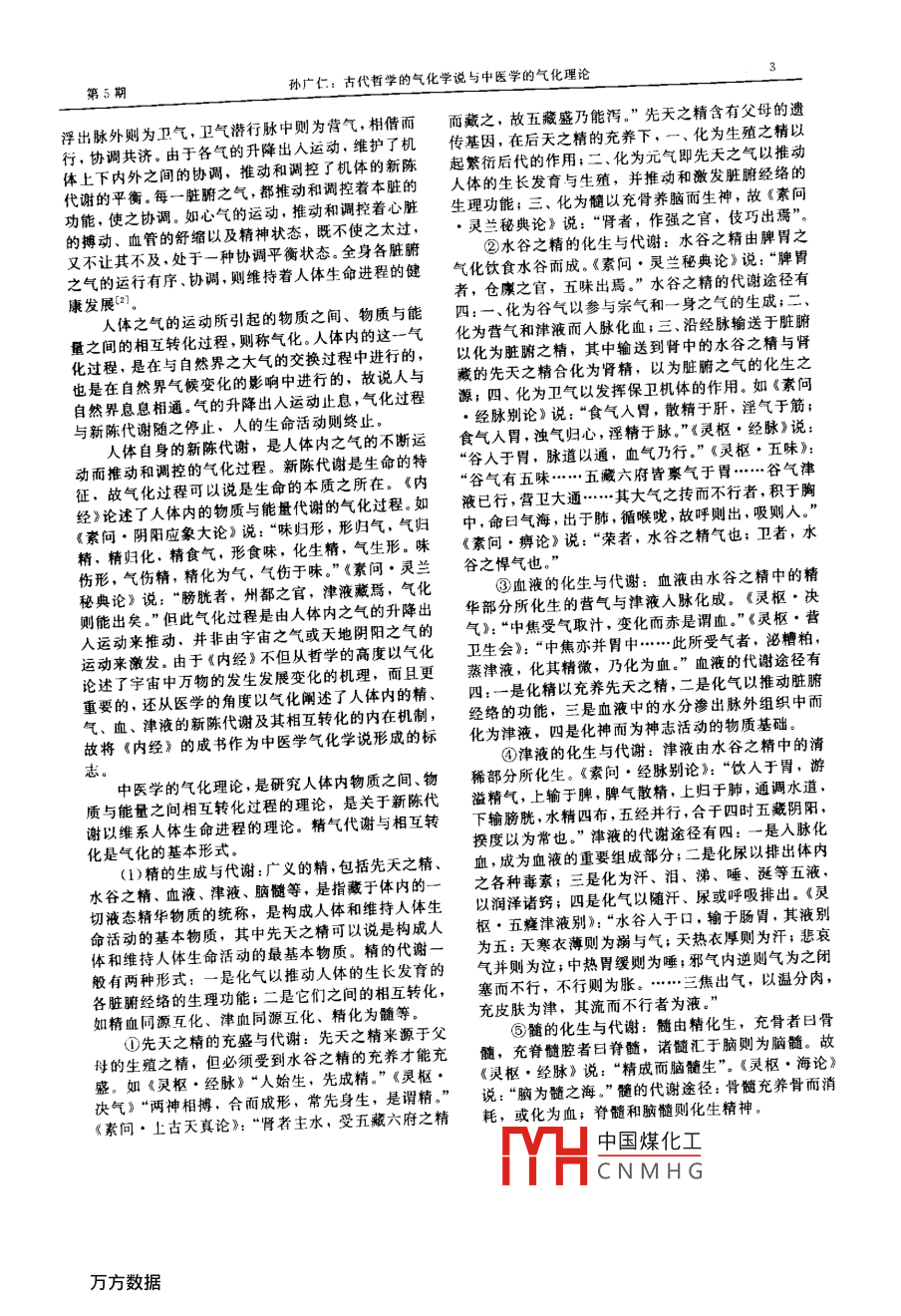 第25卷第5期浙江中醫(yī)學(xué)院2001年10月JOURNAL OF ZHEJIANG COLLEGE OF TCM家論拓古代哲學(xué)的氣化學(xué)說(shuō)與中醫(yī)學(xué)的氣化理論孫廣仁(山東中醫(yī)藥大學(xué)中醫(yī)基礎(chǔ)學(xué)院濟(jì)南250014)擄要討論了古代哲學(xué)與中醫(yī)學(xué)的兩種不同學(xué)科范疇的氣化的內(nèi)涵及其之間的區(qū)別與聯(lián)系,認(rèn)為古代哲學(xué)的氣化學(xué)說(shuō)是古人的一種宇宙觀和方法論,是對(duì)宇宙萬(wàn)物的產(chǎn)生及其櫚互關(guān)系的一種闡釋;中醫(yī)學(xué)的氣化理論是關(guān)于人體生命維系的理論,是對(duì)人體新陳代謝過(guò)程的闡釋。古代晢學(xué)的氣化學(xué)說(shuō)對(duì)中醫(yī)學(xué)氣化理論的建立具有方法學(xué)方面的重要意義。關(guān)鍵詞氣化氣機(jī)氣中醫(yī)學(xué)中國(guó)古代哲學(xué)氣化,既是中醫(yī)學(xué)中的重要概念,又是中國(guó)古代氣散時(shí),它是無(wú)形的太虛,表現(xiàn)為無(wú)、隱。氣聚則氤哲學(xué)中的重要命題口。氣化在兩種不同學(xué)科范疇中氳而化生有形之萬(wàn)物,氣散則萬(wàn)物形潰而復(fù)為無(wú)形的內(nèi)涵有何異同?這是我們需要解答和澄清的問(wèn)題。之太虛。下面對(duì)兩種不同學(xué)科范疇的氣化學(xué)說(shuō)作一比較性探氣的運(yùn)動(dòng)具有普遍性?!端貑?wèn)·六微旨大論》說(shuō):“是以升降出入,無(wú)器不有?!薄捌鳌?即由陰陽(yáng)五行之1古代哲學(xué)對(duì)氣的運(yùn)動(dòng)和氣化的認(rèn)識(shí)氣凝聚而產(chǎn)生的各種各樣的有形質(zhì)之實(shí)物。宇宙之氣的運(yùn)動(dòng),稱為氣機(jī)。宇宙之氣的運(yùn)動(dòng)形式多種中的任何一個(gè)有形之體,任何一個(gè)具體事物,既是由多樣,但主要有升降聚散等幾種無(wú)形而運(yùn)動(dòng)的陰陽(yáng)之氣交感聚合而化生,其自身之宇宙之氣自身的運(yùn)動(dòng)變化,分為天地陰陽(yáng)二氣。中又具備著陰陽(yáng)之氣的運(yùn)動(dòng)特性及升降出入聚散等天為陽(yáng),地為陰。天氣居上,地氣在下。居上之天氣運(yùn)動(dòng)形式。氣的升降出入聚散運(yùn)動(dòng),使整個(gè)宇宙充滿當(dāng)下降,在下之地氣應(yīng)上升。如此則天地陰陽(yáng)二氣氤了生機(jī),既可促使無(wú)數(shù)新生事物的孕育和發(fā)生,又可氳交感,淚錯(cuò)相蕩,化生宇宙萬(wàn)物,并推動(dòng)著它們的引致許多舊事物的衰敗與消亡,如此則維持了自然發(fā)展與變化。如《素問(wèn)·六微旨大論》說(shuō):“氣之升界的穩(wěn)定與平衡。氣的運(yùn)動(dòng)止息,宇宙則失去生生之降,天地之更用也?!讯?氣流于地;地氣機(jī),整個(gè)世界就會(huì)毀滅,生命就會(huì)消亡。故《素問(wèn)上升,氣騰于天。故高下相召,升降相因而變作矣?!绷⒅即笳摗氛f(shuō):“出入廢則神機(jī)化滅,升降息則氣明代王廷相認(rèn)為,氣有陰陽(yáng),“天地未判之前只有一立孤危。故非出入,則無(wú)以生長(zhǎng)壯老已;非升降,則氣而已.一氣中即有陰陽(yáng)”,而陰陽(yáng)相互感應(yīng),“二氣無(wú)以生長(zhǎng)化收藏?!绷餍?生物不休氣化,是指氣的運(yùn)動(dòng)產(chǎn)生的各種變化的過(guò)程,凡聚散也是氣的主要運(yùn)動(dòng)形式。《莊子》認(rèn)為氣凝在氣的直接作用下或參與下,宇宙萬(wàn)物在形態(tài)、性能聚而人物成,氣消散而人物亡?!吨庇巍氛f(shuō):“人之以及表現(xiàn)形式上所出現(xiàn)的各種變化,皆是氣化的結(jié)生·氣之聚也。聚則為生,散則為死?!薄端貑?wèn)·陰陽(yáng)果。應(yīng)象大論》說(shuō):“積陽(yáng)為天,積陰為地?!薄痘茨献佑捎谟钪嫒f(wàn)物的各種各樣的變化,都是在氣的天文訓(xùn)》說(shuō):“積陽(yáng)之熱氣生火,火氣之精者為日;積不斷運(yùn)動(dòng)過(guò)程中產(chǎn)生的,故氣化理論也隨著氣的運(yùn)陰之寒氣為水,水氣之精者為月?!笨梢?jiàn)天地皆由陰動(dòng)理論的產(chǎn)生而形成。古人觀察到云氣和風(fēng)氣的流陽(yáng)二氣凝聚而成。宋代張載以氣的聚散來(lái)統(tǒng)一無(wú)形動(dòng)、交感、氤氳而產(chǎn)生閃電、雷雨,推測(cè)出天地陰陽(yáng)的太虛與有形的萬(wàn)物,云:“太虛不能無(wú)氣,氣不能之氣的升降運(yùn)動(dòng),氤氳交感,相摩相蕩,從而化生宇不聚而為萬(wàn)物,萬(wàn)物不能不散而為太虛?!薄皻庵凵⒅嫒f(wàn)物。如《素問(wèn)·陰陽(yáng)應(yīng)象大論》說(shuō):“地氣上為于太虛,猶冰凝釋于水?!?《正蒙·太和》)聚與散,云,天氣下為雨。”古人又可從男女生殖之精相結(jié)合是氣的兩種運(yùn)動(dòng)形式,可表現(xiàn)為氣的兩種不同的形而孕育一個(gè)新生命的過(guò)程中推理出陰陽(yáng)二氣交感合態(tài):當(dāng)氣聚時(shí),它是有形的萬(wàn)物,表現(xiàn)為有、顯;當(dāng)和而生物的普遍規(guī)律。如《易傳·系辭下》說(shuō):“天作者簡(jiǎn)介孫廣仁(1949男,山東省昌邑市人,醫(yī)學(xué)碩士,山東中醫(yī)藥大學(xué)教授,博土生研究生導(dǎo)師,中國(guó)中醫(yī)藥學(xué)會(huì)中醫(yī)基礎(chǔ)理論專業(yè)委員會(huì)委員主要從事中醫(yī)學(xué)藏象理論及思維方法的研究編高校教材著作20部,發(fā)表論文40多篇中國(guó)煤化工CNMHG浙江中醫(yī)學(xué)院學(xué)報(bào)第25卷地氤氳,萬(wàn)物化醇;男女構(gòu)精,萬(wàn)物化生