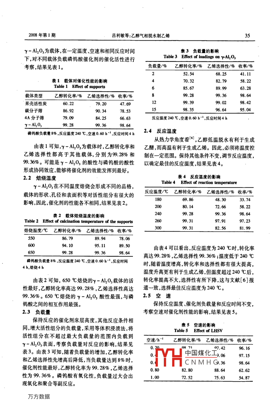 工業(yè)催化Jan.2008第16卷第1期INDUSTRIAL CATALYSISVol 16 No. 1有機(jī)化工與催化】乙醇?xì)庀嗝撍埔蚁﹨卫?王佳,何邦方,孫璐璐,劉純山(華東理工大學(xué)工業(yè)催化所,上海200237)摘要:研究了負(fù)載型磷鎢酸催化劑對(duì)乙醇?xì)庀嗝撍埔蚁┑拇呋饔谩T诠潭ù卜磻?yīng)器上考察了其性能,最佳條件:γ-AL2O3負(fù)載8%的磷鎢酸,溫度240℃,空遠(yuǎn)0.60h-。最佳工藝條件下乙醇轉(zhuǎn)化率達(dá)9928%,乙烯選擇性9.36%。催化劑穩(wěn)定性好,與傳統(tǒng)的液體無機(jī)酸相比具有催化活性高、環(huán)境友好和能耗低等優(yōu)點(diǎn)。關(guān)鍵詞:有機(jī)合成化學(xué);乙烯;磷鎢酸催化劑;乙醇?xì)庀嗝撍袌D分類號(hào):0643.36;0623411文獻(xiàn)標(biāo)識(shí)碼:A文章編號(hào):10081143(2008)01003403Synthesis of ethylene via vapor phase dehydration of ethanolLO Limin, WANG Jia, HE Bangfang, SUN Lulu, LIU Chunsha( Institute of Industrial Catalysis, East China University of Science and Technology, Shanghai 200237)Abstract: The catalytic behaviors of supported phosphotungstic acid catalyst were studied in a fixed-bedreactor. The optimal reaction condition was as follows: 8% phosphotungstic acid supported on y-A,O,240C, LHSV 0.60 h". Ethanol conversion of 99. 28% and ethylene yield of 99. 36% were obtainedunder the optimal condition. The catalyst is superior to conventional liquid inorganic catalysts, withhigher activity, environmental-friendliness, lower energy consumption and good stability.Key words: organic synthesis chemistry; ethylene; phosphotungsten catalyst; ethanol vapor-phase dehydrationCLC number: 0643. 36: 0623. 411 Document code: A Article ID: 1008-1143(2008 )01-0034-03乙烯是化工產(chǎn)品的重要原料,主要來源于石油,隨著石油資源的不斷枯竭,尋求新的乙烯生產(chǎn)x1實(shí)驗(yàn)部分藝勢(shì)在必行。乙醇來源豐富,可以利用天然發(fā)酵法催化劑的制備:以氧化鋁載體為例。氧化鋁球生產(chǎn)由乙醇脫水制乙烯的工藝會(huì)成為以后乙烯生在一定溫度下焙燒4h,然后用一定濃度的磷鎢酸水產(chǎn)的主要工藝。溶液浸漬過夜,120℃烘干4h,500℃焙燒4h,置于乙醇脫水制乙烯的催化劑報(bào)道很多23,主要干燥器待用。分為液體無機(jī)酸、固體酸、分子篩和雜多酸等。目采用固定床反應(yīng)器反應(yīng)器長(zhǎng)80cm,直徑20mm,前,大多數(shù)用于液相法脫水的催化劑都存在酸性催催化劑裝填40mL,溫度由可控硅電壓調(diào)整器控制,化劑腐蝕設(shè)備對(duì)反應(yīng)器的要求較高后處理較繁雜乙醇由恒流泵打入反應(yīng)器。和污染環(huán)境的問題,而且催化劑比較昂貴,實(shí)際應(yīng)用2結(jié)果與討論上也有很多問題。為了克服這些缺點(diǎn),本文將磷鎢酸負(fù)載在載體上4-3,用于乙醇的氣相脫水,并研究2.1載體的選擇了各種因素對(duì)反應(yīng)性能的影響。中國(guó)煤化工篩、44分子篩和CNMHG收稿日期2007;修回日期:2007-12-09作者簡(jiǎn)介:呂利敏年生,女,河南省周口市人,在讀碩士研究生,從事醇催化脫水方向研究。通訊聯(lián)系人:劉純2008年第1期呂利敏等:乙醇?xì)庀嗝撍埔蚁℡-AL2O3為載體,在一定溫度、空速和相同反應(yīng)時(shí)間3負(fù)載量的影響下,對(duì)不同載體負(fù)載磷鎢酸催化劑的催化活性進(jìn)行Table 3 Efect of loadings on rAL,O考察,結(jié)果見表1負(fù)載量/%乙醇轉(zhuǎn)化率/%乙烯選擇性/%收率/%52.5468.表1載體對(duì)催化性能的影響46870.3258.22Table 1 Effect of supports8999載體類型乙醇轉(zhuǎn)化率/%乙烯選擇性/%收率/%99果殼活性炭60.2279.2047.6999.0298.42碳分子篩78.53983596495044A分子篩79.0984.25反應(yīng)溫度240℃,空速0.60h-1,反應(yīng)時(shí)間4hy-A20,9.289.369.64磷鎢酸負(fù)載量8%,反應(yīng)溫度240℃空速060h,反應(yīng)時(shí)間4b2.4反應(yīng)溫度從熱力學(xué)角度看6,乙醇低溫脫水有利于生成由表1可知,y-Al2O3為載體時(shí),乙醇轉(zhuǎn)化率和乙醚而高溫有利于生成乙烯。因此,必須將溫度控乙烯選擇性都高于其他載體,分別為9.28%和制在一定范圍。保持其他條件不變調(diào)節(jié)反應(yīng)溫度936%??赡苁莥-AL2O3的酸性與磷鎢酸的酸性以確定最佳的反應(yīng)溫度結(jié)果見表4形成協(xié)同效應(yīng),能夠?qū)⒋呋瘎┑男馨l(fā)揮到最好。2.2焙燒溫度表4反應(yīng)溫度的影響y-Al2O3在不同溫度焙燒會(huì)形成不同的晶格,Table 4 Effect of reaction temperature載體的形狀、孔徑和表面積等對(duì)活性組分有很大的反應(yīng)溫度/℃乙醇轉(zhuǎn)化率%乙烯選擇性/%收率/%影響,因此,催化劑的性能各不相同,結(jié)果見表2。69.8648.3033.表2載體焙燒溫度的影響Table 2 Efect of calcination temperature of3197.91焙燒溫度℃乙醇轉(zhuǎn)化率/%乙烯選擇性八收99.3189947860095.11由表4可以看出,反應(yīng)溫度為240℃時(shí)轉(zhuǎn)化率高達(dá)9.28%,乙烯選擇性99.36%;溫度低于240℃磷鎢酸負(fù)載量8%,反應(yīng)溫度240℃,空速0.60h1,反應(yīng)時(shí)間4h焙燒4b時(shí),隨著溫度增高,轉(zhuǎn)化率和選擇性都有很大提高,溫度升高更有利于生成乙烯但溫度超過240℃后由表2可知,650℃焙燒的γ-Al2O3載體的活轉(zhuǎn)化率提高不大選擇性有所下降,這與文獻(xiàn)[6]報(bào)性最好,乙醇轉(zhuǎn)化率高達(dá)99.28%,乙烯選擇性高達(dá)道一致,選擇最佳反應(yīng)溫度為240℃。9.36%。650℃焙燒的y-AL2O3酸性最強(qiáng),與磷25空速鎢酸之間的相互作用最強(qiáng)保持反應(yīng)溫度、催化劑負(fù)載量和反應(yīng)時(sh
