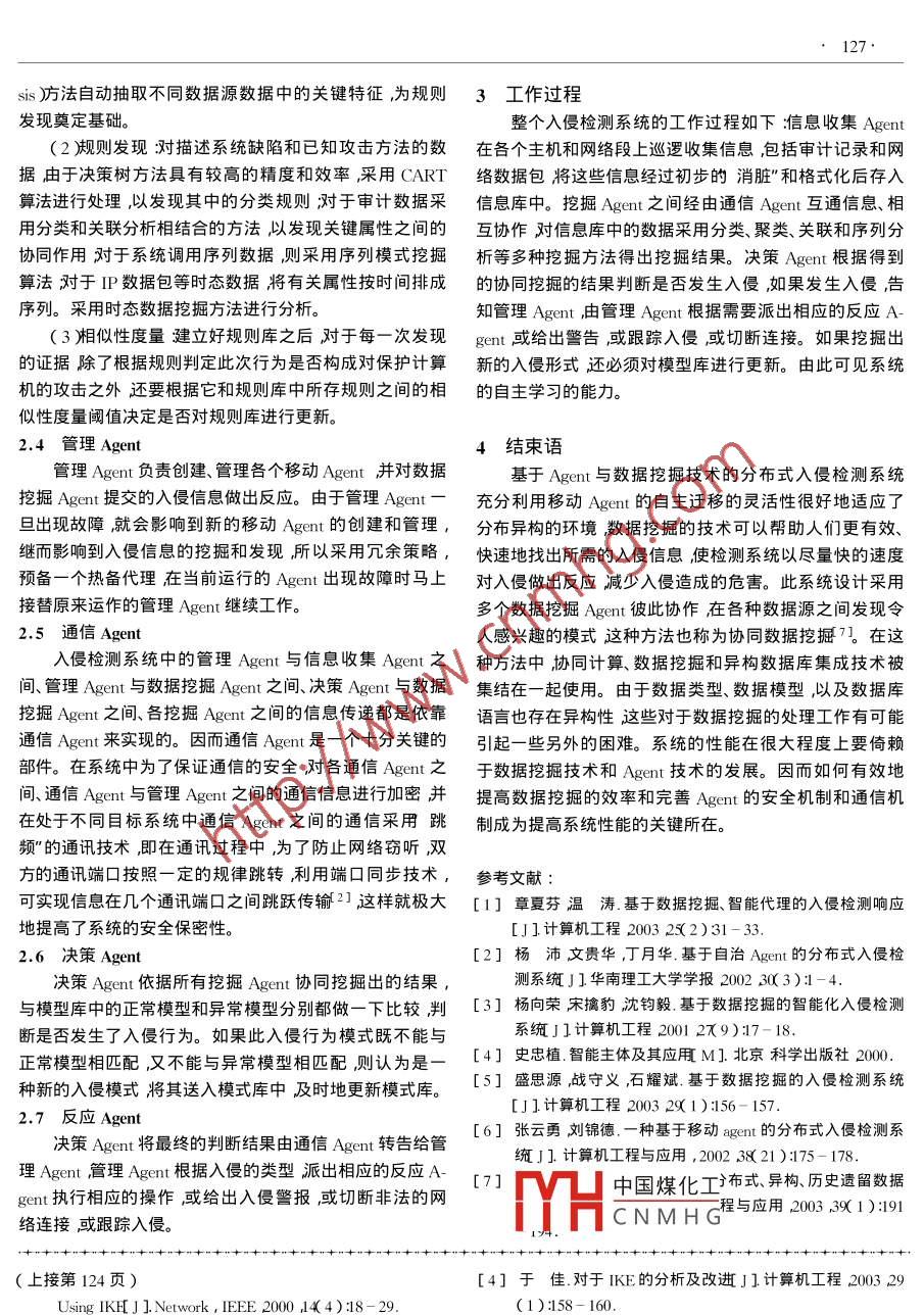 第14卷第3期微機(jī)發(fā)展Vol.14_ No. 32004年3月.Microcomputer DevelopmentMar. 2004IKE分析與改進(jìn)郭豐娟,宋雨(華北電力大學(xué)計(jì)算機(jī)科學(xué)與工程系河北保定071003 )摘要因特網(wǎng)密鑰交換協(xié)議( IKE )是-種網(wǎng)絡(luò)信息安全協(xié)議。作為-種混合型協(xié)議,由于其復(fù)雜性,它的安全性引起了人們的重視。文中針對(duì)其安全性進(jìn)行了探討。介紹了密鑰交換協(xié)議IKE的相關(guān)知識(shí)及其工作原理,在此基礎(chǔ)上分析了中間人攻擊、重放攻擊及拒絕服務(wù)攻擊的基理結(jié)合IKE的工作過(guò)程分析IKE遭受三種攻擊的方式和可能性提出用聯(lián)鎖協(xié)議”在IKE中防中間人攻擊”通過(guò)消息ID防重放攻擊”并研究了用來(lái)防止拒絕服務(wù)攻擊”的Cookie的生成問(wèn)題。關(guān)鍵詞密鑰交換協(xié)議,中間人攻擊重放攻擊拒絕服務(wù)攻擊中圖分類(lèi)號(hào):TP393.08文獻(xiàn)標(biāo)識(shí)符A文章編號(hào):1005 - 3751( 2004 )03 - 0123 - 02Analysis and Improvement of Internet Key ExchangeGUO Feng-juan ,SONG Yu( Department of Computer Sci. and Eng. , North China Electric Power University ,Baoding 071003 , China)Abstract : IKE is one of proools of Internet information' s security. It is complex because of the construction of itself ,so many re-searchers pay much attention to its security. And in the paper study the security of it. First analyzes the mechanism of IKE and introducesthree kinds of attacks man in middle attack denial of service by floding attack and resending attack. Then discusses the manner and pos-sibility of IKE' s suffering from them. At last gives some advices of improvement such as information ID for resending attack and somesuggestion for Cookie for denial of service.Key words :KE protcol :man in middle attack ;resending attack :denial of service計(jì)算機(jī)網(wǎng)絡(luò)信息安全的研究日益受到人們的重視,網(wǎng)模式。 在主模式下發(fā)起者和響應(yīng)者一共交換六條消息并絡(luò)安全協(xié)議成為其中很重要的一部分。IKE 指定了一個(gè)提供 了身份驗(yàn)證和參數(shù)配置上的靈活性積極模式只交換Internet團(tuán)體的Internet 標(biāo)準(zhǔn)協(xié)議為網(wǎng)絡(luò)安全服務(wù)。三條消息其最大的優(yōu)點(diǎn)是速度快,但要以降低協(xié)議的安全性為代價(jià)。IKE第二階段的交換有快速模式和新組交1 IKE 介紹及分析換模式二種。第二階段的交換必須以第-階段交換的順I(yè)KE作為因特網(wǎng)密鑰交換協(xié)議,目的是以--種保護(hù)的利進(jìn)行為基礎(chǔ)。方式來(lái)協(xié)商安全聯(lián)盟并為它提供經(jīng)過(guò)驗(yàn)證的密鑰生成材IKE第二階段的安全性在很大程度.上依賴(lài)于第-階料。它創(chuàng)建在由ISAKMP定義的框架上,沿用了OAK-段密鑰材料的安全性因此文中僅就IKE第一階段進(jìn)行探LEY的密鑰交換模式以及SKEME的共享和密鑰更新技寸。術(shù)還定義了自己的兩種密鑰交換方式。1.2 IKE交換過(guò)程1.1 IKE工作原理IKE主模式是ISAKMP身份保護(hù)交換的實(shí)現(xiàn)交換的文獻(xiàn)1給出了IKE的具體說(shuō)明。IKE 協(xié)商分為兩個(gè)六條消息中 第1 2條消息協(xié)商雙方通信的-些安全關(guān)聯(lián)階段第. -階段在ISAKMP進(jìn)程間建立一個(gè)安全 并經(jīng)過(guò)驗(yàn)內(nèi)容、規(guī)范及算法等3 A兩個(gè)消息交換Diffie - Hellman的證的信道,同時(shí)為IPsecSA(第二階段)產(chǎn)生密鑰材料,即公共值和必要的輔助數(shù)據(jù)例如:當(dāng)前時(shí)間(nonce);此后,完成ISAKMP安全聯(lián)盟( ISAKMP SA ) ;第二階段指協(xié)商通信雙方生成SKEYID并進(jìn)而衍生一組密鑰,包括加密具體服務(wù)所需安全聯(lián)盟,這些服務(wù)可以是IPsec 或任何其材料中國(guó)煤化工密鑰SKEYID - a以及加它需要密鑰材料以及/或者協(xié)商參數(shù)的服務(wù)。秘密JHCNMH:消息5,6是由所協(xié)商算IKE第一階段提供了兩種不同的模式:主模式和積極驗(yàn)證。積極模式只用了主模式一半的消息,而且不提供身份保護(hù),因此其協(xié)商能力受到很大限制。收稿日期2003 - 08 -21作者簡(jiǎn)介郭豐礱救雅一)女 山西人碩士研究生研究方向?yàn)檐浿髂J交蚍e極模式中都允許四種不同的驗(yàn)證方法數(shù)字簽名、標(biāo)準(zhǔn)公鑰加密、修訂公鑰加密以及預(yù)共享件工程。124●微機(jī)發(fā)展第14卷密鑰。如此B在第(4)步完整接收整個(gè)報(bào)文后進(jìn)行解密驗(yàn)證就會(huì)發(fā)現(xiàn)錯(cuò)誤從而終止傳輸。2 IKE 安全性分析及改進(jìn)2.2重 放攻擊的防范2.1中間人攻擊的防范重放攻擊也屬子中間人攻擊”的一種是指攻擊者獲如前文所述,IKE 第一階段用Diffie - Hellman算法生得 了鑒別分組的副本以后將它傳輸?shù)剿哪康牡刂贰J粘擅荑€材料SKEYID ,IKE中用來(lái)驗(yàn)證消息及保護(hù)消息機(jī)到了 重復(fù)的鑒別IP 分組可能會(huì)以某種方式中斷服務(wù)或出密性的密鑰材料都是由它衍生出來(lái)的,因此Diffe-Hell-現(xiàn)其它一些意想不到的后 果。man的安全性直接影響到IKE交換過(guò)程的安全性。該算.針對(duì)這一攻擊文獻(xiàn)2]中提出利用消息ID發(fā)起者和法交換過(guò)程如圖1所示。響應(yīng)者之間傳送的每-條消息都應(yīng)該有不同的消息ID這用戶A用戶B .樣在收到消息時(shí)檢測(cè)是否存在另-個(gè)正在進(jìn)行的具有同選取q, 0樣ID的消息交換