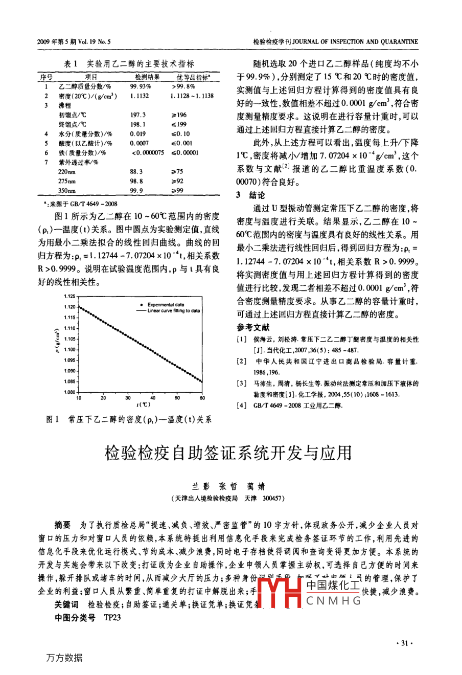 JOURNAL OF INSPECTION AND QUARANTINE檢驗(yàn)檢疫學(xué)刊vol.19No.52009年第5期常壓下乙二醇密度一溫度相關(guān)性的研究宋昌盛!徐志剛2朱丹萍丁小勇王晶(1.中國(guó)檢驗(yàn)認(rèn)證集團(tuán)江蘇有限公司太倉(cāng)分公司江蘇太倉(cāng)25400;2.太倉(cāng)出入境檢驗(yàn)檢疫局3.重慶出入境檢驗(yàn)檢疫局技術(shù)中心摘要乙二醇是一種重要的液體化工產(chǎn)品,主要用于生成合成樹(shù)脂、表面活性劑及炸藥等。本文采用U型振動(dòng)管密度計(jì)測(cè)定了常壓下乙二醇在10~60℃的密度。通過(guò)線(xiàn)性回歸,發(fā)現(xiàn)乙二醇在常壓下的溫度與密度具有良好的線(xiàn)性關(guān)系。根據(jù)乙二醇密度一溫度線(xiàn)性回歸方程計(jì)算得到的密度值與直接測(cè)定的密度值相差不超過(guò)00001g/cm23,符合密度測(cè)量的精度要求。關(guān)鍵詞乙二醇;振動(dòng)管密度計(jì);密度;溫度;線(xiàn)性回歸中圖分類(lèi)號(hào)TQ075Correlation of Density of Monoethylene Glycol with Temperature under Normal PressureSong Changsheng, Xu Zhigang, Zhu Danping, Ding Xiaoyong,Wang Jing(1 China Certification Inspection Group Jiangsu Co, Ltd. Taicang Branch, Taicang, Jiangsu, 215400; 2Taicang Entry-Exit Inspection and Quarantine Bureau; 3 Chongqing Entry-Exit Inspection and Quarantine Technological Center)Abstract: Monoethylene glycol (MEG )is an important raw material in industrial fields such as synthetic resinssurfactants and explosives. In this study, the density of MEG at normal pressure was measured in the temperaturerange from 10C to 60C using U-shaped vibrating tube densimeter. A good linear relationship was observed be-veen density and temperature and a linear regression equation was obtained from experimental data. Compared thecalculated density from the linear regression equation with the experimentally measured density of 20 MEG samples( punty≥99.9%) at fivetemperatures, it is observed that the difference is equal to or less than 0 0001ting that theof high purity MEG can be directly calculated according to the linear regressionKey words: Monoethylene glycol; Vibrating tube densimeter; Density: Temperature: Linear regression1前言99.9%(產(chǎn)品的各項(xiàng)指標(biāo)見(jiàn)表1)。去離子水由Mili密度是描述物質(zhì)性質(zhì)的基礎(chǔ)熱力學(xué)數(shù)據(jù)。物pore純水儀制備,電導(dǎo)率為18.2MQ·cm質(zhì)在不同溫度下的密度,在基礎(chǔ)理論研究、化工設(shè)2.2方法計(jì)、過(guò)程優(yōu)化等領(lǐng)域具有廣泛的應(yīng)用,同時(shí)也是在10~60℃溫度范圍內(nèi),每隔1℃以空氣密度進(jìn)出口商品容量計(jì)重的重要依據(jù)2。液體化工品p和去離子水密度pm對(duì)U型管密度計(jì)(DMA48,常用的密度測(cè)定方法有比重瓶法、浮力法、振動(dòng)絲奧地利 Anton Paar公司)進(jìn)行校正后測(cè)定乙二醇的粘度密度計(jì)法以及振動(dòng)管密度計(jì)法等。乙二醇密度。空氣密度與大氣壓力有關(guān)因此在用空氣密是一種重要的液體化工產(chǎn)品,廣泛用于生成合成樹(shù)度校正時(shí),需根據(jù)下式對(duì)空氣密度進(jìn)行修正脂、表面活性劑及炸藥等,也可用作抗凍劑。本文利用U型振動(dòng)管密度計(jì),以空氣和去離子水為標(biāo)準(zhǔn)樣測(cè)定了乙二醇10~60℃的密度,并通過(guò)數(shù)據(jù)擬式中,p是在P=101325kPa下的密度。其合獲得了密度與溫度的相關(guān)性,為容量計(jì)重提供可中,系統(tǒng)溫度的控制精度為0.1℃靠的、高精確度的密度數(shù)值。凵中國(guó)煤化工2材料與方法CNMHG所示根據(jù)GB/T2.1材料4649-204指要求,確足買(mǎi)驗(yàn)用乙二醇為優(yōu)乙二醇( Ethylene glycol)為進(jìn)口商品,純度≥等品2009年第5期Ⅴo19N.5檢驗(yàn)檢疫學(xué)刊 JOURNAL OF INSPECTION AND QUARANTINE表1實(shí)驗(yàn)用乙二醇的主要技術(shù)指標(biāo)隨機(jī)選取20個(gè)進(jìn)口乙二醇樣品(純度均不小檢測(cè)結(jié)果優(yōu)等品指于99.9%),分別測(cè)定了15℃和20℃時(shí)的密度值,1乙二醇質(zhì)量分?jǐn)?shù)%9993%2密度(20℃)/(g/cm3)1.1321.I28-1.1138實(shí)測(cè)值與上述回歸方程計(jì)算得到的密度值具有良3沸程好的一致性數(shù)值相差不超過(guò)0.000g/cm3,符合密初餾點(diǎn)℃197.3度測(cè)量精度要求。這說(shuō)明在進(jìn)行容量計(jì)重時(shí),可以終餾點(diǎn)℃水分(質(zhì)量分?jǐn)?shù))/%0.019≤0.10通過(guò)上述回歸方程直接計(jì)算乙二醇的密度。5酸度(以乙酸計(jì))/%0.0007≤0.001此外,從上述方程可以看出,溫度每上升/下降6鐵(質(zhì)量分?jǐn)?shù))/%7紫外透過(guò)率%1℃密度將減小增加7.07204×10g/cm3,這個(gè)88.3≥7系數(shù)與文獻(xiàn)2報(bào)道的乙二醇比重溫度系數(shù)(0275mm98.800070)符合良好。350nm3結(jié)論來(lái)源于GB/T4649-2008通過(guò)U型振動(dòng)管測(cè)定常壓下乙二醇的密度,將圖1所示為乙二醇在10~60℃范圍內(nèi)的密度密度與溫度進(jìn)行關(guān)聯(lián)。結(jié)果顯示,乙二醇在10(p)溫度()關(guān)系。圖中圓點(diǎn)為實(shí)驗(yàn)測(cè)定值,直線(xiàn)60℃范圍內(nèi)的密度與溫度具有良好的線(xiàn)性關(guān)系。用為用最小二乘法擬合的線(xiàn)性回歸曲線(xiàn)。曲線(xiàn)的回最小二乘法進(jìn)行線(xiàn)性回歸后得到回歸方程為p=歸方程為:p1=1.12744-47.0204×10t,相關(guān)系數(shù)度范圍內(nèi)p與t具有良112024-704×10,相關(guān)系數(shù)R>0.99°好的線(xiàn)性相關(guān)性。將實(shí)測(cè)密度值與用上述回歸
