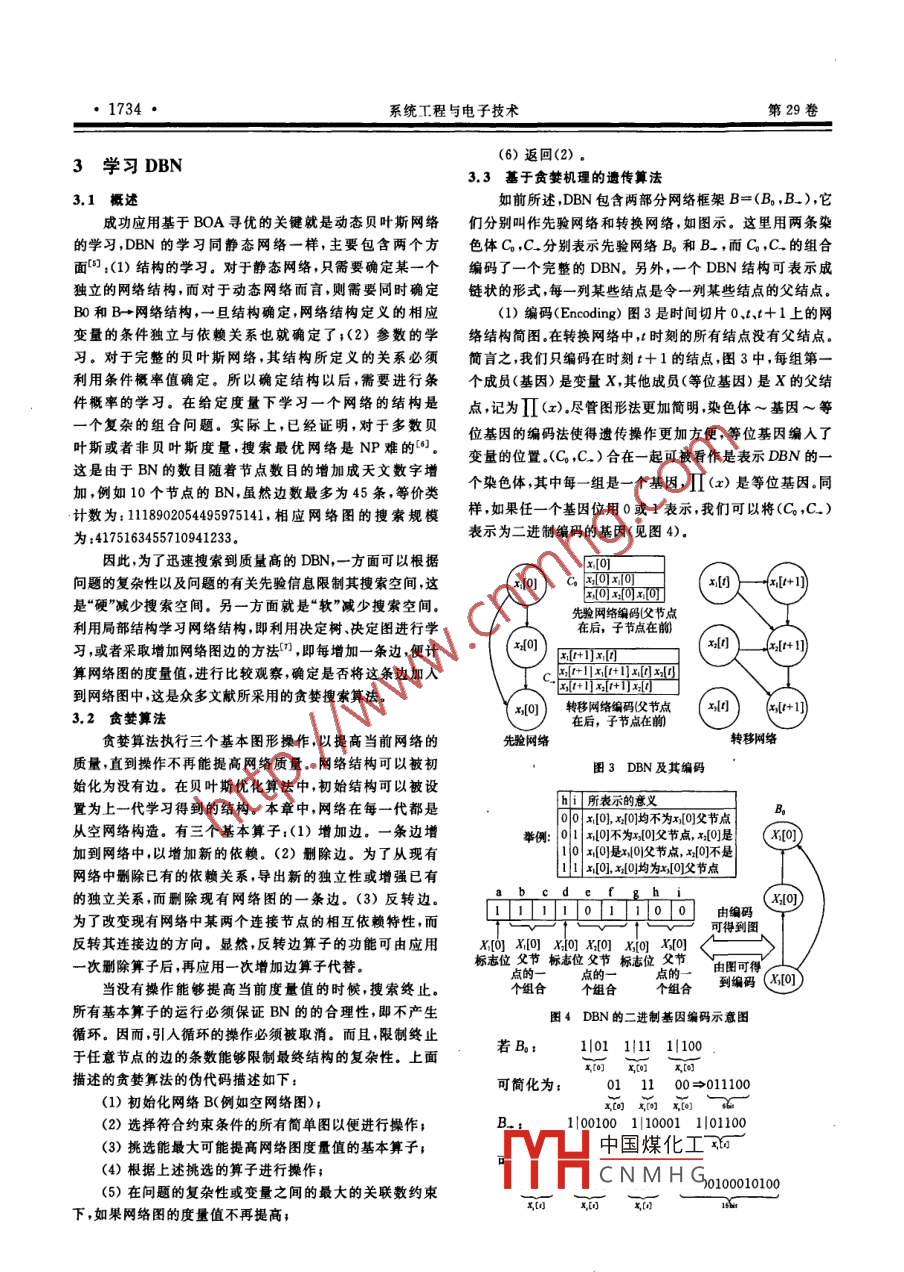 第29卷第10期系統(tǒng)工程與電子技術(shù)Vol, 29 No. 102007年10月Systems Engineering and ElectronicsOct.2007文章編號(hào)1001-506X(2007)10-173206基于貝葉斯優(yōu)化構(gòu)建DBN結(jié)構(gòu)優(yōu)化算法肖秦琨',以,高嵩',高曉光2(1. 西安工業(yè)大學(xué)電子信息學(xué)院,陜西西安710072;2.西北工業(yè)大學(xué)電子信息學(xué)院,陜西西安710072)摘要: 針對(duì)動(dòng)態(tài)貝葉斯網(wǎng)絡(luò)(DBN)結(jié)構(gòu)學(xué)習(xí)問題,提出了一種基于貝葉斯優(yōu)化(BOA)的DBN結(jié)構(gòu)尋優(yōu)算法。首先,從傳統(tǒng)進(jìn)化優(yōu)化機(jī)制的基本理論和基本操作入手,刻劃了基于概率模型進(jìn)化算法的基本思想。其次,通過描述基于概率模型進(jìn)化算法的構(gòu)困基礎(chǔ),引出了DBN結(jié)構(gòu)學(xué)習(xí)機(jī)制,即基于BOA的DBN結(jié)構(gòu)尋優(yōu)算法。BOA算法的關(guān)鍵是根據(jù)優(yōu)良解集學(xué)習(xí)得到DBN,以及根據(jù)DBN推理生成新個(gè)體,前者更為重要,依據(jù)基于貪婪機(jī)理的遺傳算法解決動(dòng)態(tài)網(wǎng)絡(luò)學(xué)習(xí),再應(yīng)用DBN前向模掀完成后一步。仿真結(jié)果表明了該算法的可行性。關(guān)鍵詞:動(dòng)態(tài)貝葉斯網(wǎng)絡(luò);貝葉斯優(yōu)化算法;結(jié)構(gòu)學(xué)習(xí);遣傳算法;前行模擬中圖分類號(hào): TP 18文獻(xiàn)標(biāo)志碼: AConstructing DBN structure based on BOAXIAO Qin-kun'", GAO Song',GAO Xiao-guang'(1. School of Electromics and Information Engineering, Xi'an Technological Univ, , Xi'an 710072 , China;2. School of Electronics and Informatiom Engineering, Northwestern Polytechrical Univ. , Xi'an 710072 , China)Abstract: An optimal algorithm for dynamic Bayesian networks(DBN) based on Bayesian optimal algorithm(BOA) is developed for learning and constructing DBN structure. Firstly, some basic theories and concepts ofthe probability model evolutionary algorithm are introduced, Secondly, the basic mode for constructing DBN di-agram are described and the mechanism of DBN structure learning based on BOA is clarified. The BOA includestwo parts of main technique, one is to gain the structure and parameter of DBN in term of good solutions, theanother is to produce new group according to DBN. The learning of DBN is done by genetic algorithm based onthe greed mechanism. The inference of DBN is done by a forward- simulation algorithm, Matlab simulation re-sult demonstrates the proposed algorithm is effective.Keywords: DBN; BOA; structure learning; genetics algorithm; forward-simulation algorithm0引言競(jìng)爭(zhēng)學(xué)習(xí)機(jī)制引入進(jìn)化算法的自主學(xué)習(xí),實(shí)驗(yàn)表明,在作業(yè)車間調(diào)度(JSP)、旅行商等問題的解決上顯示了一定的優(yōu)越貝葉斯網(wǎng)絡(luò)結(jié)構(gòu)學(xué)習(xí)是一個(gè)組合優(yōu)化問題,而引人時(shí)性。類似的還有Harik等提出的緊致遺傳算法(CGA),間關(guān)系的動(dòng)態(tài)貝葉斯網(wǎng)絡(luò)(dynamic Bayesian networks,Muhlenbein的-元邊緣分布算法(UMDA).以及分布分解DBN)結(jié)構(gòu)學(xué)習(xí),由于其動(dòng)態(tài)性和時(shí)效性,使得學(xué)習(xí)變得更算法(FDA)等。而基于貝葉斯網(wǎng)絡(luò)學(xué)習(xí)的貝葉斯優(yōu)化算加復(fù)雜[*] ,這就需要尋找合理且快速的搜索方法。法54)(Bayesian optimization algorithm, BOA)將基于概率研究搜索過程中自動(dòng)獲取問題的固有知識(shí)、積累有關(guān).模型進(jìn)化算法與圖形模型相結(jié)合,不僅具有運(yùn)行時(shí)占用內(nèi)搜索空間的屬性,并自適應(yīng)地控制搜索過程,從而得到最優(yōu)存空間少的特點(diǎn),且可有效的避免早熟現(xiàn)象,鑒于此,本文解或次優(yōu)解的啟發(fā)式搜索算法一直是眾多 學(xué)者熱衷的研究提出基于BOA的DBN結(jié)構(gòu)尋優(yōu)算法,首先從概率模型進(jìn)課題。近年來,以遺傳算法為基礎(chǔ)的基于概率模型進(jìn)化算化算法的機(jī)理人手,進(jìn)而討論基于BOA結(jié)構(gòu)學(xué)習(xí)的總體思法的研究,引起了國(guó)內(nèi)外的廣泛興趣,最具代表的工作有路,最后將問題集中在DBN網(wǎng)絡(luò)學(xué)習(xí)與推理的具體算法Baluja 提出的基于種群的增強(qiáng)學(xué)習(xí)算法(PBIL)4,將簡(jiǎn)單上,即中國(guó)煤化工k前向模擬網(wǎng)絡(luò)推理收稿日期:2006 -07 - 30;修回日期:2006-10-21.YHCNMHG基金項(xiàng)目:國(guó)家自然科學(xué)基金重大項(xiàng)目(90205019);|陜西省科研專項(xiàng)(陜西省教育廳07JK277)資助課題作者簡(jiǎn)介:肖秦琨(1974-),男,講師,博t,主要研究方向?yàn)閯?dòng)態(tài)貝葉斯網(wǎng)絡(luò),人工智能. E-mail: xingin10000@163. com第10期肖秦琨等:基于貝葉斯優(yōu)化構(gòu)建DBN結(jié)構(gòu)優(yōu)化算法●1733●模型。從宏觀上講,基于圖形模型的進(jìn)化優(yōu)化機(jī)制是基于概1基于 概率模型的進(jìn)化算法率模型的遺傳算法的進(jìn)一步發(fā)展,前者更強(qiáng)調(diào)圖形模型的建立、度量和新解的生成,后者強(qiáng)調(diào)種群分布的計(jì)算和估由模式定理及積木塊假?zèng)]可知,進(jìn)化算法成功的關(guān)鍵計(jì),我們后面討論的用于DBN結(jié)構(gòu)尋優(yōu)的的BOA算法即是:好的積木塊能夠良性地成長(zhǎng)(growth)與混合(mixing)。為圖形模式下的進(jìn)化算法。因面?zhèn)鹘y(tǒng)的進(jìn)化算法,例如簡(jiǎn)單遺傳算法,對(duì)于積木塊集中2DBN結(jié)構(gòu)尋優(yōu)算法概述地