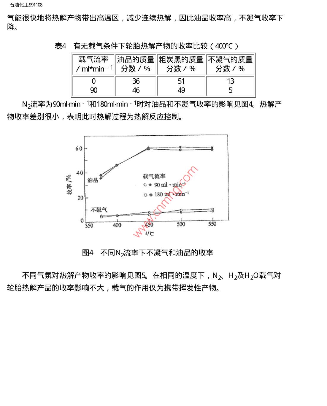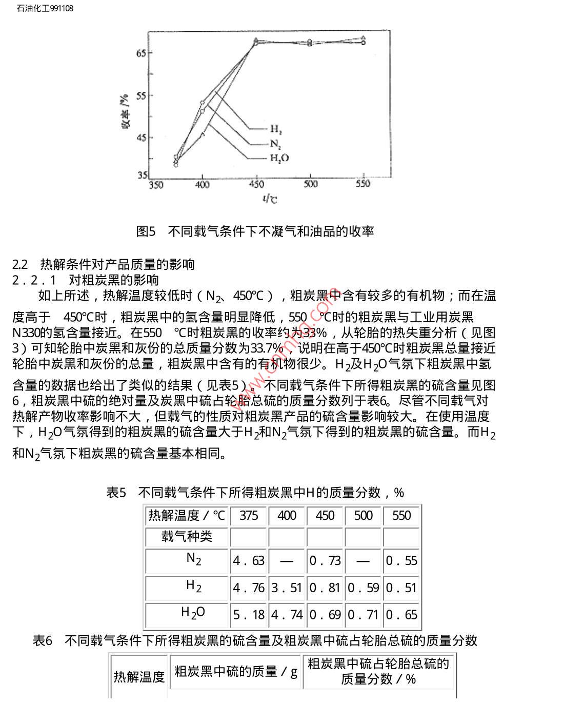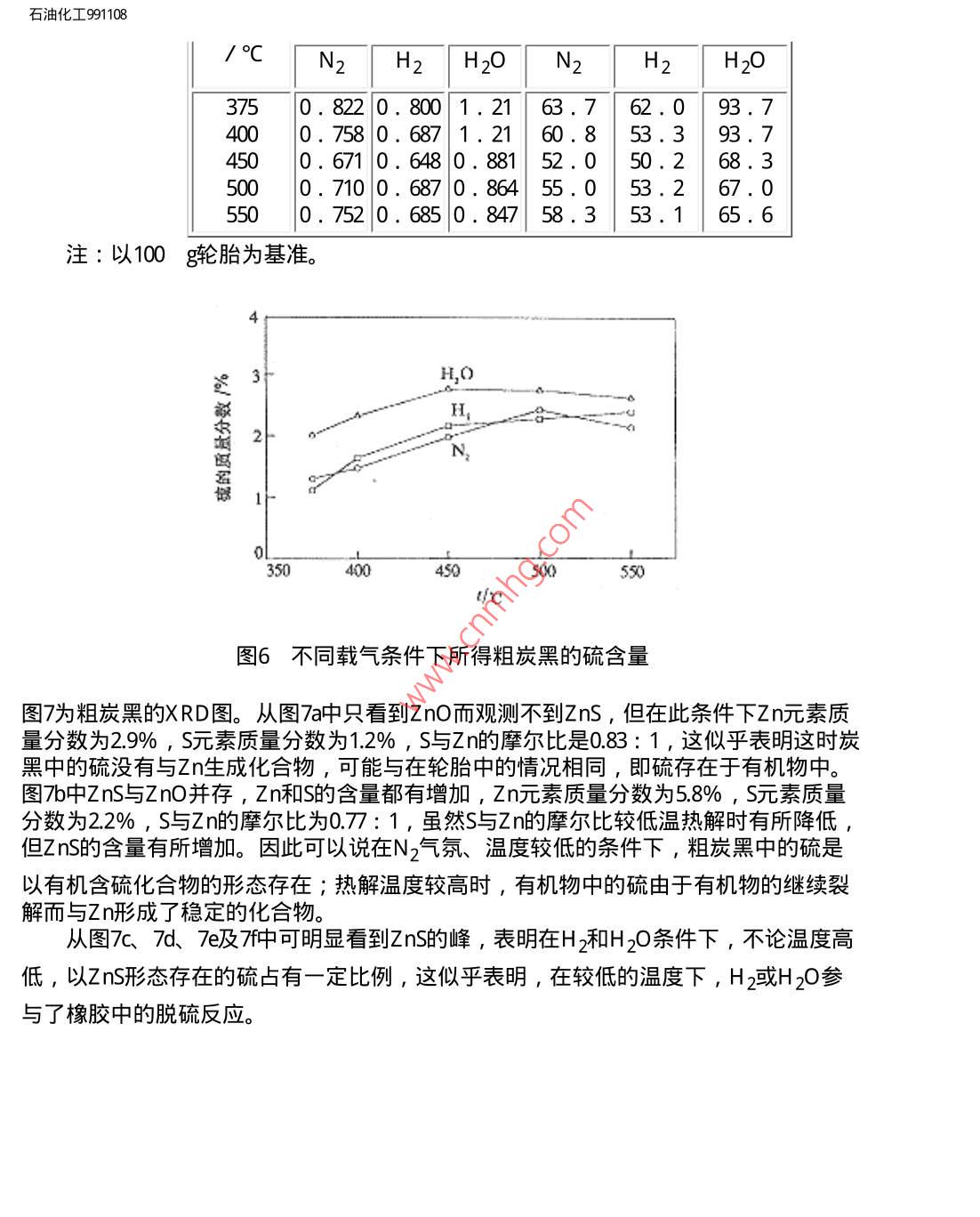 石油化工991108舊石油化工D解知5 PETROCHEMICAL TECHNOLOGY數(shù)化期刊1999年第28卷第11期Vol.28No.111999DIGITIZED PERIODICAL廢輪胎熱解過程及產(chǎn)物的研究董根全崔洪楊建麗程愛蓮劉振宇摘要采用管式反應(yīng)器對廢輪胎熱解過程進(jìn)行了研究??疾炝藦U輪胎在375~550°及在N2H2或H2◎0氣氛下的熱解過程,研究了熱解條件對產(chǎn)物收率和組成的影響。結(jié)果表明,熱解溫度高于450°C時輪胎熱解完全,油品收率高,粗炭黑中有機(jī)物含量很低。載氣對熱解產(chǎn)物收率影響較大。氣體停留時間對產(chǎn)物收率影響很小。不同的載氣氣氛對產(chǎn)物的質(zhì)量影響較大,在H2和N2氣氛下熱解所產(chǎn)生的粗炭黑含硫量最低,水蒸汽熱解產(chǎn)生的油品中的硫含量最低。關(guān)鍵詞廢輪胎熱解炭黑A Study on Pyrolysis of Used TireDONG Gen-quan, CUIHong, YANG Jian-li, CHENG Ai-lian and LIU Zhen-yu( Institute of Coal Chemistry, Chinese Academy of Sciences, Taiyuan 030001)Abstract Pyrolysis of used tirewas studied. the results indicate that tire can be completelypyrolized at temperatures higher than 450C. The use of a carrier gas increases the oil yield anddecreases gas and carbon black yield. The pyrolysis yields are independent of the chemicalnature of the carrier gas. the property of the carrier gas, how-ever, affects the productquality. Use of H2O results in relative low surfur content in oil and high surfur content incarbon blackKeywords: used tire, pyrolysis, carbon black輪胎一般由天然橡膠、合成橡膠、炭黑、化學(xué)助劑(如抗降解劑、硫化劑和溶劑油)等組成。由于廢輪胎難以降解,它的堆放既占用土地又對環(huán)境造成污染,因此廢輪胎的處理利用得到廣泛的重視。目前廢輪胎的處理利用包括:原型及改制使用,這主要用于輪胎翻新或制作再生膠粉,但隨著科技的發(fā)展,質(zhì)優(yōu)價廉的合成橡膠使輪胎翻新和再生膠的市場愈來愈小,用輪胎粉作配料生產(chǎn)道路瀝青也因為成本較高而無法大量使用;將廢輪胎和其它廢棄物一起焚燒以蒸汽或電力的形式回收能量,雖可以大量處理廢輪胎,但資源利用率不高。從烴類利用的角度講,廢輪胎的熱解可以得到高價值的產(chǎn)物,如油品、化學(xué)品、炭黑及高熱值的燃料氣,因此熱處理技術(shù)受到了日益的重視[1-5]。國外已建立一些熱處理裝置[1~3,8],如采用流化床或旋轉(zhuǎn)窯等,但這些過程所需反應(yīng)溫度較高,且以氣態(tài)產(chǎn)物為主。另外除了熱解反應(yīng)器的影響之外載氣種類及載氣流速對輪胎熱解產(chǎn)物的收率和產(chǎn)品組成也有較大的影響,特別是對硫石油化工991108在各產(chǎn)物中的分布的影響最大。這些數(shù)據(jù)對建立環(huán)境友好的廢輪胎熱解過程十分必要。本文在管式反應(yīng)器上考察了不同熱解條件如溫度、載氣種類、載氣停留時間等因素對廢輪胎熱解過程、產(chǎn)物收率及組成的影響,研究了產(chǎn)物中硫的分布,可為廢輪胎處理的工業(yè)化裝置提供基礎(chǔ)數(shù)據(jù)試驗部分1.1試驗系統(tǒng)及條件熱解系統(tǒng)包括管式加熱爐、管式反應(yīng)器和油品冷卻裝置,反應(yīng)器為內(nèi)徑30mm的石英玻璃管,溫度由DTC-10型溫度控制儀控制,如圖1所示。當(dāng)管式爐的溫度達(dá)到預(yù)定值并穩(wěn)定時,將裝有約5g廢輪胎樣品的管式反應(yīng)器置于管式爐中,同時通載氣(N2H2或H2),熱解揮發(fā)性產(chǎn)物由載氣帶入冷卻裝置,冷卻的液體收集于油品瓶內(nèi),不凝氣排空,殘留于反應(yīng)器中的固體為粗炭黑。試驗完成后將反應(yīng)器(包括粗炭黑)及油品收集瓶分別稱重,得到粗炭黑和油品的質(zhì)量。不凝氣的量由減差計算得岀。反應(yīng)器內(nèi)加熱爐溫度顯示沮度控制不凝氣放空加熱爐多管式反應(yīng)器冷卻①D氣流旗計輪胎科品油品閥門圖1熱解系統(tǒng)流程圖表1為試驗條件。試驗用輪胎樣品為某再生膠廠的混合廢輪胎,粉碎后粒度小于40目,其成份分析及元素分析見表2Nz和H2由氣瓶提供,水蒸汽由蒸汽發(fā)生器提供,并有保溫措施。表1試驗條件反應(yīng)溫度/%375,400,450,500,550載氣種類H2,N2,H20載氣流量/ ml- min0,90,180石油化工991108表2廢輪胎的成份分析及元素分析成份分析1),質(zhì)量分?jǐn)?shù)/%元素分析,質(zhì)量分?jǐn)?shù)/%化學(xué)助劑橡膠炭黑灰份「C「H02)N「56.3359.9427.805.9382.777.757.500.61.291)由熱分析天平測得;2)減差值。.2分析方法輪胎樣品、炭黑的元素組成由 Vario el微量元素分析儀測定;油品中硫含量采用上海計算技術(shù)研究所生產(chǎn)的帶FPD檢測器的GC-920色譜儀測定,色譜柱為上煉-1,長0.5m,內(nèi)徑2.3mm,載體為經(jīng)酸洗處理的 Chromosorb,粒度為80~100目,固定液為UCW982,汽化室溫度310°℃,檢測器溫度330°℃C,初始柱溫30°C,升溫速率為10°/min,終溫320°C;輪胎樣品的熱失重數(shù)據(jù)用 Setaraαm公司τGAΩ熱分析儀測定;炭黑中硫的形態(tài)由XRD測定。2結(jié)果與討論21熱解條件對產(chǎn)物收率的影響2.1.1溫度的影響在N2氣氛下,表觀氣體停留時間為1min時,溫度對熱解產(chǎn)物收率的影響見圖2在375~450°℃,隨著溫度的升高,油品的收率從35%(質(zhì)量分?jǐn)?shù),下同)增加到59%粗炭黑的收率從59%降至3%;不凝氣的收率為3%~7%,且隨溫度的升高而略有升高。當(dāng)熱解溫度高于450℃時,熱解產(chǎn)物的收率基本不變,表明熱解溫度為450°C時,廢輪胎中橡膠已完全熱解。不同條件下所得粗炭黑的