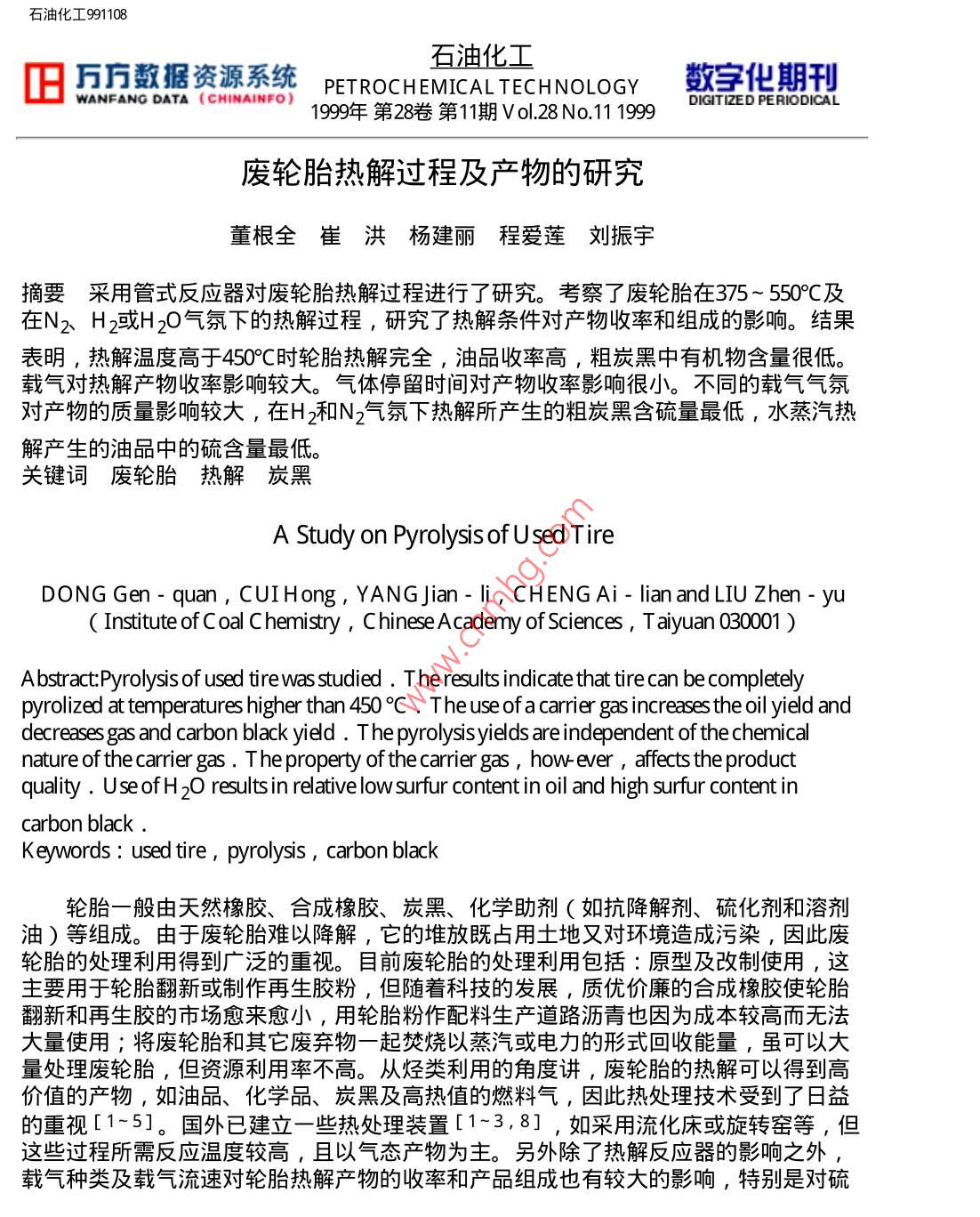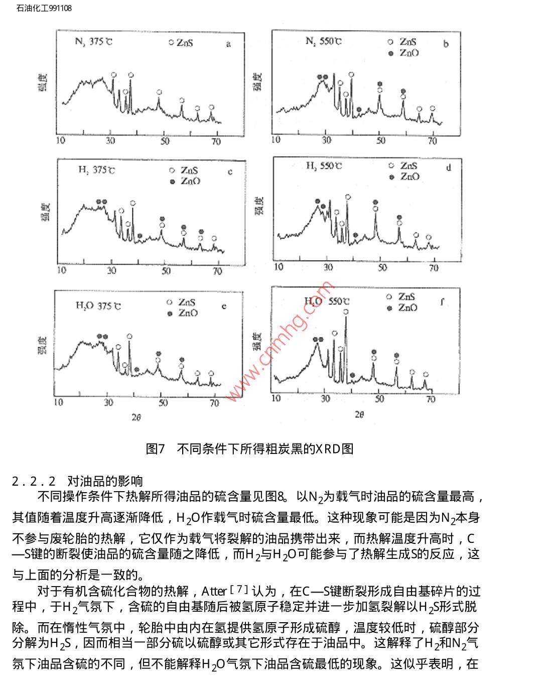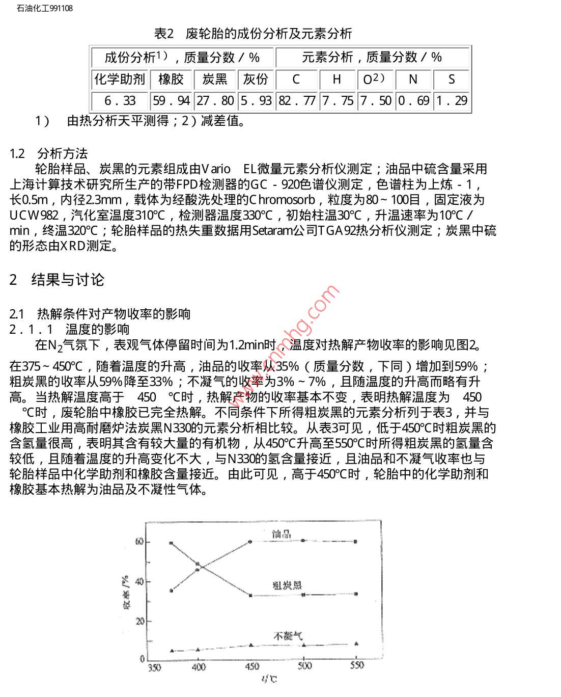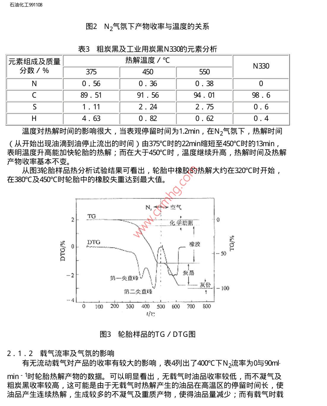 石油化工991108舊石油化工D解知5 PETROCHEMICAL TECHNOLOGY數(shù)化期刊1999年第28卷第11期Vol.28No.111999DIGITIZED PERIODICAL廢輪胎熱解過程及產(chǎn)物的研究董根全崔洪楊建麗程愛蓮劉振宇摘要采用管式反應(yīng)器對廢輪胎熱解過程進(jìn)行了研究??疾炝藦U輪胎在375~550°及在N2H2或H2◎0氣氛下的熱解過程,研究了熱解條件對產(chǎn)物收率和組成的影響。結(jié)果表明,熱解溫度高于450°C時輪胎熱解完全,油品收率高,粗炭黑中有機(jī)物含量很低。載氣對熱解產(chǎn)物收率影響較大。氣體停留時間對產(chǎn)物收率影響很小。不同的載氣氣氛對產(chǎn)物的質(zhì)量影響較大,在H2和N2氣氛下熱解所產(chǎn)生的粗炭黑含硫量最低,水蒸汽熱解產(chǎn)生的油品中的硫含量最低。關(guān)鍵詞廢輪胎熱解炭黑A Study on Pyrolysis of Used TireDONG Gen-quan, CUIHong, YANG Jian-li, CHENG Ai-lian and LIU Zhen-yu( Institute of Coal Chemistry, Chinese Academy of Sciences, Taiyuan 030001)Abstract Pyrolysis of used tirewas studied. the results indicate that tire can be completelypyrolized at temperatures higher than 450C. The use of a carrier gas increases the oil yield anddecreases gas and carbon black yield. The pyrolysis yields are independent of the chemicalnature of the carrier gas. the property of the carrier gas, how-ever, affects the productquality. Use of H2O results in relative low surfur content in oil and high surfur content incarbon blackKeywords: used tire, pyrolysis, carbon black輪胎一般由天然橡膠、合成橡膠、炭黑、化學(xué)助劑(如抗降解劑、硫化劑和溶劑油)等組成。由于廢輪胎難以降解,它的堆放既占用土地又對環(huán)境造成污染,因此廢輪胎的處理利用得到廣泛的重視。目前廢輪胎的處理利用包括:原型及改制使用,這主要用于輪胎翻新或制作再生膠粉,但隨著科技的發(fā)展,質(zhì)優(yōu)價廉的合成橡膠使輪胎翻新和再生膠的市場愈來愈小,用輪胎粉作配料生產(chǎn)道路瀝青也因為成本較高而無法大量使用;將廢輪胎和其它廢棄物一起焚燒以蒸汽或電力的形式回收能量,雖可以大量處理廢輪胎,但資源利用率不高。從烴類利用的角度講,廢輪胎的熱解可以得到高價值的產(chǎn)物,如油品、化學(xué)品、炭黑及高熱值的燃料氣,因此熱處理技術(shù)受到了日益的重視[1-5]。國外已建立一些熱處理裝置[1~3,8],如采用流化床或旋轉(zhuǎn)窯等,但這些過程所需反應(yīng)溫度較高,且以氣態(tài)產(chǎn)物為主。另外除了熱解反應(yīng)器的影響之外載氣種類及載氣流速對輪胎熱解產(chǎn)物的收率和產(chǎn)品組成也有較大的影響,特別是對硫石油化工991108在各產(chǎn)物中的分布的影響最大。這些數(shù)據(jù)對建立環(huán)境友好的廢輪胎熱解過程十分必要。本文在管式反應(yīng)器上考察了不同熱解條件如溫度、載氣種類、載氣停留時間等因素對廢輪胎熱解過程、產(chǎn)物收率及組成的影響,研究了產(chǎn)物中硫的分布,可為廢輪胎處理的工業(yè)化裝置提供基礎(chǔ)數(shù)據(jù)試驗部分1.1試驗系統(tǒng)及條件熱解系統(tǒng)包括管式加熱爐、管式反應(yīng)器和油品冷卻裝置,反應(yīng)器為內(nèi)徑30mm的石英玻璃管,溫度由DTC-10型溫度控制儀控制,如圖1所示。當(dāng)管式爐的溫度達(dá)到預(yù)定值并穩(wěn)定時,將裝有約5g廢輪胎樣品的管式反應(yīng)器置于管式爐中,同時通載氣(N2H2或H2),熱解揮發(fā)性產(chǎn)物由載氣帶入冷卻裝置,冷卻的液體收集于油品瓶內(nèi),不凝氣排空,殘留于反應(yīng)器中的固體為粗炭黑。試驗完成后將反應(yīng)器(包括粗炭黑)及油品收集瓶分別稱重,得到粗炭黑和油品的質(zhì)量。不凝氣的量由減差計算得岀。反應(yīng)器內(nèi)加熱爐溫度顯示沮度控制不凝氣放空加熱爐多管式反應(yīng)器冷卻①D氣流旗計輪胎科品油品閥門圖1熱解系統(tǒng)流程圖表1為試驗條件。試驗用輪胎樣品為某再生膠廠的混合廢輪胎,粉碎后粒度小于40目,其成份分析及元素分析見表2Nz和H2由氣瓶提供,水蒸汽由蒸汽發(fā)生器提供,并有保溫措施。表1試驗條件反應(yīng)溫度/%375,400,450,500,550載氣種類H2,N2,H20載氣流量/ ml- min0,90,180石油化工991108表2廢輪胎的成份分析及元素分析成份分析1),質(zhì)量分?jǐn)?shù)/%元素分析,質(zhì)量分?jǐn)?shù)/%化學(xué)助劑橡膠炭黑灰份「C「H02)N「56.3359.9427.805.9382.777.757.500.61.291)由熱分析天平測得;2)減差值。.2分析方法輪胎樣品、炭黑的元素組成由 Vario el微量元素分析儀測定;油品中硫含量采用上海計算技術(shù)研究所生產(chǎn)的帶FPD檢測器的GC-920色譜儀測定,色譜柱為上煉-1,長0.5m,內(nèi)徑2.3mm,載體為經(jīng)酸洗處理的 Chromosorb,粒度為80~100目,固定液為UCW982,汽化室溫度310°℃,檢測器溫度330°℃C,初始柱溫30°C,升溫速率為10°/min,終溫320°C;輪胎樣品的熱失重數(shù)據(jù)用 Setaraαm公司τGAΩ熱分析儀測定;炭黑中硫的形態(tài)由XRD測定。2結(jié)果與討論21熱解條件對產(chǎn)物收率的影響2.1.1溫度的影響在N2氣氛下,表觀氣體停留時間為1min時,溫度對熱解產(chǎn)物收率的影響見圖2在375~450°℃,隨著溫度的升高,油品的收率從35%(質(zhì)量分?jǐn)?shù),下同)增加到59%粗炭黑的收率從59%降至3%;不凝氣的收率為3%~7%,且隨溫度的升高而略有升高。當(dāng)熱解溫度高于450℃時,熱解產(chǎn)物的收率基本不變,表明熱解溫度為450°C時,廢輪胎中橡膠已完全熱解。不同條件下所得粗炭黑的