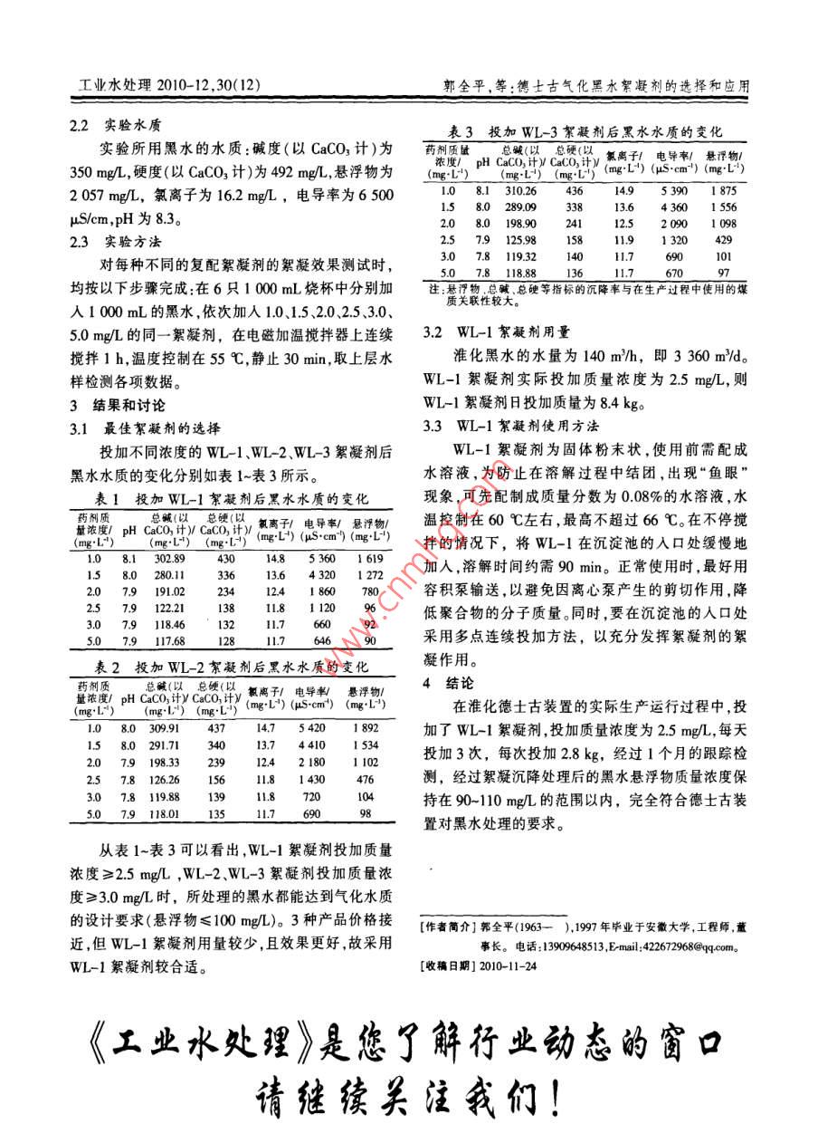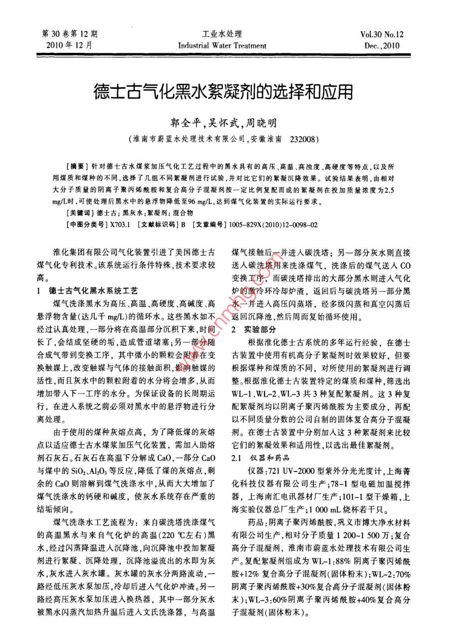 第30卷第12期工業(yè)水處理Vol.30 No.122010年12月Industrial W ater TreatmentDec. , 2010德士古氣化黑水絮凝劑的選擇和應(yīng)用郭全平,吳懷武,周曉明(淮南市蔚藍(lán)水處理技術(shù)有限公司,安徽淮南232008)[摘要]針對(duì)德士古水煤漿加壓氣化工藝過程中的黑水具有的高壓、高溫、高濁度高硬度等特點(diǎn),以及所用煤質(zhì)和煤種的不同,選擇了幾組不同絮凝劑進(jìn)行試驗(yàn),并對(duì)比它們的絮凝沉降效果。試驗(yàn)結(jié)果表明,由相對(duì).大分子質(zhì)量的陰離子聚丙烯酰胺和復(fù)合高分子混凝劑按一定比例復(fù)配而成的絮凝劑在投加質(zhì)量濃度為2.5mg/L時(shí),可使處理后黑水中的懸浮物降低至96mg/L,達(dá)到煤氣化裝置的實(shí)際運(yùn)行要求。[關(guān)鍵詞]德土古;黑灰水;絮凝劑;混合物[中圈分類號(hào)]X703.1 [文獻(xiàn)標(biāo)識(shí)碼]B [文章編號(hào)] 1005-829X(2010)12-0098-02淮化集團(tuán)有限公司氣化裝置引進(jìn)了美國(guó)德士古煤氣接觸后- 并進(jìn)入碳洗塔;另-部分灰水則直接煤氣化專利技術(shù)。該系統(tǒng)運(yùn)行條件特殊,技術(shù)要求較送人碳洗塔用來洗滌煤氣,洗滌后的煤氣送人CO變換工序,而碳洗塔排出的大部分黑水則進(jìn)入氣化1德士古氣化黑水系統(tǒng)工藝爐的激冷環(huán)冷卻爐渣,返回后與碳洗塔另一部分黑煤氣洗滌黑水為高壓高溫.高硬度、高堿度、高水一并進(jìn)入高壓閃蒸塔,經(jīng)多級(jí)閃蒸和真空閃蒸后,懸浮物含量(達(dá)幾千mg/L)的循環(huán)水。這些黑水如不返回沉降池,然后周而復(fù)始循環(huán)使用。經(jīng)過認(rèn)真處理,一部分將在高溫部分沉積下來,時(shí)間2實(shí)驗(yàn)部分長(zhǎng)了,會(huì)結(jié)成堅(jiān)硬的垢,造成管道堵塞;另一部分隨根據(jù)淮化德士古系統(tǒng)的多年運(yùn)行經(jīng)驗(yàn),在德士合成氣帶到變換工序,其中微小的顆粒會(huì)附著在變古裝置中使用有機(jī)高分子絮凝劑時(shí)效果較好,但要換觸媒上,改變觸媒與氣體的接觸面積,影響觸媒的根據(jù)煤種和煤質(zhì)的不同,對(duì)所使用的絮凝劑進(jìn)行調(diào)活性,而且灰水中的顆粒附著的水分將會(huì)增多,從而.整。根據(jù)淮化德士古裝置特定的煤質(zhì)和煤種,篩選出增加帶人下一工序的水分。為保證設(shè)備的長(zhǎng)周期運(yùn)WL-1 ,WL-2.WL-3共3種復(fù)配絮凝劑。這3種復(fù)行,在進(jìn)入系統(tǒng)之前必須對(duì)黑水中的懸浮物進(jìn)行分配絮凝劑均以陰離子聚丙烯酰胺為主要成分,再配離處理。以不同質(zhì)量分?jǐn)?shù)的公司自制的固體復(fù)合高分子混凝由于使用的煤種灰熔點(diǎn)高,為了降低煤的灰熔劑。在德士古裝置中分別加入這3種絮凝劑來比較點(diǎn)以適應(yīng)德士古水煤漿加壓氣化裝置,需加入助熔它們的絮凝效果和適用性,以選出最佳絮凝劑。劑石灰石。石灰石在高溫下分解成Ca0,一部分CaO2.1 儀器和藥品與煤中的SiO2、Al2O3等反應(yīng),降低了煤的灰熔點(diǎn),剩儀器:721 UV-2000型紫外分光光度計(jì),上海菁余的CaO則溶解到煤氣洗滌水中,從而大大增加了化科技儀器有限公司生產(chǎn);78-1型電磁加溫?cái)嚢杳簹庀礈焖拟}硬和堿度,使灰水系統(tǒng)存在嚴(yán)重的器,上海南匯電訊器材廠生產(chǎn);101-1型干燥箱,上結(jié)垢傾向。海實(shí)驗(yàn)儀器總廠生產(chǎn);1000 mL燒杯若干只。煤氣洗滌水工藝流程為:來自碳洗塔洗滌煤氣藥品:陰離子聚丙烯酰胺,鞏義市博大凈水材料的高溫黑水與來自氣化爐的高溫(220 C左右)黑.有限公司生產(chǎn),相對(duì)分子質(zhì)量1 200~1 500萬;復(fù)合水,經(jīng)過閃蒸降溫進(jìn)人沉降池,向沉降池中投加絮凝高分子混凝劑,淮南市蔚藍(lán)水處理技術(shù)有限公司生劑進(jìn)行絮凝、沉降處理,沉降池溢流出的水即為灰產(chǎn)。復(fù)配絮凝劑組成為WL-1:88%陰離子聚丙烯酰水,灰水進(jìn)入灰水罐?;宜薜幕宜謨陕妨鲃?dòng), -胺+12%復(fù)合高分子混凝劑(固體粉末);WL-2:70%路經(jīng)低壓灰水泵加壓,冷卻后進(jìn)入氣化爐沖渣。另一陰離子聚丙烯酰胺+30%復(fù)合高分子混凝劑(固體粉路經(jīng)高壓灰水泵加壓進(jìn)入換熱器,其中一部分灰水.末);WL-3:60%陰離子聚丙烯酰胺+40%復(fù)合高分被黑水閃蒸汽加熱升溫后進(jìn)入文氏洗滌器,與高溫子混凝劑(固體粉末)。工業(yè)水處理2010-12,30( 12)郭全平,等:德士古氣化黑水絮凝劑的選擇和應(yīng)用2.2實(shí)驗(yàn)水質(zhì)表3投加WL-3絮凝劑后黑水水質(zhì)的變化.實(shí)驗(yàn)所用黑水的水質(zhì):堿度(以CaCO,計(jì))為藥州質(zhì)量總城(以總硬(以,氯離子1電導(dǎo)懸浮物/350 mg/L,硬度(以CaCO3計(jì))為492 mg/L,懸浮物為濃度/、 pH CaCO,計(jì)) CaCO,計(jì))1(mg*L1) (uS.cm") (mgL)2 057 mg/L,氯離子為16.2 mg/L,電導(dǎo)率為6 5001.08.1 310.26436149 5390 1875.5 8.0 289.0933813.6 4360 1 556μS/cm,pH為8.3。2.08.0 198.9024112.5 2090 1 0982.3實(shí)驗(yàn)方 法2.5 7.9 125.9815811.91 3204293.0 7.8 119.321401.769001對(duì)每種不同的復(fù)配絮凝劑的絮凝效果測(cè)試時(shí),.0 7.8 118.8813611.767097均按以下步驟完成:在6只1 000 mL燒杯中分別加注:懸浮物總堿、總硬等指標(biāo)的沉降率與在生產(chǎn)過程中使用的煤質(zhì)關(guān)聯(lián)性較大。人1000 mL的黑水,依次加人1.0、1.5 、2.0、2.5.3.0、5.0 mg/L的同一絮凝劑,在電磁加溫?cái)嚢杵魃线B續(xù)3.2 WL-1 絮凝劑
