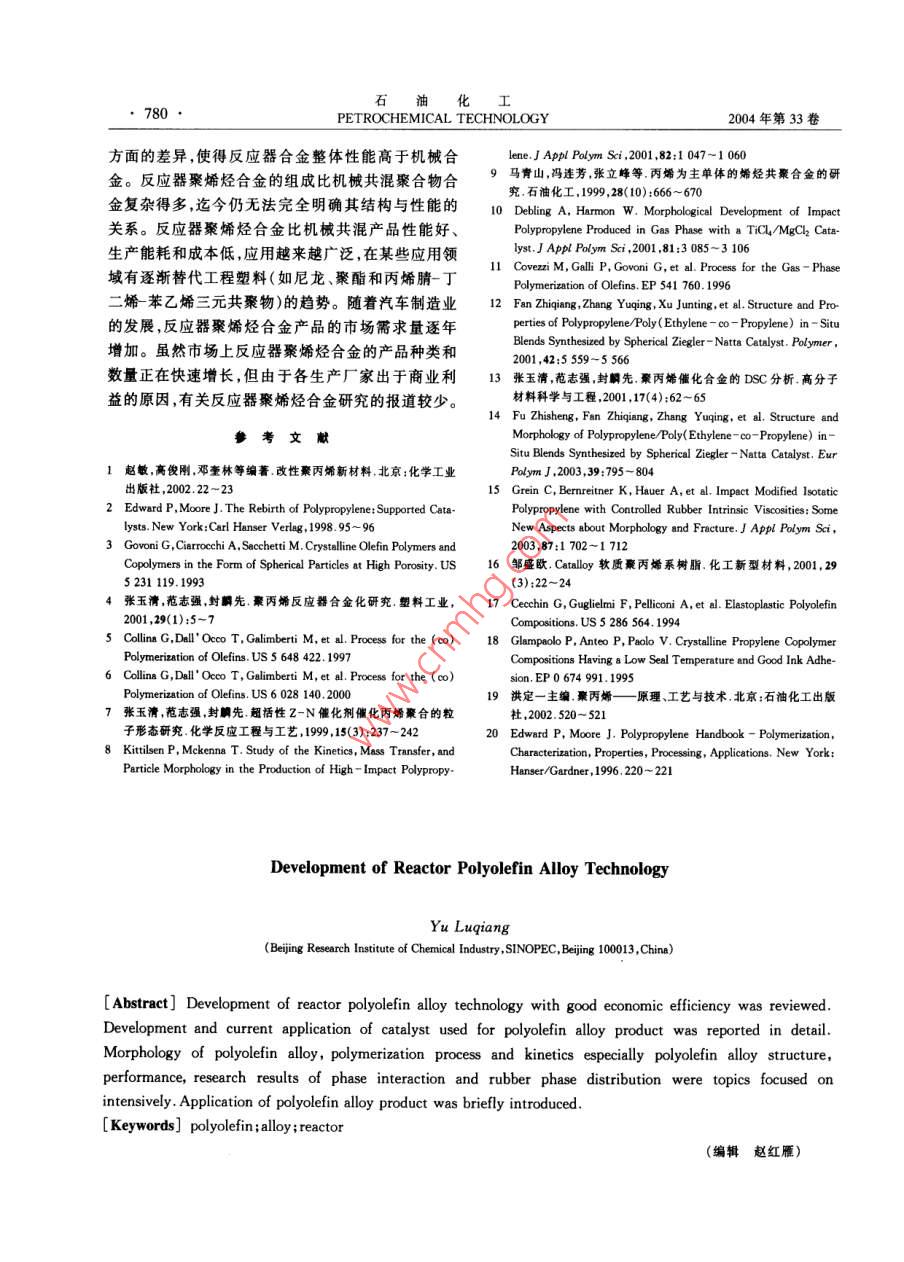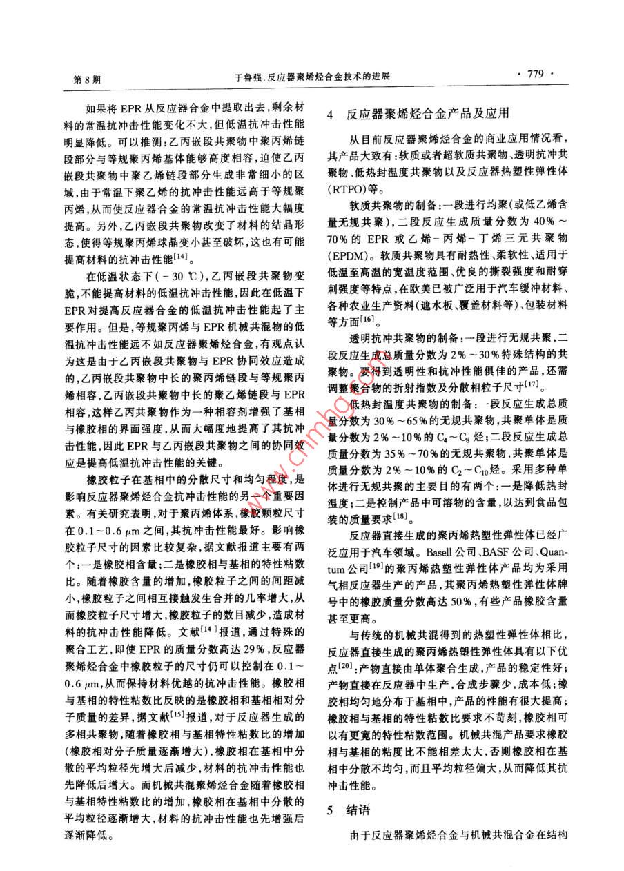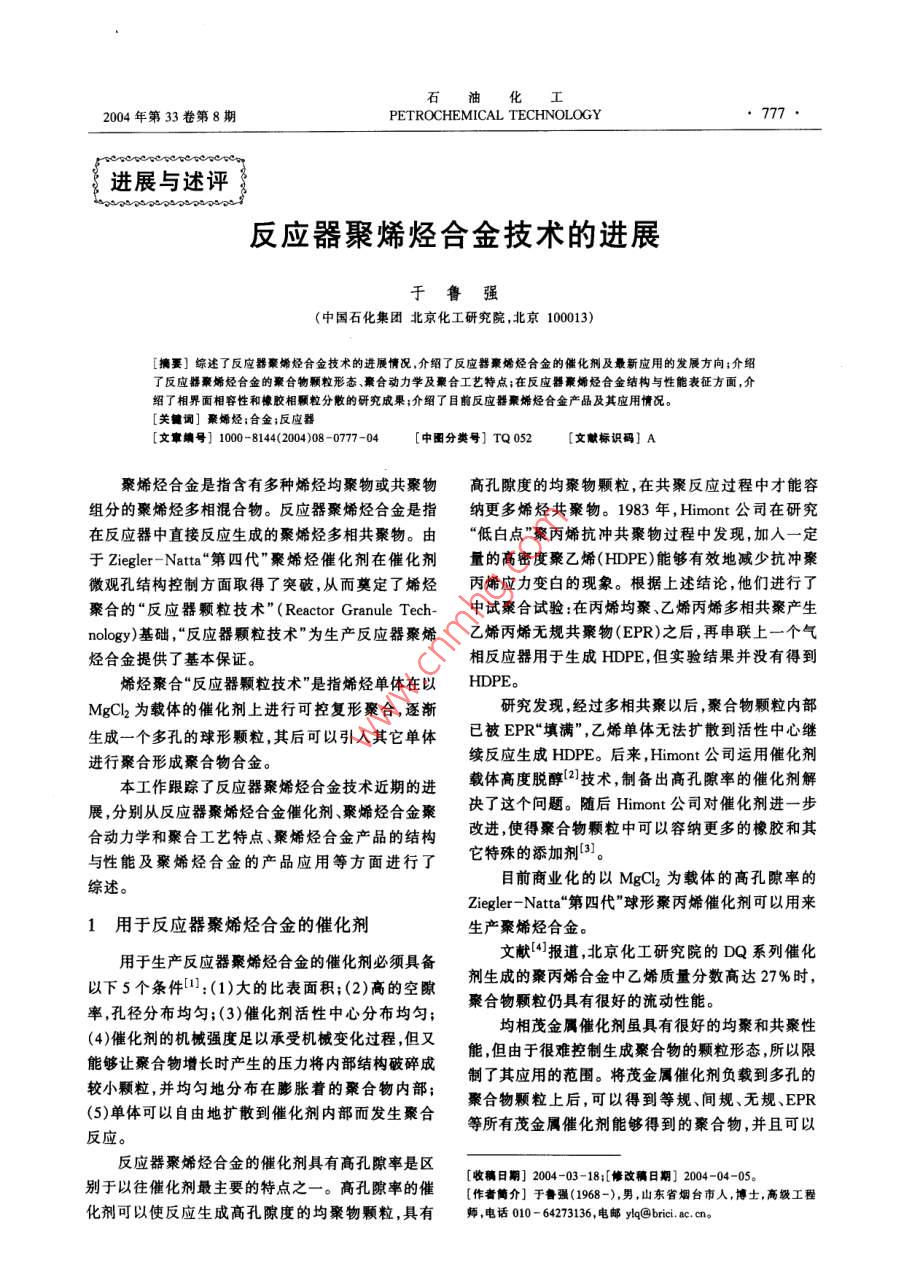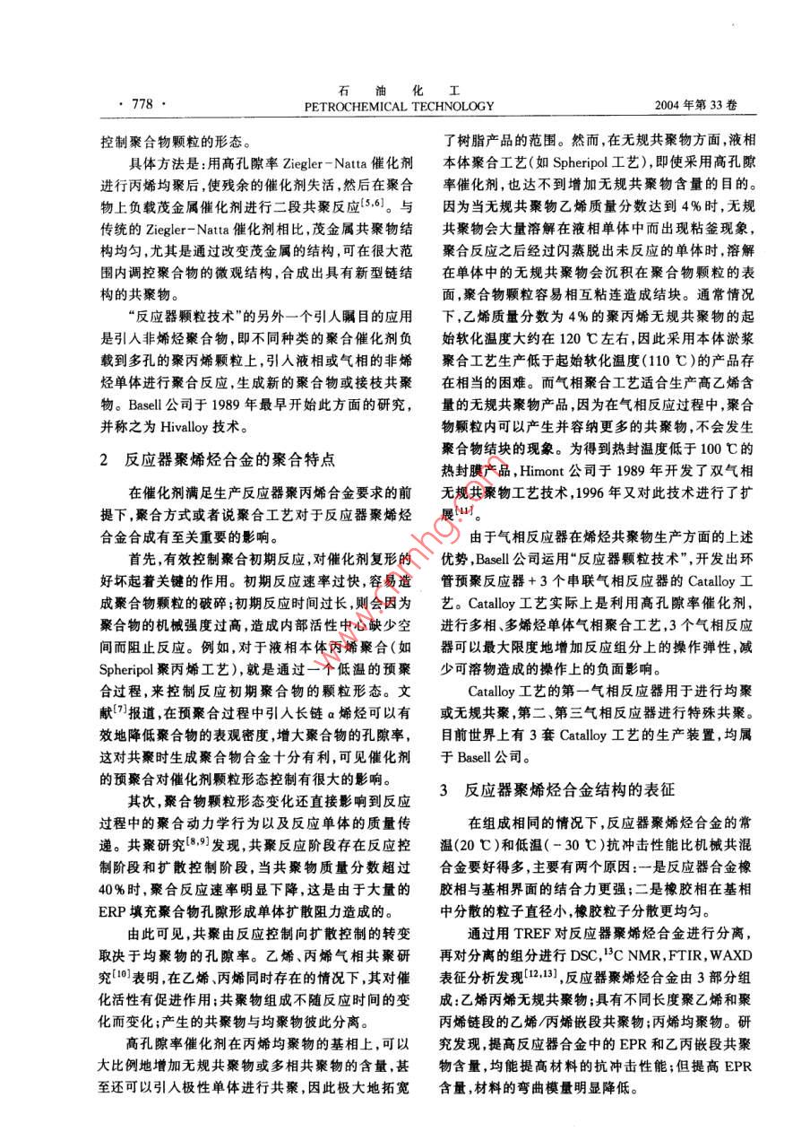 石油化I2004年第33卷第8期PETROCHEMICAL TECHNOLOGY, 777進(jìn)展與述評(píng)反應(yīng)器聚烯烴合金技術(shù)的進(jìn)展(中國(guó)石化集團(tuán)北京化工研究院,北京100013)[摘要]綜述了反應(yīng)器秦烯烴合金技術(shù)的進(jìn)展情況,介紹了反應(yīng)器聚烯烴合金的催化劑及最新應(yīng)用的發(fā)展方向;介紹了反應(yīng)器聚烯烴合金的聚合物顆粒形態(tài)、聚合動(dòng)力學(xué)及聚合工藝特點(diǎn);在反應(yīng)器聚烯烴合金結(jié)構(gòu)與性能表征方面,介紹了相界面相容性和橡膠相顆粒分敝的研究成果;介紹了目前反應(yīng)器聚烯烴合金產(chǎn)晶及其應(yīng)用情況。[關(guān)鍵調(diào)]聚烯烴;合金;反應(yīng)器[文章編號(hào)] 1004(000 -777-04[中圈分類號(hào)] TQ 052[文獻(xiàn)標(biāo)識(shí)碼] A聚烯烴合金是指含有多種烯烴均聚物或共聚物高孔隙度的均聚物顆粒,在共聚反應(yīng)過(guò)程中才能容.組分的聚烯烴多相混合物。反應(yīng)器聚烯烴合金是指納更多烯烴共聚物。1983 年, Himont公司在研究在反應(yīng)器中直接反應(yīng)生成的聚烯烴多相共聚物。由“低白點(diǎn)"聚丙烯抗沖共聚物過(guò)程中發(fā)現(xiàn),加入- -定于Ziegler-Natta“第四代”聚烯烴催化劑在催化劑量的高密度聚乙烯(HDPE)能夠有效地減少抗沖聚微觀孔結(jié)構(gòu)控制方面取得了突破,從而奠定了烯烴丙烯應(yīng)力變白的現(xiàn)象。根據(jù)上述結(jié)論,他們進(jìn)行了聚合的“反應(yīng)器顆粒技術(shù)" (Reactor Granule Tech-中試聚合試驗(yàn):在丙烯均聚乙烯丙烯多相共聚產(chǎn)生nology)基礎(chǔ),"反應(yīng)器顆粒技術(shù)"為生產(chǎn)反應(yīng)器聚烯乙烯丙烯無(wú)規(guī)共聚物(EPR)之后,再串聯(lián)上一個(gè)氣烴合金提供了基本保證。相反應(yīng)器用于生成HDPE,但實(shí)驗(yàn)結(jié)果并沒(méi)有得到.烯烴聚合“反應(yīng)器顆粒技術(shù)”是指烯烴單體在以HDPE。MgCl為載體的催化劑上進(jìn)行可控復(fù)形聚合,逐漸研究發(fā)現(xiàn),經(jīng)過(guò)多相共聚以后,聚合物顆粒內(nèi)部生成一個(gè)多孔的球形顆粒,其后可以引人其它單體已被EPR“填滿”,乙烯單體無(wú)法擴(kuò)散到活性中心繼進(jìn)行聚合形成聚合物合金。.續(xù)反應(yīng)生成HDPE。后來(lái),Himont公司運(yùn)用催化劑本工作跟蹤了反應(yīng)器聚烯烴合金技術(shù)近期的進(jìn)載體高度脫醇[21技術(shù),制備出高孔隙率的催化劑解展,分別從反應(yīng)器聚烯烴合金催化劑、聚烯烴合金聚決了這個(gè)問(wèn)題。隨后Himont公司對(duì)催化劑進(jìn)一步合動(dòng)力學(xué)和聚合工藝特點(diǎn)、聚烯烴合金產(chǎn)品的結(jié)構(gòu)改進(jìn),使得聚合物顆粒中可以容納更多的橡膠和其與性能及聚烯烴合金的產(chǎn)品應(yīng)用等方面進(jìn)行了它特殊的添加劑[3]。目前商業(yè)化的以MgCl為載體的高孔隙率的綜述。Ziegler- Natta“第四代”球形聚丙烯催化劑可以用來(lái)1用于反應(yīng)器聚烯烴合金的催化劑生產(chǎn)聚烯烴合金。用于生產(chǎn)反應(yīng)器聚烯烴合金的催化劑必須具備文獻(xiàn)[4]報(bào)道,北京化工研究院的DQ系列催化以下5個(gè)條件1]:(1)大的比表面積;(2)高的空隙劑生成的聚丙烯合金中乙烯質(zhì)量分?jǐn)?shù)高達(dá)27%時(shí),率,孔徑分布均勻;(3)催化劑活性中心分布均勻;聚合物顆粒仍具有很好的流動(dòng)性能。(4)催化劑的機(jī)械強(qiáng)度足以承受機(jī)械變化過(guò)程,但又均相茂金屬催化劑具有很好的均聚和共聚性能夠讓聚合物增長(zhǎng)時(shí)產(chǎn)生的壓力將內(nèi)部結(jié)構(gòu)破碎成.能,但由于很難控制生成聚合物的顆粒形態(tài),所以限較小顆粒,并均勻地分布在膨脹著的聚合物內(nèi)部;制了其應(yīng)用的范圍。將茂金屬催化劑負(fù)載到多孔的(5)單體可以自由地?cái)U(kuò)散到催化劑內(nèi)部而發(fā)生聚合聚合物顆粒上后,可以得到等規(guī)、間規(guī)、無(wú)規(guī)、EPR .等所有茂金屬催化劑能夠得到的聚合物,并且可以反應(yīng)。反應(yīng)器聚烯烴合金的催化劑具有高孔隙率是區(qū)別于以往催化劑最主要的特點(diǎn)之一。高孔隙率的催[收稿日期] 2004-03-18;[修改稿日期]2004 -04-05。[作者簡(jiǎn)介]于魯強(qiáng)(1968-),男,山東省煙臺(tái)市人,博士,高級(jí)工程化劑可以使反應(yīng)生成高孔隙度的均聚物顆粒,具有師,電話010- 64273136,電郵ylq@brici. ac. cn。石油化778●PETROCHEMICAL TECHNOLOGY2004年第33卷控制聚合物顆粒的形態(tài)。了樹(shù)脂產(chǎn)品的范圍。然而,在無(wú)規(guī)共聚物方面,液相.具體方法是:用高孔隙率Ziegler-Natta催化劑本體聚合工藝(如Spheripol工藝),即使采用高孔隙進(jìn)行丙烯均聚后,使殘余的催化劑失活,然后在聚合率催化劑,也達(dá)不到增加無(wú)規(guī)共聚物含量的目的。物上負(fù)載茂金屬催化劑進(jìn)行二段共聚反應(yīng)[5,6]。與因?yàn)楫?dāng)無(wú)規(guī)共聚物乙烯質(zhì)量分?jǐn)?shù)達(dá)到4%時(shí),無(wú)規(guī).傳統(tǒng)的Ziegler-Natta 催化劑相比,茂金屬共聚物結(jié)共聚物會(huì)大量溶解在液相單體中而出現(xiàn)粘釜現(xiàn)象,構(gòu)均勻,尤其是通過(guò)改變茂金屬的結(jié)構(gòu),可在很大范聚合反應(yīng)之后經(jīng)過(guò)閃蒸脫出未反應(yīng)的單體時(shí),溶解圍內(nèi)調(diào)控聚合物的微觀結(ji