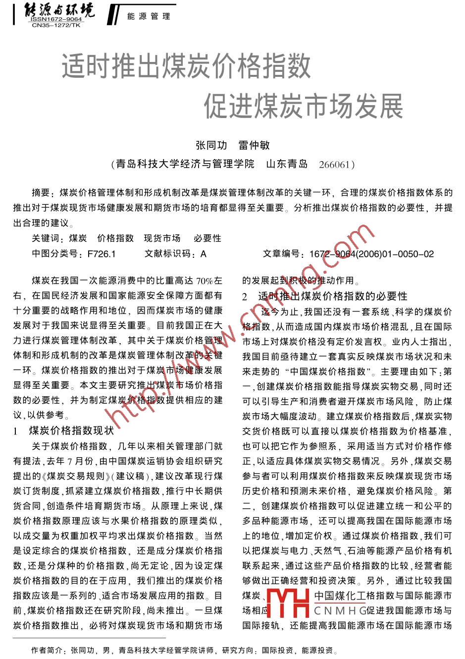 |能源與環(huán)境[能源管理CN35-1272/TK適時(shí)推出煤炭價(jià)格指數(shù)促進(jìn)煤炭市場發(fā)展張同功雷 仲敏(青島科技大學(xué)經(jīng)濟(jì)與管理學(xué)院山東青 島266061)摘要:煤炭價(jià)格管理體制和形成機(jī)制改革是煤炭管理體制改革的關(guān)鍵--環(huán),合理的煤炭價(jià)格指數(shù)體系的推出對于煤炭現(xiàn)貨市場健康發(fā)展和期貨市場的培育都顯得至關(guān)重要。分析推出煤炭價(jià)格指數(shù)的必要性,并提出合理的建議。關(guān)鍵詞:煤炭價(jià)格指數(shù)現(xiàn)貨市場必要性中圖分類號: F726.1文獻(xiàn)標(biāo)識碼: A文章編號: 1672- -9064(2006)01- -0050- -02煤炭在我國一次能源消費(fèi)中的比重高達(dá)70%左的發(fā)展起到積極的推動作用。右,在國民經(jīng)濟(jì)發(fā)展和國家能源安全保障方面都有2適時(shí)推出煤炭價(jià)格指數(shù)的必要性十分重要的戰(zhàn)略作用和地位,因而煤炭市場的健康迄今為止,我國還沒有一套系統(tǒng)、科學(xué)的煤炭價(jià)發(fā)展對于我國來說顯得至關(guān)重要。目前我國正在大格指數(shù),從而造成國內(nèi)煤炭市場價(jià)格混亂,且在國際力進(jìn)行煤炭管理體制改革,其中關(guān)于煤炭價(jià)格管理市場上對煤炭價(jià)格沒有定價(jià)發(fā)言權(quán)。業(yè)內(nèi)人士指出,體制和形成機(jī)制的改革是煤炭管理體制改革的關(guān)鍵我國目前亟待建立一套真實(shí)反映煤炭市場狀況和未--環(huán)。煤炭價(jià)格指數(shù)的推出對于煤炭市場健康發(fā)展來走勢的“中國煤炭價(jià)格指數(shù)”。主要理由如下:第顯得至關(guān)重要。本文主要研究推出煤炭市場價(jià)格指一,創(chuàng)建煤炭價(jià)格指數(shù)能指導(dǎo)煤炭實(shí)物交易,同時(shí)還數(shù)的必要性,并為制定煤炭價(jià)格指數(shù)提供相應(yīng)的建可以引導(dǎo)生產(chǎn)和消費(fèi)者避開煤炭市場風(fēng)險(xiǎn),防止煤議,以供參考。炭市場大幅度波動。建立煤炭價(jià)格指數(shù)后,煤炭實(shí)物1煤炭價(jià)格指數(shù)現(xiàn)狀交貨價(jià)格既可以直接以煤炭價(jià)格指數(shù)為價(jià)格基準(zhǔn),關(guān)于煤炭價(jià)格指數(shù),幾年以來相關(guān)管理部門就也可以把它作為參照系,采用適當(dāng)方式對價(jià)格作修有提法,去年7月份,由中國煤炭運(yùn)銷協(xié)會組織研究正,以適應(yīng)具體煤炭實(shí)物交易情況。另外,煤炭交易提出的《煤炭交易規(guī)則》(建議稿),建議改革現(xiàn)行煤參與者可以利用煤炭價(jià)格指數(shù)來反映煤炭現(xiàn)貨市場炭訂貨制度,抓緊建立煤炭價(jià)格指數(shù),推行中長期供歷史價(jià)格和預(yù)測未來價(jià)格,避免煤炭價(jià)格風(fēng)險(xiǎn)。第貨合同,創(chuàng)造條件培育期貨市場。從原理上來說,煤二,創(chuàng)建煤炭價(jià)格指數(shù)可以促進(jìn)建立統(tǒng)-和公平的炭價(jià)格指數(shù)原理應(yīng)該與水果價(jià)格指數(shù)的原理類似,多品種能源市場,還可以提高我國在國際能源市場以成交量為權(quán)重加權(quán)平均求出煤炭價(jià)格指數(shù)。當(dāng)然上的地位,增加定價(jià)權(quán)。通過煤炭價(jià)格指數(shù),我們可是設(shè)定綜合的煤炭價(jià)格指數(shù),還是成分煤炭價(jià)格指以把煤炭與電力、天然氣、石油等能源產(chǎn)品價(jià)格有機(jī)數(shù),還是分煤種的價(jià)格指數(shù),尚無定論,因?yàn)樵O(shè)定煤聯(lián)系起來,通過這些產(chǎn)品價(jià)格指數(shù)的比較,經(jīng)營者能炭價(jià)格指數(shù)的目的在于應(yīng)用,我們推出的煤炭價(jià)格夠做出正確經(jīng)營和投資決策。另外,通過比較我國指數(shù)應(yīng)該是一系列的適合市場發(fā)展應(yīng)用的指數(shù)。目煤炭、中國煤化工格指數(shù)與國際能源市前,煤炭價(jià)格指數(shù)還在研究階段,尚未推出。- -旦煤場相應(yīng)MYHCNMHG促進(jìn)我國能源市場與炭價(jià)格指數(shù)推出,必將對煤炭現(xiàn)貨市場和期貨市場國際接軌,還能提高我國能源市場在國際能源市場作者簡介:張同功,男,青島科技大學(xué)經(jīng)管學(xué)院講師,研究方向:國際投資,能源投資。2006.NO.1. 50能源管理T\ 能源卣環(huán)境|CN35- 1272/TK的地位。第三,創(chuàng)建煤炭價(jià)格指數(shù)使煤炭柜臺交易式??傊?,我們要根據(jù)需要確定合理的煤炭價(jià)格指變成可能,煤炭生產(chǎn)商、用戶、中間交易商可以采數(shù)體系并使之行之有效。取對沖貿(mào)易、浮動實(shí)物交易、地區(qū)價(jià)差和時(shí)間價(jià)差3.2 明確統(tǒng)計(jì)對象,準(zhǔn)確合理地確定權(quán)數(shù)保值交易等形式進(jìn)行柜臺交易。同時(shí),還為以后適“煤種類權(quán)數(shù)”、煤炭商品“品級項(xiàng)目權(quán)數(shù)”和時(shí)推出煤炭期貨作一些前期的準(zhǔn)備。再者,創(chuàng)建煤地區(qū)權(quán)重系數(shù)均可以根據(jù)實(shí)際銷、購情況調(diào)查統(tǒng)計(jì)炭價(jià)格指數(shù)還可以反映煤炭市場運(yùn)行狀況,是政府確定,這就涉及到了所調(diào)查統(tǒng)計(jì)的對象問題,因?yàn)閷?shí)行煤電聯(lián)動政策的基礎(chǔ),也是政府對煤炭、電力我國的煤礦企業(yè)數(shù)量多,小煤礦和小電廠也多,而行業(yè)進(jìn)行宏觀管理的重要手段。為解決煤炭和電力且都在