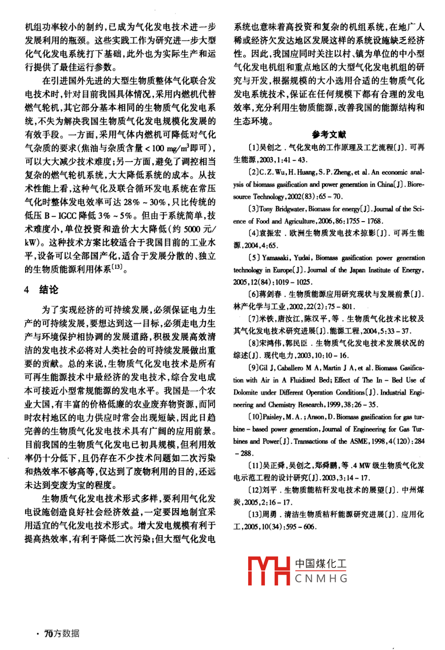 第25卷,總第141期節(jié)能技術(shù)》Vol 25 Sum. No 1412007年1月,第1期ENERGY CONSERVATION TECHNOLOGYJan.2007,No.1生物質(zhì)氣化發(fā)電技術(shù)的進展盛建菊(上海市貿(mào)易學(xué)校,上海20002)摘要:本文對各種生物質(zhì)氣化發(fā)電技術(shù)及該技術(shù)在國內(nèi)外的發(fā)展現(xiàn)狀做了綜述。目前我國的生物質(zhì)氣化發(fā)電僅僅是初具規(guī)模熱效率很低且存在不少技術(shù)問題。要利用氣化發(fā)電技術(shù)創(chuàng)造良妤經(jīng)濟效益,同時取得良好的環(huán)保效益,在解決技術(shù)性問題的同時,一定要因地制宜采用適宜的氣化發(fā)電技術(shù)形式。關(guān)鍵詞:生物質(zhì);氣化;發(fā)電中圖分類號:TK6文獻標識碼:A文章編號:1002-639(207)01-007-04rogress on Biomass Gasification and Power GenerationSHENG Jian- jv( Shanghai School of Trade, Shanghai 200092, China)Abstract: This paper reviews the biomass gasification and power generation( BGCG )technologies at home andabroad. Though this renewable energy power generation has been adopted in China, there exist the lower thermefficiency and the other technological problems. Based on the principle of better economic benefits and cleanerenviroments, China goverment should take such strategies, which makes it suitable to national nattduring the development of BGPG technologiesKey words: biomass; gasification; power generation段,基本原理是生物質(zhì)在缺氧狀態(tài)下熱解生成氣體1生物質(zhì)氣化發(fā)電技術(shù)流程簡介燃料,凈化后的氣體燃料燃燒驅(qū)動燃氣輪機或燃燒生物質(zhì)能主要是指儲存在生物質(zhì)內(nèi)部的能量,后產(chǎn)生蒸汽,驅(qū)動發(fā)電機發(fā)電。氣化發(fā)電過程包括可用于燃氣取暖、照明、發(fā)電以及化工領(lǐng)域。生物3個方面:一是生物質(zhì)氣化。經(jīng)處理的生物質(zhì)原料質(zhì)氣化發(fā)電技術(shù)是生物質(zhì)能利用的一種有效方式,由進料系統(tǒng)送進氣化爐內(nèi),揮發(fā)分(干基下為70%既有利于解決生物質(zhì)直接燃用熱效率不高的缺點,-80%)熱解釋放出揮發(fā)性氣體如CHn、H2、CO、又可以發(fā)揮燃氣發(fā)電設(shè)備緊湊而且污染少的優(yōu)點,CO2、焦油和水蒸氣產(chǎn)生的碳發(fā)生典型氣化反應(yīng)是生物質(zhì)能最有效最潔凈的利用方法之一。氣化發(fā)(水蒸氣+碳)和燃燒反應(yīng)(碳+氧氣)),通過燃燒電對改善我國以煤炭發(fā)電為主的電力生產(chǎn)結(jié)構(gòu)特別是對農(nóng)村地區(qū)因地制宜提供清潔電力具有十分重反應(yīng)釋放出的熱量促使生物質(zhì)熱解和碳的氣化反應(yīng)要的意義。進行凵中國煤化工氣體燃料;二是氣體目前生物質(zhì)氣化發(fā)電技術(shù)處于初步商業(yè)化階凈化CNMHG定的雜質(zhì),包括灰分、焦炭和焦油等,需經(jīng)過凈化系統(tǒng)把雜質(zhì)除去,以收稿日期2005-09-19修訂搞日期2006-11-05保證燃氣發(fā)電設(shè)備的正常運行;三是燃氣發(fā)電。凈作者簡介:盛建菊(196-),女教師化后的燃氣進入燃氣輪機或內(nèi)燃機的燃燒室燃燒驅(qū)動發(fā)電機發(fā)電,或者燃氣在鍋爐內(nèi)燃燒生產(chǎn)高溫高成分和熱值有變化時能夠保持穩(wěn)定的燃燒狀態(tài),排壓蒸汽,驅(qū)動蒸汽機帶動發(fā)電機發(fā)電。圖1為生物放物污染少而且對氣體要求不很嚴格,經(jīng)過旋風(fēng)分質(zhì)氣化發(fā)電工藝流程示意圖。離器除去雜質(zhì)和灰分后即可使用,不需冷卻。(2)氣化氣在燃氣輪機內(nèi)燃燒帶動發(fā)電機發(fā)電。燃氣輪機性生物質(zhì)原料必須進行相應(yīng)的改造,將熱值較低的氣化氣增壓到98×10~294×105Pa之間,否則發(fā)電效率較低。另外,燃氣輪機對氣化氣質(zhì)量要求高,并且需有較高除塵、除焦設(shè)備的自動化控制水平,所以單獨采用燃氣輪機的生物圖1生物質(zhì)氣化發(fā)電工藝流程示意圖質(zhì)氣化發(fā)電系統(tǒng)較少。(3)氣化氣在內(nèi)燃機內(nèi)燃燒帶動發(fā)電機發(fā)電。簡單的內(nèi)燃機組可單獨燃用低熱2生物質(zhì)氣化發(fā)電技術(shù)的分類值氣化氣,也可以氣化氣、油兩用,設(shè)備緊湊,系統(tǒng)簡單,因而應(yīng)用廣泛,而且效率較高。但該種方式對氣生物質(zhì)氣化發(fā)電可使用農(nóng)林廢棄物水生植物、體要求嚴格,氣化氣必須凈化并冷卻。油料植物、城市和工業(yè)有機廢棄物及動物糞便等生表1中國氣化發(fā)電系統(tǒng)主要參數(shù)對比物質(zhì)原料。原料來源廣泛發(fā)電設(shè)備多種,發(fā)電規(guī)模發(fā)電量(W)1000不等,促使氣化技術(shù)呈多樣化發(fā)展。從發(fā)電規(guī)模上氣化器下吸式固定床循環(huán)流化床分,生物質(zhì)氣化發(fā)電系統(tǒng)可分為小型、中型、大型三總效率(%)2750種。小型氣化發(fā)電系統(tǒng)所需的生物質(zhì)數(shù)量較少,簡耗電成本(元AW)0.35單靈活,多采用固定床氣化設(shè)備,主要用于農(nóng)村照明國內(nèi)已投入使用機組數(shù)約30或作為中小企業(yè)的自備發(fā)電機組,一般發(fā)電功率小有的發(fā)電廠聯(lián)用兩種發(fā)電設(shè)備,在燃氣輪機發(fā)于200kW。固定床氣化設(shè)備又可分為上吸式、下吸電的基礎(chǔ)上增加蒸汽鍋爐聯(lián)合循環(huán),充分利用余熱,式和開心層下式3種,其中下吸式爐型有利于減少提高生產(chǎn)強度稱為生物質(zhì)整體氣化聯(lián)合循環(huán)發(fā)電爐內(nèi)熱解生成的