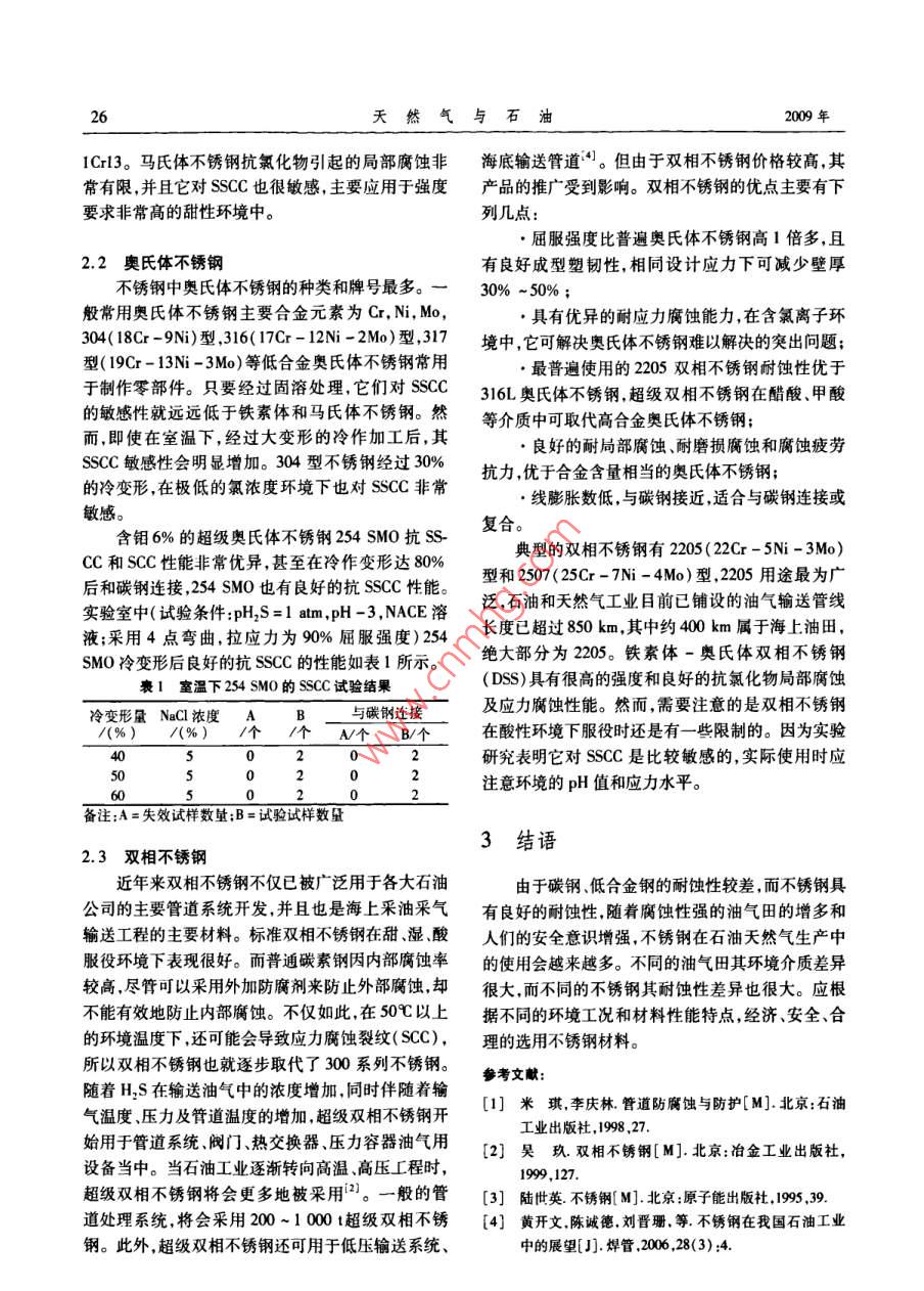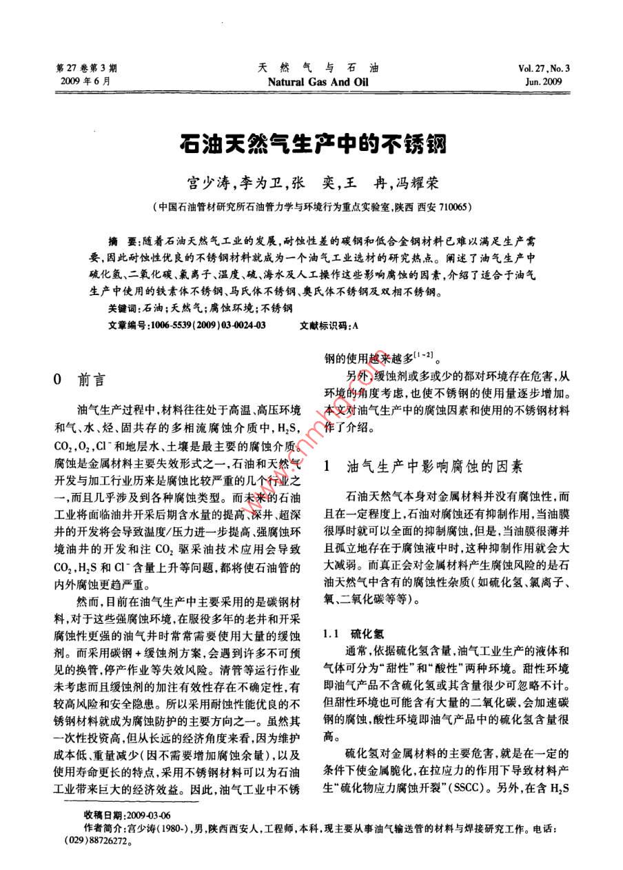 第27卷第3期天然氣與石油Vol 27. No. 32009年6月Natural Gas And OilJun.2009石油天然氣生產(chǎn)中的不銹鋼宮少濤,李為衛(wèi),張奕,王冉,馮耀榮(中國(guó)石油管材研究所石油管力學(xué)與環(huán)境行為重點(diǎn)實(shí)驗(yàn)室陜西西安71005)摘要:隨著石油天然氣工業(yè)的發(fā)展,耐蝕性差的碳鋼和低合金鋼材料已難以滿足生產(chǎn)需要,因此耐蝕性優(yōu)良的不銹鋼材料就成為一個(gè)油氣工業(yè)選材的研究熱點(diǎn)。闡述了油氣生產(chǎn)中硫化氫、二氧化碳、氣離子、溫度、硫、海水及人工操作這些影響腐蝕的因素,介紹了適合于油氣生產(chǎn)中使用的鐵素體不銹鋼、馬氏體不銹鋼、奧氏體不銹鋼及雙相不銹鋼。關(guān)鍵詞:石油;天然氣;腐蝕環(huán)境;不銹鋼文章編號(hào):10065539(2009)03002403文獻(xiàn)標(biāo)識(shí)碼:A鋼的使用越來(lái)越多120前言另外,緩蝕劑或多或少的都對(duì)環(huán)境存在危害,從環(huán)境的角度考慮,也使不銹鋼的使用量逐步增加。油氣生產(chǎn)過(guò)程中,材料往往處于高溫高壓環(huán)境本文對(duì)油氣生產(chǎn)中的腐蝕因素和使用的不銹鋼材料和氣、水、烴、固共存的多相流腐蝕介質(zhì)中,HS,作了介紹。CO2,O2,Cl^和地層水、土壤是最主要的腐蝕介質(zhì)腐蝕是金屬材料主要失效形式之一,石油和天然氣1油氣生產(chǎn)中影響腐蝕的因素開(kāi)發(fā)與加工行業(yè)歷來(lái)是腐蝕比較嚴(yán)重的幾個(gè)行業(yè)之而且?guī)缀跎婕暗礁鞣N腐蝕類型。而未來(lái)的石油石油天然氣本身對(duì)金屬材料并沒(méi)有腐蝕性,而工業(yè)將面臨油井開(kāi)采后期含水量的提高深井超深且在一定程度上,石油對(duì)腐蝕還有抑制作用,當(dāng)油膜井的開(kāi)發(fā)將會(huì)導(dǎo)致溫度/壓力進(jìn)一步提高、強(qiáng)腐蝕環(huán)很厚時(shí)就可以全面的抑制腐蝕但是,當(dāng)油膜很薄并境油井的開(kāi)發(fā)和注CO2驅(qū)采油技術(shù)應(yīng)用會(huì)導(dǎo)致且孤立地存在于腐蝕液中時(shí)這種抑制作用就會(huì)大CO2,H2S和C含量上升等問(wèn)題都將使石油管的大減弱。而真正會(huì)對(duì)金屬材料產(chǎn)生腐蝕風(fēng)險(xiǎn)的是石內(nèi)外腐蝕更趨嚴(yán)重。油天然氣中含有的腐蝕性雜質(zhì)(如硫化氫、氯離子、然而,目前在油氣生產(chǎn)中主要采用的是碳鋼材氧、二氧化碳等等)。料,對(duì)于這些強(qiáng)腐蝕環(huán)境,在服役多年的老井和開(kāi)采腐蝕性更強(qiáng)的油氣井時(shí)常常需要使用大量的緩蝕1.1硫化氫劑。而采用碳鋼+緩蝕劑方案,會(huì)遇到許多不可預(yù)通常,依據(jù)硫化氫含量,油氣工業(yè)生產(chǎn)的液體和見(jiàn)的換管停產(chǎn)作業(yè)等失效風(fēng)險(xiǎn)。清管等運(yùn)行作業(yè)氣體可分為“甜性”和“酸性”兩種環(huán)境。甜性環(huán)境未考慮而且緩蝕劑的加注有效性存在不確定性,有即油氣產(chǎn)品不含硫化氫或其含量很少可忽略不計(jì)。較高風(fēng)險(xiǎn)和安全隱患。所以采用耐蝕性能優(yōu)良的不但甜性環(huán)境也可能含有大量的二氧化碳,會(huì)加速碳銹鋼材料就成為腐蝕防護(hù)的主要方向之一。雖然其鋼的腐蝕酸性環(huán)境即油氣產(chǎn)品中的硫化氫含量很次性投資高但從長(zhǎng)遠(yuǎn)的經(jīng)濟(jì)角度來(lái)看,因?yàn)榫S護(hù)高。成本低、重量減少(因不需要增加腐蝕余量),以及硫化氫對(duì)金屬材料的主要危害,就是在一定的使用壽命更長(zhǎng)的特點(diǎn),采用不銹鋼材料可以為石油條件下使金屬脆化,在拉應(yīng)力的作用下導(dǎo)致材料產(chǎn)工業(yè)帶來(lái)巨大的經(jīng)濟(jì)效益。因此,油氣工業(yè)中不銹生“硫化物應(yīng)力腐蝕開(kāi)裂”(SSC)。另外,在含H2S收稿日期:20090306作者簡(jiǎn)介:宮少濤(1980-),男,陜西西安人,工程師,本科,現(xiàn)主要從事油氣輸送管的材料與焊接研究工作。電話:(029)88726272第27卷第3期宮少濤,等:石油天然氣生產(chǎn)中的不銹鋼的油氣腐蝕環(huán)境中,H2S腐蝕產(chǎn)生的氫原子通過(guò)金1.6人為因素屬表面,滲入基體內(nèi)部。氫原子在金屬內(nèi)部沿軋制為了提高效率或者出于鉆井初期操作的需要方向分布的非金屬夾雜物和品體缺陷等處聚集,并需要往井中加入大量的化學(xué)試劑。通常這些化學(xué)試結(jié)合形成氫分子,局部產(chǎn)生很大的內(nèi)壓力,致使金屬劑大多為酸性物質(zhì),而這些物質(zhì)的積累常常會(huì)增大材料產(chǎn)生氫致開(kāi)裂(HC)。但是,如果硫化氯的含滲透性,因此需要抑制這些酸性物質(zhì)。現(xiàn)在對(duì)于碳量很低它在環(huán)境中會(huì)起到一定的氧化作用,因此還鋼已經(jīng)有很多抑制酸性物質(zhì)的方法,但這些抑制方降低了如應(yīng)力腐蝕開(kāi)裂、點(diǎn)蝕以及縫隙腐蝕等氯離法卻不一定對(duì)不銹鋼有效。一般情況下推薦使用有子局部腐蝕的風(fēng)險(xiǎn)。實(shí)際上硫化氫分壓的極限臨界機(jī)酸,但注入劑量不宜過(guò)大。值是很難確定的,因?yàn)橹T如溫度pH值和氯離子濃為了維持油井中的壓力相對(duì)平衡,必須往油井度等這些因素都可能對(duì)其產(chǎn)生很大的影響。中注入液體,這些液體可能含有高濃度的氯化物或溴化物,而這些鹵化物原本就可以增加由其引起的1.2二氧化碳局部腐蝕的風(fēng)險(xiǎn)。在海上油氣生產(