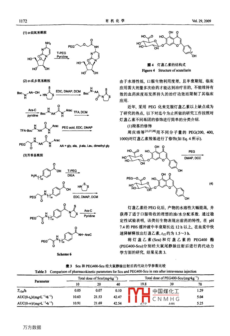 2009年第29卷有機化學(xué)vol.29,2009第8期,1167~1174Chinese Journal of Organic ChemistryNo8,116~1174綜述與進(jìn)展·藥物的聚乙二醇修飾研究進(jìn)展路娟硏劉清飛b羅國安*王義明(清華大學(xué)化學(xué)系北京10004)(清華大學(xué)醫(yī)學(xué)院北京100084摘要簡要介紹了聚乙二醇( polyethylene glycol,PG)的生理化學(xué)特性,藥物的聚乙二醇修飾的優(yōu)勢,詳細(xì)介紹了蛋白質(zhì)藥物和小分子藥物的聚乙二醇修飾技術(shù)及其在藥物研究中的應(yīng)用進(jìn)展,認(rèn)為藥物的聚乙二醇修飾技術(shù)通過改變藥物的分子結(jié)構(gòu),可以有效地改善藥物動力學(xué)和藥效等性質(zhì),增加注射藥物的臨床應(yīng)用范圍同時基于藥物的聚乙二醇修飾技術(shù)的優(yōu)勢和研究現(xiàn)狀,評述了藥物的聚乙二醇修飾技術(shù)的發(fā)展前景關(guān)鍵詞聚乙二醇修飾技術(shù);蛋白質(zhì);小分子藥物Advances in PEGylation of Drug ConjugatesLu, Juan" Liu, Qingfei Luo, Guoan*a Wang, YimingC institute of Biomedicine, Tsinghua University, Beijing 10084Abstract The current review presents the advances in PEGylation of drug conjugates based on plentifulliteratures up to date. The physiochemical properties of PEG [poly(ethylene glycol)] and advantages of Pe-Gylation for drug conjugates are introduced briefly. The technology of PEGylation of protein and small mo-lecular drug conjugates and application to drug investigation are presented in detail It is found that PeGylation technology can effectively improve the pharmacokinetic and pharmacodynamic properties of drugs byaltering the structures of drug conjugates. It also presents a method to extend the area of clinic application ofdrug conjugates. The foresight of development and investigation of PEGylation of drug conjugates is alsobrought forward based on the discussion of advantages and investigation status in quo of PEGylation techKeywords PEGylation; protein; small molecular drug聚乙二醇 polyethylene glycol, PEG)是一種pH中性,白,發(fā)現(xiàn)可以有效地改變其免疫性質(zhì).隨后研究者采用無毒,水溶性較高的親水聚合物,其重復(fù)單元為氧乙烯PEG修飾抗癌藥物天門冬酰胺酶,并將其應(yīng)用于臨床基,端基為兩個羥基,呈線性或支化鏈狀結(jié)構(gòu)PEG聚除此之外,研究者還成功地將PEG應(yīng)用于酰苷脫氨合物是迄今為止已知聚合物中蛋白和細(xì)胞吸收水平最酶、干擾素等蛋白質(zhì)藥物°明、喜樹堿、紫杉醇低的聚合物,由于PEG無毒及良好的生物相容性,阿糖胞苷1、燈盞乙素等小分子藥物的修飾.由于PEG已被FDA批準(zhǔn)可作為體內(nèi)注射藥用聚合物.藥物PEG修飾后的藥物分子量增加,超出腎臟過濾的分子量的PEG修飾是將活化的PEG通過化學(xué)方法偶聯(lián)到藥物范圍她地長物的半衰期,增強藥物的上的過程,即PEG化( PEGylation,PEG最早用于藥物修穩(wěn)定忄中國煤化工般均增加,藥物通飾,是1977年 Abuchowsk等用PEG來修飾牛血清蛋過改CNMHG力學(xué)和藥效等性質(zhì),.E-mail:luoga@mail.tsinghua.edu.cnReceived September 20, 2008; revised November 20, 2008; accepted January 8, 2009116有機化學(xué)VoL.29,2009提高了作用部位的血藥濃度1與SOD相連從而在SOD外圍形成了一個保護(hù)膜,使穩(wěn)PEG修飾后的藥物與修飾前相比,具有突出的優(yōu)定酶分子構(gòu)象的次級鏈得到了保護(hù),從而增強了對熱勢卟s:()藥物的溶解性提高;(2)半衰期延長;(3)最大酸、堿和酶破壞的耐受性,使其穩(wěn)定性明顯提高.血藥濃度降低,血藥濃度波動較小;(4)酶降解作用減少,姚文兵等回用三光氣和羥基琥珀酰亞胺對免疫原性和抗原性減少;(5)毒性降低.本文以蛋白質(zhì)以mPEG5000進(jìn)行活化,再對人干擾素a2b進(jìn)行了修飾研及喜樹堿、紫杉醇、阿糖胞苷和燈盞乙素四種小分子藥究,反應(yīng)方程式如Fq1所示物為例,對PEG修飾藥物的近三十年的研究進(jìn)展進(jìn)行綜述R-NPEG (1)PEG1PEG對蛋白質(zhì)藥物的修飾結(jié)果表明,修飾后其熱穩(wěn)定性和耐酸堿穩(wěn)定性有極在臨床上,蛋白質(zhì)類藥物作用位點專一、療效明確,大提高,體內(nèi)半衰期明顯延長他們2還以不同濃度但是在胃腸道內(nèi)極易被蛋白酶水解,血漿中半衰期較的PEG修飾后的人千擾素a2b和人干擾素a-2b對人肝短,抗原性較強,采用PEG修飾技術(shù)可以改變蛋白質(zhì)的癌細(xì)胞(SMMC-7721)、人紅白血病細(xì)胞(K562)、人宮頸生物化學(xué)特性,增加蛋白水溶性和穩(wěn)定性,已有大量文癌細(xì)胞(HeLa)、人鼻咽癌細(xì)胞(KB)和人胃癌細(xì)胞(BGC)獻(xiàn)報道8PEG化蛋白在保留天然蛋白質(zhì)的內(nèi)在生物學(xué)的生長均有不同程度的抑制作用進(jìn)行比較,發(fā)現(xiàn)PEG活性的同時,能有效克服蛋白質(zhì)類藥物在臨床應(yīng)用中的修飾后的人干擾素的抗腫瘤細(xì)胞增殖作用優(yōu)于干擾素些缺點,如可以提高血漿半衰期,增強生物利用度,12巰基的修飾降低蛋白質(zhì)的免疫原性,提高藥物療效及安全性等巰基在蛋白質(zhì)組成中通常含量不高,但是位置確為了使PEG在較溫和的反應(yīng)條件下與蛋白質(zhì)偶聯(lián),定,因而可針對那些對活性影響不大、呈游離狀態(tài)的巰需將PEG活化,活化后的PEG再與蛋白質(zhì)分子上的氨基進(jìn)行定量、定點修飾.目前可用于巰基修飾的活化基、巰基或羧基進(jìn)行偶聯(lián),以下按照蛋白質(zhì)分子上與PEG有以下幾種:(1)PEG鄰-吡啶-二硫醚(PEG-orhoPEG偶聯(lián)基團(tuán)的不同進(jìn)行分類介紹pyrid