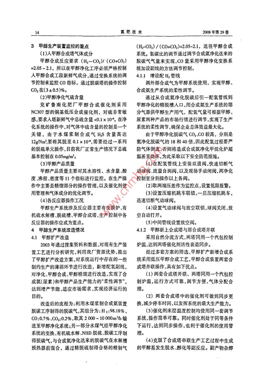 2008年第29卷第1期氮肥技術(shù)wesesesesccweseseweeeseseweveesesescseseteeeteseseee水煤漿制單醇裝置凈化系統(tǒng)運行總結(jié)葉盛芳季文普梁雪梅(兗礦魯南化肥廠滕州277527)oscsoaovsosssososssosososso4..Sos5MsMM摘要介紹了充礦魯南化肥廠德土古水煤氣制甲醇?xì)怏w凈化及甲醇合成、精餾裝置自運行以來的技改措施淺談甲醇生產(chǎn)的操作經(jīng)驗,并就操作中發(fā)生的幾起事故進(jìn)行了簡單點評關(guān)鍵詞甲醇擴(kuò)產(chǎn)部分變換汽氣比精脫硫低壓合成前言NHD脫硫脫碳技術(shù),該方法為物理吸收法,屬節(jié)甲醇合成的主反應(yīng)是CO+2H2=CHoH;能工藝凈化度高。CO2+3H2=CHOH+HO,我廠甲醇生產(chǎn)是以水煤(5)精脫硫系統(tǒng)采用國內(nèi)比較先進(jìn)的“夾心漿加壓氣化為龍頭,釆用國內(nèi)自主開發(fā)的低壓羰餅”精脫硫工藝,保證了凈化出口總硫含量<基合成技術(shù),利用銅基低壓合成催化劑,選用國01×106內(nèi)自主開發(fā)的絕熱管殼式低壓低溫合成反應(yīng)器,(6)甲醇合成塔采用國內(nèi)自主開發(fā)的絕熱管合成壓力53MPa,溫度為220~260℃,產(chǎn)品精餾殼式低壓低溫合成反應(yīng)器該反應(yīng)器床層溫度均采用國際上最先進(jìn)的三塔精餾工藝,能生產(chǎn)純勻,甲醇收率高催化劑用量少,壽命長,選擇性度>99996%的精甲醇。產(chǎn)品質(zhì)量達(dá)到美國US.好能量回收合理,反應(yīng)器生產(chǎn)強(qiáng)度高AA級精甲醇標(biāo)準(zhǔn)及滿足GB338-92國標(biāo)優(yōu)等品(7)采用國內(nèi)自主開發(fā)的三塔精餾工藝,生產(chǎn)精甲醇的要求。的產(chǎn)品質(zhì)量好,甲醇收率高,三廢排放量少。2000年6月兗礦魯南化肥廠10×10%a甲2工藝流程簡述醇系統(tǒng)正式投產(chǎn),2002年產(chǎn)量達(dá)到11x10t水煤漿通過德士古氣化爐氣化制得的水煤氣2003年完成了擴(kuò)產(chǎn)至13×10%a的技術(shù)改造,(P:275MPa,T:200℃,R=14),通過廢鍋換熱回收20042005年均達(dá)到135×10產(chǎn)量,在凈化、甲熱量將水氣比降為03左右進(jìn)入變換爐,在變換醇合成及甲醇精餾的生產(chǎn)操作控制中積累了較爐內(nèi)發(fā)生CO的部分變換反應(yīng)。降溫后進(jìn)入有機(jī)硫豐富的操作和管理經(jīng)驗。水解槽,將有機(jī)硫轉(zhuǎn)化為無機(jī)硫,然后進(jìn)入NHD1兗礦魯南化肥廠甲醇裝置的特點脫硫、脫碳系統(tǒng)脫除HS和CO2,最后進(jìn)行精脫硫,)原料氣采用德士古水煤漿加壓氣化制將總硫控制在<01×106,制得(H2-CO2氣,煤氣成分比較好(CO+CO2)=205的合格新鮮合成氣,送聯(lián)合壓縮(2)變換系統(tǒng)采用全氣量部分變換工藝通過機(jī)的壓縮段加壓到53MPa,與從循環(huán)段來的循環(huán)控制水氣比的方法來控制CO的變換率,從而達(dá)氣共同進(jìn)入甲醇合成塔制得甲醇含量93%-94%到符合甲醇合成要求的原料氣成分,控制方法簡的粗甲醇減壓到0MPa后送至精餾工序,剩余便操作容易。氣體進(jìn)人壓縮機(jī)的循環(huán)段循環(huán)使用。精餾工藝采(3)采用國內(nèi)最新研制開發(fā)的高溫抗硫酸鹽用國內(nèi)先進(jìn)的三塔精餾流程:預(yù)精餾塔→加壓化有機(jī)硫水解劑轉(zhuǎn)化有機(jī)硫。塔→常壓塔制得純度>9996%的精甲醇(4)脫硫、脫碳系統(tǒng)采用國內(nèi)自主開發(fā)的工藝流程框圖見圖1德士古水煤氣放空氣去氨系統(tǒng)[變換出脫礬→NH脫歌宀脫硫}醇合成匚塔精餾硫磺圖1甲醇裝置工藝流程框圖氮肥技術(shù)008年第29卷3甲醇生產(chǎn)裝置監(jiān)控的重點(H2-CO2)/(CO+CO2)=2.05-21,送往甲醇合成(1)入甲醇合成塔氣體成分系統(tǒng)。氫碳比的調(diào)節(jié)通過調(diào)節(jié)合成氨凈化送來的甲醇合成反應(yīng)要求(H2-CO2)(CO+CO2)脫碳?xì)鈿饬縼韺崿F(xiàn),CO量采用甲醇凈化變換系=205~21,所以在甲醇凈化工序必須嚴(yán)格控制統(tǒng)加設(shè)副線的方法調(diào)節(jié)控制。入甲醇合成工段新鮮氣成分,通過變換系統(tǒng)的調(diào)41增設(shè)配H2管線節(jié)控制來監(jiān)控CO指標(biāo),通過脫碳塔的操作控制調(diào)外部合成氣為甲醇系統(tǒng)使用,實現(xiàn)甲醇、CO2在(3±05)%。合成氨生產(chǎn)系統(tǒng)的柔性調(diào)節(jié)。(2)甲醇凈化氣硫含量通過從合成氨凈化脫碳后引一配氫管線到兗礦魯南化肥廠甲醇合成催化劑采用甲醇凈化的精脫槽入口,用合成氨生產(chǎn)系統(tǒng)的部NC307型的銅基低壓合成催化劑,對硫非常敏分氣源供甲醇生產(chǎn)用氣,配氫氣量可根據(jù)甲醇感,要求入塔新鮮氣中總硫含量<0.1¥×106在凈尿素兩種產(chǎn)品的市場行情進(jìn)行調(diào)節(jié),實現(xiàn)了生產(chǎn)化系統(tǒng)的操作中,對氣體中硫含量的控制是一個系統(tǒng)的柔性調(diào)節(jié)確保企業(yè)總體效益最大化。關(guān)鍵,由于水煤漿制合成氣HS含量高達(dá)由于甲醇凈化脫碳?xì)釩O2、CO較高,分別是12gNm,要將其脫至0.x10需要經(jīng)過一系列氨凈化脫碳?xì)獾?8和40倍因此配氫過程要嚴(yán)的脫硫單元操作,目前我廠正常生產(chǎn)情況下總硫防氣體倒流,否則將造成合成氨凈化甲烷化爐超基本控制在005mg/m3溫甚至燒壞,為此采取以下安全防范措施。(3)甲醇產(chǎn)品質(zhì)量(1)在配氫管線上安裝雙道閥快速切斷氣甲醇產(chǎn)品質(zhì)量主要對其水溶性、水含量酸動球閥流量自調(diào)閥,以及現(xiàn)場手動閘閥,兩凈化度、沸程、密度等11個指標(biāo)進(jìn)行監(jiān)控。
