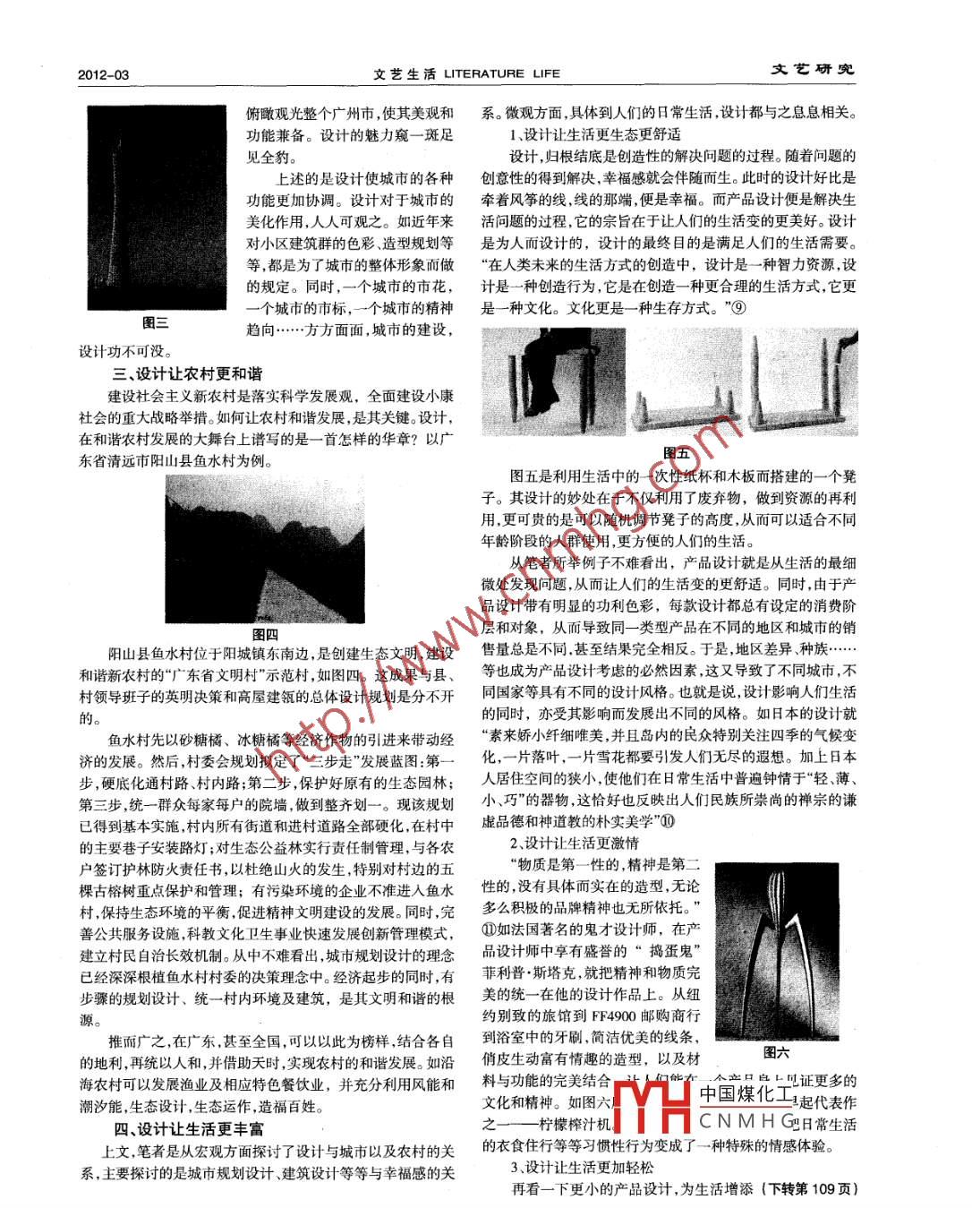 文藝研究文藝生活LITERATURE LIFE2012-03設(shè)計幸福,幸福設(shè)計一淺談設(shè)計與幸福的關(guān)系尹藝(湛江師范學(xué)院美術(shù)學(xué)院,廣東湛江524048)摘要:以幸福是什么為切入點,圍繞設(shè)計與幸福的關(guān)系而展開,重點闡述了設(shè)計與城市、農(nóng)村以及生活的關(guān)系,從而證明了我們可以通過“設(shè)計”來設(shè)計自已的幸福。用設(shè)計捕捉幸福,讓幸福暈染設(shè)計。幸福就會駐足當(dāng)下,生活就會更美好。關(guān)鍵詞:幸福;設(shè)計;產(chǎn)品;生活;文化中圖分類號:.J04文獻標識碼:A文章編號:1005- -5312(2012)08-0104- -02幸福是什么?詩人卡塔琳娜.曼斯費爾德說“仿佛人們突用設(shè)計捕捉幸福,讓幸福暈染設(shè)計。生活就會更美好。然間吞下了一片光燦燦的正午的太陽,突然蒸騰起來啦。"①二設(shè)計讓城市更美好這么美妙的感覺,這么漂浮不定的東西,可以被定格么?答案1城市規(guī)劃與設(shè)計是否定的。因為幸福是一種主觀的能動的感受,隨著各種因素城市的建設(shè)離開不系統(tǒng)整體的規(guī)劃。而這種整體的系統(tǒng)的改變而綜合出來的一種情愫 ,無法計劃和籌謀。但是,我們的規(guī)劃就是-種設(shè)計行為。城市是隨著經(jīng)濟的發(fā)展,以及階級可以通過“設(shè)計”來設(shè)計幸福。的出現(xiàn),而漸漸的與農(nóng)村剝離開來的一-種文明演化過程的必一、總述設(shè)計與幸福的關(guān)系然產(chǎn)物。城市的最初形成是自發(fā)無序的。但文明發(fā)展至今,隨1、何為設(shè)計?著人口密度的不斷增大,- -個沒有設(shè)計的城市是可怕的。“現(xiàn)代用法中的設(shè)計,其廣義是指制作-切實用物品和觀城市有川流不息的人口流動,有不計其數(shù)的交通工具,有賞物品的計劃安排,狹義用法特別在工業(yè)設(shè)計中是專指外觀星羅密布的建筑設(shè)施...大數(shù)量的東西并以批量的形式出的要求,它注重引人注目的外觀和流行的式樣,以便能增強影現(xiàn),如無統(tǒng)籌安排,唯- -的出路就是會走向消亡。一個城市的響市場的能力。即設(shè)計是指各種藝術(shù)表現(xiàn)因素在結(jié)構(gòu)上的組形象好壞,不僅跟其經(jīng)濟、政治文化發(fā)展密切相關(guān),更重要的織安排。"②同時,“設(shè)計首先是- -種為了使事物井然有序而進是其生活環(huán)境的質(zhì)量。營造好的城市形象,設(shè)計是必然手段。行的計劃。"③由此可見,設(shè)計帶有明顯的功能要求,它是具有利他性質(zhì)的一種藝術(shù)表達手段。而我們上文所說的通過“設(shè)計"來設(shè)計幸福,前者系名詞,指的是現(xiàn)代社會中的各種設(shè)計,如建筑設(shè)計、平面設(shè)計(包括廣告、海報設(shè)計等等)、產(chǎn)品設(shè)計(又名工.業(yè)設(shè)計,指現(xiàn)代各種電子產(chǎn)品、服裝設(shè)計動漫設(shè)計等等)。后者設(shè)計是動詞,取的就是“設(shè)計首先是一-種為了使事物井然有序而進行的計劃”的意思。圖一圖二自從20世紀50年代設(shè)計的制度化以來,設(shè)計無所不在。如圖一所示,是廣州為2010亞運會特意設(shè)計制定的亞運“從此,設(shè)計的必要性就毋庸置疑了;經(jīng)濟政策媒體的在場、村平面規(guī)劃圖。圖二是其局部3D效果圖。大到城市工業(yè)區(qū)、文化旅行注意和設(shè)計理論使設(shè)計成為人人都可接手的談?wù)撝魃顓^(qū)的劃分需要系統(tǒng)的設(shè)計,小到公路紅綠燈的設(shè)置,小區(qū)題?!雹荛g每幢房子間的間距,都市需要設(shè)計的。而設(shè)計的目的就在于2、何為幸福?在環(huán)保觀念的影響下,發(fā)揮現(xiàn)代設(shè)計師應(yīng)有的良知和責(zé)任,讓“幸福就是合乎道德行為的活動"⑤哲學(xué)家亞里士多德這城市的發(fā)展不再以自然的損耗為代價。誠如著名設(shè)計師武斌樣說。所言“設(shè)計師在設(shè)計中表達現(xiàn)代與傳統(tǒng)的統(tǒng)- -. 設(shè)計與生產(chǎn)地“富貴壽考等為福”中國權(quán)威書籍<詞源>如實說。調(diào)和,設(shè)產(chǎn)與消費的默契,生活與生態(tài)的和諧的同時,還需經(jīng)幸福的定義感觀如此之多,“不幸的是幸福的概念是如常提醒自己:我的設(shè)計會不會減少人類帶給環(huán)境的壓力,能否此模糊,以至雖然人人都在想得到它,但是,卻誰也不能對自保護自然資源,能否拋棄不切實際的設(shè)計,是否能用少量能源已所決定追求或選擇的東西,說得清楚明白,條理-一貫。 "⑥而發(fā)揮更大的功能們]是否能保護非再生.......古往今來,從哲學(xué)界到金融界到教育界,對幸福的定義層2、城市建中國煤化工,,是素有廣州小出不窮,舉不勝舉?!靶腋J莻€深刻而復(fù)雜的多元概念。直接地再把眼光書YHCNMH G說,幸福是人生重大的快樂;而從根本上說幸福則是人生重大蠻腰之稱的海心轉(zhuǎn)示功能與-體,需要和欲望得到滿足的心理體驗,是人生重大目的得到實現(xiàn)高達600 m,已成為世界第-高塔。并人選中國世界紀錄協(xié)會的心理體驗,最終是達到生存和發(fā)展的某種完滿的心理體世界最高塔。小蠻腰本身作為一個絕好的建筑設(shè)計不僅美化驗。"⑦了廣州這周城市,同時因其高度的優(yōu)勢,便于發(fā)射各種信號和04.2012-03文藝生活LITERATURE LIFE文藝研究俯瞰觀光整個廣州市使其美觀和系 。微觀方面,具體到人們的日常
