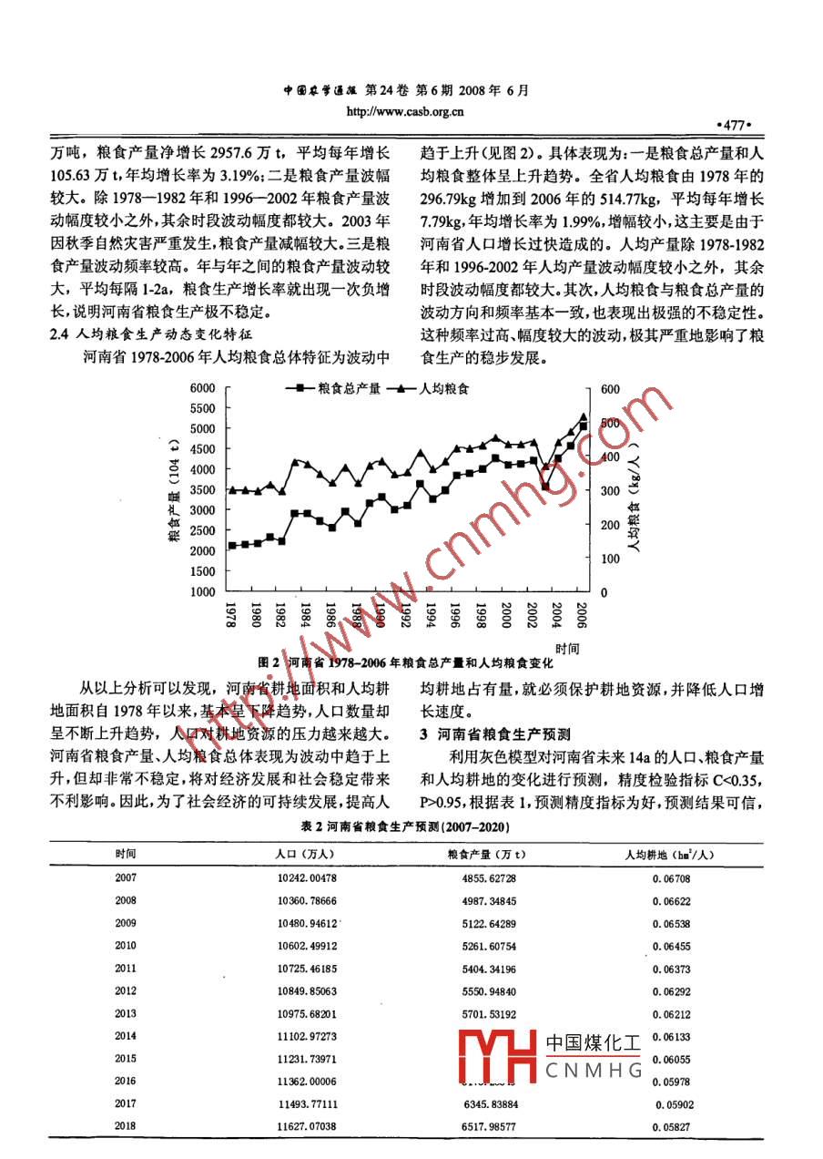 中國農(nóng)學(xué)通報第24卷第6期2008年6月htp://ww.casb.org.cn基于灰色理論的河南省糧食生產(chǎn)預(yù)測賀振,賀俊平(商丘師范學(xué)院環(huán)境與規(guī)劃系,商丘476000)摘要:糧食生產(chǎn)的變化受很多因素的影響,其具有灰色系統(tǒng)的特征,可以應(yīng)用灰色理論對其進行預(yù)測。基于河南省1978-2006 年的糧食生產(chǎn)的相關(guān)數(shù)據(jù),分析了糧食生產(chǎn)、人口、耕地的變化特征,并利用灰色理論對河南省未來14年內(nèi)糧食產(chǎn)量、人口和人均耕地進行了預(yù)測研究,預(yù)測精度較高。結(jié)果表明,河南省未來幾年內(nèi),人口數(shù)量和糧食產(chǎn)量呈不斷上升趨勢,但人均耕地面積卻呈不斷下降趨勢。根據(jù)預(yù)測結(jié)果,提出了相對應(yīng)保護耕地,提高糧食產(chǎn)量的對策,為政府部門制定政策提供科學(xué)依據(jù)。關(guān)鍵詞:灰色理論;糧食生產(chǎn);預(yù)測;河南省中圖分類號:F062.1文獻標(biāo)識碼:AGrain Production Forecast of Henan Province Based on Gray System TheoryHe Zhen, He Junping(Enwironment and panning department, ShangQiu normal uiersiy, ShangQiu 476000Abstract: Grain production is affected by many factors with the characteristics of gray system, forecasted bygray system theory. The paper analyses the change of the grain production, population and arable land, andforecasts their amounts in the fllowing fouteen years based on the relate data from 1978 to 2006 in Henanprovince. The results show the population and grain production will meet a rising trend, but the per capitaarea of arable land has an opposite trend within the next few years. At last, the paper puts forward to somescientifie advice for govermment to protect the arable land, increase the grain production.Key words: gray eystem theory, grain production, forecast, Henan province糧食生產(chǎn)與耕地面積的變化愛到諸多因素的影析研究了河南省糧食生產(chǎn)發(fā)展趨勢,可達到較高的預(yù)響,如氣候因素、政策導(dǎo)向等,其中有些因素可以確定,測精度。有些因素難以量化。即系統(tǒng)的部分信息已知,部分信息1.1 GM(1,1)模型建立未知。而灰色系統(tǒng)理論以“部分信息已知,部分信息未(1)建立數(shù)據(jù)序列如,共有n個觀測值x=(x%(1),知”的“小樣本”的不確定系統(tǒng)為研究對象叫。因此,可x02(),3(),.,.(x)).以將糧食生產(chǎn)和耕地面積預(yù)測問題作為灰色系統(tǒng)問題(2)對xO()做累加可得到新數(shù)列x(i),其元素為:來研究。筆者主要研究了河南省耕地資源和糧食生產(chǎn)x()= M=mMm,12,3..-n,對數(shù)列呵建立預(yù)測模型的動態(tài)變化特征,并利用灰色預(yù)測模型對未來河南省糧食生產(chǎn)、人口與人均耕地面積進行了預(yù)測,為政府部的白化形式方程,即GM(1, 1)模型方程: d." +ax:=u,門統(tǒng)籌安排,制定相應(yīng)對策提供了科學(xué)依據(jù)?!眃t1研究方法式中a稱為發(fā)展灰數(shù),u稱為內(nèi)生控制灰數(shù)。筆者主要采用灰色理論中的GM(1, 1)模型45,以(3)設(shè)a為待估參數(shù)向量a=“,按最小二乘法求河南省統(tǒng)計年鑒相關(guān)數(shù)據(jù)為基礎(chǔ),利用DPS軟件,分lu」基金項目:2007年河南省政府決策研究招標(biāo)課趣“河南省糧食生產(chǎn)動態(tài)預(yù)測與土地質(zhì)中國煤化工項目“我省在中部六省中創(chuàng)新能力與優(yōu)勢研究0613011200);商丘師范學(xué)院人文地理重點建設(shè)學(xué)科"(2007):MYHCNMHG第一作者簡介:賀振,男, 1977年出生,山西忻州人,博士,研究方向為地理信息系統(tǒng)開發(fā)與應(yīng)用。通信地址:46000河南省商丘市文化中路298號商丘師范學(xué)院環(huán)境與規(guī)劃系辦公室. Tel:0370 -2592137,E mail:hezh9110126. com.收稿日期: 2008-05-04,修回日期:2008-05-16..Chinese Agricultural Science Bulletin Vol.24 No. 6 2008 Junehttp://www.casb.org.cn●476*解,得a=(B'B)"BY,式中:(4)對GM(1, 1)模型方程求解,得到其對應(yīng)的時間響應(yīng)函數(shù),即為CM(1, 1)預(yù)測模型的解: .一(x"2)+x:"(3)) 10(+1)=( *(1)-告}e*+些B=|立(*"(2)+:() 11.2模型精度檢驗指標(biāo)為了評定預(yù)測模型的精度,應(yīng)進行后驗差C及小- (*(2)+>x"(3) 1誤差概率P的檢驗。外推性好的預(yù)測,要求C值小,表明預(yù)測誤差離散程度小,且P值必須大,即預(yù)測誤差小的概率大,預(yù)測精度高。由概率統(tǒng)計方法將預(yù)測精度檢表1預(yù)測精度等級對照表預(yù)測精度等級好合格勉強不合格>0. 95>0.85>0.70≤0.?70《0.35<0. 45<0.50≥0.65驗分成4個等級,(見表1)。hm?,年均遞減0.29%。第2階段主要表現(xiàn)為耕地面積2河南省糧食生產(chǎn)與耕地資源動態(tài)變化特征增加階段(1997-2002 年)。這一階段耕地面積增加2.1耕地資源動態(tài)變化特征489.4千hm?,年均增長率為1.41%。第3階段主要表河南省自1978年以來,耕地面積總體呈現(xiàn)階段性現(xiàn)為耕地面積減少階段(2002-2004 年)。這一時間耕變化(見圖1).第1階段主要表現(xiàn)為耕地面積減少階地面積減少85.3千hm2,年均遞減0.59%。第4階段主段(1978- -1997 年)。這一時期耕地面積凈減383.9千要表現(xiàn)為耕地面積增長階段(2004-2006年)。 這一階11000一-人口+耕地面積-+人均耕地面積0.110.110000.0.099000.........0.08 380000.07的只富70000 m0.05¥60000.0450000.03時間圖1河南省1978 2006年耕地面積、人口、人均耕地面積變化段耕地面積增加24.9千hm?,年均增長0.17%。1.48%。第2階段主要表現(xiàn)為人均耕地面積增長階段2.2人均耕地動態(tài)