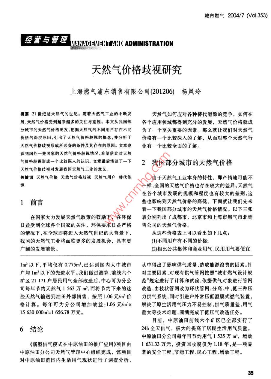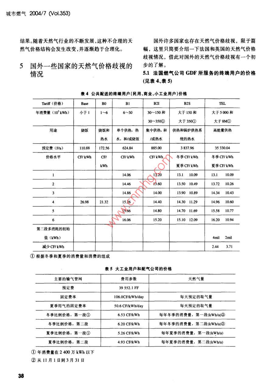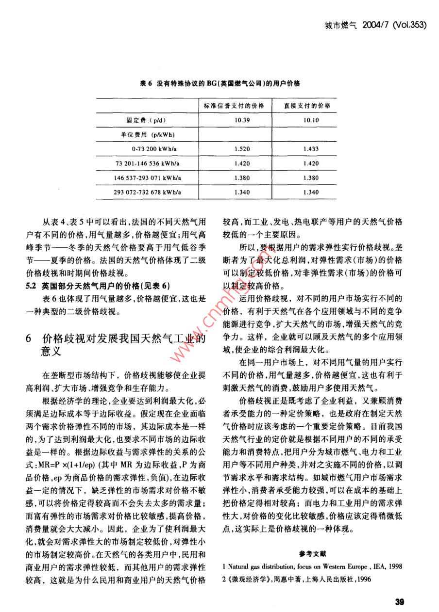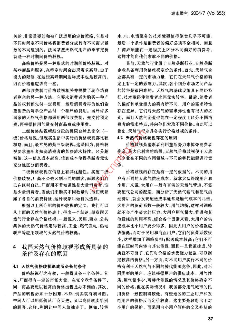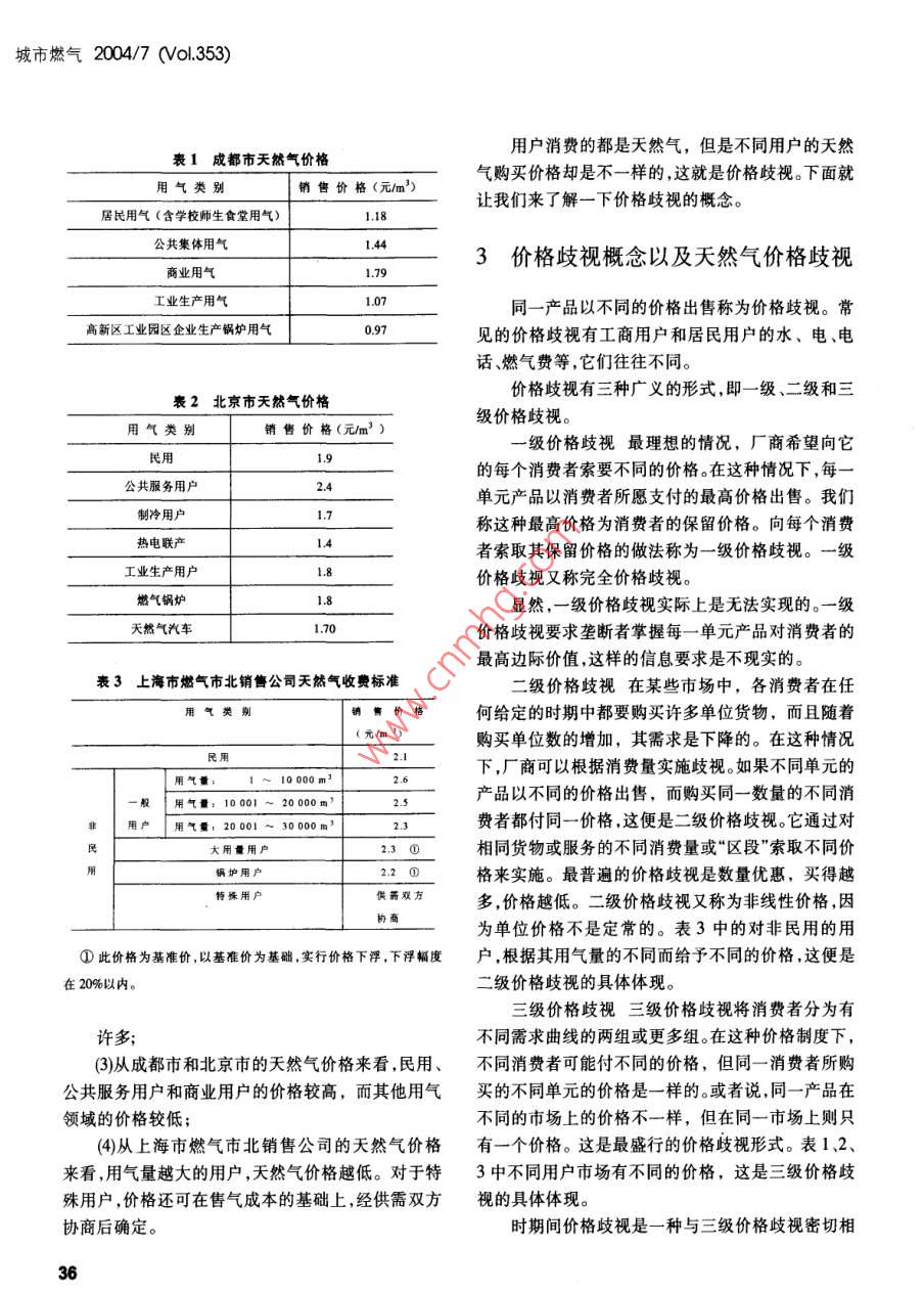 城市燃?xì)?004/7 (0l.353)經(jīng)營(yíng)與管理MANAHEMINhd 7AN問(wèn)ADMINISTRATION天然氣價(jià)格歧視研究上海燃?xì)馄謻|銷(xiāo)售有限公司(201206)楊 鳳玲摘要21世紀(jì)是天然氣的世紀(jì)。隨著天然氣工業(yè)的不斷發(fā)天然氣如何應(yīng)對(duì)各種替代能源的競(jìng)爭(zhēng),如何在展,天然氣價(jià)格受到越來(lái)越多的關(guān)注與重視。本文從我國(guó)部各個(gè)應(yīng)用領(lǐng)域都得到充分的發(fā)展,天然氣價(jià)格就成分城市的天然氣價(jià)格出發(fā),挖掘天然氣的不同用戶(hù)存在不同為了一個(gè)至關(guān)重要的因素。那么就讓我們對(duì)天然氣價(jià)格的深層原因,引出了天然氣價(jià)格歧視的概念,并分析了價(jià)格有-一個(gè)比較深人的了解,從而對(duì)整個(gè)天然氣行天然氣價(jià)格歧視形成所必備的條件及其存在的原因。文章也業(yè)有一個(gè)比較全面的了解。談到國(guó)外一些國(guó)家的天然氣價(jià)格歧視情況,希望借此對(duì)天然氣價(jià)格歧視形成一個(gè)比較深人的認(rèn)識(shí)。文章最后淺談了一下2我國(guó) 部分城市的天然氣價(jià)格天然氣價(jià)格歧視對(duì)發(fā)展我國(guó)天然氣工業(yè)的意義。關(guān)鍵詞天然氣價(jià)格天然氣價(jià)格歧視天然氣用戶(hù)替代能由于天然氣工業(yè)本身的特性,即產(chǎn)銷(xiāo)地可能不一樣,全國(guó)的天然氣價(jià)格也存在較大的差異。天然氣在各個(gè)城市發(fā)展的規(guī)模和程度也有較大的差別,這1前言些也影響到天然氣價(jià)格的高低。下面就讓我們先來(lái)看一下我國(guó)部分城市的天然氣價(jià)格情況。以下三張?jiān)趪?guó)家大力發(fā)展天然氣政策的鼓勵(lì)下,在環(huán)保表分別列出了成都市、北京市和上海市燃?xì)馐斜变N(xiāo)日益受到全球各個(gè)國(guó)家的關(guān)注,環(huán)保要求日益嚴(yán)格售公司的天然氣價(jià)格。.的情況下,在全球即將邁人天然氣世紀(jì)的大背景下,從這些價(jià)格表上可以看出如下幾點(diǎn):我國(guó)的天然氣工業(yè)將面臨更多的發(fā)展機(jī)會(huì),具有更(1)不同用戶(hù)有不同的價(jià)格;廣闊的發(fā)展前景。.(2)相比公共集體和商業(yè)用氣、民用用氣要便宜1m'以下,平均僅有0.775m',已達(dá)到國(guó)內(nèi)大中城市從中得出了影響供氣質(zhì)量,造成能源浪費(fèi)的因素。針戶(hù)均1m3以下的先進(jìn)水平。我們做過(guò)測(cè)算,前線六個(gè)對(duì)主要因素,對(duì)現(xiàn)有供氣管網(wǎng)按照“城市燃?xì)庠O(shè)計(jì)規(guī)礦區(qū)21 171戶(hù)居民用氣全部改造后,中心可為分公范"規(guī)定進(jìn)行了計(jì)算和試驗(yàn),依據(jù)供氣對(duì)象進(jìn)行管網(wǎng)司每年節(jié)約天然氣1563萬(wàn)m',而將節(jié)約下來(lái)的這改造,由枝狀管網(wǎng)改為環(huán)狀管網(wǎng),分高、中、低三種壓些天然氣輸送到油田外部銷(xiāo)售,按照1.06元/m價(jià)力供氣系統(tǒng),同時(shí)引進(jìn)戶(hù)外常壓低溫膜式燃?xì)庋b置,格計(jì)算。每年可為分公司增加效益:1.06元/m'x解決了原生活用氣壓力不易控制,供氣質(zhì)量差,用氣15 630 000m'=1 656.78 萬(wàn)元。量大等技術(shù)難題,圓滿(mǎn)完成了低壓氣改造任務(wù)。目前,中原油田前線六個(gè)礦區(qū)已全部實(shí)行了6結(jié)論24h全天供氣,極大的提高了居民生活用氣質(zhì)量。中原油田分公司每年可節(jié)約用氣1535萬(wàn)m',增效《新型供氣模式在中原油田的推廣應(yīng)用》項(xiàng)目由.1 631.33萬(wàn)元,投資回收期僅為1.18年,是- -項(xiàng)顯中原油田分公司天然氣管理中心組織完成,該項(xiàng)目著的安全工程、節(jié)能工程、民心工程、增效工程。對(duì)中原油田范圍內(nèi)生活用氣現(xiàn)狀進(jìn)行了調(diào)查分析,35城市燃?xì)?004/7 (ol.353)用戶(hù)消費(fèi)的都是天然氣,但是不同用戶(hù)的天然表1成都市天然氣價(jià)格氣購(gòu)買(mǎi)價(jià)格卻是不一樣的,這就是價(jià)格歧視。下面就用氣類(lèi)別銷(xiāo)售價(jià)格(元/m)讓我們來(lái)了解一下價(jià)格歧視的概念。居民用氣(含學(xué)校師生食堂用氣)1.18公共集體用氣1.443價(jià)格歧視概念以及天然氣價(jià)格歧視商業(yè)用氣1.79工業(yè)生產(chǎn)用氣1.07同一產(chǎn)品以不同的價(jià)格出售稱(chēng)為價(jià)格歧視。常高新區(qū)工業(yè)園區(qū)企業(yè)生產(chǎn)鍋爐用氣0.97見(jiàn)的價(jià)格歧視有工商用戶(hù)和居民用戶(hù)的水、電、電話(huà)、燃?xì)赓M(fèi)等,它們往往不同。價(jià)格歧視有三種廣義的形式,即一級(jí)、二級(jí)和三表2北京市天然氣價(jià)格級(jí)價(jià)格歧視。銷(xiāo)售價(jià)格(元/m')一級(jí)價(jià)格歧視最理想的情況,廠商希望向它民用.9的每個(gè)消費(fèi)者索要不同的價(jià)格。在這種情況下,每一公共服務(wù)用戶(hù).4單元產(chǎn)品以消費(fèi)者所愿支付的最高價(jià)格出售。我們制冷用戶(hù).7稱(chēng)這種最高價(jià)格為消費(fèi)者的保留價(jià)格。向每個(gè)消費(fèi)熱電聯(lián)產(chǎn)者索取其保留價(jià)格的做法稱(chēng)為一級(jí)價(jià)格歧視。一級(jí)工業(yè)生產(chǎn)用戶(hù).8價(jià)格歧視又稱(chēng)完全價(jià)格歧視。燃?xì)忮仩t顯然,一級(jí)價(jià)格歧視實(shí)際上是無(wú)法實(shí)現(xiàn)的。一級(jí)