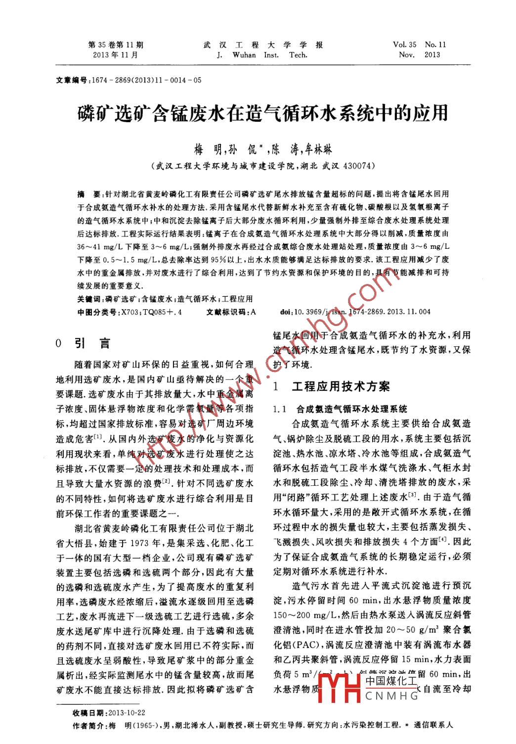 第35卷第11期武漢工程大學學報Vol. 35 No. 112013年11月,Wuhan Inst. Tech.Nov.2013文章編號:1674 - 2869(2013)11 - 0014 -05磷礦選礦含錳廢水在造氣循環(huán)水系統(tǒng)中的應用梅明,孫侃",陳濤,牟林琳(武漢工程大學環(huán)境與城市建設學院,湖北武漢430074)摘要:針對湖北省 黃麥嶺磷化工有限責任公司磷礦選礦尾水排放錳含量超標的問題,提出將含錳尾水回用于合成氨造氣循環(huán)水補水的處理方法.采用含錳尾水代替新鮮水補充至含有硫化物、碳酸根以及氫氧根離子的造氣循環(huán)水系統(tǒng)中;中和沉淀去除錳離子后大部分廢水循環(huán)利用,少量強制外排至綜合廢水處理系統(tǒng)處理后達標排放.工程實際運行結果表明:錳離子在合成氨造氣循環(huán)水處理系統(tǒng)中大部分得以削減,質量濃度由36~41 mg/L下降至3~6 mg/L;強制外排廢水再經(jīng)過合成氨綜合廢水處理站處理,質量濃度由3~6 mg/L下降至0.5~1.5mg/L,總去除率達到95%以上,出水水質能夠滿足達標排放的要求.該工程應用減少了廢水中的重金屬排放,并對廢水進行了綜合利用,達到了節(jié)約水資源和保護環(huán)境的目的,具有節(jié)能減排和可持續(xù)發(fā)展的重要意義.關鍵詞:磷礦選礦;含錳廢水;造氣循環(huán)水;工程應用中圄分類號:X703;TQ085+. 4文獻標識碼:Adoi: 10. 3969/j. issn. 1674-2869. 2013. 11. 004錳尾水回用于合成氨造氣循環(huán)水的補充水,利用)引言造氣循環(huán)水處理含錳尾水,既節(jié)約了水資源,又保.隨著國家對礦山環(huán)保的日益重視,如何合理護了環(huán)境.地利用選礦廢水,是國內礦山亟待解決的一個重1工程應用技術方案要課題.選礦廢水由于其排放量大,水中重金屬離子濃度、固體懸浮物濃度和化學需氧量等各項指1.1 合成氨造氣循環(huán)水處理系統(tǒng)標,均超過國家排放標準,容易對選礦廠周邊環(huán)境合成氨造氣循環(huán)水系統(tǒng)主要供給合成氨造造成危害中.從國內外選礦廢水的凈化與資源化氣.鍋爐除塵及脫硫工段的用水,系統(tǒng)主要包括沉利用現(xiàn)狀來看,單純對選礦廢水進行處理使之達淀池、熱水池、涼水塔、冷水池等組成,合成氨造氣標排放,不僅需要一定的處理技術和處理成本,而循環(huán)水包括造氣工段半水煤氣洗滌水、氣柜水封且導致大量水資源的浪費[2.針對不同選礦廢水水和脫硫工段除塵 、冷卻、清洗塔排放的廢水,采的不同特性,如何將選礦廢水進行綜合利用是目用“閉路”循環(huán)工藝處理上述廢水[3].由于造氣循前環(huán)保工作者的重要課題之一。環(huán)水循環(huán)量大,采用的是敞開式循環(huán)水系統(tǒng),在循湖北省黃麥嶺磷化工有限責任公司位于湖北環(huán)過程中水的損失量也較大,主要包括蒸發(fā)損失、省大悟縣,始建于1973年,是集采選、化肥、化工飛濺損失、風吹損失和排放損失4個方面印.因此于-體的國有大型一檔企業(yè),公司現(xiàn)有磷礦選礦為了保證合成氨造氣系統(tǒng)的長期穩(wěn)定運行,必須裝置主要包括選磷和選硫兩個部分,因此有大量定期對循環(huán)水系統(tǒng)進行補水.的選磷和選硫廢水產生,為了提高廢水的重復利造氣污水首先進入平流式沉淀池進行預沉用率,選磷廢水經(jīng)濃縮后,溢流水逐級回用至選磷淀,污水停留時間60 min, 出水懸浮物質量濃度.工藝,廢水再流進下一級選硫工藝進行選硫,多余150~ 200 mg/L,然后由熱水泵送人渦流反應斜管廢水送尾礦庫中進行沉降處理.由于選磷和選硫澄清池,同時在進水管投加20~50 g/m’聚合氯的藥劑不同,直接對選礦廢水回用已不符實際,而化鋁(PAC),渦流反應澄清池中裝有渦流布水器且選硫廢水呈弱酸性,導致尾礦漿中的部分重金和乙丙共聚斜管,渦流反應停留15 min,水力表面屬析出,經(jīng)實際監(jiān)測尾水中的錳含量較高,故而尾負荷5m*/t創(chuàng)|第資縮池停留60 min,出礦廢水不能直接達標排放.因此擬將磷礦選礦含水懸浮物質中國煤化工k自流至冷卻YHCNMH G收稿日期:2013-10-22作者簡介:梅明(1965-),男 ,湖北浠水人,副教授,碩士研究生導師.研究方向:水污染控制工程. *通信聯(lián)系人.第11期梅明,等:磷礦選礦 含錳廢水在造氣循環(huán)水系統(tǒng)中的應用塔,經(jīng)冷卻后大部分送造氣脫硫等工段循環(huán)利用,解,水質較清澈,只有錳離子(Mn2+)的含量較高.少量外排至合成氨綜合廢水處理站處理后排放.由于造氣循環(huán)水成堿性(OH- ),并含有S-和合成氨造氣循環(huán)水系統(tǒng)流程圖見圖1.CO?-,與Mn?+反應生成硫化錳(MnS)、碳酸錳(MnCO,)和氫氧化錳(Mn(OH)2),對Mn*+有沉脫硫工段|制淀作用,對酸性尾水起到中和作用,同時也降低了造氣工段甲流沉淀地熱水池鍋爐系統(tǒng)污泥回水熱水泵循環(huán)水中的S- ,減小對設備的腐蝕.主要反應方醫(yī)塵用水激場晾曬池+ 污泥程式為:|回用.↓Mn2+ +S- - +MnS↓;補充本廠冷水池]冷卻水涼水塔Mn2+ +CO3-→MnCO3↓;Mn2+ +20H~→Mn(OH)2↓(白色). .少量外排.谷成氨污承_ 達標排放.通過上述反應及絮凝劑輔助沉淀的作用,處理設施Mn2+能夠在該系統(tǒng)中得到大幅度地削減,沉淀池圈1合成氨造 氣循環(huán)水處理系統(tǒng)工藝流程圖中的含錳沉淀污泥由人工及時清理,運送至渣場Fig. 1 Synthetic ammonia gas making recycling堆存,保證循環(huán)水系統(tǒng)的安全運行.water system1.2 合成氨綜合廢水處理系統(tǒng)在合成氨造氣工序中,原料煤(C)和水蒸汽在實際生產過