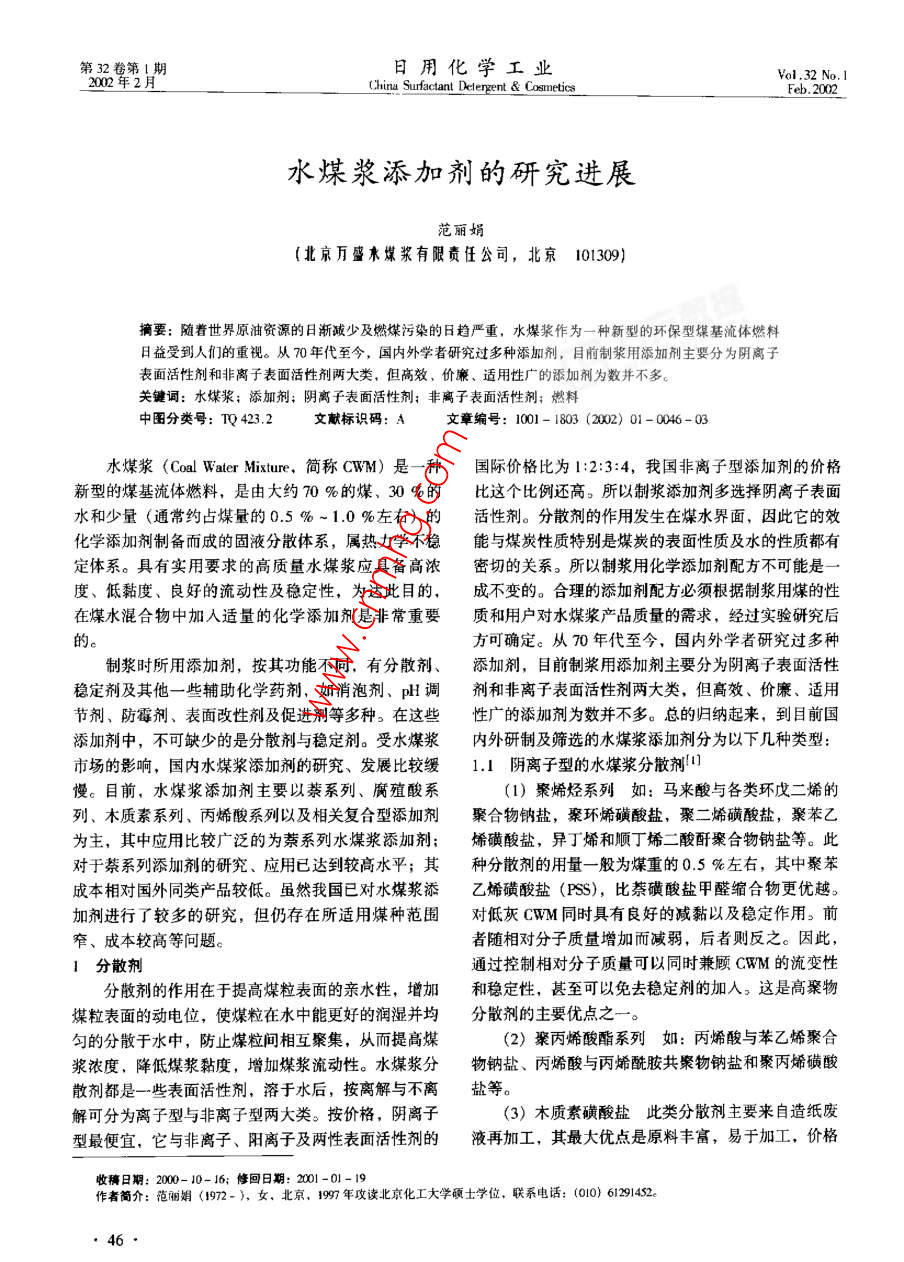 第32卷第1日用化學(xué)工業(yè)China Surfactant Detergent Cosmetics水煤漿添加劑的研究進(jìn)展范麗娟(北京萬盛木煤漿有限責(zé)任公司,北京101309)摘要:隨著世界原油資源的日漸減少及燃煤污染的日趨嚴(yán)重,水煤漿作為一種新型的環(huán)保型煤基流體燃料日益受到人們的重視。從70年代至今,國(guó)內(nèi)外學(xué)者研究過多種添加劑,目前制漿用添加劑主要分為陰離子表面活性劑和非離子表面活性劑兩大類,但高效,價(jià)廉、適用性廣的添加劑為數(shù)并不多關(guān)鍵詞:水煤漿;添加劑;陰離子表面活性劑;非離子表面活性劑;燃料中圖分類號(hào):TQ423.2文獻(xiàn)標(biāo)識(shí)碼:A文章編號(hào):1001-1803(2002)01-006-03水煤漿( Coal Water mixture,簡(jiǎn)稱CWM)是一種國(guó)際價(jià)格比為1:2:3:4,我國(guó)非離子型添加劑的價(jià)格新型的煤基流體燃料,是由大約70%的煤、30%的比這個(gè)比例還高。所以制漿添加劑多選擇陰離子表面水和少量(通常約占煤量的0.5%~1.0%左右)的活性劑。分散劑的作用發(fā)生在煤水界面,因此它的效化學(xué)添加劑制備而成的固液分散體系,屬熱力學(xué)不穩(wěn)能與煤炭性質(zhì)特別是煤炭的表面性質(zhì)及水的性質(zhì)都有定體系。具有實(shí)用要求的高質(zhì)量水煤漿應(yīng)具備高濃密切的關(guān)系。所以制漿用化學(xué)添加劑配方不可能是度、低黏度、良好的流動(dòng)性及穩(wěn)定性,為達(dá)此目的,成不變的。合理的添加劑配方必須根據(jù)制漿用煤的性在煤水混合物中加入適量的化學(xué)添加劑是非常重要質(zhì)和用戶對(duì)水煤漿產(chǎn)品質(zhì)量的需求,經(jīng)過實(shí)驗(yàn)研究后的方可確定。從70年代至今,國(guó)內(nèi)外學(xué)者研究過多種制漿時(shí)所用添加劑,按其功能不同,有分散劑、添加劑,目前制漿用添加劑主要分為陰離子表面活性穩(wěn)定劑及其他一些輔助化學(xué)藥劑,如消泡劑、pH調(diào)劑和非離子表面活性劑兩大類,但高效、價(jià)廉、適用節(jié)劑、防霉劑、表面改性劑及促進(jìn)劑等多種。在這些性廣的添加劑為數(shù)并不多??偟臍w納起來,到目前國(guó)添加劑中,不可缺少的是分散劑與穩(wěn)定劑。受水煤漿內(nèi)外研制及篩選的水煤漿添加劑分為以下幾種類型市場(chǎng)的影響,國(guó)內(nèi)水煤漿添加劑的研究、發(fā)展比較緩1.1陰離子型的水煤漿分散劑1慢。目前,水煤漿添加劑主要以萘系列、腐殖酸系(1)聚烯烴系列如:馬來酸與各類環(huán)戊二烯的列、木質(zhì)素系列、丙烯酸系列以及相關(guān)復(fù)合型添加劑聚合物鈉鹽,聚環(huán)烯磺酸鹽,聚二烯磺酸鹽,聚苯乙為主,其中應(yīng)用比較廣泛的為萘系列水煤漿添加劑;烯磺酸鹽,異丁烯和順丁烯二酸酐聚合物鈉鹽等。此對(duì)于蔡系列添加劑的研究、應(yīng)用已達(dá)到較高水平;其種分散劑的用量一般為煤重的0.5%左右,其中聚苯成本相對(duì)國(guó)外同類產(chǎn)品較低。雖然我國(guó)已對(duì)水煤漿添乙烯磺酸鹽(PS),比萘磺酸鹽甲醛縮合物更優(yōu)越。加劑進(jìn)行了較多的研究,但仍存在所適用煤種范圍對(duì)低灰CWM同時(shí)具有良好的減黏以及穩(wěn)定作用。前窄、成本較高等問題。者隨相對(duì)分子質(zhì)量增加而減弱,后者則反之。因此1分散劑通過控制相對(duì)分子質(zhì)量可以同時(shí)兼顧C(jī)WM的流變性分散劑的作用在于提高煤粒表面的親水性,增加和穩(wěn)定性,甚至可以免去穩(wěn)定劑的加入。這是高聚物煤粒表面的動(dòng)電位,使煤粒在水中能更好的潤(rùn)濕并均分散劑的主要優(yōu)點(diǎn)之勻的分散于水中,防止煤粒間相互聚集,從而提高煤2)聚丙烯酸酯系列如:丙烯酸與苯乙烯聚合漿濃度,降低煤漿黏度,增加煤漿流動(dòng)性。水煤漿分物鈉鹽、丙烯酸與丙烯酰胺共聚物鈉鹽和聚丙烯磺酸散劑都是一些表面活性劑,溶于水后,按離解與不離鹽等。解可分為離子型與非離子型兩大類。按價(jià)格,陰離子(3)木質(zhì)素磺酸鹽此類分散劑主要來自造紙廢型最便宜,它與非離子、陽離子及兩性表面活性劑的液再加工,其最大優(yōu)點(diǎn)是原料豐富,易于加工,價(jià)格收稿日期:200-10-16;修回日期:2001-01-19作者簡(jiǎn)介:范娟(1972-),女,北京,199年攻讀北京化工大學(xué)碩士學(xué)位,聯(lián)系電話:(0o)61291452第1期范麗娟:水煤漿添加劑的研究進(jìn)展專論與練遽便宜,而且漿的穩(wěn)定性好。一般用量為干煤的1%~(2)高分子有機(jī)化合物大多數(shù)是有機(jī)多糖類高2%。缺點(diǎn)是雜質(zhì)含量大,因此,除易制漿的煤種分子聚合物,如:Guar膠、 Xanthan膠、黃膠、阿拉外,通常都不能單獨(dú)應(yīng)用。伯膠、半乳糖醛酸、羥乙基纖維素、聚丙烯酰胺絮凝(4)腐殖酸鹽及磺化腐殖酸鹽系列大量實(shí)驗(yàn)證劑、羧甲基纖維素(CMC),以及一些微細(xì)膠體粒子明、越年輕的原料煤,其產(chǎn)物的降黏效果越好。這是(如有機(jī)膨潤(rùn)土)等。高聚物的特點(diǎn)是線性長(zhǎng)度長(zhǎng)因?yàn)樵侥贻p的原料煤,含活性基團(tuán)豐富。-COOH、而且每個(gè)分子都有許多極性基團(tuán),通過氫鍵或其他鍵H、-0-等,有利于進(jìn)行化學(xué)反應(yīng),同時(shí)年輕煤合作用(如共價(jià)鍵),在煤粒間架橋,形成結(jié)構(gòu)。結(jié)基本結(jié)構(gòu)單元相對(duì)分子質(zhì)量小,有利于起分散減黏作構(g