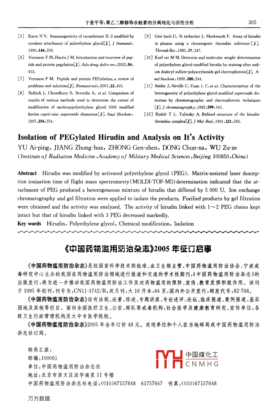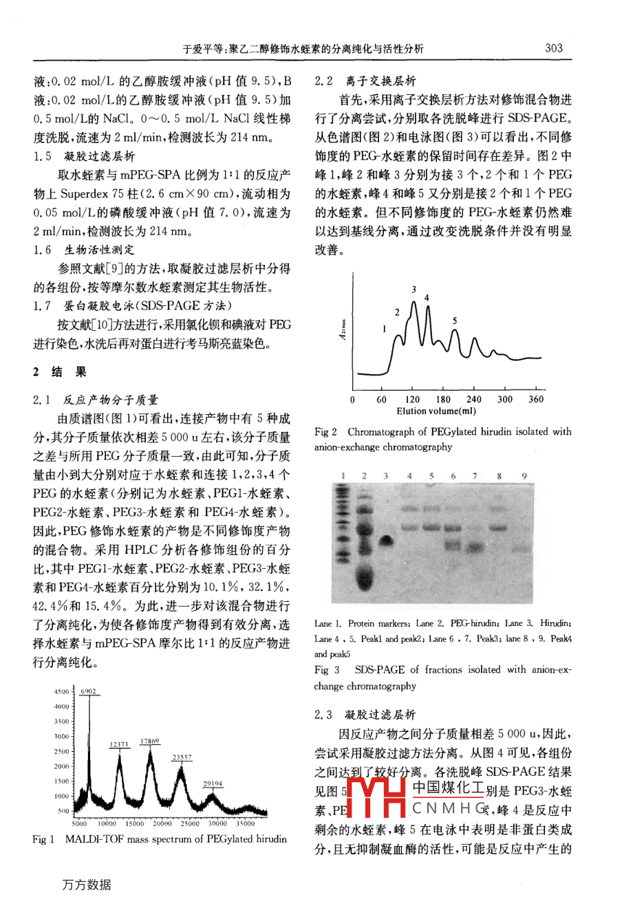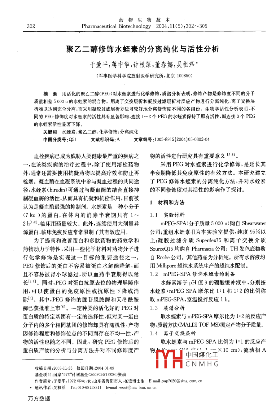 聚乙二醇修飾水蛭素的分離純化與活性分析