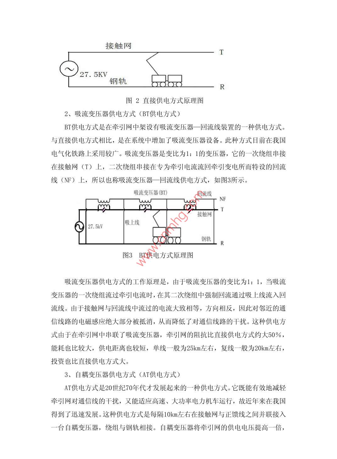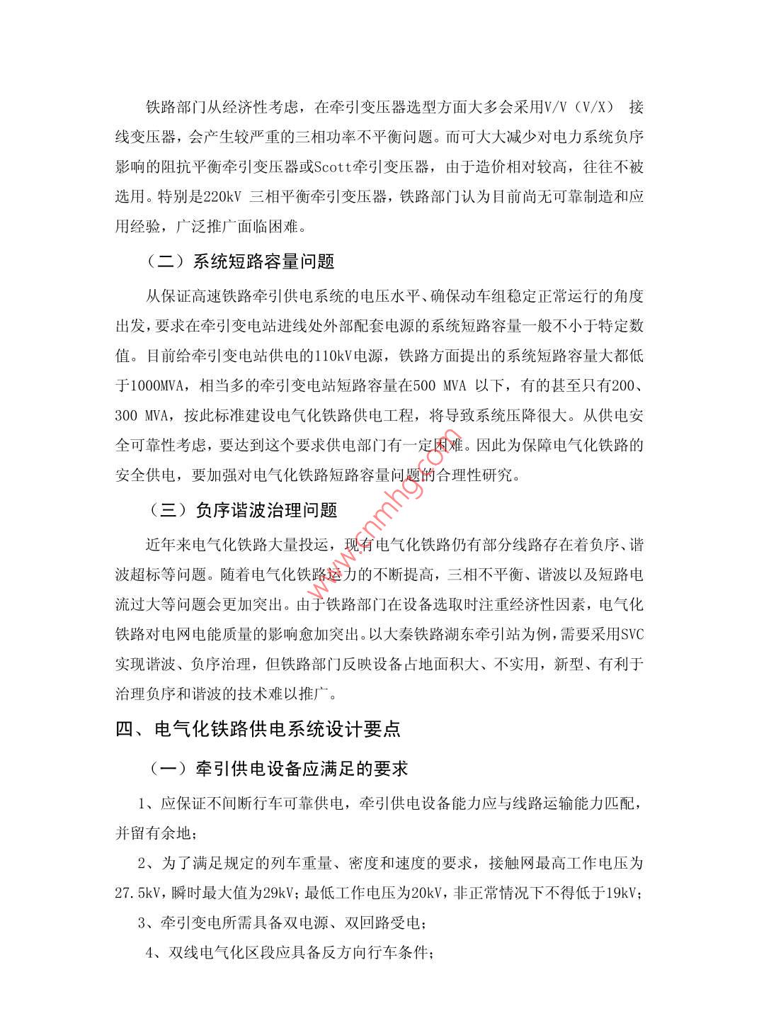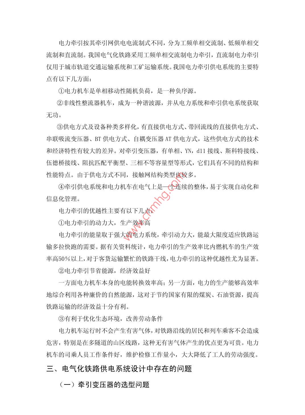 電氣化鐵路供電系統(tǒng)設(shè)計(jì)石昭監(jiān)中鐵十九局集團(tuán)電務(wù)工程有限公司北京100026摘要:鐵路和電力同為國(guó)家的重要基礎(chǔ)設(shè)施,電氣化鐵路的發(fā)展與其供電系統(tǒng)密不可分。電氣化鐵路是電網(wǎng)的重要用電負(fù)荷,同時(shí)對(duì)電力系統(tǒng)運(yùn)行也帶來(lái)一-些新的問(wèn)題。本文首先分析了電氣化鐵路供電系統(tǒng)的構(gòu)成,并對(duì)電力牽引的特點(diǎn)和優(yōu)越性進(jìn)行了說(shuō)明,其次分析了電氣化鐵路供電系統(tǒng)設(shè)計(jì)中存在的問(wèn)題,最后重點(diǎn)論述了電氣化鐵路供電系統(tǒng)的設(shè)計(jì)要點(diǎn)。關(guān)鍵詞:電氣化鐵路;供電系統(tǒng);設(shè)計(jì);牽引供電;供電方式Abstract: the railways and power as a national important foundation failities, isclosely related to development of electrified railway and power supply system.The electrified railway is the important power grid electricity load, but alsobrings some new problems to power system operation. This paper firstanalyzes the structure of electrified railway traction power supply system ofelectric traction, and the characteristics and advantages are described,followed by analysis of the design of electrified railway traction power supplysystem in question, finally discusses the key points in the design of powersupply system of electric railway.Keywords: electric railway; power supply system; design; traction powersupply; power supply中圖分類(lèi)號(hào): U22文獻(xiàn)標(biāo)識(shí)碼: A文 章編號(hào): 2095- 2104 (2013)一、電氣化鐵路供電系統(tǒng)的構(gòu)成電氣化鐵道供電系統(tǒng)由一-次供電 系統(tǒng)和牽引供電系統(tǒng)組成。電氣化鐵道供電系統(tǒng)的簡(jiǎn)單構(gòu)成如圖1所示。豐21↑圖1 電氣化鐵路供電系統(tǒng)構(gòu)成1一區(qū)域變電站或發(fā)電廠(chǎng)2- - 1 10K三相交流高壓輸電線(xiàn)3一牽引變電所4一饋電線(xiàn)5- -接觸網(wǎng)6-軌道、地7一鋼軌回流電8一電力機(jī)車(chē)(一)一次供電系統(tǒng)一次供電系統(tǒng)是指電力系統(tǒng)向電氣化鐵道的供電部分。在我國(guó),電力系統(tǒng)通常以110kV的電壓等級(jí)向電氣化鐵道供電。圖1中,1為區(qū)域變電站或發(fā)電廠(chǎng),2為三相交流高壓輸電線(xiàn),這兩部分即為電氣化鐵道的--次供電系統(tǒng)。(二)牽引供電系統(tǒng)完成對(duì)電力機(jī)車(chē)供電的屬于鐵路部門(mén)管轄的裝置稱(chēng)為電氣化鐵道的牽引供電系統(tǒng)。如圖1,它由牽引變電所3、饋電線(xiàn)4、接觸網(wǎng)5、鋼軌6和鋼軌回流線(xiàn)7等組成。二、電力牽引的特點(diǎn)及優(yōu)越性電氣化鐵路的供電系統(tǒng)是由發(fā)電廠(chǎng)集中提供電能,經(jīng)變電站,通過(guò)高壓輸電線(xiàn)(110kV) 傳輸給牽引變電所,轉(zhuǎn)變成電壓27.5kV或55kV送到接觸網(wǎng)上,供給沿線(xiàn)運(yùn)行的電力機(jī)車(chē)。而牽引供電是指電力系統(tǒng)從鐵路牽引變電所開(kāi)始,向牽引接觸網(wǎng)的供電。電力牽引是-種新型有軌運(yùn)輸牽引動(dòng)力形式。在干線(xiàn)鐵路、城市軌道交通運(yùn)輸和工礦運(yùn)輸中有著廣泛的作用。電力牽引是利用電能作為牽引動(dòng)力,將電能轉(zhuǎn)換為機(jī)械能,驅(qū)動(dòng)鐵路列車(chē)、電動(dòng)車(chē)組和城市軌道交通車(chē)輛等有軌運(yùn)輸工具運(yùn)行的- -種運(yùn)輸形式。電力牽引按其牽引網(wǎng)供電電流制式不同,分為工頻單相交流制、低頻單相交流制和直流制。我國(guó)電氣化鐵路采用工頻單相交流制電力牽引,直流制電力牽引僅用于城市軌道交通運(yùn)輸系統(tǒng)和工礦運(yùn)輸系統(tǒng)。我國(guó)電力牽引供電系統(tǒng)的主要特點(diǎn)有以下幾方面:①電力機(jī)車(chē)是單相移動(dòng)性隨機(jī)負(fù)荷,是一一種負(fù)序源。②非線(xiàn)性整流器機(jī)車(chē),成為-一種諧波源,并從電力系統(tǒng)和牽引供電系統(tǒng)獲取無(wú)功。③供電方式及設(shè)備種類(lèi)多樣化,有直接供電方式、帶回流線(xiàn)的直接供電方式、串聯(lián)吸流變壓器、BT 供電方式、自耦變壓器AT供電方式,這些供電方式的技術(shù)和經(jīng)濟(jì)特性有較大的差異。對(duì)牽引變壓器,有單相、YN, d11 接線(xiàn)、斯科特接線(xiàn)、伍德橋接線(xiàn)、阻抗匹配平衡型、三相不等容量型等形式,它們具有不同的結(jié)構(gòu)和性能特點(diǎn)。由于供電方式不同,接觸網(wǎng)結(jié)構(gòu)類(lèi)型也較多。④牽引供電系統(tǒng)和電力機(jī)車(chē)在電氣上是一個(gè)連續(xù)的整體,易于實(shí)現(xiàn)自動(dòng)化和信息化管理。電力牽引的優(yōu)越性主要有以下幾點(diǎn):①電力牽引的動(dòng)力大,生產(chǎn)效率高電力牽引的能量取于強(qiáng)大的電力系統(tǒng),牽引動(dòng)力大,能最大限度適應(yīng)鐵路運(yùn)輸多拉快跑的需要。據(jù)有關(guān)資料統(tǒng)計(jì),電力牽引的生產(chǎn)效率比內(nèi)燃機(jī)車(chē)的生產(chǎn)效率高50%以上,對(duì)于客貨運(yùn)輸繁忙的鐵路干線(xiàn),電力牽引的這種優(yōu)越性尤為顯著。②電力牽引節(jié)省能源,經(jīng)濟(jì)效益好- -方面電力機(jī)車(chē)本身的電能轉(zhuǎn)換效率高;另一方面, 電力的生產(chǎn)能夠高效率地綜合利用各種廉價(jià)的自然能源,這對(duì)于節(jié)約國(guó)家有限的煤炭、石油資源,