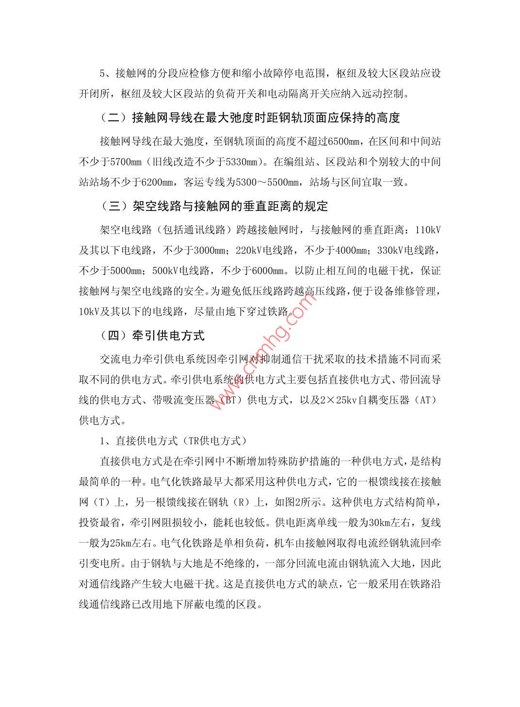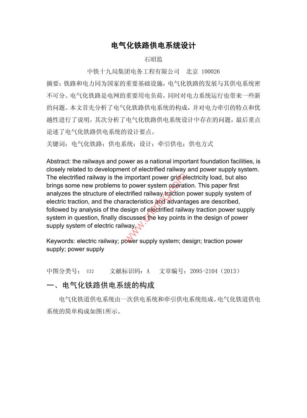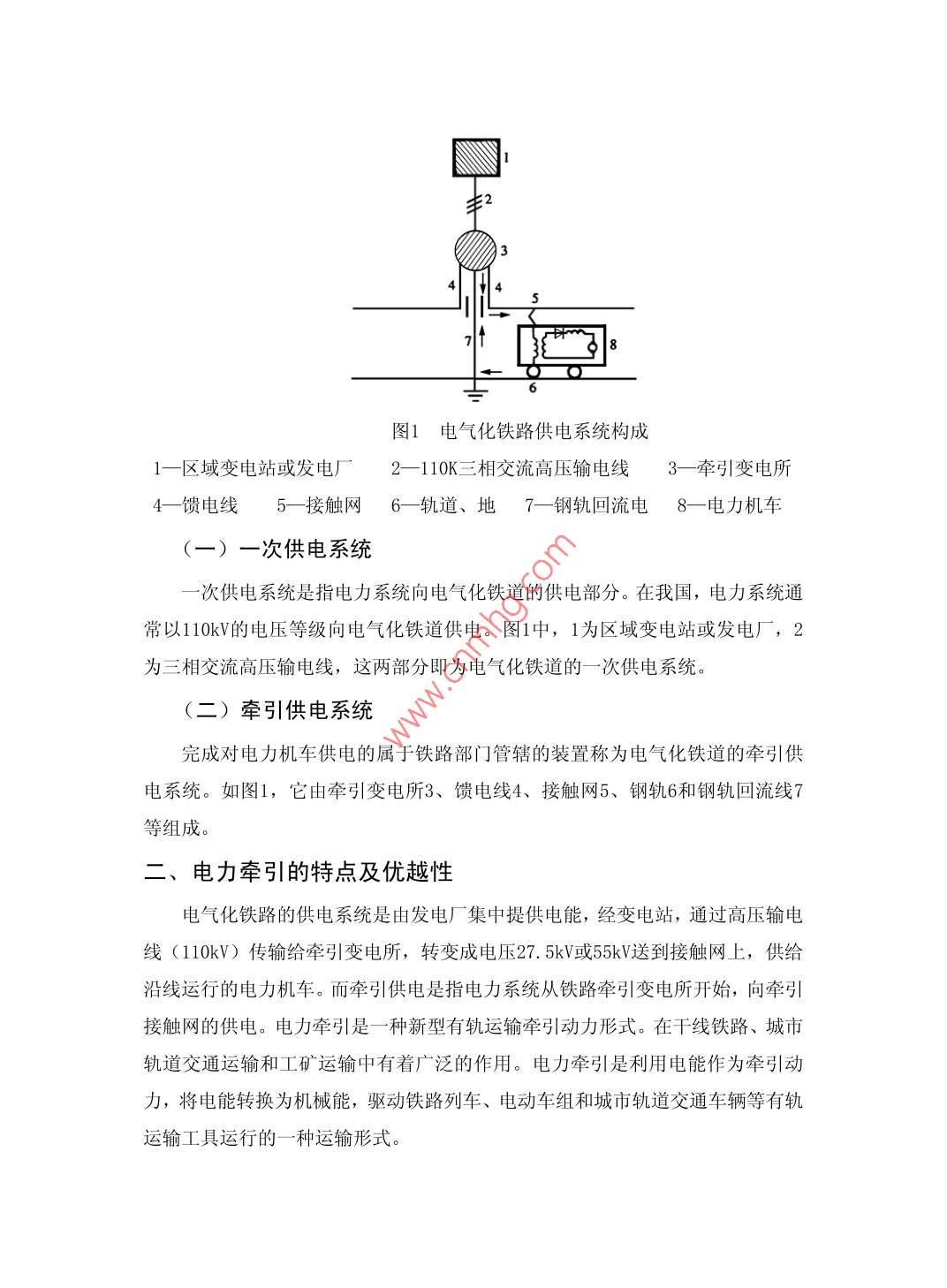 電氣化鐵路供電系統(tǒng)設(shè)計(jì)石昭監(jiān)中鐵十九局集團(tuán)電務(wù)工程有限公司北京100026摘要:鐵路和電力同為國(guó)家的重要基礎(chǔ)設(shè)施,電氣化鐵路的發(fā)展與其供電系統(tǒng)密不可分。電氣化鐵路是電網(wǎng)的重要用電負(fù)荷,同時(shí)對(duì)電力系統(tǒng)運(yùn)行也帶來(lái)一-些新的問(wèn)題。本文首先分析了電氣化鐵路供電系統(tǒng)的構(gòu)成,并對(duì)電力牽引的特點(diǎn)和優(yōu)越性進(jìn)行了說(shuō)明,其次分析了電氣化鐵路供電系統(tǒng)設(shè)計(jì)中存在的問(wèn)題,最后重點(diǎn)論述了電氣化鐵路供電系統(tǒng)的設(shè)計(jì)要點(diǎn)。關(guān)鍵詞:電氣化鐵路;供電系統(tǒng);設(shè)計(jì);牽引供電;供電方式Abstract: the railways and power as a national important foundation failities, isclosely related to development of electrified railway and power supply system.The electrified railway is the important power grid electricity load, but alsobrings some new problems to power system operation. This paper firstanalyzes the structure of electrified railway traction power supply system ofelectric traction, and the characteristics and advantages are described,followed by analysis of the design of electrified railway traction power supplysystem in question, finally discusses the key points in the design of powersupply system of electric railway.Keywords: electric railway; power supply system; design; traction powersupply; power supply中圖分類(lèi)號(hào): U22文獻(xiàn)標(biāo)識(shí)碼: A文 章編號(hào): 2095- 2104 (2013)一、電氣化鐵路供電系統(tǒng)的構(gòu)成電氣化鐵道供電系統(tǒng)由一-次供電 系統(tǒng)和牽引供電系統(tǒng)組成。電氣化鐵道供電系統(tǒng)的簡(jiǎn)單構(gòu)成如圖1所示。豐21↑圖1 電氣化鐵路供電系統(tǒng)構(gòu)成1一區(qū)域變電站或發(fā)電廠(chǎng)2- - 1 10K三相交流高壓輸電線(xiàn)3一牽引變電所4一饋電線(xiàn)5- -接觸網(wǎng)6-軌道、地7一鋼軌回流電8一電力機(jī)車(chē)(一)一次供電系統(tǒng)一次供電系統(tǒng)是指電力系統(tǒng)向電氣化鐵道的供電部分。在我國(guó),電力系統(tǒng)通常以110kV的電壓等級(jí)向電氣化鐵道供電。圖1中,1為區(qū)域變電站或發(fā)電廠(chǎng),2為三相交流高壓輸電線(xiàn),這兩部分即為電氣化鐵道的--次供電系統(tǒng)。(二)牽引供電系統(tǒng)完成對(duì)電力機(jī)車(chē)供電的屬于鐵路部門(mén)管轄的裝置稱(chēng)為電氣化鐵道的牽引供電系統(tǒng)。如圖1,它由牽引變電所3、饋電線(xiàn)4、接觸網(wǎng)5、鋼軌6和鋼軌回流線(xiàn)7等組成。二、電力牽引的特點(diǎn)及優(yōu)越性電氣化鐵路的供電系統(tǒng)是由發(fā)電廠(chǎng)集中提供電能,經(jīng)變電站,通過(guò)高壓輸電線(xiàn)(110kV) 傳輸給牽引變電所,轉(zhuǎn)變成電壓27.5kV或55kV送到接觸網(wǎng)上,供給沿線(xiàn)運(yùn)行的電力機(jī)車(chē)。而牽引供電是指電力系統(tǒng)從鐵路牽引變電所開(kāi)始,向牽引接觸網(wǎng)的供電。電力牽引是-種新型有軌運(yùn)輸牽引動(dòng)力形式。在干線(xiàn)鐵路、城市軌道交通運(yùn)輸和工礦運(yùn)輸中有著廣泛的作用。電力牽引是利用電能作為牽引動(dòng)力,將電能轉(zhuǎn)換為機(jī)械能,驅(qū)動(dòng)鐵路列車(chē)、電動(dòng)車(chē)組和城市軌道交通車(chē)輛等有軌運(yùn)輸工具運(yùn)行的- -種運(yùn)輸形式。電力牽引按其牽引網(wǎng)供電電流制式不同,分為工頻單相交流制、低頻單相交流制和直流制。我國(guó)電氣化鐵路采用工頻單相交流制電力牽引,直流制電力牽引僅用于城市軌道交通運(yùn)輸系統(tǒng)和工礦運(yùn)輸系統(tǒng)。我國(guó)電力牽引供電系統(tǒng)的主要特點(diǎn)有以下幾方面:①電力機(jī)車(chē)是單相移動(dòng)性隨機(jī)負(fù)荷,是一一種負(fù)序源。②非線(xiàn)性整流器機(jī)車(chē),成為-一種諧波源,并從電力系統(tǒng)和牽引供電系統(tǒng)獲取無(wú)功。③供電方式及設(shè)備種類(lèi)多樣化,有直接供電方式、帶回流線(xiàn)的直接供電方式、串聯(lián)吸流變壓器、BT 供電方式、自耦變壓器AT供電方式,這些供電方式的技術(shù)和經(jīng)濟(jì)特性有較大的差異。對(duì)牽引變壓器,有單相、YN, d11 接線(xiàn)、斯科特接線(xiàn)、伍德橋接線(xiàn)、阻抗匹配平衡型、三相不等容量型等形式,它們具有不同的結(jié)構(gòu)和性能特點(diǎn)。由于供電方式不同,接觸網(wǎng)結(jié)構(gòu)類(lèi)型也較多。④牽引供電系統(tǒng)和電力機(jī)車(chē)在電氣上是一個(gè)連續(xù)的整體,易于實(shí)現(xiàn)自動(dòng)化和信息化管理。電力牽引的優(yōu)越性主要有以下幾點(diǎn):①電力牽引的動(dòng)力大,生產(chǎn)效率高電力牽引的能量取于強(qiáng)大的電力系統(tǒng),牽引動(dòng)力大,能最大限度適應(yīng)鐵路運(yùn)輸多拉快跑的需要。據(jù)有關(guān)資料統(tǒng)計(jì),電力牽引的生產(chǎn)效率比內(nèi)燃機(jī)車(chē)的生產(chǎn)效率高50%以上,對(duì)于客貨運(yùn)輸繁忙的鐵路干線(xiàn),電力牽引的這種優(yōu)越性尤為顯著。②電力牽引節(jié)省能源,經(jīng)濟(jì)效益好- -方面電力機(jī)車(chē)本身的電能轉(zhuǎn)換效率高;另一方面, 電力的生產(chǎn)能夠高效率地綜合利用各種廉價(jià)的自然能源,這對(duì)于節(jié)約國(guó)家有限的煤炭、石油資源,