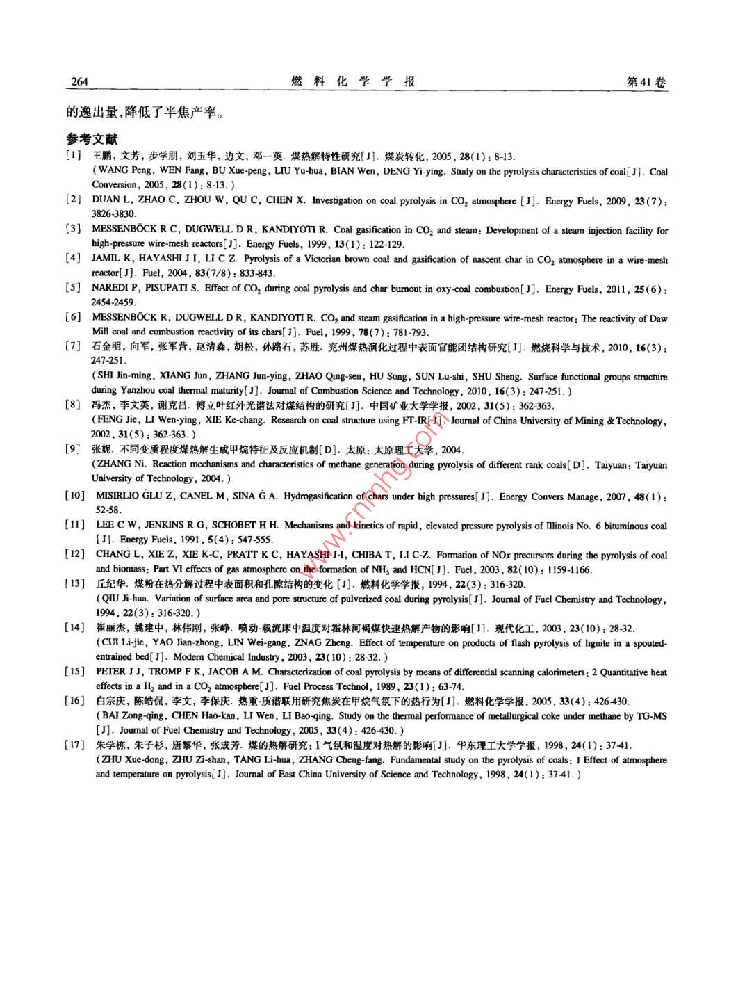 第41卷第3期燃料化學(xué)學(xué)報Vol, 41 No. 32013年3月Jourmal of Fuel Chemistry and TechnologyMar.2013文章編號:0253-2409(2013)030257-08cO2對褐煤熱解行為的影響高松平123,趙建濤,王志青,王建飛12,房倚天,黃戒介1(1.中國科學(xué)院山西煤炭化學(xué)研究所,山西太原030001;2中國科學(xué)院大學(xué),北京100049;3.太原工業(yè)學(xué)院,山西太原030008)摘要:利用熱天平和快速升溫固定床進(jìn)行了CO2氣氛下褐煤熱解特性的研究,考察了CO2對半焦的產(chǎn)率和氣體產(chǎn)物分布的影響。通過對半焦的比表面積、孔結(jié)構(gòu)、官能團(tuán)和元素含量的分析,確定了CO2對煤熱解過程的影響機(jī)制。CO2對新生半焦的氣化反應(yīng)破壞了含氫的半焦結(jié)構(gòu),一方面促進(jìn)了羥基、甲基、亞甲基等基團(tuán)的斷裂和苯環(huán)的開裂;另一方面減弱H與其依附本體的結(jié)合,增加了氫的流動性,引發(fā)了更多的氫自由基生成。這些氫自由基與煤大分子斷裂生成的碎片自由基結(jié)合生成更多的揮發(fā)分,使半焦有較大的比表面積孔容和開孔率。CO2的引入促進(jìn)了煤的熱解和揮發(fā)分的生成,增大了H2、COCH4和CH等小分子烴類物質(zhì)逸出降低了半焦的產(chǎn)率關(guān)鍵詞:CO2氣氛;熱解行為;半焦性質(zhì)中圖分類號:TQ530.2文獻(xiàn)標(biāo)識碼:AEffect of co, on pyrolysis behaviors of ligniteGAO Song-ping23, ZHAO Jian-tao, WANG Zhi-qing, WANG Jian-fei, FANG Yi-tian', HUANG Jie-jie2. University of Chinese Academy of Sciences, Beijing 100049, Chile, China;1. Institute of Coal Chemistry, Chinese Academy of Sciences, Taiyuan 030001, China3. Taiyuan institute of Technology, Taiyuan 030008, China)Abstract: The pyrolysis of Huolinhe lignite under CO2 atmosphere was carried out in a thermobalance and a fastheating-up fixed bed reactor. The distribution of gases, char yield and its property such as element, surfacestructure, FT-IR spectra were analyzed. By this, the effect of CO2 on the pyrolysis behaviors was studied. Theresults show that CO, gasification of the nascent char, which destroys the hydrogen-containing char structure, notonly promotes cracking of benzene ring and fracture of hydroxyl, methyl and methylene groups etc., but alsoweakens the interaction between H and char matrix and increases the H fluidity, leading to the increase in thegeneration of H radicals. These H radicals can combine with other free radical fragments generated from fractureof the coal macromolecules to produce more volatiles. This will produce the char with a high specific surface andhigh pore volume and porosity. The introduction of CO 2 promotes the coal pyrolysis and generation of volatileresulting in decrease in char yield and increase in the evolution amount of H,, CO, CH4 and other smallmolecules hydrocarbonsKey words: CO, atmosphere; pyrolysis behaviors; char property煤氣化技術(shù)是煤炭潔凈利用和高效轉(zhuǎn)化的重要煤的熱解過程變得復(fù)雜,進(jìn)而影響到熱解產(chǎn)物的分途徑之一,由熱解和氣化兩步構(gòu)成。作為煤氣化過布以及半焦的性質(zhì)。因此,反應(yīng)氣氛能顯著地影響程的第一步,煤的熱解過程對煤的氣化過程會產(chǎn)生煤的熱解過程。重要的影響,例如熱解制得的半焦活性影響煤氣化關(guān)于CO2氣氛下煤的熱解,前人已經(jīng)作了一定的反應(yīng)性,熱解產(chǎn)品氣影響煤氣總量煤氣組成和煤研究。與惰性氣氛相比,CO2氣氛下,半焦產(chǎn)率下氣的熱值等。因此,研究煤的熱解過程,特別是研究降氣體產(chǎn)率增加,干餾氣中H2和CH4的體積分?jǐn)?shù)在煤氣氣氛下煤的熱解機(jī)理對提高煤炭潔凈利用和降低,CO含量明顯增加。Duan等φ2研究了煙煤高效轉(zhuǎn)化有重要的意義。在高溫?zé)峤鈼l件下,反應(yīng)在CO2氣氛下熱解,得出熱解溫度700-1000℃氣氛不僅可以與熱解得到的新生半焦揮發(fā)分發(fā)生CO2氣氛下?lián)]發(fā)分產(chǎn)率比N2氣氛下的高,煤熱解作用,而且反應(yīng)氣氛間也可能相互作用,這些都導(dǎo)致和CO2氣化反應(yīng)同時反生。 Messenbock等3研究收稿日期:2012-10-15;修回日期:2012-1226基金項目:國家自然科學(xué)基金(21106173);中國科學(xué)院戰(zhàn)略性先導(dǎo)科技專項(XDA0705100);中國科學(xué)院山西煤炭化學(xué)研究所青年人才基金(201QNR01)。聯(lián)系作者:房倚天,研究員,Tel/Fax:0351-2021137,E-mail:fyt@sxic.ac.cn。本文的英文電子版由Elsevier出版社在ScienceDirec上出版(hp://www.sciencedirect.com/ScIence/jourmal/18725813)。燃料化學(xué)學(xué)報第41卷了褐煤分別在He、水蒸氣和CO2氣氛下快速熱解,定床進(jìn)行了CO2氣氛下煤的熱解研究,考察了CO得出熱解溫度為1000℃,煤熱解和CO2的氣化反對半焦的產(chǎn)率和氣體產(chǎn)物分布的影響,通過對半焦應(yīng)同時進(jìn)行。 Jamil等4研究了維多利亞褐煤分別的表面性質(zhì)、孔結(jié)構(gòu)、官能團(tuán)和元素含量的分析,確在He和CO2氣氛下快速和慢速熱解,得出在快速定了CO2對煤熱解過程的影響機(jī)制熱解下,氣氛改變沒有影響焦油產(chǎn)率和組成,高于1實驗部分600℃下CO2對新生半焦的氣化反應(yīng)和煤熱解同時1.1媒樣的制備進(jìn)行,氣化反應(yīng)速率強烈依賴于煤熱解速率。與惰原料煤選用霍林河(HLH)褐煤。首先將原料性氣氛相比,CO2氣氛下半焦額外的失重是由于煤破碎篩分,得到粒徑分布為80~100目(154CO2對半焦的氣化反應(yīng)(CO2+C→2CO)引起46。180μm)的煤樣;然后,在383K真空干燥4h以除而有關(guān)反應(yīng)氣氛CO2對煤熱解過程的作用機(jī)