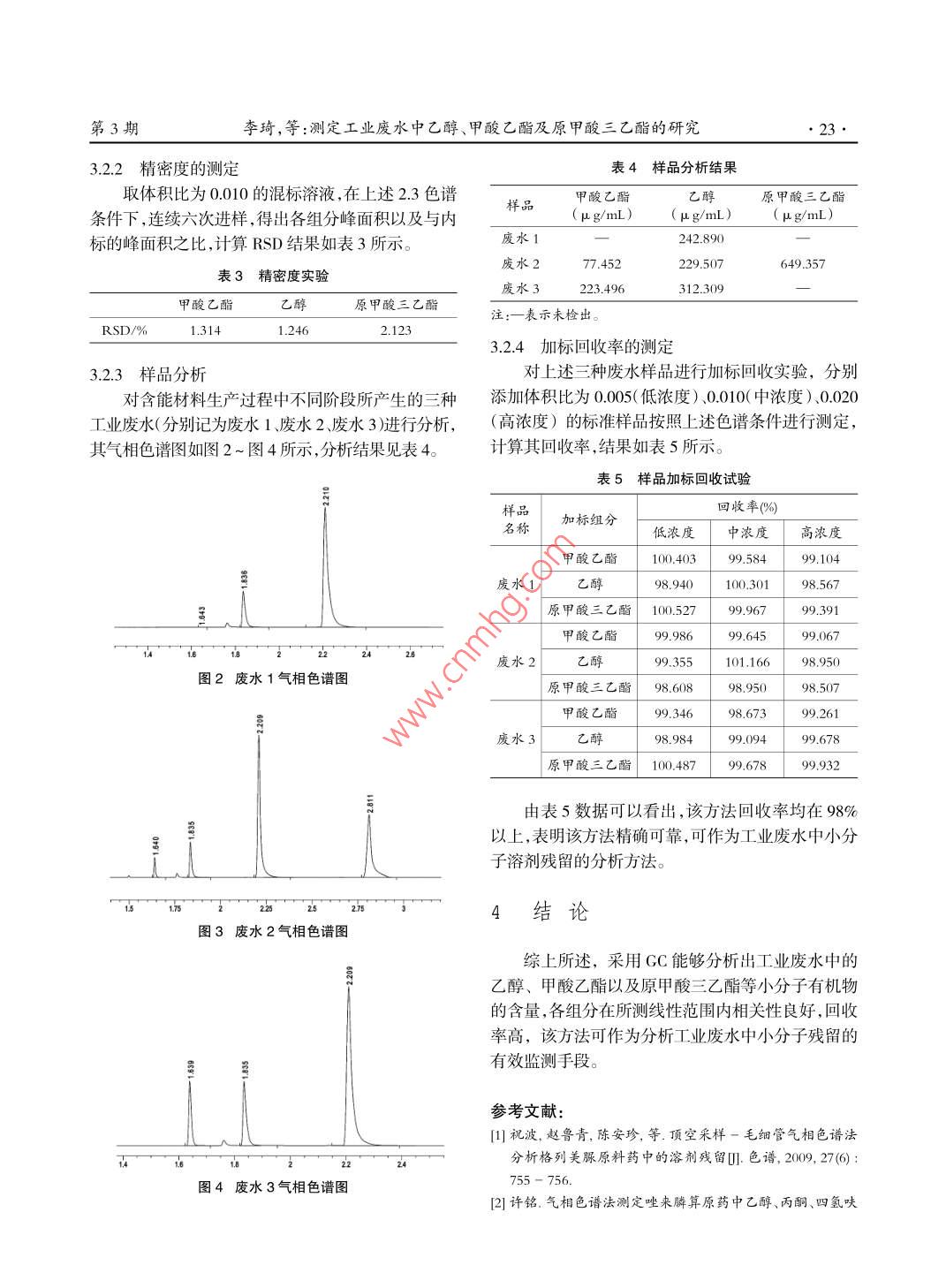 第33卷第3期皮革與化工Vol 3.3 No. 32016年6月LEATHER AND CHEMICALSJum.2016理論摞討測定工業(yè)廢水中乙醇、甲酸乙酯及原甲酸三乙酯的研究李琦',夏明珠',王風(fēng)云1,雷武1,魏遠(yuǎn)隆,俞凌云2(1.南京理工大學(xué)工業(yè)化學(xué)研究所,江蘇南京210094;2.四川省出入境檢驗檢疫局檢驗檢疫技術(shù)中心,四川成都610041)摘要:建立氣相色譜法測定工業(yè)廢水中乙醇、甲酸乙酯以及原甲酸三乙酯的殘留量。分析方法采用DB-WAX(300m×250m×0.25μm)毛細(xì)管柱,程序升溫:柱溫70℃保持25min,以20℃/min速率升溫至150℃保持3min,使用內(nèi)標(biāo)法定量,各組分在所測線性范圍內(nèi)相關(guān)性好,回收率高。該方法可作為分析工業(yè)廢水中小分子殘留的有效監(jiān)測手段。關(guān)鍵詞:工業(yè)廢水;氣相色譜;內(nèi)標(biāo)法;殘留中圖分類號:065771文獻(xiàn)標(biāo)識碼:A文章編號:1674-0939(2016)03-0021-04Study on the Determination of Ethanol, EthylFormate and triethyl Orthoformatein Industrial waterLI Qi, XIA Ming-zhu, WANG Feng-yun, LEI Wu, WEI Yuan-long, YU Ling-yun2(1. Institute of Industrial Chemistry, Nanjing University of Science and Technology, Nanjing210094, China; 2. Sichuan Entery-exit Inspection and Quarantine Bureau, Chengdu 610041, China)Abstract: A gas chromatographic method for detecting residue of ethanol, ethyl formate and triethylorthoformate in industrial water was established. The method was as follows the three organic solventswere separated on a DB-WAX (300m x 250 u m x0. 25 u m using programmable increasedtemperature. The column temperature was initially maintained at 70C for 2.5min and then up to150C at the rate of 20C/min for 3min, quantified by internal standard method. Each component waexcellent linearity and had high percentage recovery. This method can be used for effective analysis oforganic residual in industrial wastewaterKey words: industrial wastewater; gas chromatography; internal standard method; residual物,在工業(yè)生產(chǎn)中常會使用一些小分子有機(jī)溶劑如前言乙醇、甲酸乙酯以及原甲酸三乙酯等,因此在工業(yè)廢水中有一定殘留。工業(yè)廢水由于受到生產(chǎn)過程中條工業(yè)廢水是指工業(yè)生產(chǎn)過程中產(chǎn)生的廢水,其件及工藝的影響,其溶劑殘留往往具有含量低,殘留中含有隨水流失的工業(yè)生產(chǎn)用料、中間產(chǎn)物、副產(chǎn)品量差異大,殘留組合不確定等特點,上述特點決定以及生產(chǎn)過程中產(chǎn)生的污染物。溶劑殘留是指在物了工業(yè)廢水中溶劑殘留檢測的復(fù)雜性。分析工業(yè)廢質(zhì)合成工藝過程中未能完全除去的有機(jī)揮發(fā)性化合水中的溶劑殘留對廢水處理有指導(dǎo)作用,對環(huán)境保收稿日期:2016-03-03作者簡介:李琦(1991-),女,研究生,研究方向:應(yīng)用化學(xué)皮革與化工 LEATHER AND CHEMICALS第33卷護(hù)具有一定意義。溶劑殘留常用的分析方法為氣相50:1;氫氣流量:40mL/min;空氣流量:450mL/min色譜法,本文建立了氣相色譜快速分析方法,可尾吹氮氣流量:45mmin;進(jìn)樣量:1μL將廢水中目標(biāo)物與干擾物質(zhì)很好地分離。此方法同樣適用于制革廢水中小分子有機(jī)物,如乙醇、甲酸乙3結(jié)果與討論酯等的分析。3.1定性分析2實驗部分采用保留時間定性,對2.2.2中的對照品溶液進(jìn)行測定,所得譜圖如圖1所示,各組分出峰時間見表21試劑及儀器試劑:乙醇,分析純,四川西隴化工有限公司;甲酸乙酯,分析純,上海安譜實驗科技股份有限公司;原甲酸三乙酯,分析純,上海安譜實驗科技股份有限公司;NN-二甲基甲酰胺,分析純,成都金山化學(xué)試劑有限公司;正丙醇,色譜純,賽默飛世爾科技(中國)有限公司;超純水。儀器:微型渦旋混合儀,XW-80A,上海滬西分析儀器廠有限公司;純水機(jī),Mli- O RTOS,密理博中國有限公司;氣相色譜儀,6890,美國安捷倫。2.2溶液配制圖1各組分的氣相色譜圖22.1內(nèi)標(biāo)溶液的配制表1各組分保留時間取正丙醇0.50mL于500mL容量瓶中,加入NN-二甲基甲酰胺稀釋至刻度,搖勻,備用序號組分保留時間/min甲酸乙酯22.2對照品溶液的配制1.637乙醇1833分別取乙醇、甲酸乙酯、原甲酸三乙酯各0.1mL于100mL容量瓶中,采用內(nèi)標(biāo)溶液稀釋至刻度,搖1234正丙醇勻,備用原甲酸三乙酯2.8122.23樣品溶液的配制32定量分析經(jīng)有機(jī)相濾膜過濾后的廢水樣,取01mL采用3.21線性范圍的測定內(nèi)標(biāo)溶液稀釋至10mL,待測。分別配制體積比為0001、00050010、0.02523色譜條件0050的乙醇、甲酸乙酯以及原甲酸三乙酯的混合標(biāo)色譜柱:DB-WAX色譜柱(30.0m×250pmx準(zhǔn)溶液,采用2.3中的色譜條件進(jìn)行測定,根據(jù)各組025μm);檢測器F1D檢測器;柱溫:70℃保持分濃度為橫坐標(biāo),峰面積與內(nèi)標(biāo)峰面積之比為縱坐2mi,以20℃mim速率升溫至150℃保持3min;標(biāo)作圖,繪制各組分的工作曲線所得結(jié)果如表2所進(jìn)樣口溫度:200℃;檢測器溫度:250℃;分流比:示。表2各組分線性回歸測量結(jié)果組分歸方程相關(guān)系數(shù)r線性范圍(μg/mL)甲酸乙酯0.99940.919~45950乙醇原甲酸三乙酯y=0.1221x-0.66780.99800.891~44.550第3期李琦,等:測定工業(yè)廢水中乙醇、甲酸乙酯及原甲酸三乙酯的硏究233.2.2精密度的測定表4樣品分析結(jié)果取體積比為0.010的混標(biāo)溶液,在上述2.3色譜樣品甲酸乙酯原甲酸三乙酯條件下,連續(xù)六次進(jìn)樣,得出各組分峰面積以及與內(nèi)(ug/mL) (Hg/mL) (ug/mL)標(biāo)的峰面積之比,計算RSD結(jié)果