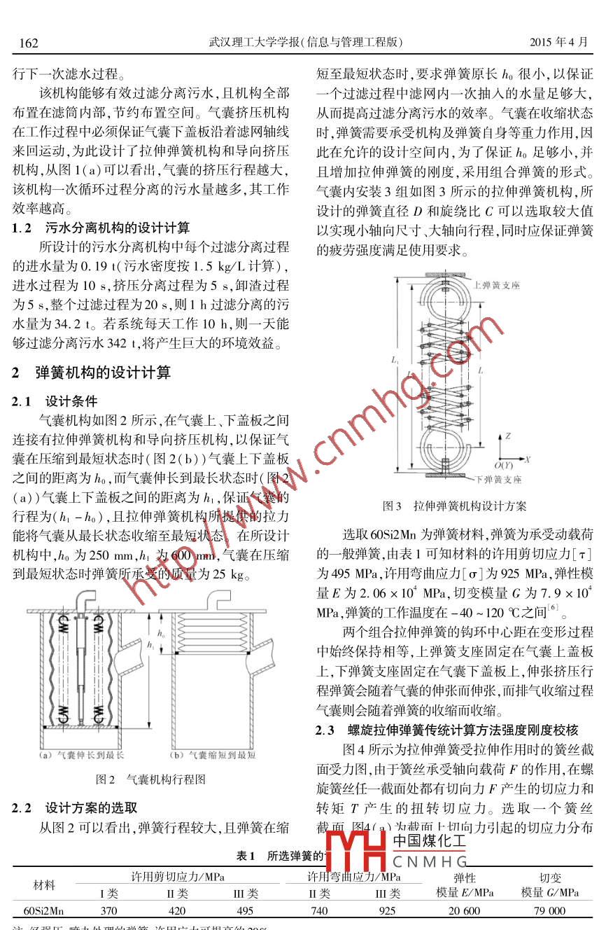第37卷第2期武漢理工大學(xué)學(xué)報(信息與管理工程版)Vol.37 No.22015年4月.JOURNAL OF WUT( INFORMATION & MANAGEMENT ENGINEERING)Apr. 2015文章編號:2095 - 3852(2015)02 -0161 -05文獻(xiàn)標(biāo)志碼:A污水分離機(jī)構(gòu)的設(shè)計與優(yōu)化李晚霞,,徐楊坤’,何耀華,甘宇(1.武漢理工大學(xué)汽車工程學(xué)院,湖北武漢430070;2.現(xiàn)代汽車零部件湖北省重點實驗室,湖北武漢430070;3.湖北三環(huán)專用汽車有限公司,湖北十堰442012)摘要:設(shè)計了一種用于過濾、分離生活污水的污水分離機(jī)構(gòu),該機(jī)構(gòu)主要由氣囊機(jī)構(gòu)、濾網(wǎng)和濾簡組成。氣囊機(jī)構(gòu)主要由彈簧機(jī)構(gòu)和導(dǎo)向擠壓機(jī)構(gòu)組成。應(yīng)用三維建模軟件對該機(jī)構(gòu)建立三維模型,采用有限元軟件對重要負(fù)載部件彈簧機(jī)構(gòu)進(jìn)行了分析計算和優(yōu)化設(shè)計,保證了污水分離機(jī)構(gòu)工作性能和強(qiáng)度要求,為污水分離機(jī)構(gòu)及圓柱螺旋拉伸彈簧的設(shè)計提供了--定的參考依據(jù)。關(guān)鍵詞:污水分離機(jī)構(gòu);氣囊機(jī)構(gòu);拉伸彈簧;有限元分析;優(yōu)化設(shè)計中圖分類號:U462.25DOI: 10.3963/j. issn. 2095 - 3852.2015. 02.008城市生活污水處理變得越來越重要,據(jù)測算,城鎮(zhèn)供水的80%轉(zhuǎn)化為污水,經(jīng)收集處理后,其9T中70%可再循環(huán)利用"??梢苿幼鳂I(yè)的污水處理車能夠較好地處理分散的城市污水,有效實現(xiàn)污水循環(huán)再利用,而污水分離機(jī)構(gòu)直接影響污水處理車的污水分離效率,因此設(shè)計實用、高效的污水分離機(jī)構(gòu)能夠有效地保證污水處理車的可靠性和可操作性。目前污水分離方法主要包括自然沉11--降法、離心分離法、真空抽吸法、濾網(wǎng)攔截過濾法!2一和磁分離技術(shù)等物理分離法,以及絮凝沉淀、藥物13-(a)污水分離機(jī)構(gòu)結(jié)束分離污水處理等化學(xué)分離法'2 -51。物理方法可操作性強(qiáng),2能夠通過合理的機(jī)械機(jī)構(gòu)實現(xiàn)污水的固液分離。,141污水分離機(jī)構(gòu)與運(yùn)動設(shè)計~151. 1污水分離機(jī)構(gòu)的結(jié)構(gòu)原理圖1所示為一種污水分離機(jī)構(gòu)原理圖,該機(jī)構(gòu)主要由濾筒、濾網(wǎng)和氣囊機(jī)構(gòu)組成。過濾開始時氣囊處于如圖1( b)所示的收縮狀態(tài),從人水口向濾網(wǎng)內(nèi)抽人污水,抽滿后關(guān)閉人水口,然后往導(dǎo)向氣缸內(nèi)充入高壓氣體,使導(dǎo)向擠壓機(jī)構(gòu)軸向伸(b)污水分離機(jī)構(gòu)抽入污水長,推動氣囊下蓋板向下擠壓污水,使清水從濾網(wǎng)圖1 污水分離機(jī)構(gòu)原理圖孔流人濾簡內(nèi)并由出水口流出,濾渣則留在濾網(wǎng)1-氣囊進(jìn)排氣口;2-氣囊上蓋板;3-氣囊;4一濾網(wǎng);5-導(dǎo)向底部,擠壓結(jié)束后排出導(dǎo)向氣缸內(nèi)的高壓氣體,然中國煤化工壓氣體:8-拉伸彈簧機(jī)構(gòu);后打開濾簡底部控制閥,使濾渣從濾簡底部排出,濾簡;12- 濾渣;13- 濾筒底濾渣排出后關(guān)閉濾筒底部控制閥,打開入水口進(jìn)HHCNMH G"收稿日期:2014-09 -23.作者簡介:李晚霞(1988- ),女,河南漯河人,武漢理工大學(xué)汽車工程學(xué)院碩士研究生.基金項目:教育部創(chuàng)新團(tuán)隊發(fā)展計劃基金資助項目(IRT13087).162武漢理工大學(xué)學(xué)報(信息與管理工程版)2015年4月行下一次濾水過程。短至最短狀態(tài)時,要求彈簧原長ho很小,以保證該機(jī)構(gòu)能夠有效過濾分離污水,且機(jī)構(gòu)全部一個過濾過程中濾網(wǎng)內(nèi)--次抽入的水量足夠大,布置在濾筒內(nèi)部,節(jié)約布置空間。氣囊擠壓機(jī)構(gòu)從而提高過濾分離污水的效率。氣囊在收縮狀態(tài)在工作過程中必須保證氣囊下蓋板沿著濾網(wǎng)軸線時,彈簧需要承受機(jī)構(gòu)及彈簧自身等重力作用,因來回運(yùn)動,為此設(shè)計了拉伸彈簀機(jī)構(gòu)和導(dǎo)向擠壓此在允許的設(shè)計空間內(nèi),為了保證ho足夠小,并機(jī)構(gòu),從圖1(a)可以看出,氣囊的擠壓行程越大,且增加拉伸彈簧的剛度,采用組合彈簀的形式。該機(jī)構(gòu)- -次循環(huán)過程分離的污水量越多,其工作氣囊內(nèi)安裝3組如圖3所示的拉伸彈簧機(jī)構(gòu),所效率越高。設(shè)計的彈簧直徑D和旋繞比C可以選取較大值1.2 污水分離機(jī)構(gòu)的設(shè)計計算以實現(xiàn)小軸向尺寸、大軸向行程,同時應(yīng)保證彈簧所設(shè)計的污水分離機(jī)構(gòu)中每個過濾分離過程的疲勞強(qiáng)度滿足使用要求。的進(jìn)水量為0.19 t(污水密度按1.5 kg/L計算),進(jìn)水過程為10 s,擠壓分離過程為5 s,卸渣過程上彈簧支座為5s,整個過濾過程為20s,則1 h過濾分離的污水量為34.2 t。若系統(tǒng)每天工作10 h,則一天能夠過濾分離污水342 t,將產(chǎn)生巨大的環(huán)境效益。2彈 簧機(jī)構(gòu)的設(shè)計計算l。i2.1設(shè)計條件氣囊機(jī)構(gòu)如圖2所示,在氣囊上、下蓋板之間連接有拉伸彈簧機(jī)構(gòu)和導(dǎo)向擠壓機(jī)構(gòu),以保證氣↑2f十一切一囊在壓縮到最短狀態(tài)時(圖2(b))氣囊上下蓋板.o(r)之間的距離為ho,而氣囊伸長到最長狀態(tài)時(圖2下彈簧支座(a))氣囊上下蓋板之間的距離為h1 ,保證氣囊的圖3拉伸彈 簧機(jī)構(gòu)設(shè)計方案行程為(h - ho),且拉伸彈簧機(jī)構(gòu)所提供的拉力