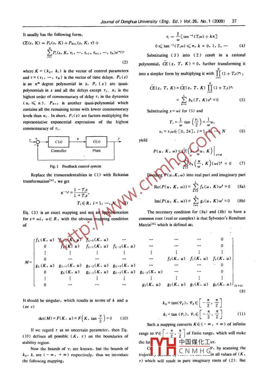 Joumal of Donghua University (Eng. Ed.) Vol.26, No.1 (2009)On Stabilizing Sets of PI Controllers for Multiple Time DelayedProcessZHENG Da(鄭達(dá)), REN Zheng-yun(任正云),F(xiàn)ANG Jian-an(方建安)"College of Information Science and Technology. Donghua University, Shanghai 201620, ChinaAbstract: This paper considers the problem of stabilizingscts of stabilizing PID parameters. With the complcte setsmultiple time delayed processes using proportional integralof stabilizing PID controller parameters being available for(PI) controller. The presented approach is based on findinga given proccss, it can avoid the time consuming stabilityall possible values of control parameters which will result incheck for each set of PID controller parameters in thepure imaginary roots of closed loop characteristic equationsearch process and thereby save the controller tuning timc.under all process parameters fixed. The ergodic search ofThe boundaries of the stabilizing PID controller parameterthree PI control parameters are converted from the range ofrcgion can be determined by the technique of Dinfinity to finite range by introducing trigonometric tangentparitionE5s] . Recently, a mcthod based on using a versionfunction. After all possible stability boundaries arof Hermitc Bichler theorem applicable to quasi-polynomialsobtained, the Nyquist stability method is used to determinehas been used to determine the completc set of stabilizingthe actual stability region of the controller parameters. ThisPID contoller gain parameters for first order plus timemethod also permits design for simultaneous minimum gaindelay systems ' 10.。The mcthod involves finding the zerosand phase margin requirement. An ilustrative example caseof a transcendental equation to determine the range ofis also presented.stabilizing gains.Key words: proportiomal-integral controller ; muliple timeMost industrial processes can be modeled as processesdelay; robust stability; stabilily regionwith single time delay. However, in order to model theCLC number: TP 273Document code: Apractical processes more accuratcly, models with multipleArticle ID: 1672 - 5220(2009)01 - 0036 - 04time delays are requircd. And in parallel cascadecontro1ll-8], the primary loop PID is actually designed fora multiple time delayed process.IntroductionUnfortunately, most methods determining theboundaries of the stabilizing PI controller parameter regionDespite continual advances in control theory anddeal with only single dclay process, which motivated thedevelopment of advanced control stratcgics, thpresent paper.proportional, intcgral, and derivative ( PID) controlThe novel method to stabilize the PI control systemalgorithm still finds wide applications in industrial processpresented here is based on determining all possible values ofcontrol systems. It has been reportedI] that 98% in of thecontrol parameters which will result in pure imaginary rootscontrol loops ihe pulp and paper[1] industries areof characteristic equation. Since the system only carry outcontrolled by proportional integral ( PI)controllers.stability shift on these points, it means some of these valuesMoreover, more than 95% of the controllers used inof control paramcters constitute the stability boundaries.process control applications are of the PID typet2]. Thepopularity among industrial practitioners stems from theThen the Nyquist stability method is uscd to determine theactual stability region.facts that the PID control structure is simple and itprinciple is easy to understand and that the PID controllersare deemed to be satisfactory and robust for a vast majority1 Main Resultsof processes. The primary problem associated with the use ofThe control structure is shown in Fig. 1.PID controllers is tuning, that is, the determination of PIDThe multiple time delayed processes controlled by a PIcontroller parameters for satisfactory control performance.Since the primary requirement of the candidate PIDcontroller with the form ofcontroller parameters is that of making the closcd-loopC(s)=k.+k(1)systcm stable, it is often desircd to construct the complete中國煤化工Reccived date; 2007- 10- 29YHCNMHGFoundation item: National Natural Science Foundation of China (No.60674088)* Corrcspondence should be addresscd l0 FANG Jjan-an, professor, E-mail: jafang@dhu. edu. cnJourmal of Donghua University (Eng. Ed.) Vol. 26, No.1 (2009)37It usually has the following form:τ,=二[tan -(Tw) + kx]CE(s, K)= Po(s, K) + PNu(s, K, r)+0≤tan -'(Tw)≤π, k =0, 1, 2, .(4)ZP.s, K,n, ..心仙ev)erSubstituting (3) into (2) result in a rational2)polynomial; CE(s, T, K) = 0, further transforming itwhere K = (kp, k:) is the vector of control paramctersinto a simpler form by multiplying it with IT (1 + Ts)" :andτ=(π, . tw) is the vector of time delays. Po(s)s an n" dcgree polynomial in s, Pi (s) arc quasi-CE(s, T, K)=CE(s, r, K) (1+ T;s)9vpolynomials in s and all the delays except t. ni is thehighcst order of commensuracy of dclay τi in the dynamics之be(T, K)s*=0(5)(n≤n). PN+I is another quasi-polynomial whichcontains all the remaining terms with lower commensuracySubstituting s= wi for (5) andlevels than n. In short, P((s) are factors multiplying therepresentative exponential expressions of the highcstπ=⊥tan (號)=ucommensuracy of ti.vi=τw∈[0, 2n], i=1,2, . N6)yicldC(s)G(s)ControllerPlant .P(u. K,w)=ce(, Juv.x)|..文0.(",k)awi)*=0 (7)Fig.1 Feedback control systcmReplace the transcendentalities in (1) with RckasiusDividing P(u ,K ,w) into real part and imaginary parttransformation[4], we gctRe(P(u, K, w))= 2 fe(u, K)w*=0 (8a)'e=i+Ts'T,∈R, i=1,..N (3)Im(P(u, K, w))= 2gl(u, K)w'=0 (8b)Eq. (3) is an exact mapping and not an approximationThe ncessary condition for (8a) and (8b) to have afor s= wi, w∈R, with the obvious mapping conditioncommon root (real or complex) is that Sylvester's RcsultantofMatrix[5s] which is defined as:(fu(K, u) fu-.(K, u) fu-z(K, u)0fL(K, u) fL-n(K, u) fL-z(K, u)fz(K, u) f(K, u) f。(K