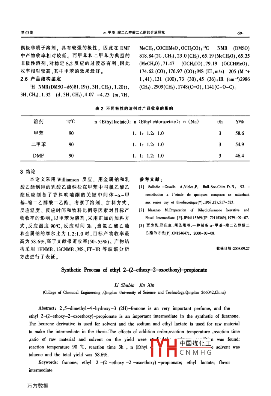 第03期α-甲基-縮二乙醇酸二乙酯的合成研究香料色素α-甲基-縮二乙醇酸二乙酯的合成研究李樹彬金欣(青島科技大學(xué)化工學(xué)院,山東青島266042)摘要:2,5-二甲基-4-羥基-3(2H)-呋喃酮是一種非常重要的原料,而α-甲基-縮二乙醇酸二乙酯是合成呋喃酮的重要中間體。本論文采用苯的同系物為溶劑,用金屬鈉和乳酸乙酯為原料制得乳酸乙酯鈉鹽,然后與氯乙酸乙酯制得該中間體。研究了加料順序、反應(yīng)溫度、反應(yīng)時間、物料摩爾比、溶劑效應(yīng)對收率的影響,找到了最佳反應(yīng)條件:采用正加的加料方式;反應(yīng)溫度90℃;反應(yīng)時間3h;n( Ethyl chloracetate:n(Na)=1.2:10;所用溶劑為甲苯。在此條件下該中間體的總收率高達(dá)58關(guān)鍵詞:呋喃酮;a-甲基-縮二乙醇酸二乙酯;乳酸乙酯;香料中間體中圖分類號:TQ2254文獻(xiàn)標(biāo)識碼:A文章綿號:1672-8114(200903-0057-0呋喃酮是一種非常重要的香料品種,主要用本論文采用氯乙酸乙酯代替溴乙酸乙酯,在于食品、飲料、香煙等方面。化學(xué)方法合成呋喃酮甲苯中和乳酸乙酯鈉進(jìn)行反應(yīng)得目標(biāo)產(chǎn)物,并對有多條途徑,目前國內(nèi)所采用的途徑是由乳酸乙反應(yīng)條件進(jìn)行優(yōu)化,獲得了最佳的反應(yīng)條件和最酯出發(fā),在強(qiáng)堿條件下與α-鹵代乙酸乙酯進(jìn)行親高的收率,該方法原料價格低廉、易得,適合工業(yè)核取代反應(yīng),生成α-甲基-縮二乙醇酸二乙酯,然化生產(chǎn)。后該化合物與草酸二乙酯縮合閉環(huán),再經(jīng)皂化、酸化和甲基化得目標(biāo)產(chǎn)物。其中a-甲基-縮二乙醇1實驗部分酸二乙酯是合成香料呋喃酮的關(guān)鍵中間體。合成1.1試劑與儀器該化合物具體有三種方法,其一是用金屬鈉和乳對乳酸乙酯,天津市科密歐化學(xué)試劑開發(fā)中酸乙酯制得的乳酸乙酯鈉鹽在乙醚溶劑中與溴乙心,化學(xué)純;對氯乙酸乙酯,上海錦源精細(xì)化工廠,酸乙酯反應(yīng)制得,收率為60%;其二是日本專利化學(xué)純公開的方法,即用NaH和乳酸乙酯反應(yīng)制得的乳GCl22型氣相色譜儀,上海精密科學(xué)儀器有酸乙酯鈉鹽在四氫呋喃溶劑中與溴乙酸乙酯反應(yīng)限公司; Varian Saturn2000kcC/MS氣質(zhì)聯(lián)用儀;制得,收率為82%。但上述兩種方法的不足之處 Varian Unity plus50M超導(dǎo)核磁共振波譜儀;A是:采用的溴乙酸乙酯不僅價格高、不易得,而且 VATAR360FT-IR紅外光譜儀,美國 Nicolet公司。對人特別是對人的眼睛刺激性特別大,不易于工1.2原理業(yè)化生產(chǎn)和操作。第三種方法是采用氯乙酸乙酯代替溴乙酸乙酯,在甲苯或二甲苯中與乳酸乙酯鈉進(jìn)行反應(yīng)得目標(biāo)產(chǎn)物,原料價格低廉易得,適合工業(yè)化生產(chǎn),但收率偏低,一般在50%,因此有必要對工藝進(jìn)行優(yōu)化和改進(jìn)。作者簡介:李樹彬(1981-),女,青島科技大學(xué)碩土研究生。aH中國煤化工CNMHG通訊聯(lián)系人1.3方法化工中間體Chemical Intermediate009年第03期1.3.1乳酸乙酯鈉的合成影響并不顯著,反應(yīng)時間從2h-5h,產(chǎn)物收率變化取一定量的金屬鈉,在甲苯中升溫至105℃,不大,一般將時間控制在3h較合適待鈉融化后,開動攪拌,將鈉打成鈉砂,然后滴加51乳酸乙酯在甲苯/鈉的體系中,維持反應(yīng)在35℃滴加完畢維持反應(yīng)一小時,直到無鈉為止,即得乳酸乙酯鈉鹽。1.3.2α-甲基一縮二乙醇酸二乙酯的合成滴加氯乙酸乙酯于上述體系中。反應(yīng)幾小時既得含α-甲基-縮二乙醇酸二乙酯的甲苯混合液。待反應(yīng)液冷卻后,反復(fù)水洗,直到反應(yīng)液呈中性,取上層的有機(jī)層,將有機(jī)層放入燒瓶中,先常壓蒸出甲苯,再初步減壓蒸餾,蒸出未反應(yīng)的乳酸4060708090100乙酯和氯乙酸乙酯,然后再減壓蒸餾,收集100~T/C102℃,5 mmHg下的餾分,既得α-甲基-縮二乙醇圖1反應(yīng)溫度對收率的影響酸二乙酯。2結(jié)果與討論2.1加料順序?qū)κ章实挠绊懕?表明了加料順序?qū)Ξa(chǎn)品收率的影響。正加表示將氯乙酸乙酯加到乳酸乙酯鈉的甲苯溶液>54中;反加是指將乳酸乙酯鈉加到氯乙酸乙酯的甲苯溶液中表1加料顧序?qū)κ章实挠绊?.02.53.03.54.04.55.0正加80t:10;1.0圖2反應(yīng)時間對收率的影響24物料摩爾比對收率的影響a反應(yīng)溶劑為甲苯;b收率基于金屬鈉的計算圖3氯乙酸乙酯和金屬鈉的摩爾比對反應(yīng)收率的影響從表中數(shù)據(jù)可以看出,正加的反應(yīng)收率明顯從圖中可以看出,氯乙酸乙酯和金屬鈉的摩好于反加的收率,這種情況的發(fā)生可能與在不同爾比對反應(yīng)收率具有較顯著的影響。隨著氯乙酸加料順序下副反應(yīng)的發(fā)生有關(guān)。在反加的情況下,乙酯比例的增加,目標(biāo)產(chǎn)物的收率明顯提高。這可氯乙酸乙酯始終保持較高的濃度,在醇鈉的存在以解釋為,氯乙酸乙酯的量增加讓其與乳酸乙酯下更易發(fā)生自身的縮合反應(yīng),從而導(dǎo)致主產(chǎn)物的的反應(yīng)更徹底,乳酸乙酯的轉(zhuǎn)化率提高,因此主產(chǎn)降低。因此在以下的實驗中一律釆用正加的加料物收率也提高。但氯乙酸乙酯的量過高可能也會方式進(jìn)行導(dǎo)致一些副反應(yīng)的發(fā)生,因此比例控制在1.2左22反應(yīng)溫度對收率的影響右較合適。圖1表明了反應(yīng)溫度對目標(biāo)產(chǎn)物收率的影2.5反應(yīng)的溶劑效應(yīng)響。從圖中數(shù