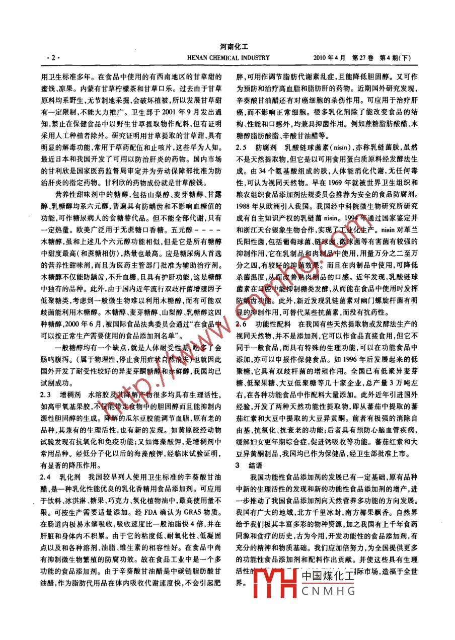 河南化工2010年4月第27卷 第4期(下)HENAN CHEMICAL INDUSTRY功能性食品添加劑進(jìn)展李國(guó)柱(鄭州盛世達(dá)食品科技有限公司,河南,鄭州,40000)[摘要]我國(guó)功能性食品添加劑的發(fā)展已有一定基礎(chǔ),原有品種中新的生理活性的發(fā)現(xiàn)和新的功能性食品添加劑的增產(chǎn),進(jìn)一步推動(dòng)了我國(guó)食品添加劑向營(yíng)養(yǎng)多功能的方向發(fā)展。我們應(yīng)加倍努力,開發(fā)更多更好的功能性食品添加劑。[關(guān)鍵詞]食品添加劑, 功能性,發(fā)展[中圈分類號(hào)] TQ047.1 [文獻(xiàn)標(biāo)識(shí)碼] B [文章編號(hào)] 1003 - 3467(2010)08 -0001 -021食 品添加劑的發(fā)展例有所增加;又如覓菜紅過去以合成法為主,后來(lái)又推出天食品添加劑是食品工業(yè)的重要組成,也是食品工業(yè)新的然提物;再如維生素E,其生育酚功能相同,但其抗氧化功能增長(zhǎng)點(diǎn)。國(guó)際上批準(zhǔn)使用的食品添加劑有4000 ~5000種,高于合成維生素 E,目前我國(guó)浙江、江蘇、北京等地建成的天其中香精香料約有3000種。除香精香料外,世界上常用的然維生素 E的裝置能力超過千噸。2部 分功能性食品添食品添加劑約在1000種左右。我國(guó)已批準(zhǔn)使用的食品添加加劑劑品種有1500多種,按用途分為香精香料、著色劑、甜味劑、2.1 天然色素 天然色素 主要從植物中提取,很多均具有酸味劑、增鮮劑、乳化劑、增稠劑.防腐劑、抗氧劑、營(yíng)養(yǎng)強(qiáng)化生理活性。近十多年來(lái),經(jīng)國(guó)家批準(zhǔn)使用的天然著色劑品劑等,約20大類。除1000多個(gè)香精香料外,約有近500個(gè)品種 ,從20多種增加到40多種,是目前世界上批準(zhǔn)天然著色種。2001年我國(guó)食品添加劑總產(chǎn)量200多萬(wàn)噸??偖a(chǎn)值220劑最 多的國(guó)家。很多具有防病抗病功能,其中如姜黃有抗癌億元以上,約占當(dāng)年食品工業(yè)總產(chǎn)值的9500億元的2.3%。作 用,紅花黃有降壓作用,辣椒紅有抗氧化作用,菊花黃有抗隨著國(guó)際上對(duì)環(huán)境和健康間題的日益重視,回歸大自然,崇氧化作用,高梁紅有 抗氧化作用,玉米黃有抗癌、抗氧化作尚綠色消費(fèi)已成為- -種潮流。因此十多年來(lái),我國(guó)食品添加用,紅曲米有降血脂作用,沙棘黃有抗氧化作用,??凹t有降劑行業(yè),提出了大力開發(fā)“天然營(yíng)養(yǎng)多功能性添加劑”的發(fā)展血 脂作用,花生衣紅有凝血作用,葡萄皮紅有調(diào)脂作用,紫草方針。至今功能性食品添加劑,已成為各省、市、區(qū)廣大企業(yè)紅有抗炎癥作用, 茶綠素有調(diào)血脂作用等。各種研究報(bào)告指和科教單位研究開發(fā)和選擇課題的重點(diǎn)。國(guó)家計(jì)委,國(guó)家經(jīng)出 ,它們均具有促進(jìn)健康的功能,而且有的對(duì)使用量不受限貿(mào)委和農(nóng)業(yè)部聯(lián)合發(fā)布的全國(guó)食品工業(yè)“十五"發(fā)展規(guī)劃中制。 這里值得指出的有兩種在天然色素中發(fā)展較快的品種,指出,我國(guó)食品添加劑發(fā)展的方向是天然營(yíng)養(yǎng)多功能且安全即紅曲 米和葉黃索。紅曲米雖然是食用著色劑中古老的品可靠。目前我國(guó)生產(chǎn)的食品添加劑,按生產(chǎn)方法分類,有化種 ,由于發(fā)現(xiàn)它含有調(diào)節(jié)血脂功能因子洛佛他丁,國(guó)際也給學(xué)合成、生物合成(酶法和發(fā)酵法)、天然提取物三大類。從予重視。目前紅曲米出口量在400噸左右。其中尚有一部我國(guó)2001年生產(chǎn)200多萬(wàn)噸食品添加劑來(lái)分析生物合成分洛佛他丁 含量0.4 - 0.8%的產(chǎn)品。國(guó)內(nèi)也有很多以紅曲的如谷氨酸鈉、檸檬酸維生素C、酵母等達(dá)150萬(wàn)噸,居第一米生產(chǎn)的降 血脂藥物和保健品。有關(guān)洛佛他丁存在開環(huán)和位。其次是天然提取物包括天然色素香料、甜昧劑、水溶膠閉環(huán)不同化學(xué)結(jié)構(gòu)及其測(cè)定方法也由北京聯(lián)大應(yīng)用文理學(xué)等。用石油化工原料純化學(xué)合成的產(chǎn)品,如糖精、甜蜜素、合院研究解決。 關(guān)于用萬(wàn)壽菊提取的葉黃素,由于近年發(fā)現(xiàn)高成色素等產(chǎn)量不到10萬(wàn)噸。谷氨酸檸檬酸、乳酸等用發(fā)酵量攝人葉黃素 能減少發(fā)生老年性視網(wǎng)膜黃斑變性和白內(nèi)障法生產(chǎn)的品種,由于其化學(xué)結(jié)構(gòu)產(chǎn)量不到10萬(wàn)噸。谷氨酸、危險(xiǎn) ,受到廣泛關(guān)注。2000 年德國(guó)法蘭克福歐洲健康食品展檸檬酸、乳酸等用發(fā)酵法生產(chǎn)的品種,由于其化學(xué)結(jié)構(gòu)和天會(huì) 上,葉黃素也是熱點(diǎn)產(chǎn)品之- -。目前我國(guó)年出口萬(wàn)壽菊提然提取的完全-樣,在人體中能吸收和代謝,有-定的營(yíng)養(yǎng)取物達(dá)千噸。功能,國(guó)際上也稱為視同天然物。而天然提取物,相對(duì)合成2.2 甜味劑 甜味劑分非 營(yíng)養(yǎng)性的高倍甜味劑和營(yíng)養(yǎng)性甜而言,更為安全。且有很多天然提取物,具有生理活性和健味劑兩類。高倍甜味劑又分化學(xué)合成和天然提取物兩類??倒δ堋K越陙?lái)這類產(chǎn)品的比例逐漸上升。不僅是天天然的高 倍酣昧劑有甜菊昔、羅漢果甜、索馬甜、甘草甜等。然物提取的食品添加劑品種增加,而且原來(lái)用合成法生產(chǎn)的天然高倍甜味