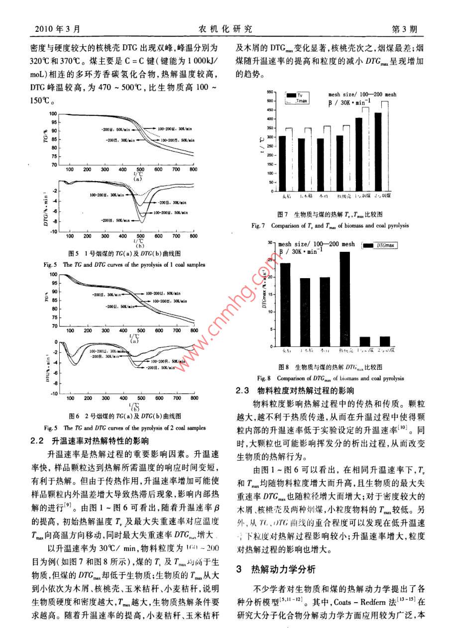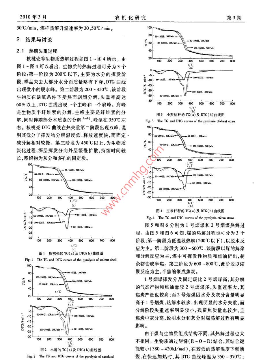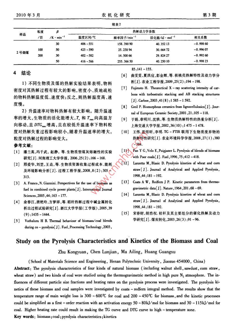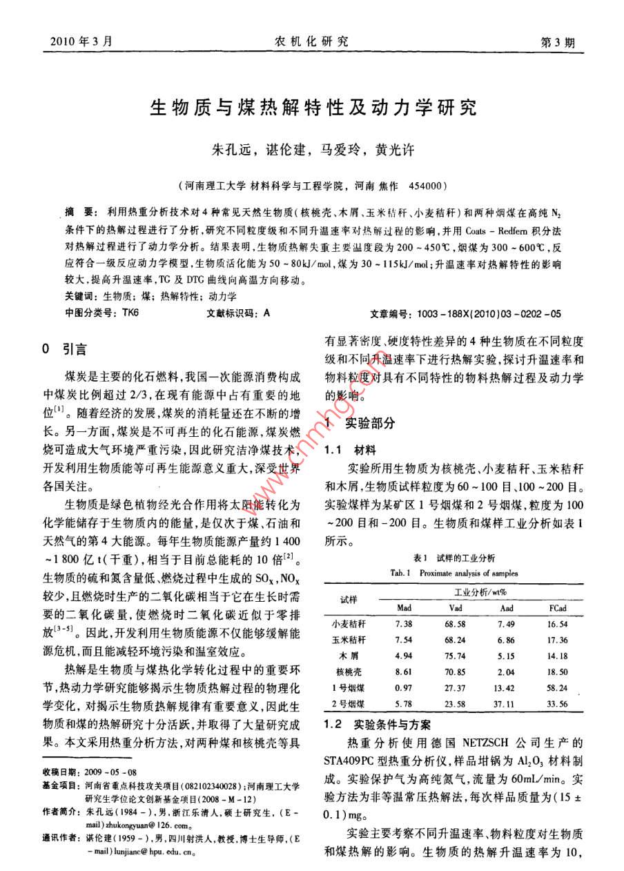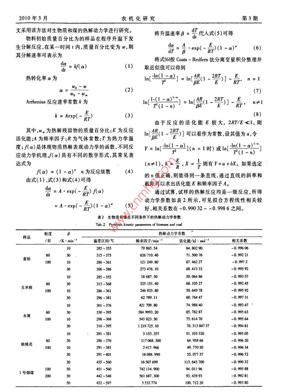 10年3月農(nóng)機化研究第3期生物質(zhì)與煤熱解特性及動力學(xué)研究朱孔遠(yuǎn),諶倫建,馬愛玲,黃光許(河南理工大學(xué)材料科學(xué)與工程學(xué)院,河南焦作454000)摘要:利用熱重分析技術(shù)對4種常見天然生物質(zhì)(核桃殼、木屑、玉米秸稈、小麥秸稈)和兩種煙煤在高純N2條件下的熱解過程進(jìn)行了分析,研究不同粒度級和不同升溫速率對熱解過程的影響,并用Cos- Redfern積分法對熱解過程進(jìn)行了動力學(xué)分析。結(jié)果表明,生物質(zhì)熱解失重主要溫度段為200-450℃,煙煤為300~600℃,反應(yīng)符合一級反應(yīng)動力學(xué)模型,生物質(zhì)活化能為50-80kJ/mol,煤為30-1l5kJ/mol;升溫速率對熱解特性的影響較大,提高升溫速率,TC及DG曲線向高溫方向移動關(guān)鍵詞:生物質(zhì);煤;熱解特性;動力學(xué)中圖分類號:TK6文獻(xiàn)標(biāo)識碼:A文章編號:1003-188X(2010)03-0202-050引言有顯著密度、硬度特性差異的4種生物質(zhì)在不同粒度級和不同升溫速率下進(jìn)行熱解實驗,探討升溫速率和煤炭是主要的化石燃料,我國一次能源消費構(gòu)成物料粒度對具有不同特性的物料熱解過程及動力學(xué)中煤炭比例超過2/3,在現(xiàn)有能源中占有重要的地的影響。位。隨著經(jīng)濟的發(fā)展,煤炭的消耗量還在不斷的增長。另一方面,煤炭是不可再生的化石能源煤炭燃1實驗部分燒可造成大氣環(huán)境嚴(yán)重污染,因此研究潔凈煤技術(shù),1.1材料開發(fā)利用生物質(zhì)能等可再生能源意義重大,深受世界實驗所用生物質(zhì)為核桃殼、小麥秸稈、玉米秸稈各國關(guān)注。和木屑,生物質(zhì)試樣粒度為60~100目、100~200目。生物質(zhì)是綠色植物經(jīng)光合作用將太陽能轉(zhuǎn)化為實驗煤樣為某礦區(qū)1號煙煤和2號煙煤,粒度為100化學(xué)能儲存于生物質(zhì)內(nèi)的能量,是僅次于煤、石油和200目和-200目。生物質(zhì)和煤樣工業(yè)分析如表1天然氣的第4大能源。每年生物質(zhì)能源產(chǎn)量約1400所示。1800億t(干重),相當(dāng)于目前總能耗的10倍2。表】試樣的工業(yè)分析生物質(zhì)的硫和氮含量低、燃燒過程中生成的SOx,NOTab 1 Proximate analysis of samples較少,且燃燒時生產(chǎn)的二氧化碳相當(dāng)于它在生長時需工業(yè)分析/w%樣要的二氧化碳量,使燃燒時二氧化碳近似于零排FCad放3-3。因此,開發(fā)利用生物質(zhì)能源不僅能夠緩解能小麥秸稈68.587.4916.54玉米秸稈75468.246.86源危機,而且能減輕環(huán)境污染和溫室效應(yīng)。熱解是生物質(zhì)與煤熱化學(xué)轉(zhuǎn)化過程中的重要環(huán)核桃殼70.85節(jié),熱動力學(xué)研究能夠揭示生物質(zhì)熱解過程的物理化1號煙煤學(xué)變化,對揭示生物質(zhì)熱解規(guī)律有重要意義,因此生2號煙煤23.5837.Il物質(zhì)和煤的熱解研究十分活躍并取得了大量研究成1.2實驗條件與方案果。本文采用熱重分析方法,對兩種煤和核桃殼等具熱重分析使用德國 NETZSCH公司生產(chǎn)的STA409PC型熱重分析儀,樣品坩鍋為A2O3材料制收稿日期:2009-05-08基金項目:河南省重點科技攻關(guān)項目(0821023408)河南理工大學(xué)成。實驗保護氣為高純氮氣,流量為60ml/min。實研究生學(xué)位論文創(chuàng)新基金項目(2008-M-12)驗方法為非等溫常壓熱解法,每次樣品質(zhì)量為(15±作者簡介:朱孔遠(yuǎn)(1984-),男,浙江樂清人,頑土研究生,(E-0.1)mg。通訊作者:謀倫建(1959-),男,四川射洪人,教授,博士生導(dǎo)師,(E實驗主要考察不同升溫速率、物料粒度對生物質(zhì)-mail)lunjianc@hpu.edu.cn和煤熱解的影響。生物質(zhì)的熱解升溫速率為10,2010年3月月農(nóng)機化研究第3期30℃/min,煤樣熱解升溫速率為30,50℃/min。906,xm2結(jié)果與討論60-100H,10K/n100-200目,30/in21熱解失重過程核桃殼等生物質(zhì)熱解過程如圖1~圖4所示。由00600700800圖1~圖4可以看出,生物質(zhì)的熱解過程可分為3個階段:第一階段為200℃以下,主要為水分的揮發(fā)階段,樣品失去大部分水分而質(zhì)量略有下降,DTG曲線10610目,i0en出現(xiàn)微小的脫水峰。第二階段為200-~450℃,該階段100-200日,3ein生物質(zhì)在缺氧條件下受熱而劇烈分解,失重率高達(dá)60%以上,DTG曲線出現(xiàn)一個主峰和一個肩峰。肩峰是生物質(zhì)半纖維素的分解,主峰主要是纖維素的分圖3小麥秸稈的TG(a)及DTG(b)曲線圖解,同時伴隨部分木質(zhì)素的分解6-8,峰溫在350℃左Fig 3 The TG and DTG curves of the pyrolysis ofwheat straw右。核桃殼DTG曲線在熱失重第二階段出現(xiàn)雙峰,說明其低分子揮發(fā)物分解溫度低、釋放速度快,而固定60-10凵,3/ain碳分解相對較慢。第三階段為450℃以上,為生物質(zhì)一10200日,3in炭化過程,深層揮發(fā)分向外層緩慢擴散,持續(xù)時間較長,殘留物為灰分和多孔的固定炭。40050060070080060100目,30/mim610日1/mi1060100, 10W/ai100200日,30/n60100日,30/aia100200目,3500600圖4玉米稈稈的TG(a)及DTG(b)曲線圖Fig 4 The TG and DTG curves of the pyrolysis ofcom straw15100200H,60-100日,30%/min圖5和圖6分別為1號煙煤和2號煙煤熱解過程。由圖5和圖6可知,煤的熱解過程也可分為3個100200300400500600700階段:第一階段為低溫段熱解(200℃以下),以脫水反應(yīng)為主。第二階段為300~600℃,該階段以煤的解聚圖1核桃殼的TG(a)及DTG(b)曲線圖Fig. I The TG and DTG curves of the pyrolysis of walnut shell和分解反應(yīng)為主,煤中可揮發(fā)性物質(zhì)和焦油析出,剩余物變成