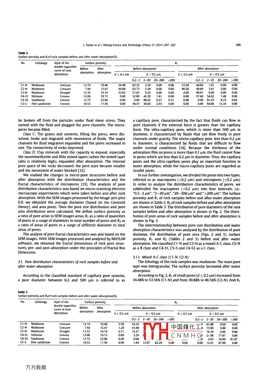 Mining Science and Technology (China) 21 (2011)287- -293Contents lists available at ScienceDirectMining Science and Technology (China)EI SEVIERjournal homepage: www.elsevier.com/locate/mstcAnalysis of microscopic pore structures of rocks before and after water absorptionLi Dejian ab. Wang Guiliang, Han Liqiang2.b. Liu Peiyu.a.b, He Manchaoab, Yang Guoxingb.d,Tai Qimin", Chen Chengb"State Key Laboratory of Ceomechanics and Deep Underground Engineering Beijing 10083. ChinaInstihnte of Ceorechnial Eginering Chine University of Mining 5 Tchnolgy Bejing 1008. ChinaSichuan Souf University of Science and Technologx Sichuam 610101. ChinaEngineering Research Instute of General Amament Depertment, Belfing 100803. ChinaARTICLE INFOABSTRACT .Article history,Hydrophilic characteristics of rocks are affected by their microscopic pore structures, which clearlyRecceived 2 August 2010change after water absorption. Water absorption tests and scanning electron microscopic (SEM) exper-Received in rerised formiments on rock samples, located at a site in Tibet, China, were carried out. Changes of rock pore structuresbefore and after water absorption were studied with the distribution of pore sizes and fractal charac-Acepted 30 November 2010teristics of pores. The results show that surface porosities, fractal dimensions of pores and the complexityof pore structures increased because the number of new small pores produced increased or the originalKeywords:macropore flow channels were expanded after rocks absorbed water. There were points of inflection onHydrophilic characteristicstheir water absorption curves. After water absorption of other rocks, surface porosities and fractalPore structuresPore size distributiondimensions of pores and complexity of pore structures decreased as the original pore flow channelsPore fractal characteristicsbecame flled. Water absorption curves did not change. Surface porosity and the pore fractal dimensionsof rocks have good linear relationships before and after water absorption.Copyright 。2011. China University of Mining & Technology. All rights reseved.1. IntroductionOur study is based on scanning electron microscopic experi-ments. We analysed the data with a double logarithmic curve ofThe process of water on rock in underground engineering rock absorption and fractal theory. Huang et al. discussed the effectprojects is a kind of physical, chemical and mechanical process. It isof water injection on pore structures [3]. They concluded that porean important factor in reducing the mechanical properties of rock.diameters and pore dispersion signifcantly increases after injec-Many rock masses. especially with high expansive clay minerals, tion. They came to the conclusion that the heterogeneity of sand-can rapidly expand, collapse and soften in a short time afterstone was enhanced after water injection. Liu investigated thewater alabsorption, which results in a significant reduction in the changes of pore structure of sandstone after water wash [4]. Hemechanical propertes of rock (1]. Therefore, studies on the inter- found that the cerment of rock was reduced, pores became largeraction between rock and water have atracted considerable atten- and permeability increased. Li et al. thoroughly analysed thetion. In order to explain the interaction between water and rock, changes of pore structure before and after a long-term water washmany scientists at home and abroad have carried out comprehen- [5]. They believed that the micro-pore structure of a reservoir hadsive studies in the field of water-rock chemical mechanism, water- changed considerably and its heterogeneity was more pronouncedrock mechanical mechanism and softening mechanism of strength than that at an earlier stage. Huang thought that the clay minerals ofafter water absorption. The efect of water on the structure of rockrock were washed away and broken up due to the long-term erosionpores is one of the major factors which led to a signifcant reduction by water, which caused fIm stripping of particle surfaces [6]. Inin mechanical rock properties. This effect forms also an important the end, he showed that the pore radius and permeability hadtheoretical basis for the rock softening mechanism. In order to increased. Wang et al. studied the effect on pore structures of rockensure stability in underground engineering. an in-depth study on after water injection| 7]. They thought that the injected water wouldthe characteristics of microscopic pore structures of rock beforeand cause pore channels to be blocked during the process of flowing.after water absorption is of great importance [2].Wang et al. and Ma et al. calculated the fractal dimension of themicro-pore structure before and after water absorption 18.9]. They●Corresponding author. state Key Laboratory of Gcomechanics and Deep analysn pore structures. TheyUnderground Engineering. Bejing 100030 China. Tel: +86 13466736516.came中國(guó)煤化工y of the pore strucureE-mail ddre ldjecumtb.edu.cn (L Dejian)and ther water foodingCNMHGdoi:10.1016j.t.2011.02.002r Copyright。2011. China University of Mining & Technology. All rgruoloerveu.288L Dejian et al. 1 Mining Science and Technology (China) 21 (2011)287-293Table 1Basic physical properties of rock samples.NLithologyDepth Dry densityParticlePorosityCharacteristics(m) (g/cm2)’ density (g/cm3) (%)C1-N Mudstone3.21.6638.34 Celadon, dense, no bedding. developing joints, smooth sctions, esential minerals: claymineralsandCalciteC2-N Mudstone0.0682.71538.12 White gray. dense, no bedding, developing joints, smooth sections, essential minerals: clayminerals and calciteCS5-N Mudstone131.52.74538.80 Pale yellow, less dense, low strength, essential minerals: dlay minerals, calcite, quartz, feldsparand micaC4-51 Siltstone25.0.652.73439.66 Brown yellow. loose, obvious bedding. low strength, small particlesC4-52 Sandstone.622.71840.41 Brown yllow. loose, low strength, grainy, consisting mainly of clay cement and a small amount5-s Fin