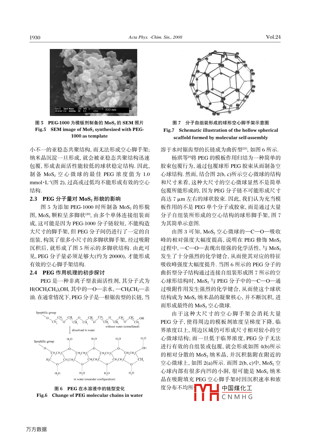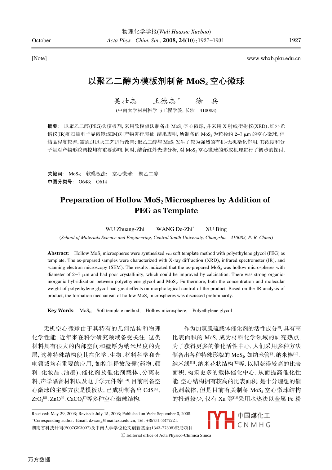 物理化學(xué)學(xué)報(bào)(Wuli Huaxue Xuebao)OctoberActa Phys. -Chim. Sin, 2008, 24(10): 1927-19311927www.whxb.pku.edu.cn以聚乙二醇為模板劑制備MoS2空心微球吳壯志王德志徐兵(中南大學(xué)材料科學(xué)與工程學(xué)院,長(zhǎng)沙410083)摘要:以聚乙二醇(PEG)為模 板劑,采用軟模板法制備出MoS2空心微球,并采用x射線衍射儀(XRD)、紅外光譜儀(IR)和掃描電子顯微鏡(SEM)對(duì)產(chǎn)物進(jìn)行表征.結(jié)果表明,所制備的MoS,為粒徑約2- -7 μm的空心微球,但結(jié)晶程度較差,需通過(guò)退火工藝進(jìn)行改善;聚乙二醇與MoS2發(fā)生了較為強(qiáng)烈的有機(jī)無(wú)機(jī)雜化作用,其濃度和分子量對(duì)產(chǎn)物形貌調(diào)控均有重要影響.同時(shí),結(jié)合紅外光譜分析,對(duì)MoS2空心微球的形成機(jī)理進(jìn)行了初步的探討.關(guān)鍵詞: MoS; 軟模板法; 空心微球, 聚乙二醇中圖分類(lèi)號(hào): 0648; O614Preparation of Hollow MoS2 Microspheres by Addition ofPEG as TemplateWU Zhuang-ZhiWANG De-Zhi*XU Bing(School of Materials Science and Engineering, Central South University, Changsha 410083, P. R. China)Abstract: Hollow MoS2 microspheres were synthesized via soft template method with polyethylene glycol (PEG) astemplate. The as-prepared samples were characterized with X-ray diffraction (XRD), infrared spectrometer (IR), andscanning electron microscopy (SEM). The results indicated that the as -prepared MoS2 was hollow microspheres withdiameter of 2-7 pμm and had poor crsallinity, which could be improved by calcination. There was strong organic-inorganic hybridization between polyethylene glycol and MoS. Furthermore, both the concentration and molecularweight of polyethylene glycol had great ffcts on morphological control of the product. Based on the IR analysis ofproduct, the formation mechanism of hollow MoS2 microspheres was discussed preliminarily.Key Words: MoS2; Soft template method; Hollow microsphere; Polyethylene glycol無(wú)機(jī)空心微球由于其特有的幾何結(jié)構(gòu)和物理.作為加氫脫硫載體催化劑的活性成分啊,具有高化學(xué)性能,近年來(lái)在科學(xué)研究領(lǐng)域備受關(guān)注.這類(lèi)比表面積的MoS2成為材料化學(xué)領(lǐng)域的研究熱點(diǎn).材料具有很大的內(nèi)部空間和壁厚為納米尺度的殼為了獲得更多的催化活性中心,人們采用多種方法層,這種特殊結(jié)構(gòu)使其在化學(xué)、生物材料科學(xué)和光制備出各種特殊形貌的MoS2,如納米管四、納米棒0、電領(lǐng)域均有重要的應(yīng)用,如控制釋放膠囊(藥物、顏納米線叫納米花狀結(jié)構(gòu)四等,以期獲得較高的比表料、化妝品、油墨)、催化劑及催化劑載體、分離材面積,構(gòu)筑更多的載體催化中心,從而提高催化性料、聲學(xué)隔音材料以及電子學(xué)元件等1-8.目前制備空能.空心結(jié)構(gòu)擁有較高的比表面積,是十分理想的催心微球的主要方法是模板法,已成功制備出CdSHI、化劑載體,但是目前有關(guān)制備MoS2空心微球結(jié)構(gòu)ZrO51. .ZnO .CaCO,."等多種空心微球結(jié)構(gòu).的報(bào)道較少,僅有Xu等叫采用水熱法以金屬Fe粉Received: May 29, 2008; Revised: July 15, 2008; Published on Web: September 3, 2008.中國(guó)煤化工°Corresponding author. Email: dzwang @ mil.csu.edu cn; Tel: +86731-8877221.湖南省科技計(jì)劃(2007GK3097)及中南大學(xué)學(xué)位論文創(chuàng)新基金(1343- 7308)資助項(xiàng)目MHCNMH GC Editorial office of Acta Physico-Chimica Sinica.1928Acta Phys. -Chim. Sin, 2008Vol.24 .作為還原劑制備出MoS2納米空心球,但并未就其[002形成機(jī)理展開(kāi)討論;而Luo等凹在水熱條件下通過(guò)1060添加離子液體(ILs)作為模板劑制備出小粒徑大壁厚103的MoS2空心微球,并認(rèn)為其空心結(jié)構(gòu)是通過(guò)反應(yīng)50011400產(chǎn)物對(duì)ILs囊泡的吸附沉積包覆來(lái)實(shí)現(xiàn)的.相比較而言,大粒徑小璧厚的空心結(jié)構(gòu)單位質(zhì)量所獲得的20比表面積較高,比小粒徑大壁厚的空心結(jié)構(gòu)具有更大的應(yīng)用價(jià)值.)30405060.."7080本文介紹一-種通過(guò)模板劑聚乙二醇的形貌調(diào)控作用來(lái)制備大粒徑小壁厚MoS2空心微球的新方法,圖1 MoS2空心微球的 XRD圖并提出了一種新的形成機(jī)理.Fig.1 XRD patterns of hollow MoS2 microspheres(a) without calcination; (b) annealed at 600 C for 0.5 h in Aratmosphere1實(shí)驗(yàn)部分1.1試劑與儀器間,待顏色不再發(fā)生變化,即得到最終產(chǎn)物.用去離二鉬酸銨(NH)2Mo2O, 金堆城鉬業(yè)有限公司)、子水洗滌產(chǎn)物并超聲震蕩分散,離心分離后,用無(wú)水硫化鈉(NaS2.9H,O,上海統(tǒng)亞化工發(fā)展有限公司)、乙醇洗滌多次,再進(jìn)行高速離心分離后于空氣中自濃鹽酸(株洲市化學(xué)工業(yè)研究所)、聚乙二醇(PEG-然干燥.20000,成都科龍化工試劑廠)、無(wú)水乙醇(天津市恒興化學(xué)試劑制造有限公司)、鹽酸羥胺(NH2OH. HCI,2結(jié)果與討論湖南匯虹試劑有限公司)等均為分析純,實(shí)驗(yàn)用水為2.1 MoS2空心微球的表征去離子水.圖1為MoS2空心微球的XRD圖.低溫液相.用理學(xué)D/max-2500型X射線衍射儀(日本理學(xué)法制備的MoS2因?qū)訝罱Y(jié)構(gòu)內(nèi)的稀疏堆垛和高度無(wú)電機(jī)株式會(huì)社)檢測(cè)樣品的物相結(jié)構(gòu),用Avatav360序,難以形成良好的晶態(tài)結(jié)構(gòu),呈無(wú)定型態(tài)呵,峰的型紅外分析儀(美國(guó)Nicolet公司)表征樣品的表面寬化較為明顯,僅有一個(gè)相對(duì)較弱