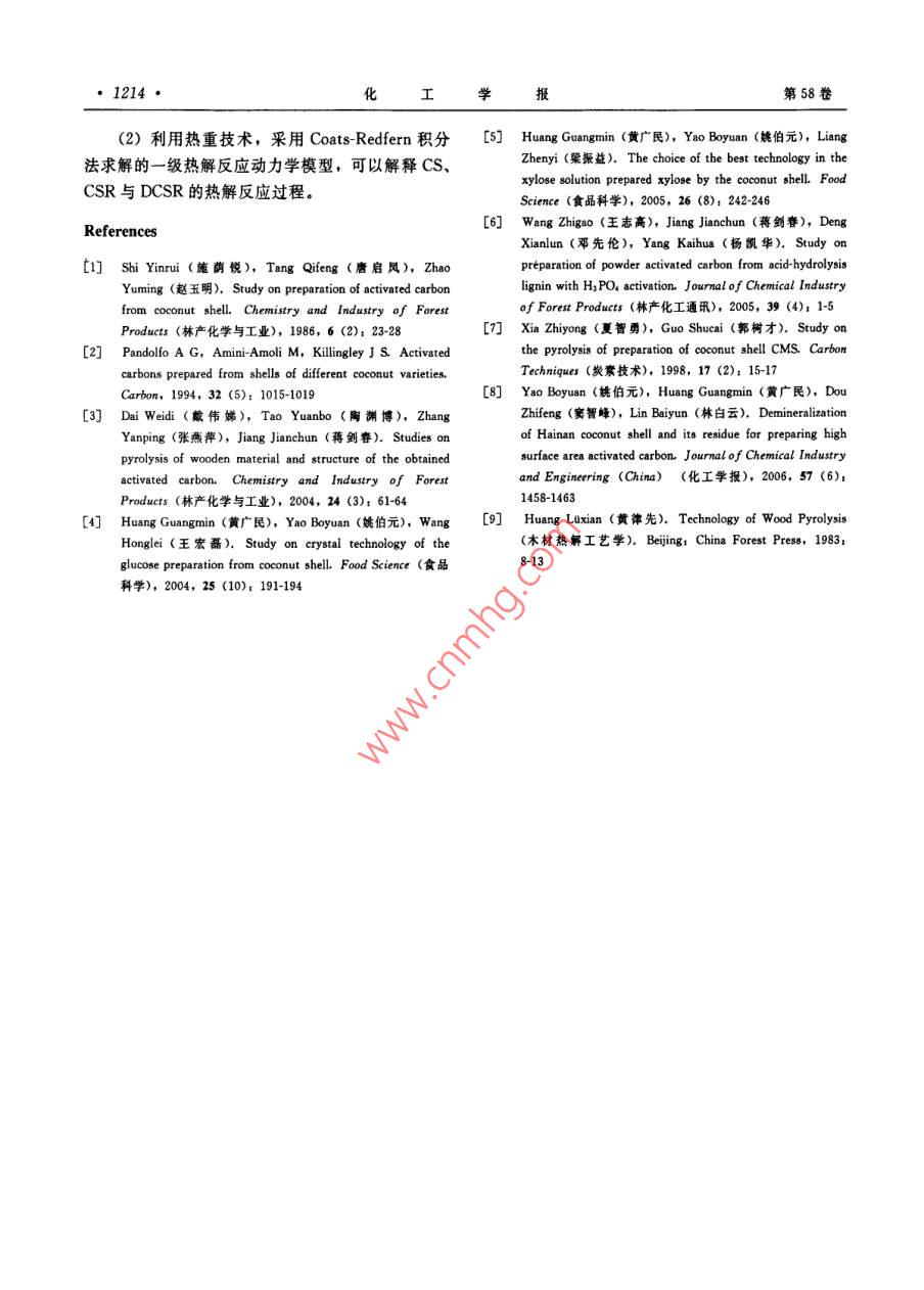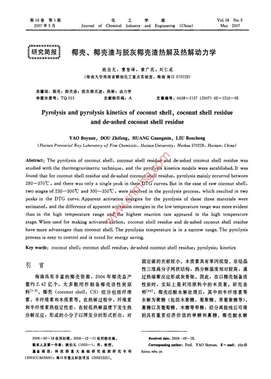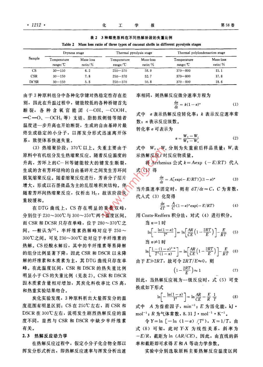 第58卷第5期化工Vol 58 No 52007年5月JournalChemical Industry and Engineering (China)研究簡報(bào)椰殼、椰殼渣與脫灰椰殼渣熱解及熱解動(dòng)力學(xué)姚伯元,竇智峰,黃廣民,劉仁成(海南大學(xué)海南省精細(xì)化工重點(diǎn)實(shí)驗(yàn)室,海南???70228)關(guān)鍵詞:椰殼;椰殼渣;脫灰椰殼渣;熱解;動(dòng)力學(xué)中圖分類號:TQ013文獻(xiàn)標(biāo)識(shí)碼:A文章編號:0438-1157(207)05-1210-0Pyrolysis and pyrolysis kinetics of coconut shell, coconut shell residueand de-ashed coconut shell residueYAO Boyuan, DOU Zhifeng, HUANG Guangmin, LIU Rencheng( Hainan Provincial Key laboraof Fine Chemicals, Hainan University, Haikou 570228, Hainan, China)Abstract: The pyrolysis of coconut shell, coconut shell residue and de-ashed coconut shell residue wasstudied with the thermogravimetric technique, and the pyrolysis kinetics models were established. It wasfound that for coconut shell residue and de-ashed coconut shell residue, pyrolysis mainly occurred between280-370C, and there was only a single peak in their DtG curves. but in the case of raw coconut shell,two stages of 230--300C and 300-350C, were involved in the pyrolysis process, which resulted in twopeaks in the DTG curve. Apparent activation energies for the pyrolysis of these three materials wereestimated, and the difference of apparent activation energies in the low temperature range was more evidentthan in the high temperature range and the highest reaction rate appeared in the high temperaturestage. When used for making activated carbon, coconut shell residue and de-ashed coconut shell residuehave more advantages than coconut shell. The pyrolysis temperature is in a narrow range. The pyrolysisprocess is easy to control and is noted for energy saving.Key words: coconut shell: coconut shell residue de-ashed coconut shell residue; pyrolysis; kinetics引言固定碳的貢獻(xiàn)較小。木質(zhì)素具有苯丙烷型、非結(jié)晶性三維高分子網(wǎng)狀結(jié)構(gòu),熱分解溫度相對較高,通海南具有豐富的椰殼資源,2004年椰殼總產(chǎn)過熱縮聚反應(yīng)形成炭骨架。因此,在以椰殼制備活量約2.42億個(gè),大多數(shù)用作制備椰殼活性炭原性炭時(shí),實(shí)際上是利用原料中的木質(zhì)素。研究表料口3。椰殼( coconut shel,Cs)組分包括纖維明+,椰殼經(jīng)酸水解處理后,其中的半纖維素等素、半纖維素和木質(zhì)素等。在熱解過程中,纖維素水解為聚糖(包括木聚糖、葡聚糖、果葡聚糖等)和半纖維素?zé)岱€(wěn)定性差,在較低熱解溫度下發(fā)生熱寡糖以及葡萄糖、木糖等單糖,經(jīng)分離提純后可得分解反應(yīng),形成的小分子以揮發(fā)分的形式析出,對到具有重要經(jīng)濟(jì)價(jià)值的單糖和寡糖。椰殼酸水解2006-09—18收到初藕,2006-12-11收到修改橫Recelved date: 2006-09-18.聯(lián)系人及第一作者:姚伯元(1955-),男,教授Corresponding author: Prof, YAO Boyuan. E-mail: yby G基金項(xiàng)目:科技部重大基礎(chǔ)研究前期研究專項(xiàng) haine. edu.cn(2003cCA03600)1??谑兄攸c(diǎn)科技項(xiàng)目(20021225)第5期姚伯元等:椰殼、椰殼渣與脫灰椰殼渣熱解及熱解動(dòng)力學(xué)1211·后,經(jīng)離心分離含糖母液后得到的固體殘?jiān)礊橐潭ㄌ寂cCSR差別不大,說明脫灰過程中減少了殼渣( coconut shell residue,CsR),主要成分為無機(jī)組分,而對有機(jī)組分含量影響不大。未降解的木質(zhì)素等,可以作為制備高性能活性炭的2.2熱解過程分析優(yōu)質(zhì)原料。對椰殼渣進(jìn)行脫灰處理后,可得到脫原料的熱失重曲線(TG曲線)見圖1,其熱灰椰殼渣( deashed coconut shell residue,失重速率曲線(DTG曲線)為TG曲線的一階微DCR)。CSR與DCSR都可以制備高性能活性炭,分曲線,見圖2用DCSR制備還可滿足GB/T138031199對木質(zhì)顆?;钚蕴恳患壠坊曳植怀^3%的要求。炭化過程是影響產(chǎn)品性能的重要因素。炭化過程中主要發(fā)生熱分解與熱縮聚反應(yīng),研究和掌握其過程與機(jī)理很有必要。椰殼熱解過程已有文獻(xiàn)報(bào)09000道3,但其熱解動(dòng)力學(xué)、CSR與DCSR的熱解及熱解動(dòng)力學(xué)研究尚無報(bào)道1實(shí)驗(yàn)部分實(shí)驗(yàn)樣品為海南CS、CSR與DCSR。DCSR為在濃度為10%的磷酸溶液中浸漬3h進(jìn)行脫灰處理后的CSR。圖1CS、CSR和DCSR的TG曲線用粒度小于74pm的原料,在氮?dú)獗Wo(hù)下Fig. 1 TG curves of CS, CSR and DCSR用美國TA公司Q600型熱重分析儀進(jìn)行熱重實(shí)驗(yàn)。實(shí)驗(yàn)條件為氮?dú)饬髁?0ml·min-,升溫速率5℃·min-1,樣品用量0.4~0.7mg。炭化熱CSR解實(shí)驗(yàn)在SK2-2-10型管式電阻爐上進(jìn)行。2結(jié)果與討論2.1原料的工業(yè)分析灰分按GB/T12496.3-199水分按GB/T12496.4-1999、揮發(fā)分按GB212-91等規(guī)定測定,固定碳由差減法計(jì)算,結(jié)果見表1。100200300400500600700800表1原料的工業(yè)分析2cs、CSR和DCSR的DTG曲線Table 1 Industry analysis of different coconut shellsFig 2 DtG curves of CS, CSR and DCSRM,d/% A/% V/% FCod/%由原料的TG曲線可知,其熱解過程可分為以9.180.8874.5414.52下階段。0.7970.1820.55(1)干燥階段:從室溫到150℃。失重主要由CSR7520.2371.0621.19失水引起,包括失去外在水和內(nèi)在水,一般占原料質(zhì)量(空氣干燥基)的10%以下,見表2。由表1可知,CS、CSR、DCSR雖均屬于高揮(2)熱分解階段:從250~370℃。失重主要發(fā)分、低固定碳原料,但也有差異。CSR與DSCR由于原料中有機(jī)組分的熱分解。從TG曲線可以看的灰分和揮發(fā)分含量小于椰殼,而固定碳含量高于出,3種原料在此階段失重都最