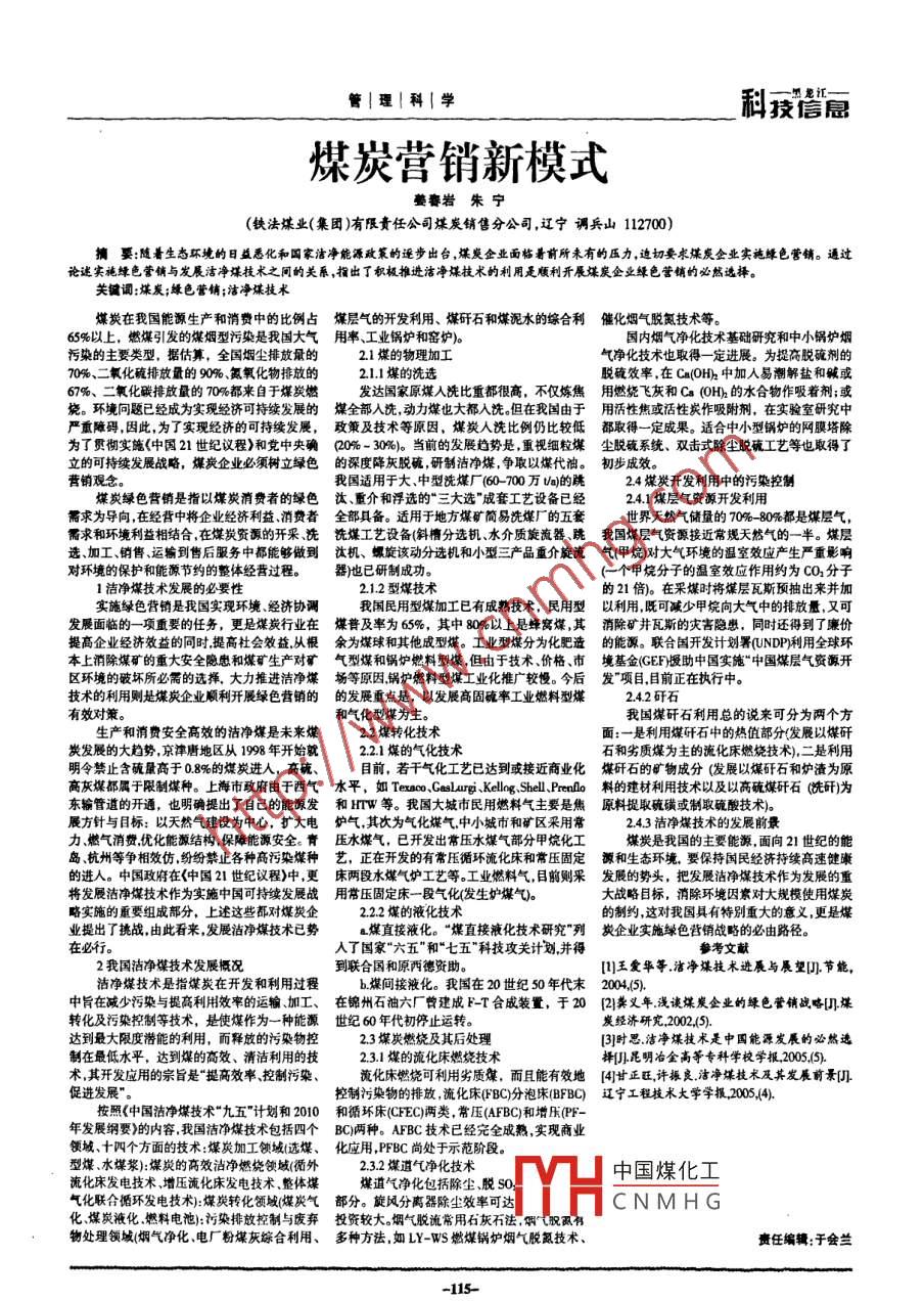 管|理|科|學科技信急煤炭營銷新模式姜饔巖朱寧(鐵法煤業(yè)(集團)有限責任公司煤炭銷售分公司,遼寧調兵山112700)摘要:隨著生態(tài)環(huán)境的日益悉化和國家潔凈能源政策的逐步出臺,煤炭企業(yè)面臨著前所未有的壓力.迫切要求煤炭企業(yè)實施縑色營鋪。通過論述實施綠色營銷與發(fā)展沽凈煤技術之間的關系,指出了積極推進潔凈煤技術的利用是順利開展煤炭企業(yè)縑色營鋪的必然選擇。關鍵詞;煤炭;綠色營銷;潔凈謀技術煤炭在我國能源生產和消費中的比例占煤層氣的開發(fā)利用、 煤矸石和煤泥水的綜合利催化煙氣脫氮技術等。65%以上,燃煤引發(fā)的煤煙型污染是我國大氣用率、工業(yè)鍋爐和窯爐)。國內煙氣凈化技術基礎研究和中小鍋爐煙污染的主要類型,據估算,全國煙塵排放量的2.1煤的物理加工氣凈化技術也取得一-定進展。 為提商脫硫劑的70%、二氧化硫排放量的90%、氮氧化物排放的2.1.1 煤的洗選脫硫效率,在Ca(OH)r中加人易潮解鹽和虢或67%、二氧化碳排放量的70%都來自于煤炭燃發(fā)達國家原煤人洗比重都很高,不僅煉焦用燃燒 飛灰和Ca (0H)的水合物作吸著劑;或燒。環(huán)境向題已經成為實現經濟可持續(xù)發(fā)展的煤全部入洗, 動力煤也大都入洗。但在我國由于用活性焦或活性炭作吸附劑, 在實驗室研究中嚴重障礙,因此,為了實現經濟的可持續(xù)發(fā)展,政策及技術等原因, 煤炭人洗比例仍比較低都取得一定成果。 適合中小型鍋爐的網膜塔除為了貫徹實施《中國21世紀議程》和黨中央確(20% - 30%)。當前的發(fā)展趨勢是,重視細粒煤塵脫硫系統(tǒng)、 雙擊式除塵脫硫工藝等也取得了立的可持續(xù)發(fā)展戰(zhàn)略,煤炭企業(yè)必須樹立綠色的深度降灰脫硫 ,研制潔凈煤,爭取以煤代油。初步 成效。營銷觀念。我國適用于大中型洗煤廠(60- 700萬Ua)的跳2.4 煤炭開發(fā)利用中的污染控制煤炭綠色營銷是指以煤炭消費者的綠色汰、 重介和浮選的“三大選“"成套工藝設備已經2.4.1 煤層氣資源開發(fā)利用需求為導向,在經營中將企業(yè)經濟利益消費者全部具備。 適用于地方煤礦簡易洗煤廠的五套世界天然氣儲量的70% -80%都是煤層氣,需求和環(huán)境利益相結合,在煤炭資源的開采、洗洗煤工藝設備(斜槽分選機、水介質旋流器 跳我國煤層氣資源接近常規(guī)天然氣的一半。 煤層選、加工、銷售、運輸到售后服務中都能夠做到汰機、 螺旋該動分選機和小型三產品重介旋流氣甲 烷)對大氣環(huán)境的溫室效應產生嚴重影響對環(huán)境的保護和能源節(jié)約的整體經營過程。器)也已研制成功。(-個甲烷分子的溫室效應作用約為CO,分子1潔凈煤技術發(fā)展的必要性2.1.2型煤技術的21倍)。在采煤時將煤層瓦斯預抽出來并加實施綠色營銷是我國實現環(huán)境、經濟協調我國民用型煤加工已有成熟技術,民用型以利用, 既可減少甲烷向大氣中的排放量,又可發(fā)展面臨的一項重要的任務,更是煤炭行業(yè)在煤普及率為 65%,中80%以上是蜂窩煤,其消除礦 井瓦斯的災害隱患,同時還得到了廉價提高企業(yè)經濟效益的同時,提高社會效益,從根余為煤球 和其他成型煤。工業(yè)型煤分為化肥造的能源。 聯合國開發(fā)計劃署(UNDP)利用全球環(huán)本上消除煤礦的重大安全隱患和煤礦生產對礦氣型煤 和鍋爐燃料型煤,但由于技術、價格、市境基金(GEF)援助中 國實施“中國煤層氣資源開區(qū)環(huán)境的破壞所必需的選擇,大力推進潔凈煤場等原因,鍋爐燃料型煤工業(yè)化推廣 較慢。今后發(fā)"項目,目前 正在執(zhí)行中。技術的利用則是煤炭企業(yè)順利開展綠色營銷的的發(fā)展重點是, 以發(fā)展高固硫率工業(yè)燃料型煤2.4.2 矸石有效對策。和氣化型煤為主。我國煤矸石利用總的說來可分為兩個方生產和消費安全高效的潔凈煤是未來煤2.2煤轉化技術面:一是利用煤殲石中的熱值部分(發(fā)展以煤矸炭發(fā)展的大趨勢,京津唐地區(qū)從1998年開始就2.2.1煤的氣化技術石和劣質煤為主的流化床燃燒技術)。二是利用明令禁止含硫量高于0.8%的煤炭進入,高硫、目前,若干氣化工藝已達到或接近商業(yè)化煤研石的礦物成分 (發(fā)展以煤矸石和爐渣為原高灰煤都屬于限制煤種。上海市政府由于西氣水平, 如TexocCealurgiKellng Sel.Prenlo料的建材利用技術以及以高硫煤研石 (洗研)為東輸管道的開通,也明確提出了自己的能源發(fā)和 HTW等。我國大城市民用燃料氣主要是焦原料捉 取硫磺或制取碗酸技術)。展方針與目標:以天然氣建設為中心,擴大電爐氣,其次為氣化煤氣,中小城市 和礦區(qū)采用常2.4.3 潔凈煤技術的發(fā)展前景力燃氣消費,優(yōu)化能源結構,保障能源安全。青壓水煤氣, 已開發(fā)出常壓水煤氣部分甲烷化工煤炭是我國的主要能源,面向21世紀的能島、杭州等爭相效仿.紛紛禁止各種高污染煤種藝, 正在開發(fā)的有常壓循環(huán)流化床和常壓固定源 和生態(tài)環(huán)境。要保持國民經濟持續(xù)高速健康的進入。中國政府在《中國21世紀議程)中,更床兩段水煤氣爐工藝等。 工業(yè)燃料氣,目前則采發(fā)展的勢頭, 把發(fā)展?jié)崈裘杭夹g作為發(fā)展的重將發(fā)展?jié)崈裘杭夹g作為實施中國可持續(xù)發(fā)展戰(zhàn)用常壓固定床一段氣化(發(fā)生爐煤氣)。大戰(zhàn)略目標,消除環(huán)境因素對