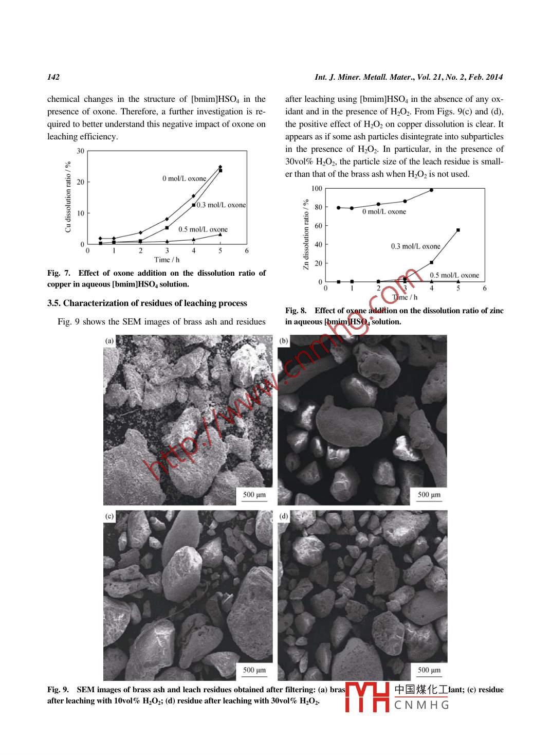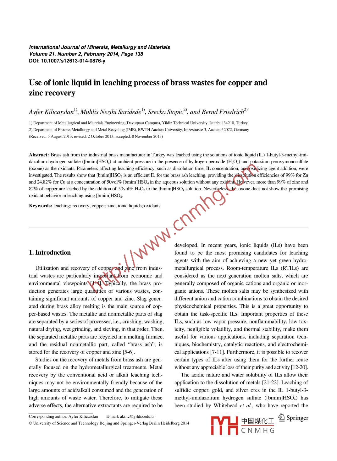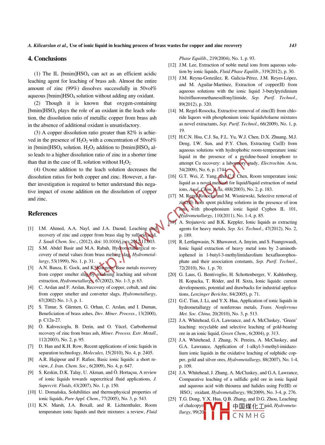 International Journal of Minerals, Metallurgy and MaterialsVolume 21, Number 2, February 2014, Page 138DOI: 10.1007/s12613-014-0876-yUse of ionic liquid in leaching process of brass wastes for copper andzinc recoveryAyfer Kilicarslan", Muhlis Nezihi Saridede"), Srecko Stopic?), and Bernd Friedrich?)1) Department of Metallurgical and Materials Engineering (Davutpasa Campus), Yildiz Technical University, Istanbul 34210, Turkey2) Department of Process Mtallurgy and Metal Recyeling (IME), RWTH Aachen University, Inuestrasse 3, Aachen 52072. Germany(Received: 5 August 2013; revised: 2 October 2013; accepted: 8 November 2013)Abstract: Brass ash from the industrial brass manufacturer in Turkey was leached using the solutions of ionic liquid (IL) 1-butyl-3-methy)-imi-dazolium hydrogen sulfate (bmim]HSO4) at ambient pressure in the presence of hydrogen peroxide (H2O2) and potassium peroxymonosulfate(oxone) as the oxidants. Parameters affecting leaching efficiency, such as dissolution time, IL concentration, and oxidizing agent addition, wereinvestigated. The results show that [bmim]HSO4 is an efcient IL for the brass ash leaching, providing the dissolution efficiencies of 9% for Znand 24.82% for Cu at a concentration of 50vol% [bmim]HSO4 in the aqueous solution without any oxidant. However, more than 9% of zinc and82% of copper are leached by the addition of 50vol% H2O2 to the [bmim]HSO4 soluion. Nevteless, the oxone does not show the promisingoxidant behavior in leaching using [bmim]HSO4Keywords: leaching; recovery; copper; zinc; ionice liquids; oxidantsdeveloped. In recent years, ionic liquids (ILs) have been1. Introductionfound to be the most promising candidates for leachingagents with the aim of achieving a new yet green hydro-Utilization and recovery of copper and zinc from indus-metallurgical process. Room-temperature ILs (RTILs) aretrial wastes are particularly important from economic ancconsidered as the next-generation molten salts, which arenvironmental viewpoints [1-4]. Typically, the brass pro-generally composed of organic cations and organic or inor-duction generates large quantities of various wastes, conganic anions. These molten salts may be synthesized withtaining significant amounts of copper and zinc. Slag gener-different anion and cation combinations to obtain the desiredated during brass alloy melting is the main source of cop-physicochemical properties. This is a great opportunity toper-based wastes. The metallic and nomallic parts of slagobtain the task-specific ILs. Important properties of theseare separated by a series of processes, i.e., crushing, washing, ILs, such as low vapor pressure, nonflammability, low tox-natural drying, Wet grinding, and sieving, in that order. Then,icity, negligible volatility, and thermal stability, make themthe separated metallic parts are recycled in a melting furnace,useful for various applications, including separation tech-and the residual nonmetallic part, called “brass ash", isniques, biochemistry, catalytic reactions, and electrochemi-stored for the recovery of copper and zinc [5-6].cal applications [7-1 1]. Furthermore, it is possible to recoverStudies on the recovery of metals from brass ash are gen-certain types of ILs after using them for the further reuseerally focused on the hydrometallurgical treatments. Metalwithout any appreciable loss of their punity and activity [12-20].recovery by the conventional acid or alkali leaching tech-The acidic nature and water solubility of ILs allow theirniques may not be environmentally friendly because of theapplication to the dissolution of metals [21-22]. Leaching oflarge amounts of acid/alkali consumed and the generation ofsulfidic copper, gold, and silver ores in the IL 1-buty1-3-high amounts of waste water. Therefore, to mitigate thesemethyI- imidazolium hydrogen sulfate (bmim]HSO4) hasadverse effects, the altermative extractants are required to bebeen studied by Whitehead et al, who have reported theCorresponding author: Ayfer Kilicarslan E- mail: akilic@ yiliz.du.r◎University of Science and Technology Bejjing and Springer-Verlag Berlin Heidelberg 2014中國煤化工包SpringerMYHCNM HGA. Kilicarslan et al, Use of ionic liquid in leaching process of brass wastes for copper and zinc recovery139promising results for the extraction of these metals [23-24].brass manufacturing plant in Turkey. The chemical compo-Other researchers have also used this IL for leaching ofsition of brass ash was analyzed by inductively coupledchalcopyrite, and it has been found that pure IL and itplasma optical emission spectrometry (ICP-OES), and theaqueous solutions are more effective than the conventionalresults are presented in Table 1. The phases of brass ashacid solutions used for leaching [25].vere analyzed by X-ray diffraction analysis (XRD), aIn this study, the recovery of copper and zinc from theshown in Fig. 1. The brass ash exists mostly in the form ofindustrial brass ash was attempted using [bmim]HSO4 in themetal oxides. A significant amount of copper is also foundleaching process. Furthermore, the parameters affectingto be present as the metallic phase in brass ash. Chemicalleaching efficiency, such as dissolution time, IL concentra-and spectrometry analyses show that ZnO, CuO, and Cu aretion, and oxidizing agent addition, were evaluated.the major components of brass ash.2. ExperimentalTable 1. Chemical composition of brass ash wt%ZnCuCaAlMgNaKSClSi2.1. Brass ashThe brass ash used in the experiments was supplied by a53.92 22.00 5.81 3.40 031 0.30 0.35 0.32 0.35 12.1715000◆ZnO0CuO. sCuzZn。800000θ Zn2SiO,φ Al2O;三5000φ203056(70201(9)Fig.1. XRD spectra of the brass ash sample.[bmim]HSO4 The samples for analysis were obtained2.2. Reagentsthrough a pipette dipped into the top part of solution. Sub-The IL ([bmim]H]HSO4) and two analytical-grade oxidantssequently, the samples were filtered using filter paper, and(potassium peroxymonosulfate (oxone) and hydrogen per-the metal concentrations in th
